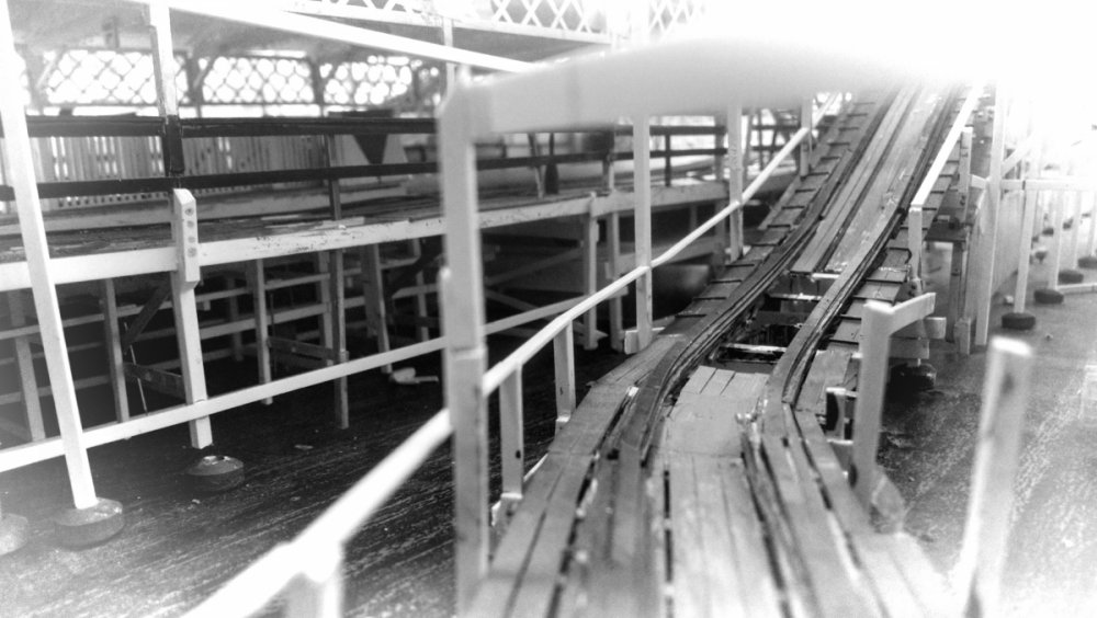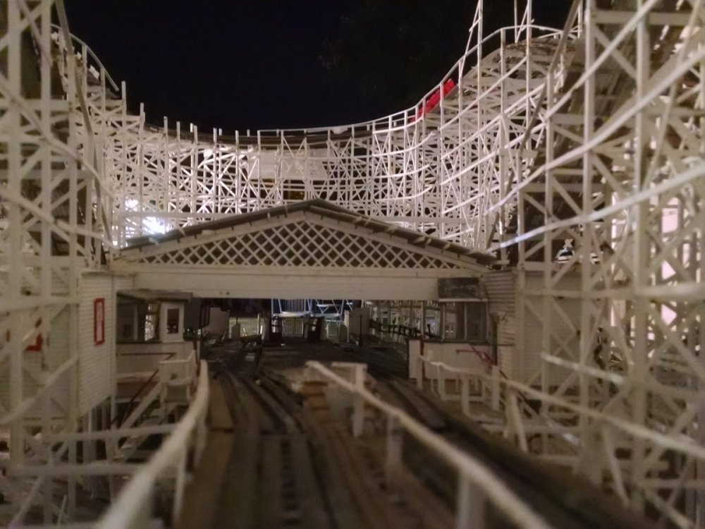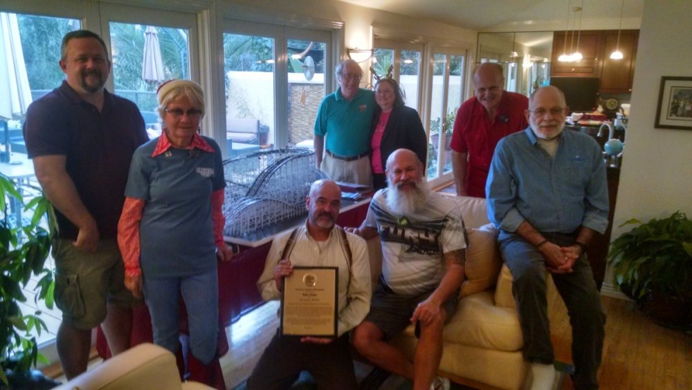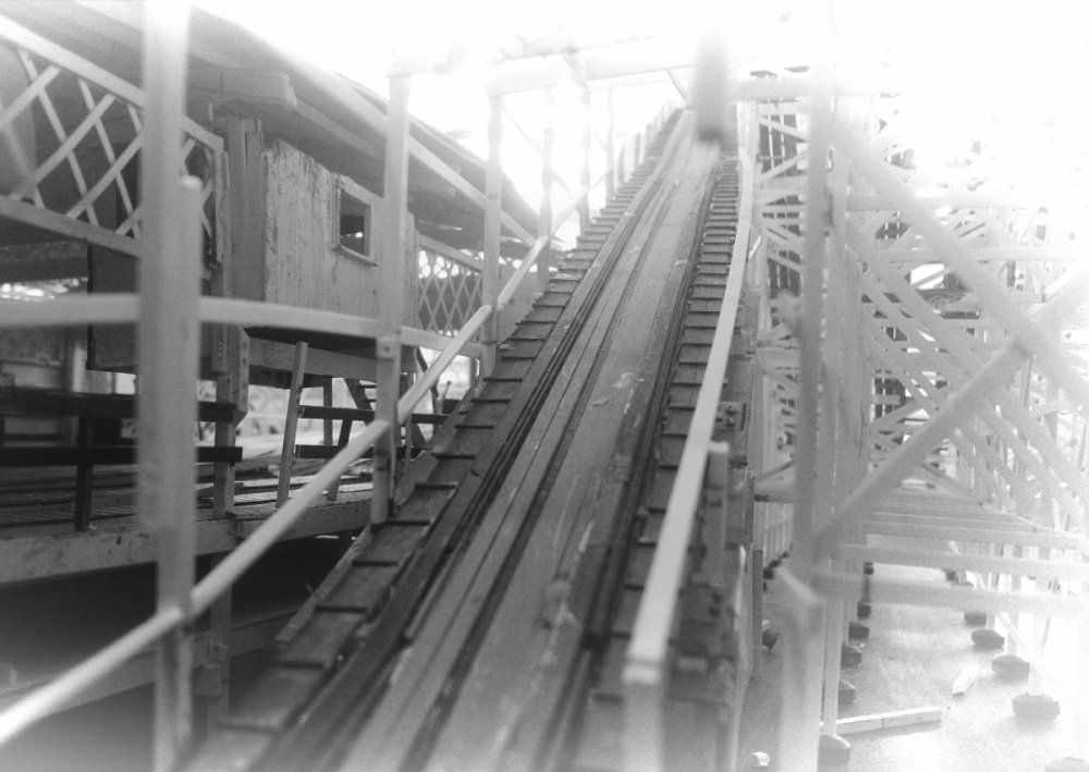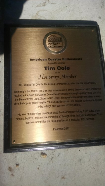 Getting recognized for my research into old historic roller coasters and bringing them back so all may see just now beautiful they were and for my contribution of those models to the National Roller Coaster Museum with an ACE honorary membership! Also recognized for guaranteeing the Giant Dipper would not be torn down. Finally, finally, FINALLY attached the roof on to the station house. Underside of station house Approach to lift hill B. These are random shots that I won’t be able to get once I add the U turn. The bottom wheel for the chain Some artsy ones Some artsy ones Oh lookie! I think I made the train chassis about a year ago. Finally took them off the shelf. Approach to the station These make me think of macaroni shells as they feel just like them. Cyclone Racer trains were near exactly like the ones that used to run on Playland’s Dragon. Chug chug One area I want to be really careful with tracking curves like this – I’ve been a little afraid to start. Laying curved track can affect the structure because of the collective bending of the laminates so I'm using part of a chain off of Ghostrider for a good weight. Perfect. Not too bad. I’m satisfied that each side looks the same. What an honor. Jerry Willard was the presenter. Host John Gerard is the one with the long beard. I heard ACE has been meaning to give this to me since the spring but I never appear at any cost-prohibitive ACE events. This timing makes it my best Christmas present! Now, on to Cyclone Racer: Ghost train skidding home. Not only the banking, but the elevation too. It was tricky getting that subtle little hump going down from around the curve into that low dip. Fred Church was a genius I showed this to someone at the party and he thought it was the real thing. I didn't know he thought that until I was showing someone else. -