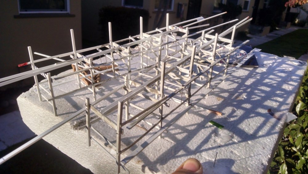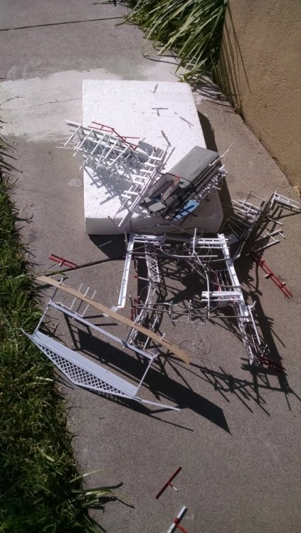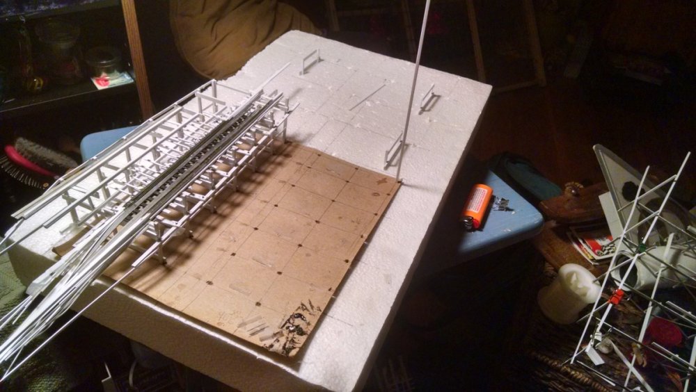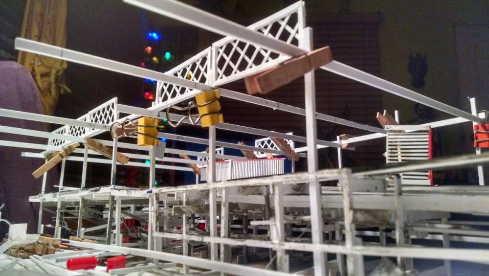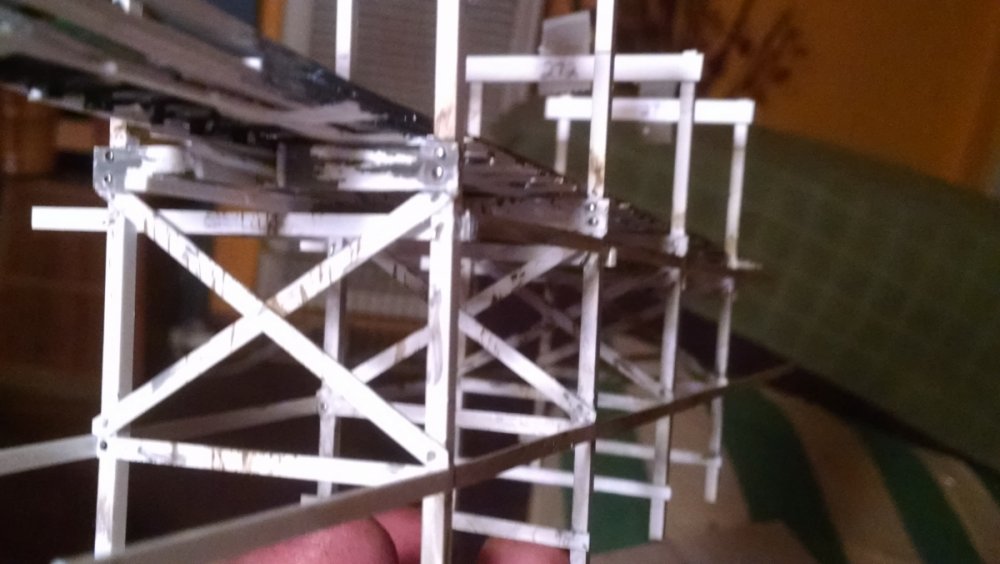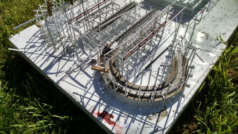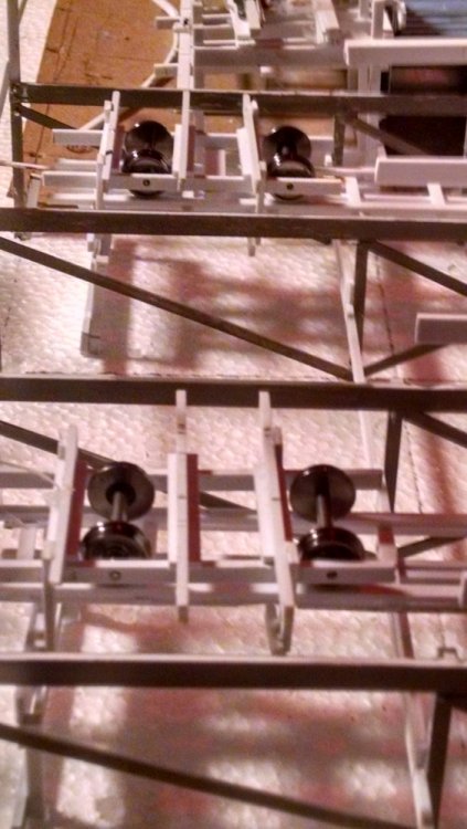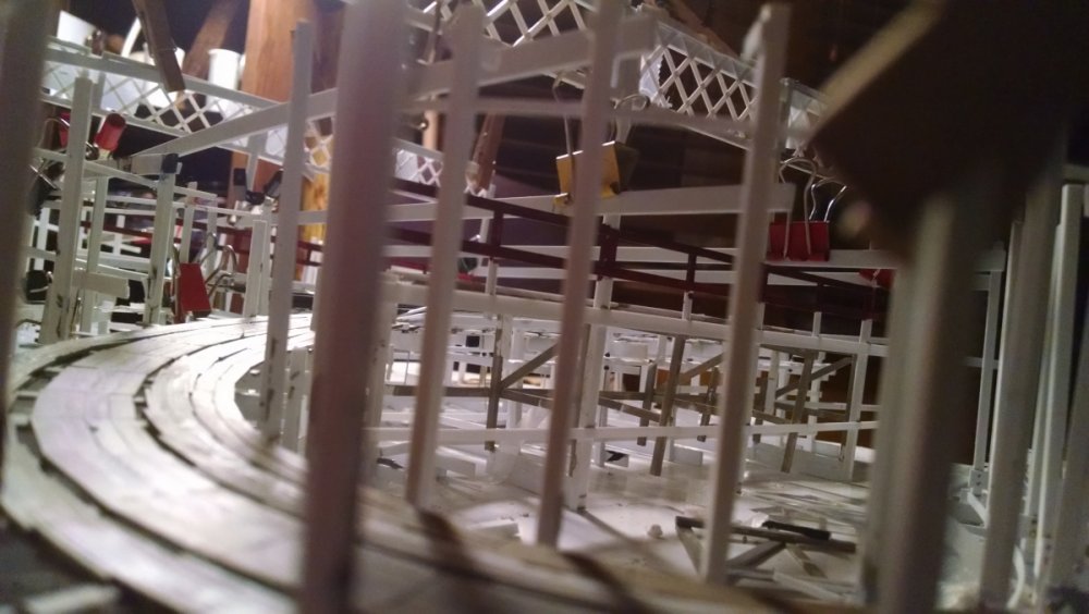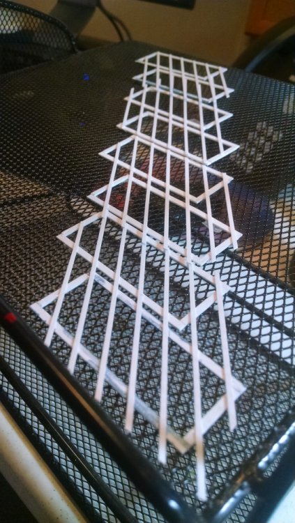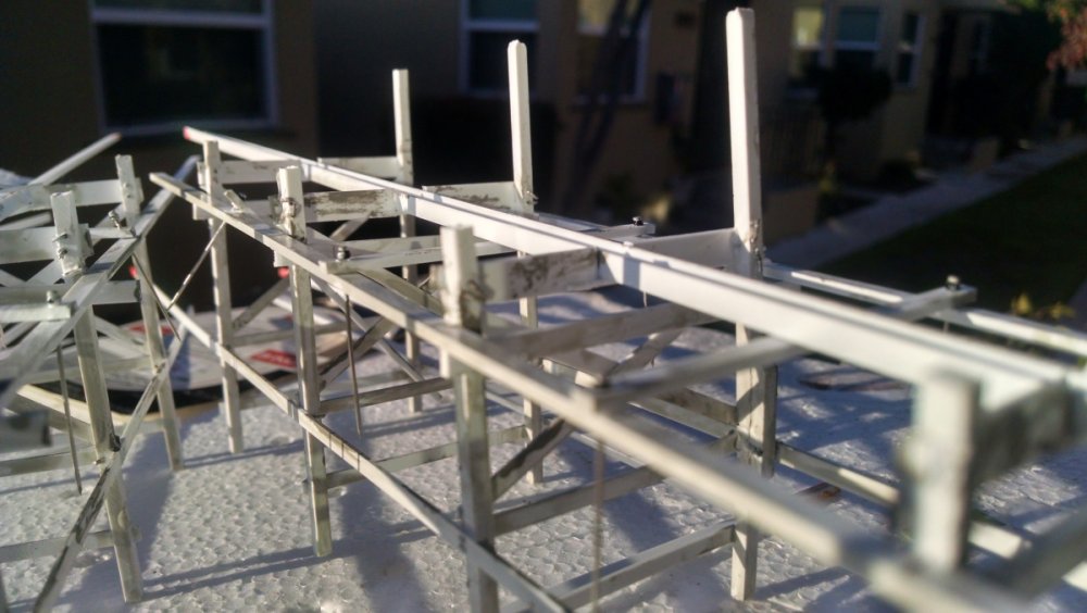 Built into my bents are false horizontal anchors or bottoms. The are for the express purpose of making sure all posts are level. Problem I had with the Airplane, especially in the spirals, the structure started to push outward and bents started leaning without my catching it. Note that one bent on the way lower left and how the anchor appears to be tipped off the base.... That crooked anchor is a more immediate way I can tell if a bent is not straight. Also built in it's a way to correct the problem and as of now has been fixed. Those of you might ask, "Why don't you just glue the bottom to the base?" I like that I can remove sections off the base for better access to detail. -