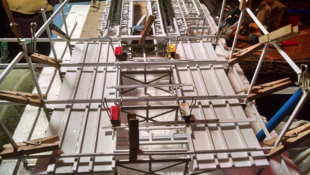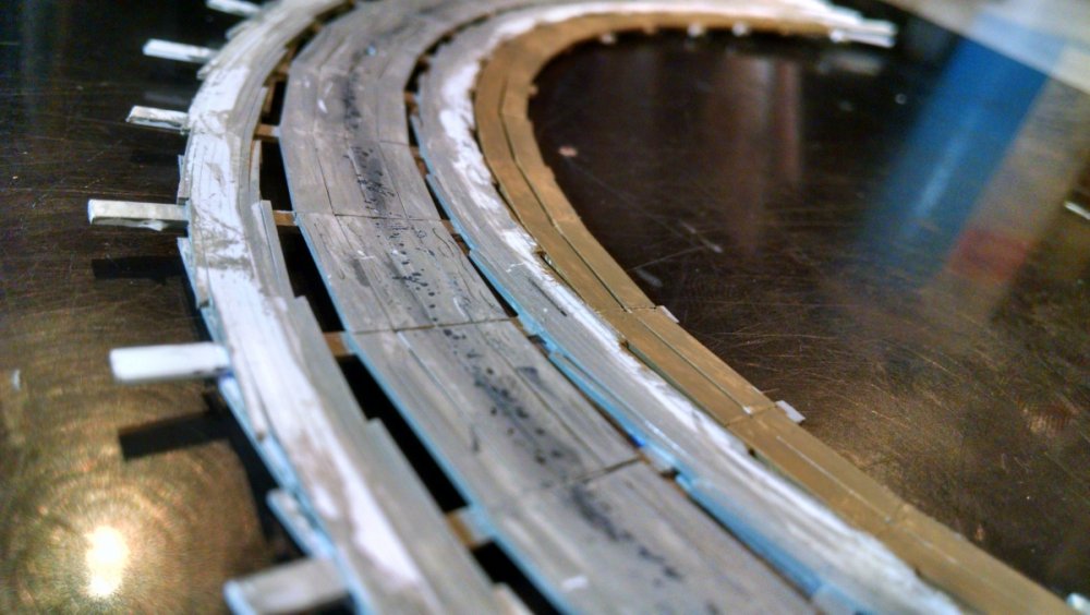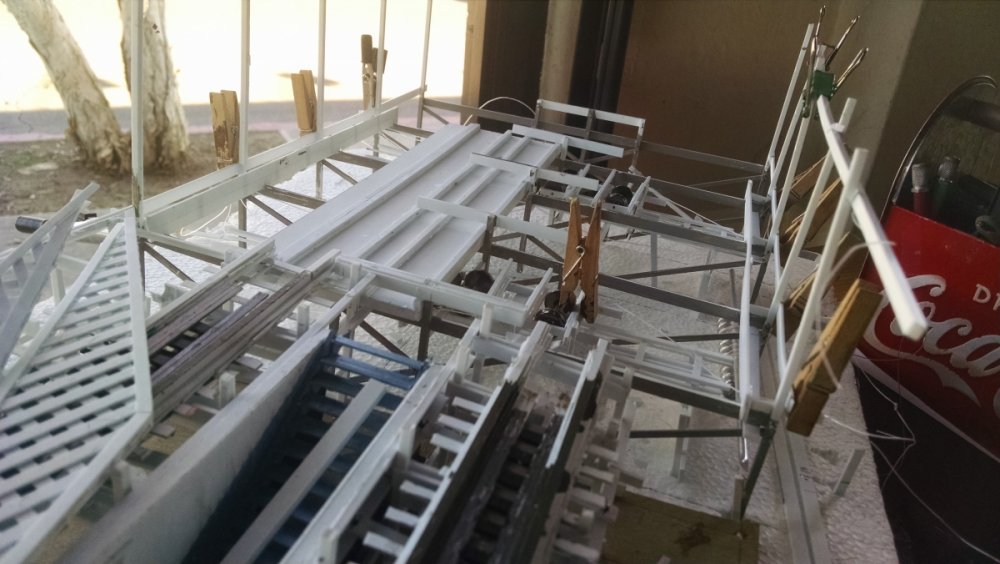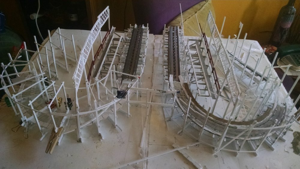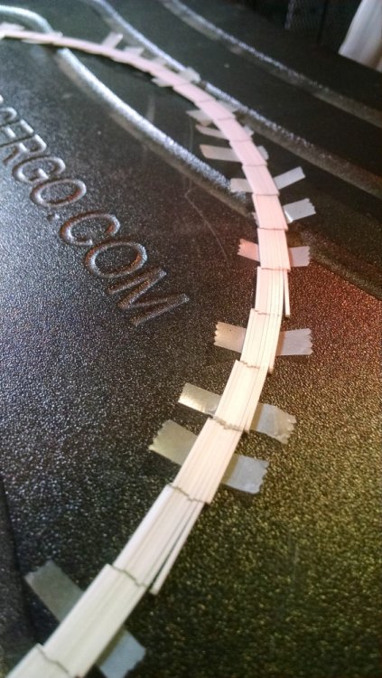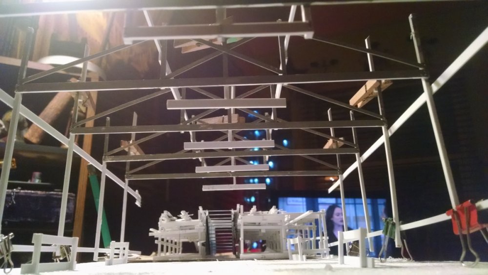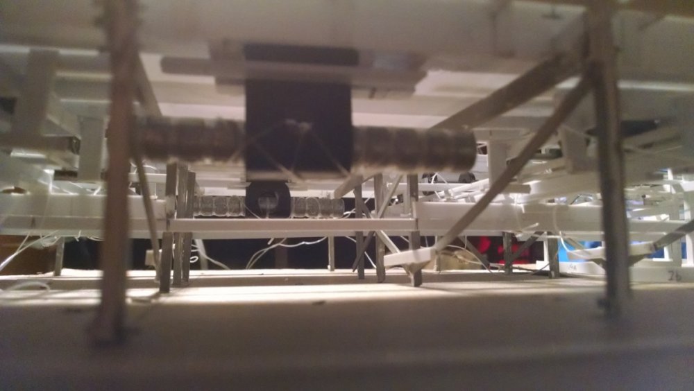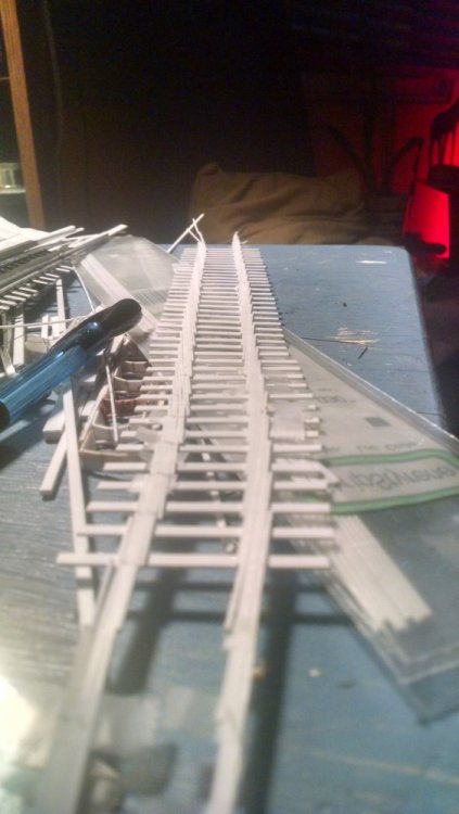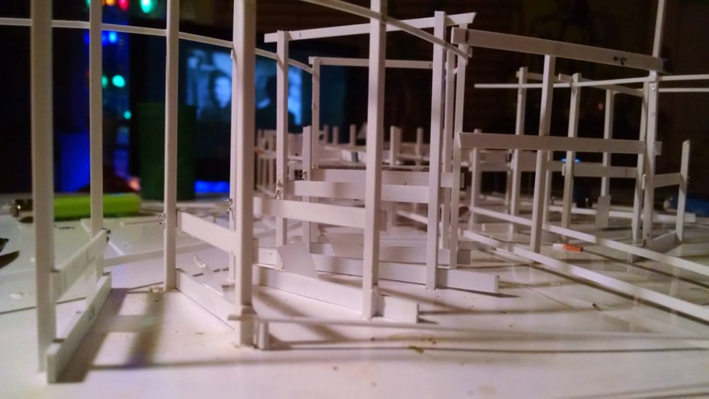 Built into my bents are false horizontal anchors or bottoms. The are for the express purpose of making sure all posts are level. Problem I had with the Airplane, especially in the spirals, the structure started to push outward and bents started leaning without my catching it. Note that one bent on the way lower left and how the anchor appears to be tipped off the base.... That crooked anchor is a more immediate way I can tell if a bent is not straight. Also built in it's a way to correct the problem and as of now has been fixed. Those of you might ask, "Why don't you just glue the bottom to the base?" I like that I can remove sections off the base for better access to detail. -