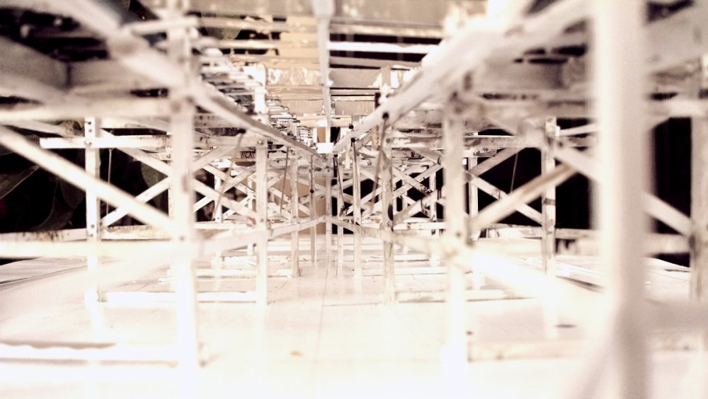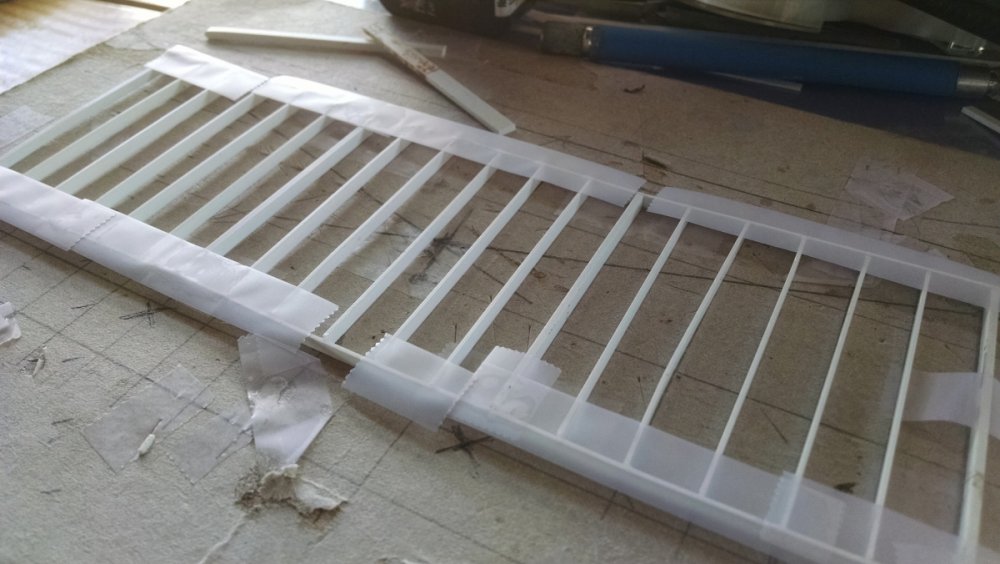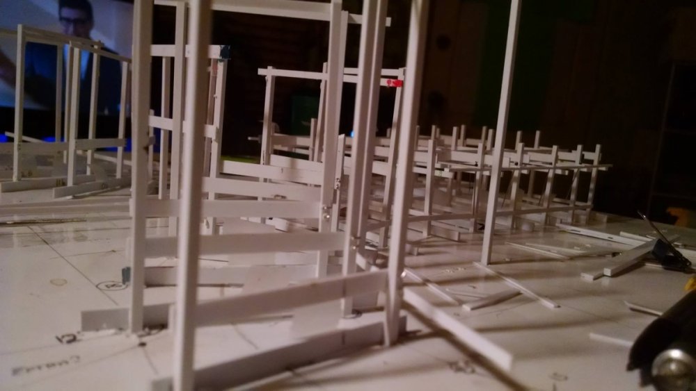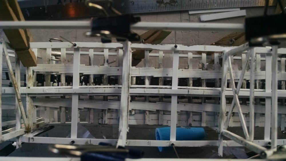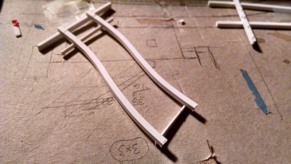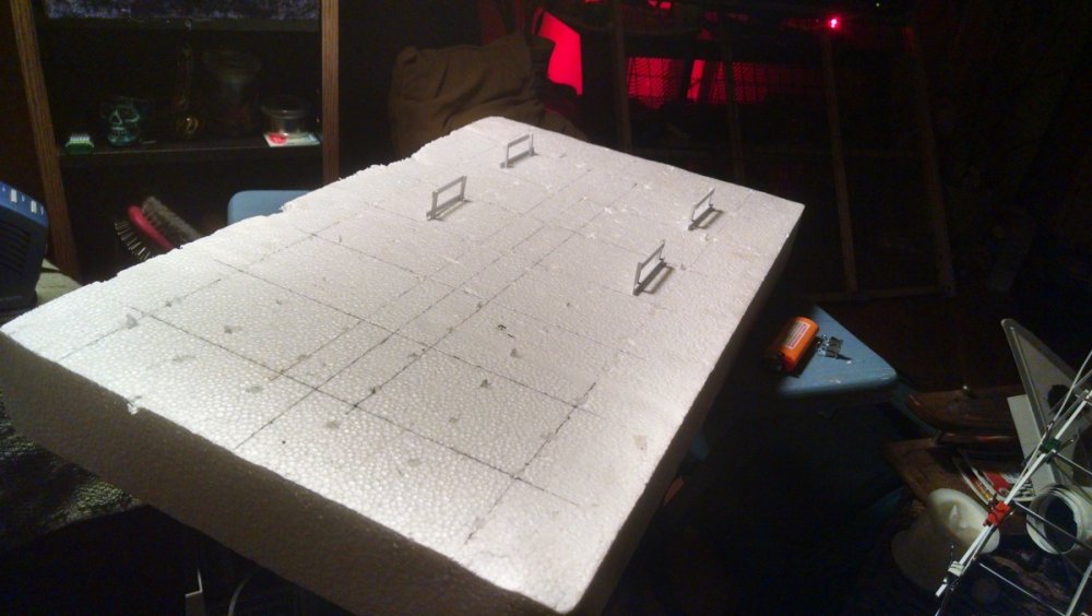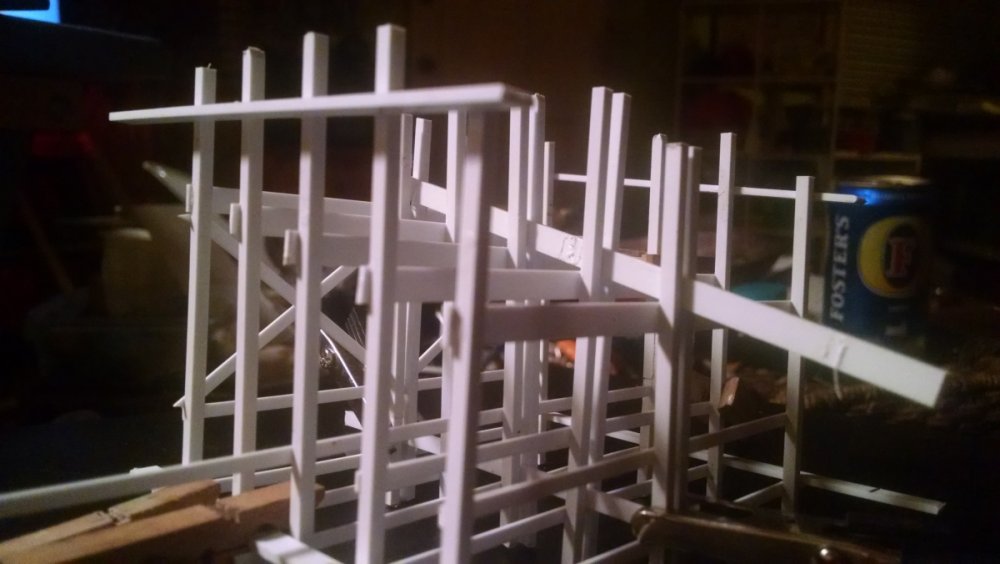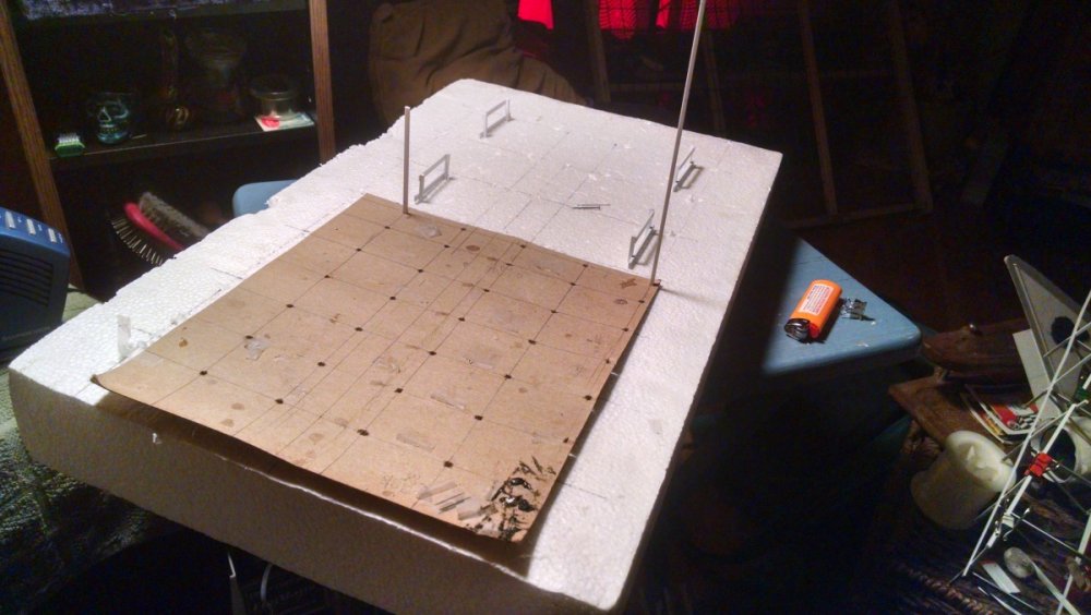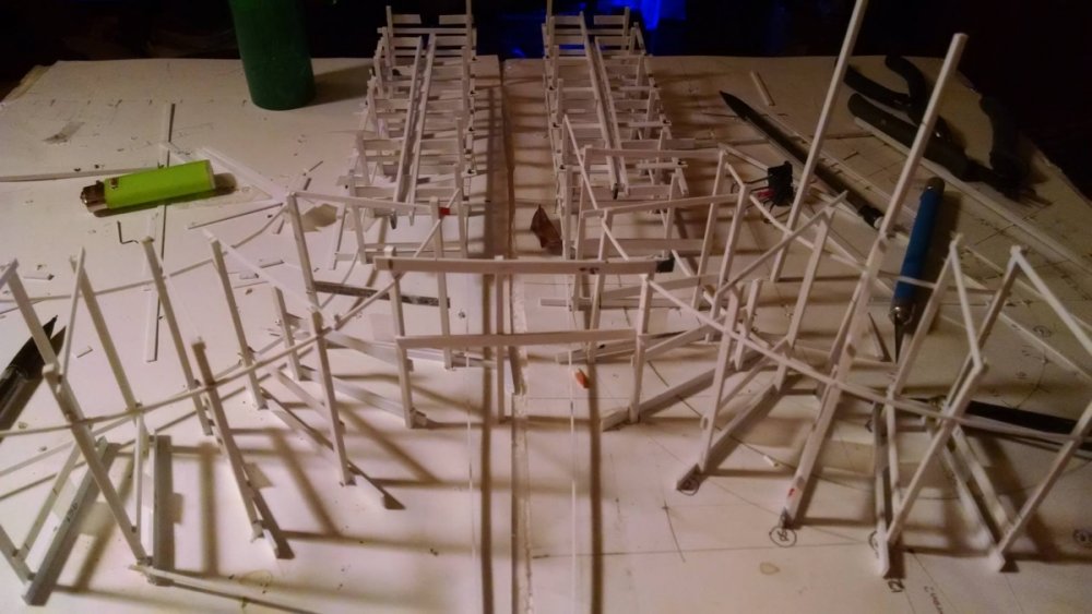 Built into my bents are false horizontal anchors or bottoms. The are for the express purpose of making sure all posts are level. Problem I had with the Airplane, especially in the spirals, the structure started to push outward and bents started leaning without my catching it. Note that one bent on the way lower left and how the anchor appears to be tipped off the base.... That crooked anchor is a more immediate way I can tell if a bent is not straight. Also built in it's a way to correct the problem and as of now has been fixed. Those of you might ask, "Why don't you just glue the bottom to the base?" I like that I can remove sections off the base for better access to detail. -