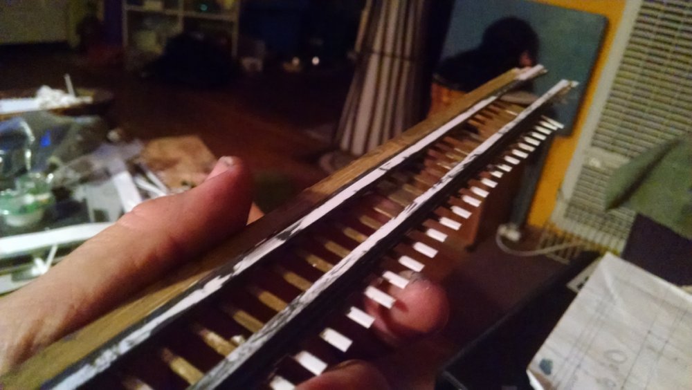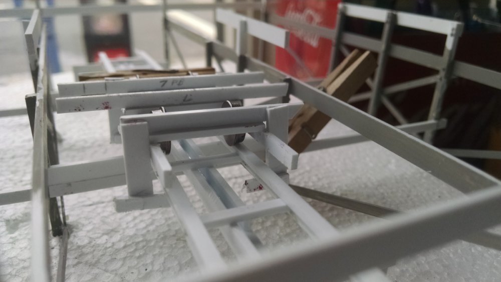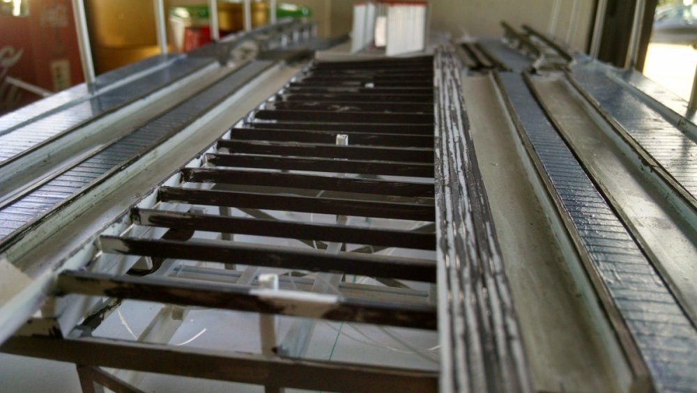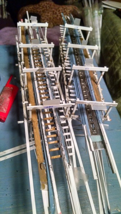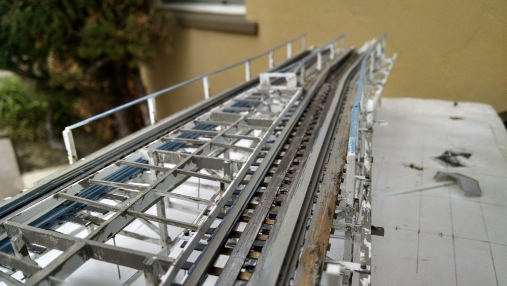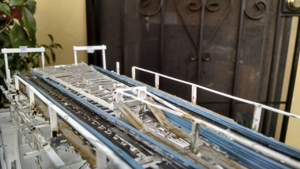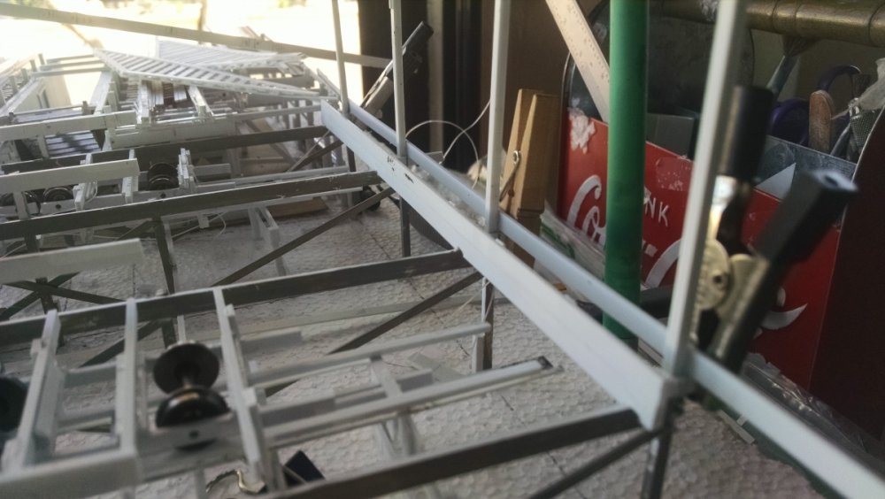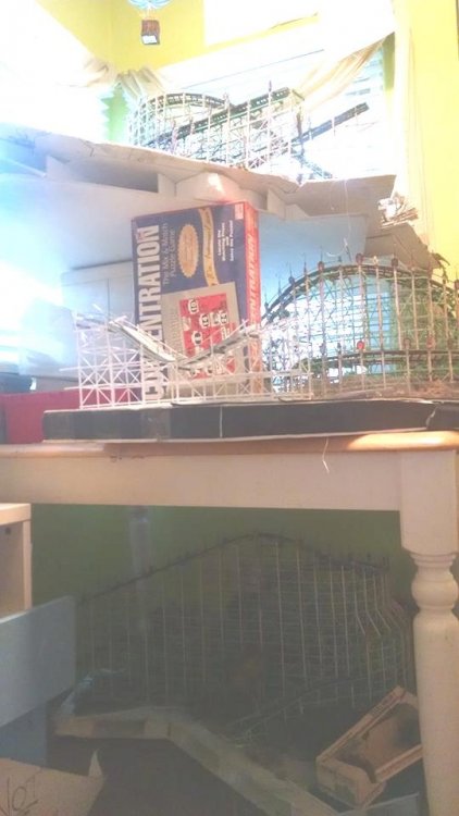Another installment of the Cyclone Racer Drama. Spent the last week on vacation and got a lot done on my coaster model. The photos explain all but find a way to watch the video at the end of the VERY FIRST TEST RUN!! I thought it was best to add some weight to the moving transfer tables so they hold to their tracks better. This is the underside The flip side, you dig. I thought an excellent way to do long stretches of flat track, like the lift hill, brake run and even the horseshoe turns would be to arrange the bents in a compressed fashion as pictured. What shown has the bents at three feet apart when in reality it would be ten. Then I determine the ledger height for the first and last bent, connect the two with a straight line and then add all the ledgers up to that point! Made bents for the final brake run at the end of the ride, after side A and B split before sliding into the station house. Note the sticker and heed to it. It's just two out of three of my primary energy resources that keeps me making. The other thing I love about straight-straight track is I can build it off-structure which makes it easier for both building and painting. This section shows the brake run, transfer table, and the initial drop point at the start of the ride. It’s about 3 feet long and in two sections. Were I to take this whole part out to go work on somewhere, I’ll bet someone would ask if I was making a battleship. Another view of the squiggly track. I suck suck suck at painting. I never used an airbrush because I’m not confident enough. However, my intent was to make a model that looks like an operating coaster that’s about 10 or 20 years old so my painting skills will determine which, LOL. Referencing a photo of the near-restored San Diego Giant Dipper as a guide to help me figure out the Cyclone. Since both are Church coasters, I doubt there is little difference. The Airplane was just like this also. The squiggly track I always see on transfer tables VID_20170121_122203586.mp4 The video of the first test run~ Now before I start hearing from the haters about the color, remember that it was I who designed the pink/teal color scheme for San Diego’s Giant Dipper! Pictured is called Winter Lake. I like the nautical tone of the color – plus it’s left over paint from when I did my trim 8 years ago lol. And I did make an accidental discovery. If I mix a little gold paint in with the blue/gray, it really looks like a painted floor with years to dirt pressed into it! -