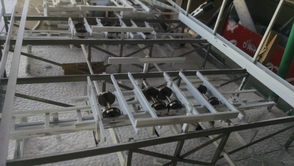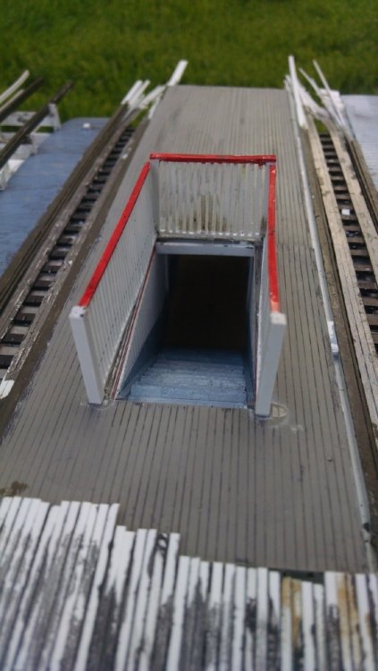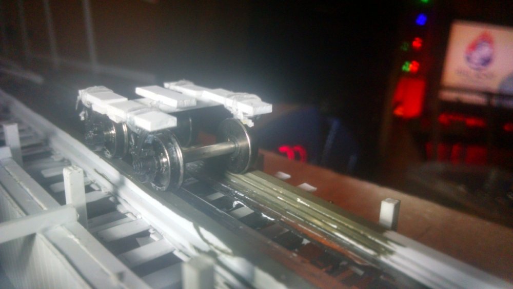 I went to our local train store, Frank the Train Man. It's one of those small old dusty places with a little old lady behind the counter who still writes out sales slips. Last time I was in there was in June when I dropped a few hundred donated dollars on landscaping supplies. This time I asked to look at train wheels. The ones she showed me looked darn close to my track guage. I hesitatingly bought a few and crossed my fingers. It felt like winning a $100 scratch off when I placed the wheels on my track... And it rolled. It was perfect! I did not plan on matching my guage to any particular existing model train guage. I expected to change the axel width. I had also planned to employ the wheels to make a working transfer table. Photo is of the rollers for shifting the t-table and the running track. Installed the transfer table rolling track. Transfer track rollers installed... ... And secured. Squaring the back end of the station is crucial to a functioning table. Plus, both halves have to be exact identical opposites. All wheels on position. Almost ready to glue on the table. Bumper wall. One table VID_20170117_200906896.mp4 It even sounds like a real t-table!