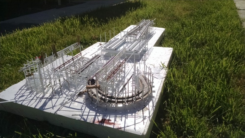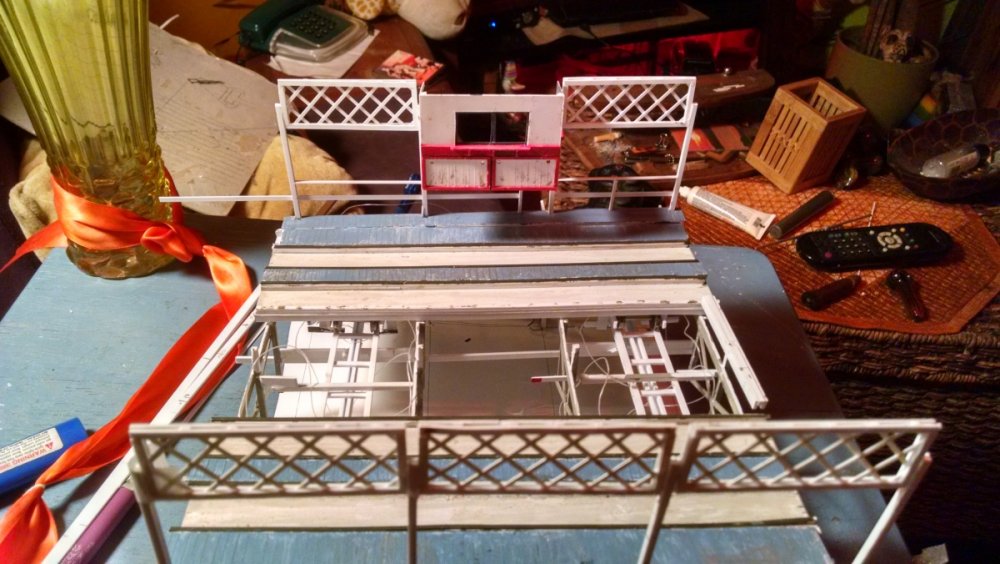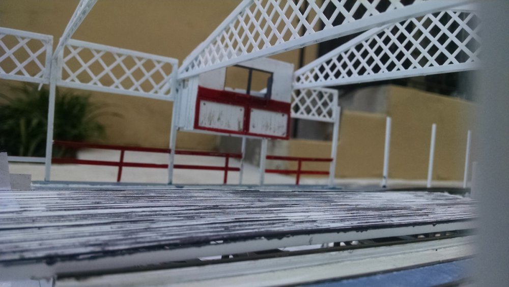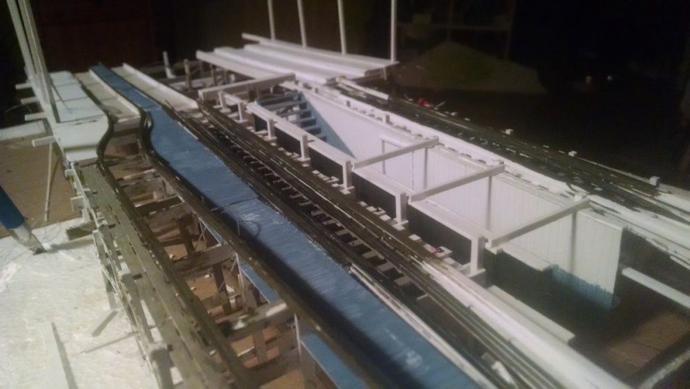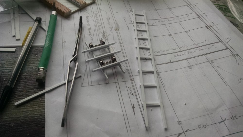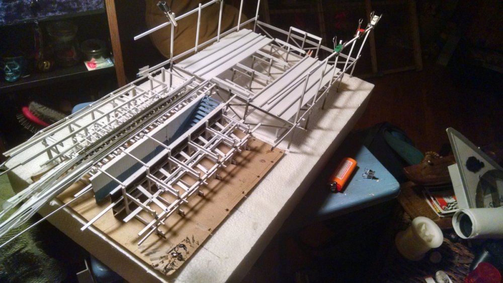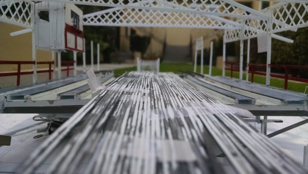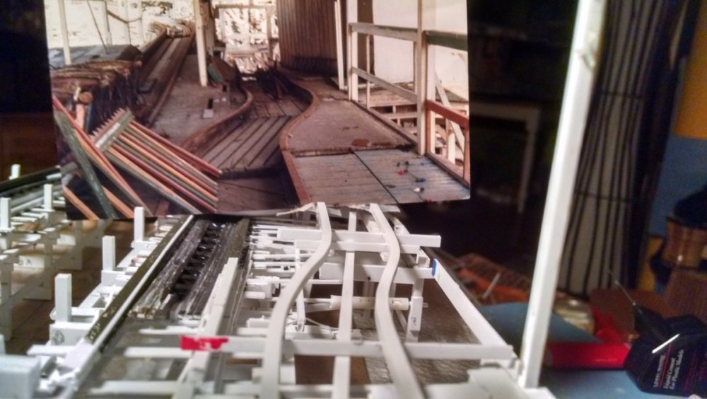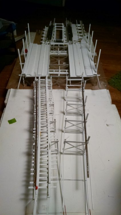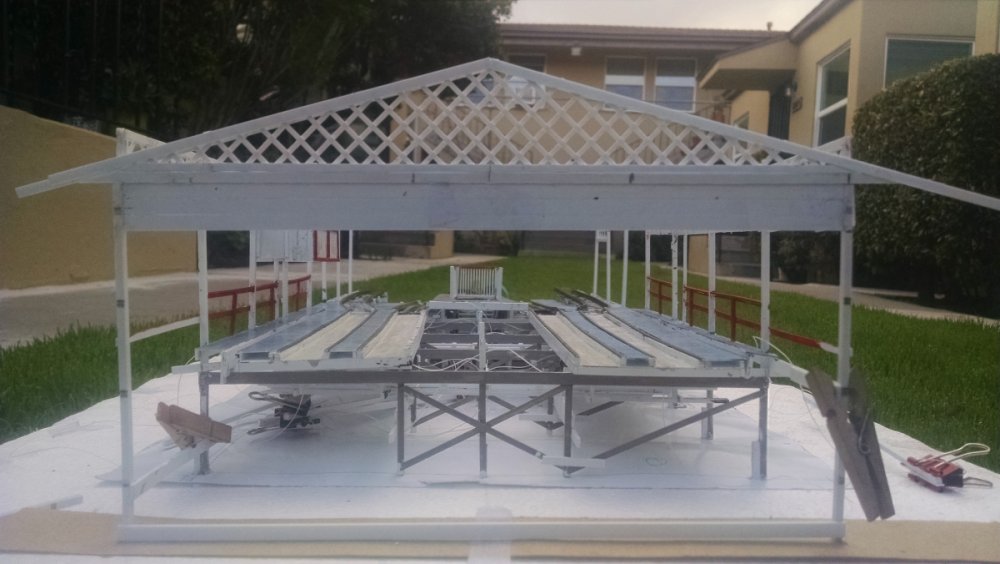 The station house is finally beginning to look like something. Frame for the station house eaves trellis before popping out of the template Popping the frames out of their template. Then I added the lattice. Rather than do a big mass production I did each one individually. I am pleased that the criss-crosses each seem to line up near perfect. Here is a stack of four or five trellis. Random shot of my neighborhood corner. My inspiration. Adding the completed trelli to the eaves. Making slats that will be part of the exit stair handrailing There it is. Made a wall as part of some room that is part of the station (up against a photo of the real McCoy. Save for the center decking and the stairs leading up to the side room, the transfer table area is done. Starting floor joists for center decking. Painted and test fitted. I'm actually doing individual planks for the floor as you can see over on the right as I start installing them. Because of my being so meticulous my scale, it will have the exact same amount of planks across. Unpainted floor sits temporarily in place. I painted the insides of each plank dark gray. The bleed through will give the floor a good texture/contrast when I paint it over. Art shot. Over time there were a few structural changes to the station house. I decided to make it in later years when they really had to beef up the structure, hence the extra lumber used to support the end lattice of the roof. Once I got a pattern going, of took me about 45 minutes to make each trellis. Note that some of them have thicker criss crosses. Those support the roof directly under the horseshoe turn. The office, storage area, paint room, whatever. Trellis work being temporarily fitted. Note that hand railing is installed too. Looking down the exit stairs. -