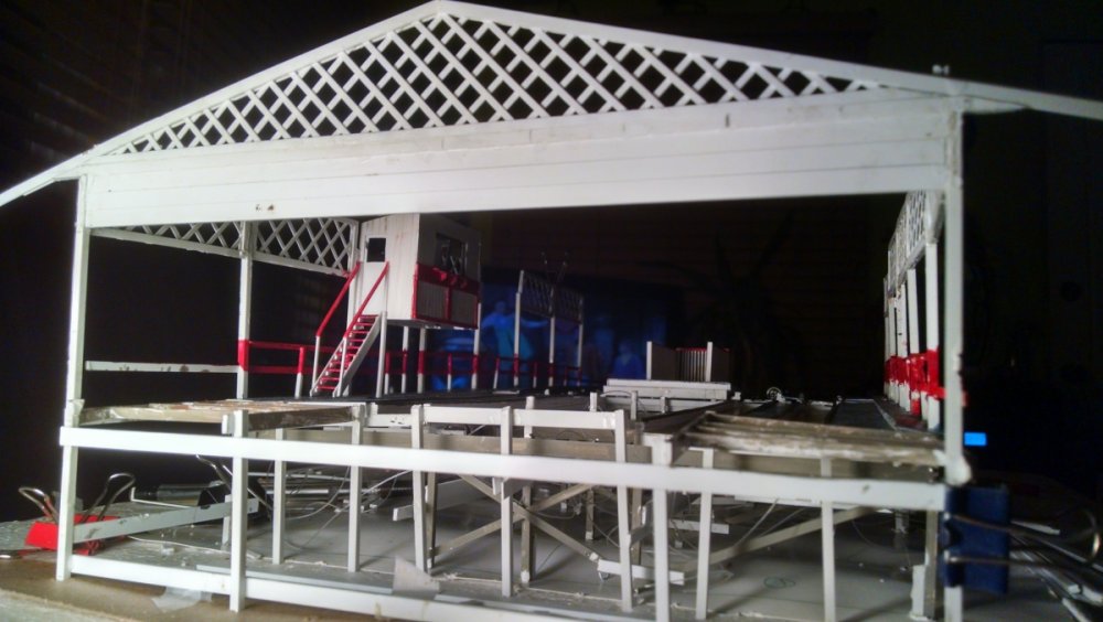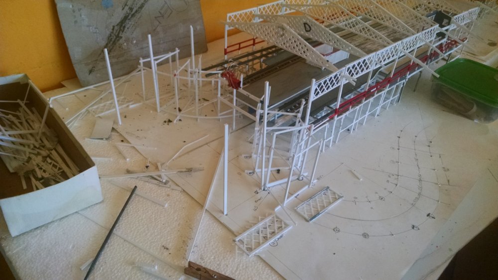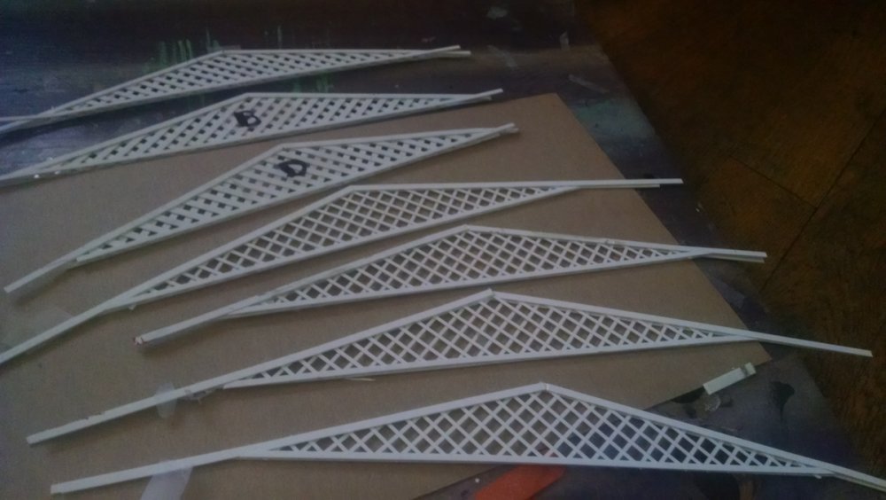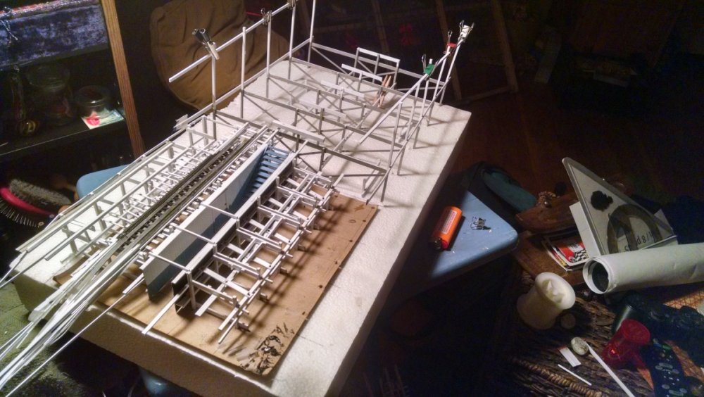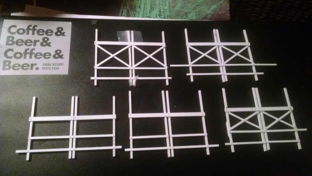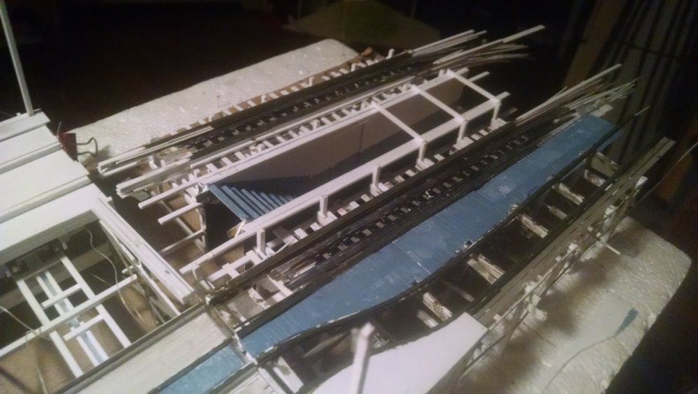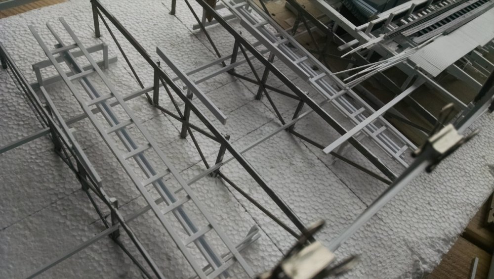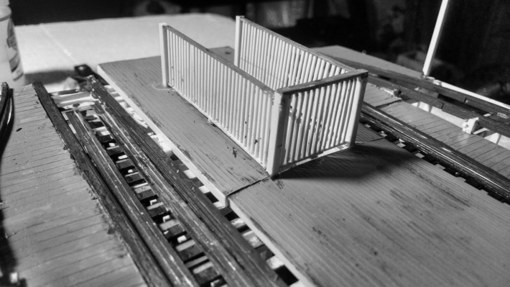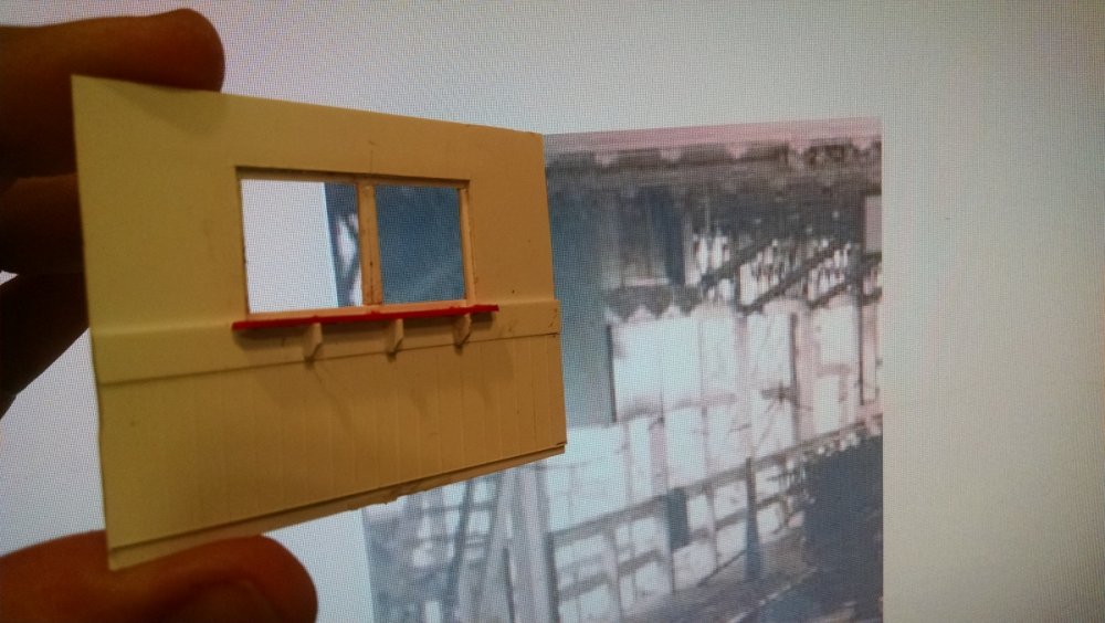 The station house is finally beginning to look like something. Frame for the station house eaves trellis before popping out of the template Popping the frames out of their template. Then I added the lattice. Rather than do a big mass production I did each one individually. I am pleased that the criss-crosses each seem to line up near perfect. Here is a stack of four or five trellis. Random shot of my neighborhood corner. My inspiration. Adding the completed trelli to the eaves. Making slats that will be part of the exit stair handrailing There it is. Made a wall as part of some room that is part of the station (up against a photo of the real McCoy. Save for the center decking and the stairs leading up to the side room, the transfer table area is done. Starting floor joists for center decking. Painted and test fitted. I'm actually doing individual planks for the floor as you can see over on the right as I start installing them. Because of my being so meticulous my scale, it will have the exact same amount of planks across. Unpainted floor sits temporarily in place. I painted the insides of each plank dark gray. The bleed through will give the floor a good texture/contrast when I paint it over. Art shot. Over time there were a few structural changes to the station house. I decided to make it in later years when they really had to beef up the structure, hence the extra lumber used to support the end lattice of the roof. Once I got a pattern going, of took me about 45 minutes to make each trellis. Note that some of them have thicker criss crosses. Those support the roof directly under the horseshoe turn. The office, storage area, paint room, whatever. Trellis work being temporarily fitted. Note that hand railing is installed too. Looking down the exit stairs. -