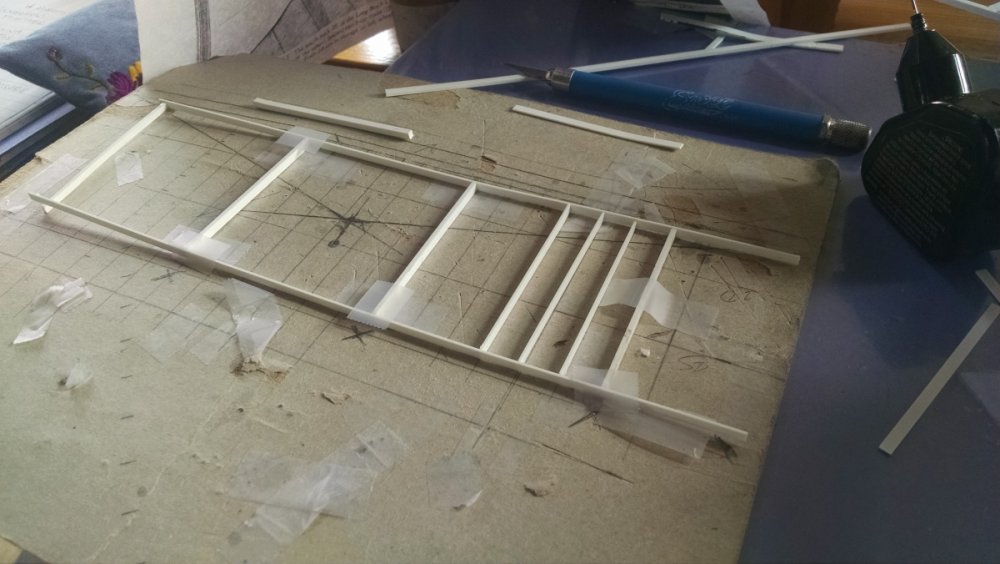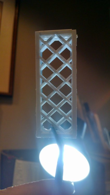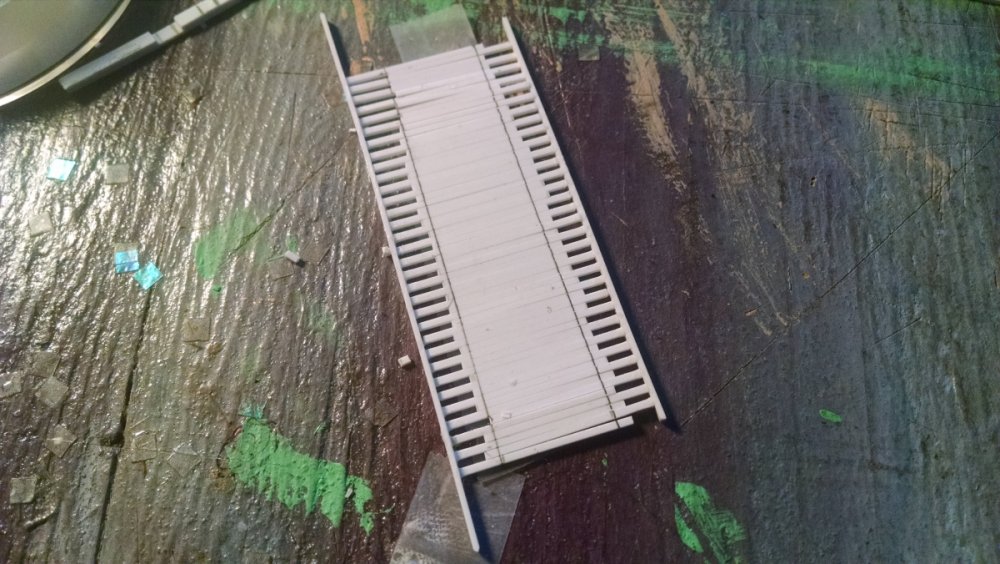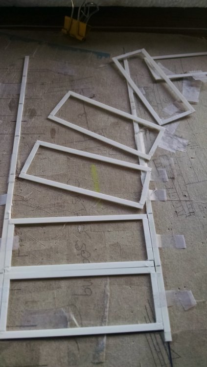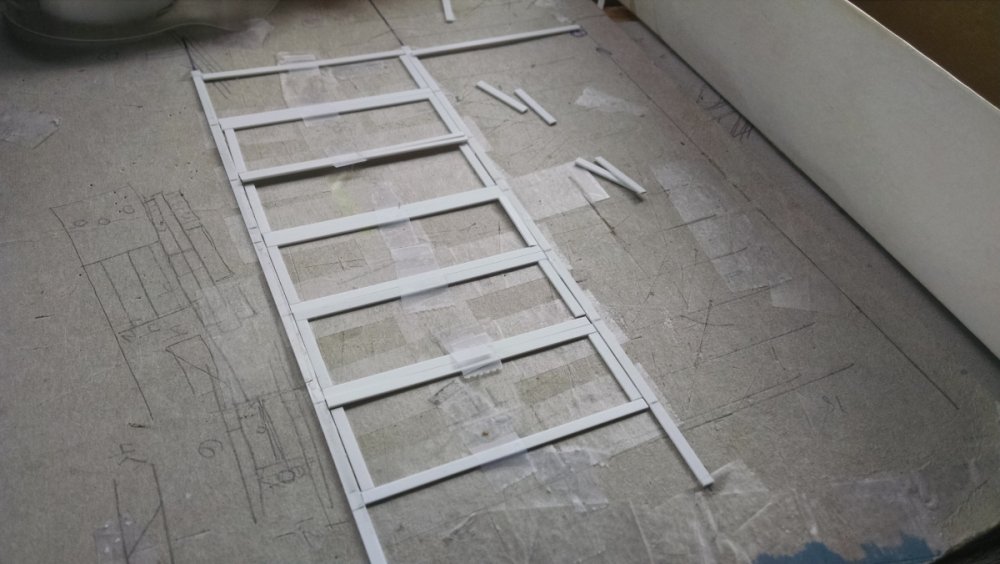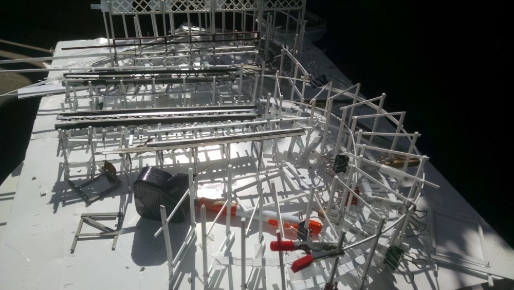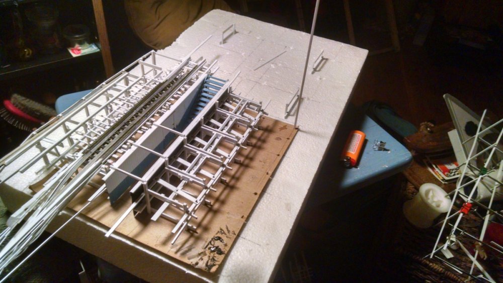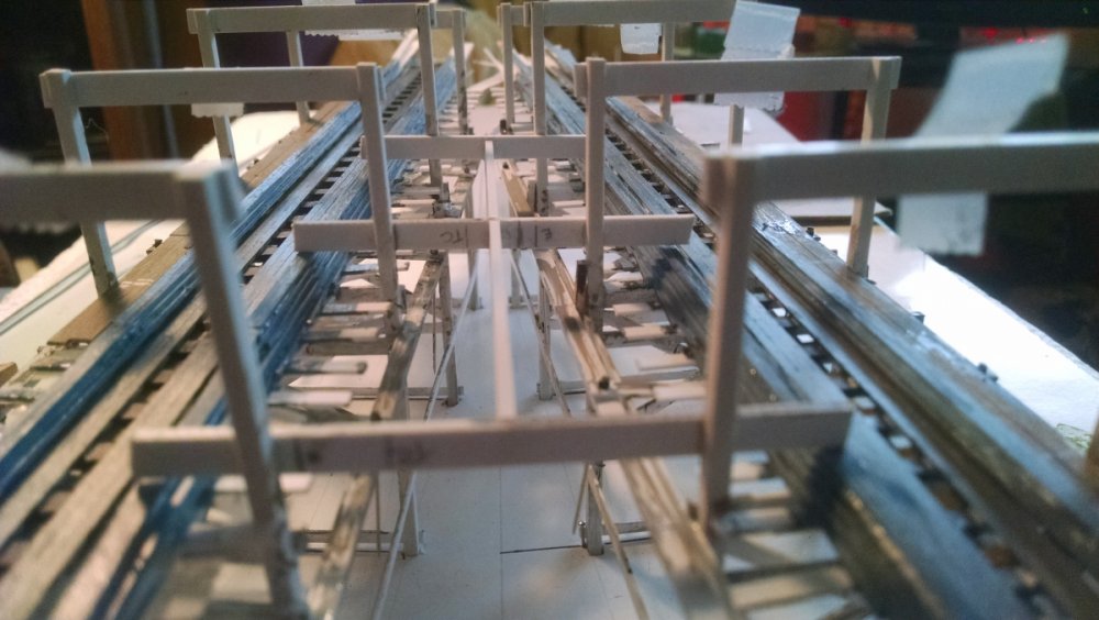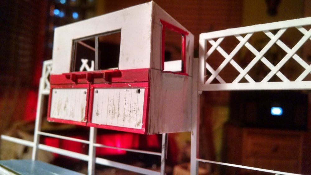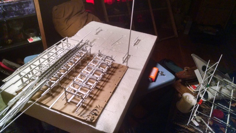 The station house is finally beginning to look like something. Frame for the station house eaves trellis before popping out of the template Popping the frames out of their template. Then I added the lattice. Rather than do a big mass production I did each one individually. I am pleased that the criss-crosses each seem to line up near perfect. Here is a stack of four or five trellis. Random shot of my neighborhood corner. My inspiration. Adding the completed trelli to the eaves. Making slats that will be part of the exit stair handrailing There it is. Made a wall as part of some room that is part of the station (up against a photo of the real McCoy. Save for the center decking and the stairs leading up to the side room, the transfer table area is done. Starting floor joists for center decking. Painted and test fitted. I'm actually doing individual planks for the floor as you can see over on the right as I start installing them. Because of my being so meticulous my scale, it will have the exact same amount of planks across. Unpainted floor sits temporarily in place. I painted the insides of each plank dark gray. The bleed through will give the floor a good texture/contrast when I paint it over. Art shot. Over time there were a few structural changes to the station house. I decided to make it in later years when they really had to beef up the structure, hence the extra lumber used to support the end lattice of the roof. Once I got a pattern going, of took me about 45 minutes to make each trellis. Note that some of them have thicker criss crosses. Those support the roof directly under the horseshoe turn. The office, storage area, paint room, whatever. Trellis work being temporarily fitted. Note that hand railing is installed too. Looking down the exit stairs. -