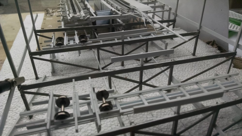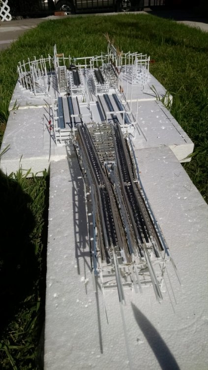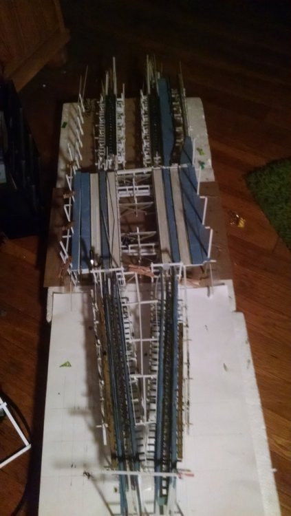 A photo essay of where I am at this point. With the prototypes and do overs, I’m going to estimate my actual start time at January 1 – thinking it would take about 1 month to build this in one straight shot. Enjoy! Styrofoam base Cover with the schematic of what’s to be built. Station loading and departing side B. Add station loading and departing side A. The exit stairway and hall just slide right in between A and B. The basic back end frame for the station installed. Add the transfer tables. Train storage track side B and some flooring added. Flipped the back end frame of the station house to install transfer table under rails – and I thought this was a neat view. Track and rollers installed for transfer tables. Bents for the brakes section just outside the back of the station house. Detail photo test of what my weathering skills look like. I’m trying to eliminate some of the extreme white so I smeared with a watered down light gray for inconsistency. The underside of the brakes section. Note the track laminations, true to Fred Church’s design. I thought I’d paint the track German Gray first, before painting it the blue/gray. That way I won’t have any white showing through. Getting ready to join these two sides together. Main joists that will support the exit deck were installed to unite both the side a and b brakes. If it looks crooked, it probably is because I didn’t catch it before taking the photo. -