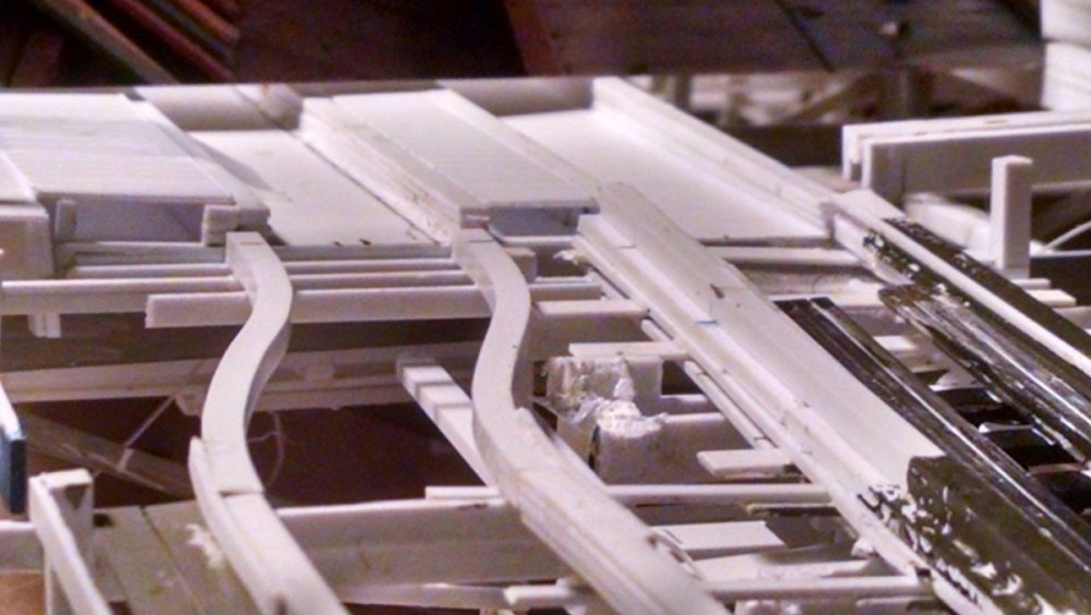 This week I'll be working on the very front end of the station house which involves the two hook-shaped turns that take the trains to the lift hill. I put on the ledgers yesterday, and now I'm making templates for the track gauge. Soon I'll be adding track!! The trains will depart the station and split before joining again at the top of the lift hill. Side a Side b I was able to pull this AWESOME screen grab from "Abbot and Costello go to Hollywood". This is where the trains switch sides. A VERY rare angle and very helpful. -