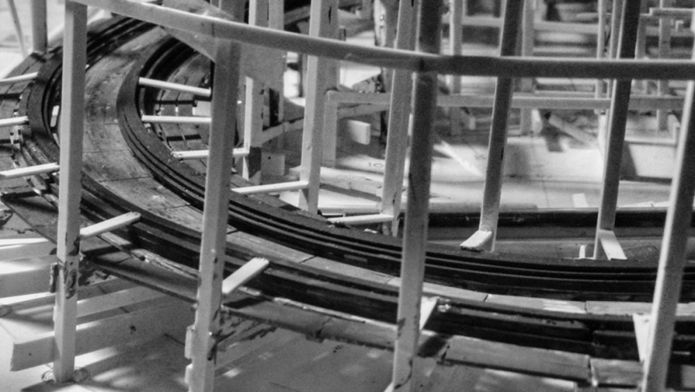 Tim here with the latest breaking news: It’s been a busy couple of weeks. You’re all probably going to roll your eyes when you find out I’ve had to go back and REDO the entire front half of the station house. The easiest way I can explain it, what was originally going to be built in two sections should have been built as one unit. When I was trying to splice the two pieces together, it really fuc..d things up. Plus I was going back and looking at some previous photos and was not really happy with what I was seeing. And this is an important model so I want it to be perfect. Good news is I’m thrilled with how it’s all coming together now. Someone asked me how I made my track: I am going to duplicate Fred Church’s track style (for the most part). There are eight layers of 2x lumber in his track. Here is layer one – eight sticks of 2x2 (for each rail). Photo shows four rail’s worth. The evenly spaced marks help keep the laminations consistent. I clip off a section thusly And move it over to the other side, and attach. That’s just the beginning – For the rest of the way I repeat the process one stick at a time. Clip Move to the other side Now we have a nice long stretch of authentically replicated Fred Church sub-track. Working some handmade crimps from one end to the other gives me a nice curve. I just curve it close enough, and it’s amazingly pliable and easy to get a perfect curve. Two sub track runs in place Leap ahead: Added ties, another layer of laminates (crossing in the opposite direction as the bottom) and boards that the original Cyclone Racer had between the rails. I’m waiting for a shipment of more materials before I can stack the other 5 layers. Bents for both departure runs are now installed Sides of the station house and the lattice work “roughly” in place. The curved track beds in place. -
