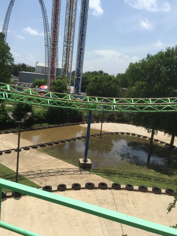 Park is pretty quiet today. Just some school groups mainly. After my recent trip to CP, the ops here make me sad lol. That being said, they're not terrible. Just. Meh. Titan and the Go Carts are both down for the day. I presume Titan's tunnel hasn't finished draining. The cart track for sure is still slighly flooded. Everything else seems to be going as normal. The go carts weren't even in the station...I'm curious where they store them. Wouldn't it be fun to drive the go carts through the park?! The go cart track is still draining. This pic was taken after ShockWave was fully stopped and stacked. The creek is still flowing over the access road to the back of the amphitheater.