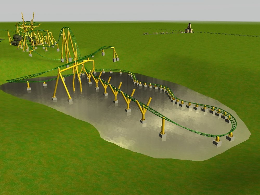 I really like this park! You've made a great start and I can see you've got a lot of room left for expansion However, with your Arrow looping coaster, or it may be a Vekoma? Im not too great with my coaster manufacturers.. But i'm pretty sure that they don't normally have more than 2 corkscrews? Don't take my word for it, but a possible suggestion would be to remove the third corkscrew and maybe add a small helix? Other than that, Great Start! -