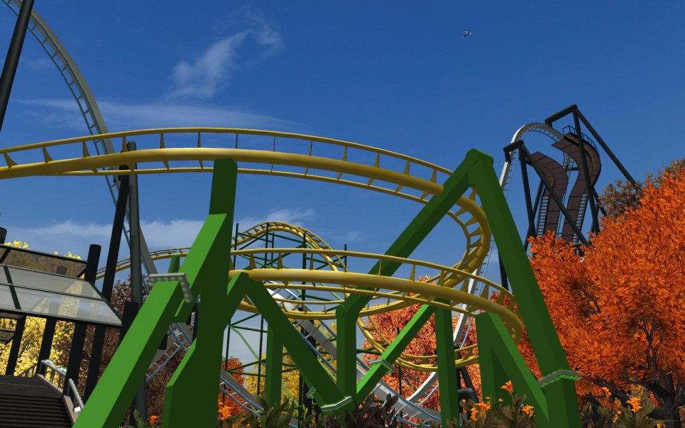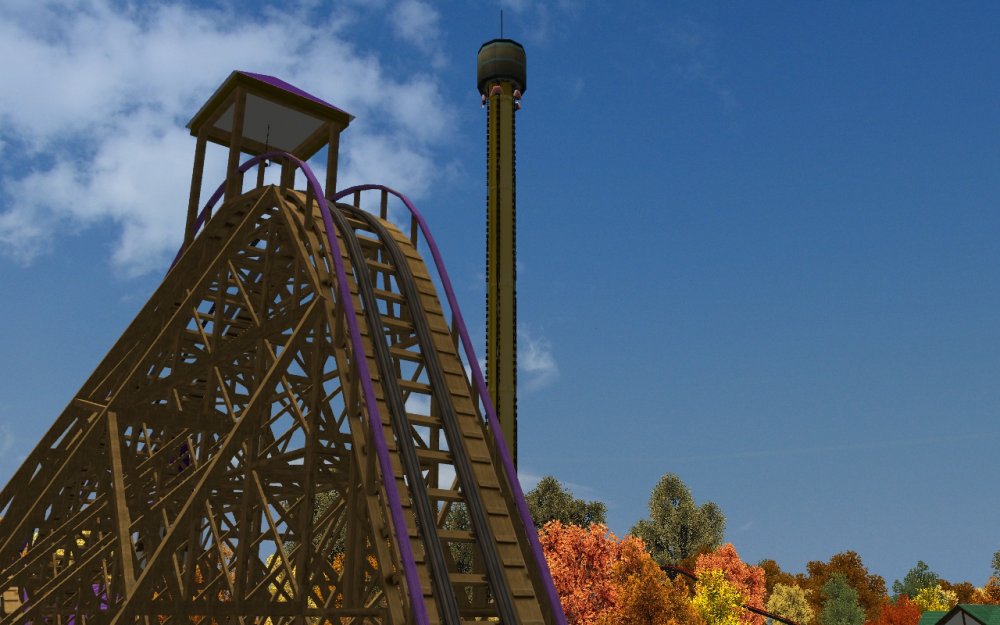 [RCT3] Arcane Lake - More Fall!grrt replied to grrt's topic in Roller Coaster Games, Models, and Other Randomness Arcane Lake - More Fall! Fall, fall, and a little bit of autumn! Willard's Whizzer, an old school Schwarzy stays open for Halloween as well. You won't be able to get this shot once the next haunt goes up. Some modern architecture, and a tightly packed area. The first turnaround on Raven. Looks pretty intimidating from behind. Raven and the mighty tower in the background. Fall and the Raven. Together like peanut butter and jelly.