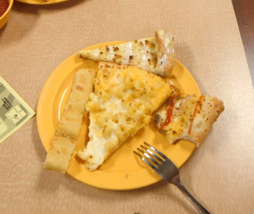 A few more pictures! (Forgot to throw this pic in before) Another lengthy line, and on a day such as today, the heat can be a killer. Thanks to Lyle, we were able to get on, get soaked, and get off in no time at all. Such a great investment! Popeye's at Islands of Adventure will always be my favorite rapids ride, but Roaring Rapids is fun enough. Watch out for those water jets! Jeez Great America. The water was pretty nasty in most places, and at X-Flight it is bad enough that it is giving off noxious gas! Please do a little cleaning up. ;D X-Flight diving through a mess of supports. Plenty of near-misses during the ride as well. In case you forgot which ride you were waiting for. This ride op was very cool too. I was happy to see more people enjoying their job today. OOO-WOOP! =D One more key hole shot because it is a pretty awesome inversion. With it being near 8 o'clock, I wanted to try to get *just* one more ride on V2. When I went to reserve a spot, however, the wait jumped from 4 minutes to 16! Okay, fine God. I'll skip that last ride and call it a day. I only wanted to fit in *one* more ride. [Oh who am I kidding? I would have probably tried to fit in another ride. Or three. ;D ] Okay, the thing is that up here in Wisconsin, we don't have any Cici's, which I grew to love on my Kentucky trip. In a mighty show of good will by the Big Guy himself, one opened up in Milwaukee. I remember some TPR members not liking Cici's very much and I was curious why. The pizza is above average and the people who run them are often very awesome, friendly people. There were some I've been to that seemed a little down, then there were others where the employees were very easy-going and asked if you wanted your own pizza. This one was pretty amazing. =D My first plate, comprised of a slice of mac n' cheese pizza, cheeseburger pizza (complete with ketchup drizzle), breadsticks and a dessert pizza. It's not the *best* pizza I've ever had, but it is quite good and VERY cheap. I also got a kick out of it when JoJo told the owner he had never been to a Cici's, which was followed by a tap on the bell and a chorus of "Welcome to Cici's!" from the staff. If you haven't been to one, maybe just give it a try. It should be an enjoyable visit. THIS. This is a Cici's cinnamon roll. It is a sticky, sweet, amazing experience. I couldn't seem to get a picture of one without a bite taken out of it. ;D If you take a trip to Cici's, please have one. You will not be dissapointed. JoJo took one bite and gave me a stare that read "Why the hell has it taken this long to have one of these?" That concludes this exciting episode of The Adventures of LoneRider. Please tune in next time for (most likely) a visit to Mt. Olympus to tangle with Hades. Questions/comments/suggestions would be appreciated. Thanks for reading! -