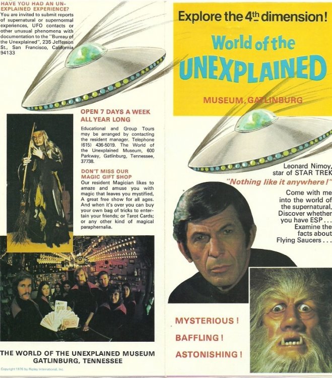 In the 70's Ripley's opened two museum called World of the Unexplained. One was opened in San Francisco, CA and the other in Galtinburg, TN. I had the opportuntity to visit the one in Gatlinburg. Being a fan of the TV show "In Search Of' I found it an awesome museum. In fact Leornard Nimoy did a presentation when you first walked in. I remember a display of a nude witch and a life like statue of Bigfoot. My mother was not to keen on the nude witch display. I managed to get one of the pamphlets from the on in Gatlinburg.