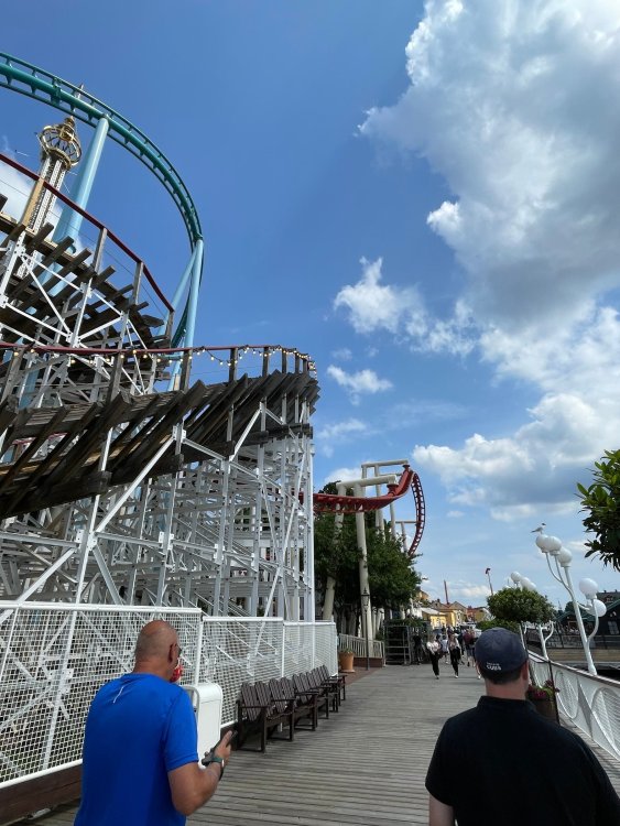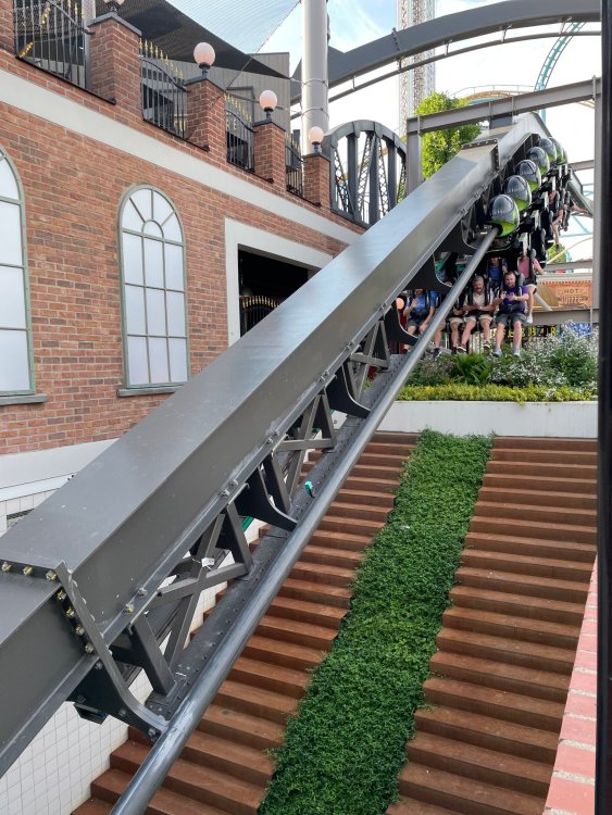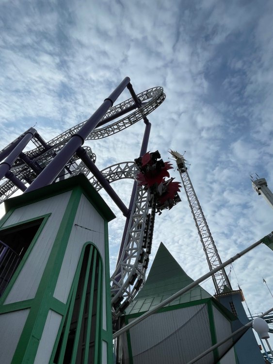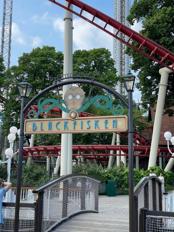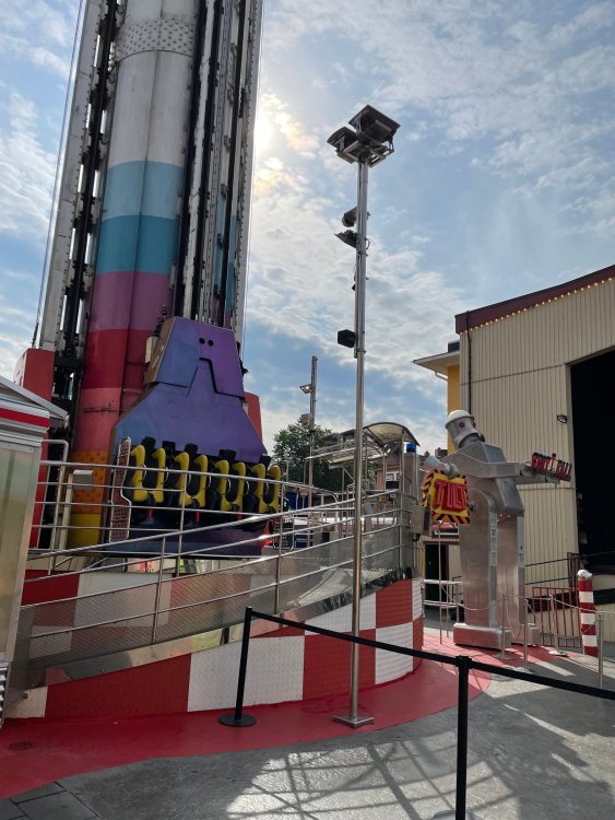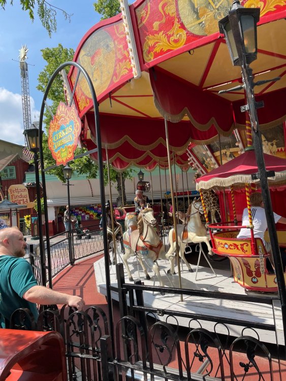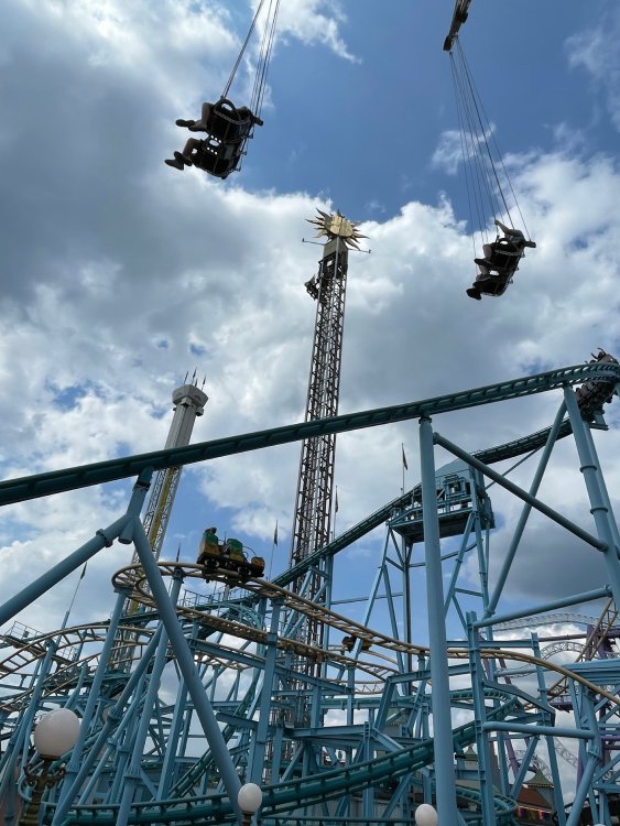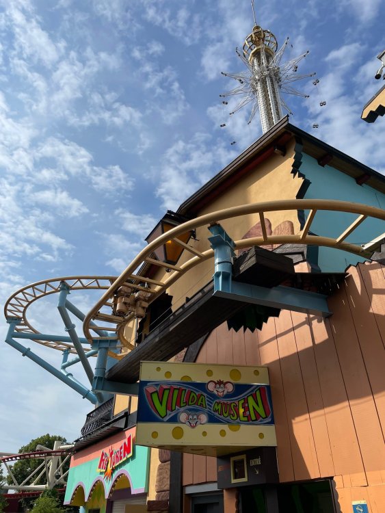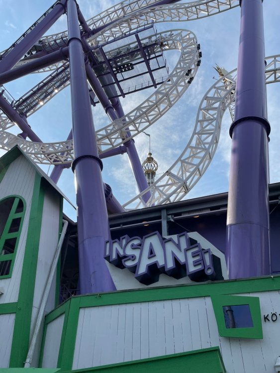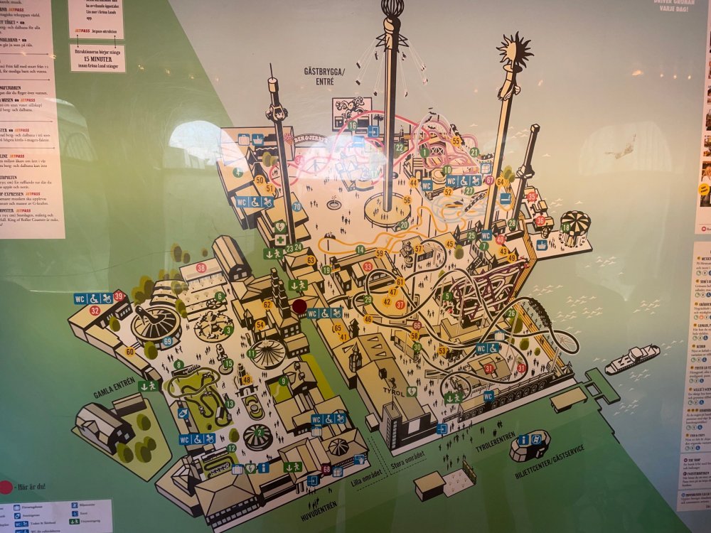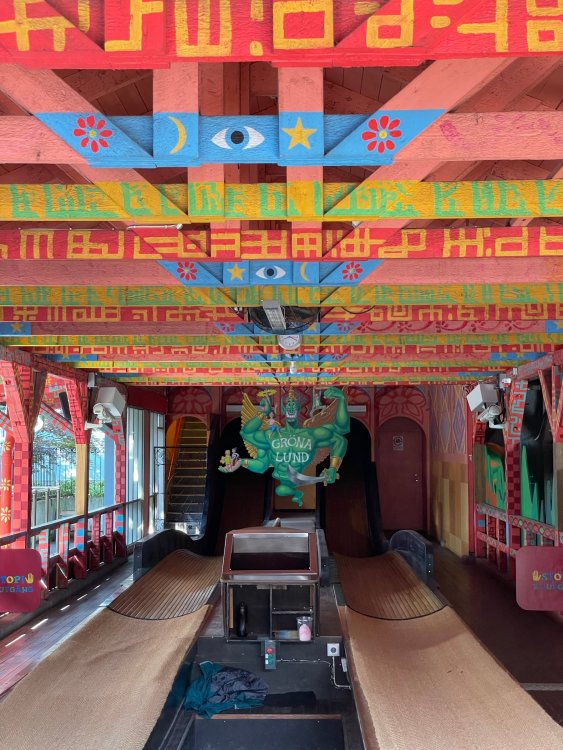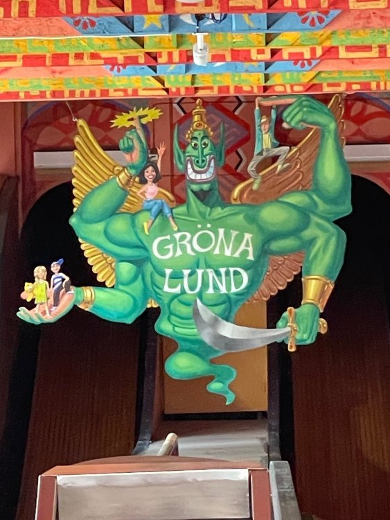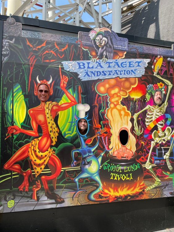 11. Day 18: Tuesday, June 20th part 3 (of 3) - back to finish off the night at the fantastic Grona Lund On the way back in, stopping to snap a pic of the park map. it LOOKS way smaller than it is, because things are just piled up on top of each other. the big green area in the bottom right, is the parking lot the park announced plans in 2023 to expand into. of course, my first stop on the way in was the Carousel. . . Big Mike had other plans tho, he was missing the kiddie credit, "Tuff-Tuff TÃ¥get" (Choo-Choo Train). So while he went to do that. . . Didier and I rode the Carousel. my happy place. his too, apparently for such a small carousel, it's just lovely, and appears hand painted. after my Carousel ride, I went over to the coaster to get proof of Big Mike riding it, in talking to the ride op - who was a total hoot! - she said it's a ride that's way more fun than it looks, as the sharp turns give a "whip" effect. She encouraged us all to ride it. sooooooo. . . (and she was right, it was way more fun that I had looked. and she let us ring the bell as we exited the station). back over to Vilda Musen for a "water free" ride, and we bumped into Hans and Matthew walking along the outside of the park, to get a different view of Twister and a crane across the lake, painted like a Giraffe. for some reason. Sweden! by going around the outside, we were gonna end up in the "haunted" section. . . and had also bumped into Andrew, sMisty, and Erik. . so we all headed that way together. that's Kvasten ahead of us, the Vekoma suspended coaster. whee. . . in the SPOOKY section now.. had to stop for a photo op, tho apparently we were boiling nothing for dinner. the flying carpet ride (not operating today) is over here for some reason. . . maybe they are tying in the Genie in the center of it with the spook/magic vibe of the area? Gotta ride Blue Train. . this thing is SO messed up. insanely silly, and with some needless nudity, and scary pop ups. . I adored it. rode this sucker at least 4 times on our trip. the name is brilliant. it's BLUE. . and it's a Train. see???? ooo. .scary! that creature has got "lady parts" !!! Scary!!!! so silly, and so much fun. every park should have a ride like this. and Grona Lund has several! the Starflyer doing it's thing from underneath Kvasten. we were in line for the very well done walk thru Haunt. I do believe that this is an upcharge attraction, but Elissa had arranged for us to all get admission (hence most of the group showing up here at a certain time). they send you thru in groups of 6-8, and said pictures were ok, as long as it didn't hold up the flow. it's got an outdoor section. . that's a group going thru the house up there on the balcony. fly, bird, fly !!!! now that bird knows what Fabio felt like, I suppose. my group's turn. . . howdy! ready to be a scared. . . nice mix of props, and live actors in here. great effect. . . choose your door carefully! he's coming to get you, Barbara. . . time for a birds eye view of the park on the starflyer. they are VERY serious about no loose objects on this ride. so only got pics from the queue, and before the ride started (with permission) it really is in the middle of everything. . surrounded by Coaster track on all sides that's Icarus doing it's thing back there. . Jetstream ,the Bobsled, AND Insane, all with cars on the tracks in one pic. that's a huge win for me, as I usually end up with no trains on the tracks hard to see in this pic, but Icarus has now tilted at the top, and the riders are hanging face down. a stage for musical performances. . . but we next headed over to the dual drop tower: Frit Fall & Tilt Hans & Matthew (and a very intense man who was wondering why I was taking his picture) chose to ride the "tilt" seated sides. while Big Mike and I (and a terrified girl), chose the stand up "Fritt Fall" side. it truly IS rather terrifying. and of course they have a camera on this side to capture it. I bought a magnet version, that came with a digital copy. glad I did it, but never again. walk around entertainment as well in this park. Not a LOT of it, but we were there on a weekday. in addition to lunch, snack, and dinner coupons, the park had gone all out and also gave us booklets of game coupons. the games were mostly hard, but there were some easier ones, and I think most everyone won some sort of prize. while they played that ping-pong game, I went into the bathroom next to it. . .and made a discovery. down a dark, bricked pathway/tunnel. . . there's this. just lovely. and when you go to wash your hands? yup. . a haunted toidy! gah! different mirrors have different creatures. . . LOL I had waited long enough, I was ready for Ikaros - the face first drop tower. again, some lovely art deco designs all around it. all the way up to the top. . . then, tilt forward. . so you will be hurtling face first towards the ground! gahhhhhhhh. . . . .it truly is a terrifying experience. and I absolutely LOVED it. we got some ERT on it at the end of the night - along with the operator making us sing ABBA and other disco songs as we ascended - and I think I rode every cycle I was able to get in on. scary, but THAT good. and you get pretty close to the ground before the seats swing back out to "normal" position even tho I know I'm a klutz, and the funhouse is a disaster waiting to happen for klutz'. . .I went ahead and did it. it's a really good funhouse. .and really ways to hurt oneself. I didn't get a pic of the entrance, but it's a "moving" ladder, that you have to climb up. . potential for injury right from the start! but it's full of whimsical, and fun obstacles. . that one really can't go around. you MUST go thru. bouncing walkways. . pitch black infinity rooms. . . truly confusing mirror mazes. . . yeah, all in one funhouse! and this is how you exit (the only option). . . you get a mat. sit on the mat, on the platform. . and the platform tilts, and shoots your ass down the slide! um.. . . . whee ? the view from t
