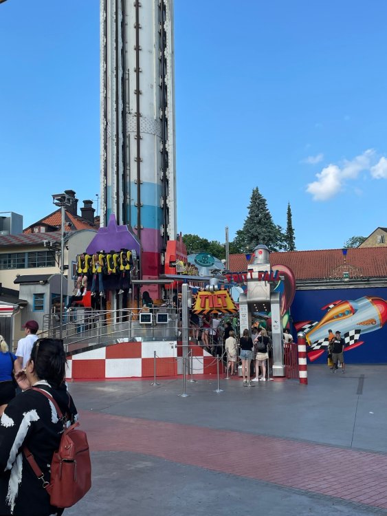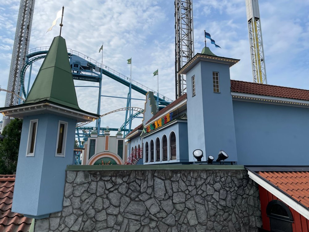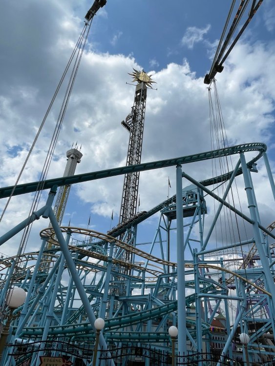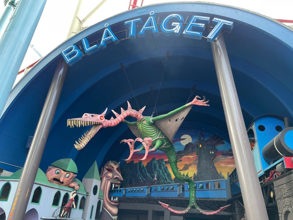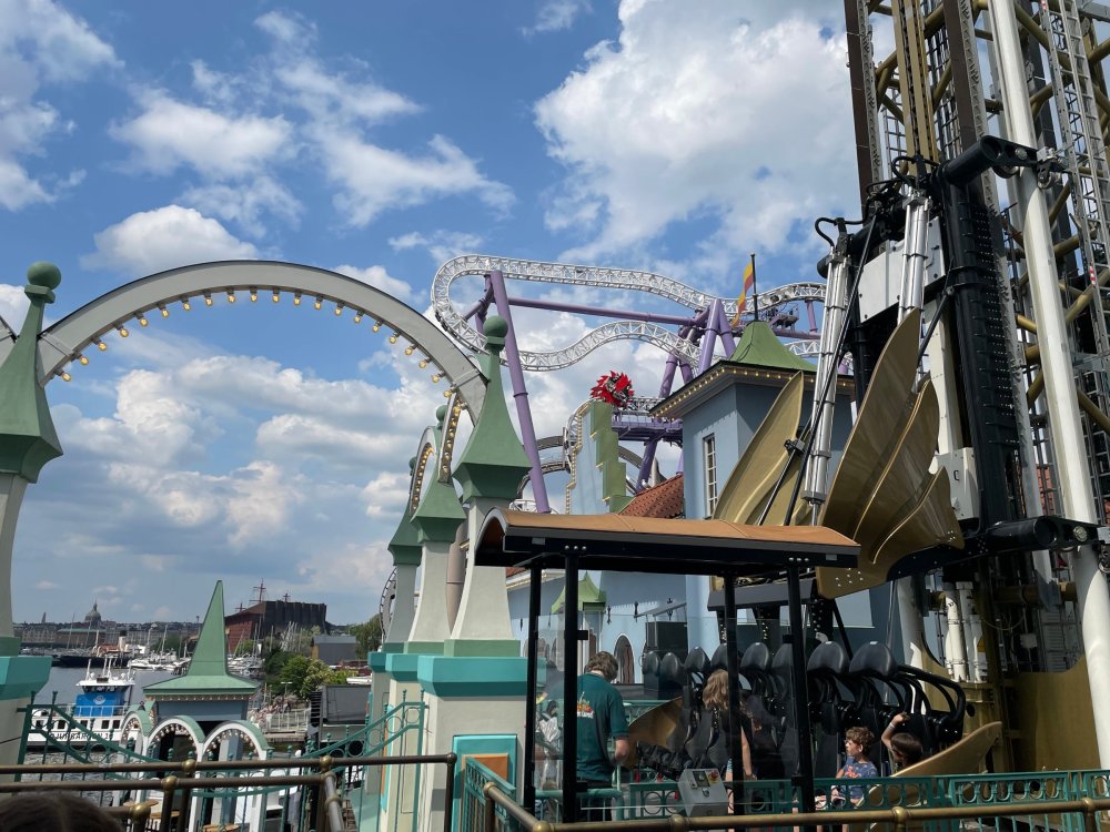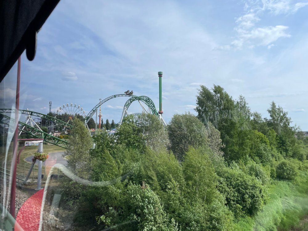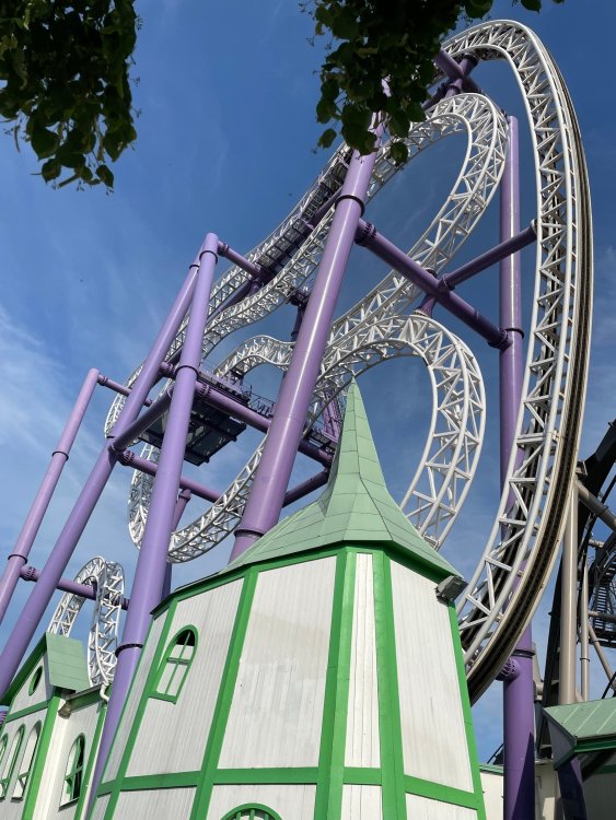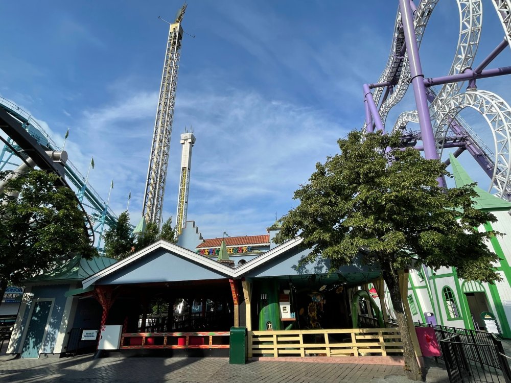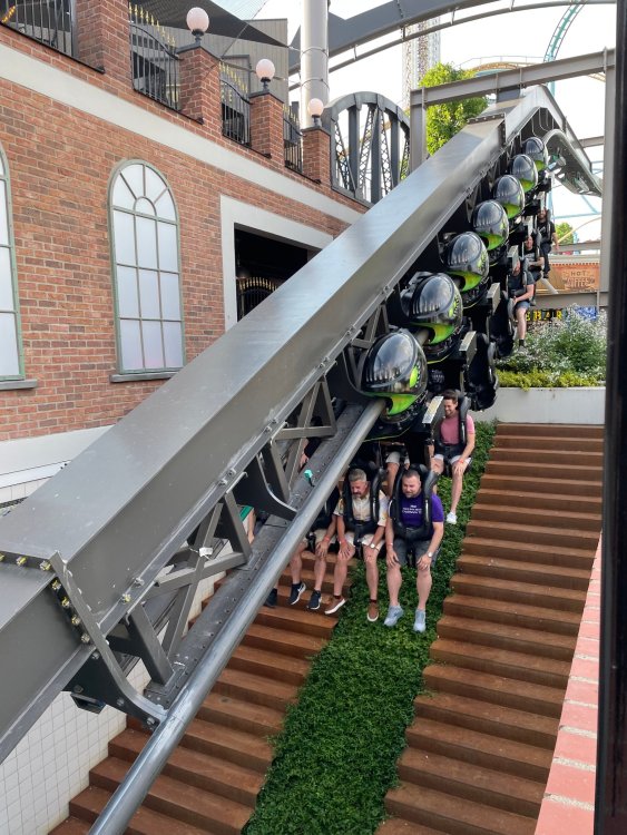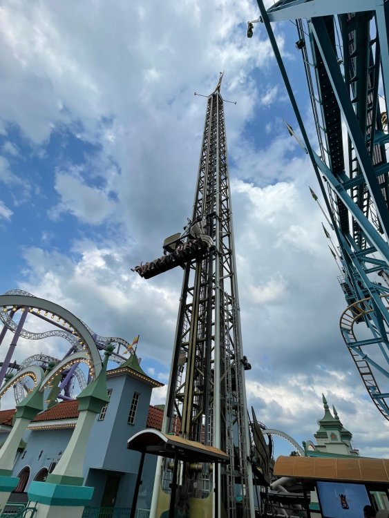 11. Day 18: Tuesday, June 20th part 3 (of 3) - back to finish off the night at the fantastic Grona Lund On the way back in, stopping to snap a pic of the park map. it LOOKS way smaller than it is, because things are just piled up on top of each other. the big green area in the bottom right, is the parking lot the park announced plans in 2023 to expand into. of course, my first stop on the way in was the Carousel. . . Big Mike had other plans tho, he was missing the kiddie credit, "Tuff-Tuff TÃ¥get" (Choo-Choo Train). So while he went to do that. . . Didier and I rode the Carousel. my happy place. his too, apparently for such a small carousel, it's just lovely, and appears hand painted. after my Carousel ride, I went over to the coaster to get proof of Big Mike riding it, in talking to the ride op - who was a total hoot! - she said it's a ride that's way more fun than it looks, as the sharp turns give a "whip" effect. She encouraged us all to ride it. sooooooo. . . (and she was right, it was way more fun that I had looked. and she let us ring the bell as we exited the station). back over to Vilda Musen for a "water free" ride, and we bumped into Hans and Matthew walking along the outside of the park, to get a different view of Twister and a crane across the lake, painted like a Giraffe. for some reason. Sweden! by going around the outside, we were gonna end up in the "haunted" section. . . and had also bumped into Andrew, sMisty, and Erik. . so we all headed that way together. that's Kvasten ahead of us, the Vekoma suspended coaster. whee. . . in the SPOOKY section now.. had to stop for a photo op, tho apparently we were boiling nothing for dinner. the flying carpet ride (not operating today) is over here for some reason. . . maybe they are tying in the Genie in the center of it with the spook/magic vibe of the area? Gotta ride Blue Train. . this thing is SO messed up. insanely silly, and with some needless nudity, and scary pop ups. . I adored it. rode this sucker at least 4 times on our trip. the name is brilliant. it's BLUE. . and it's a Train. see???? ooo. .scary! that creature has got "lady parts" !!! Scary!!!! so silly, and so much fun. every park should have a ride like this. and Grona Lund has several! the Starflyer doing it's thing from underneath Kvasten. we were in line for the very well done walk thru Haunt. I do believe that this is an upcharge attraction, but Elissa had arranged for us to all get admission (hence most of the group showing up here at a certain time). they send you thru in groups of 6-8, and said pictures were ok, as long as it didn't hold up the flow. it's got an outdoor section. . that's a group going thru the house up there on the balcony. fly, bird, fly !!!! now that bird knows what Fabio felt like, I suppose. my group's turn. . . howdy! ready to be a scared. . . nice mix of props, and live actors in here. great effect. . . choose your door carefully! he's coming to get you, Barbara. . . time for a birds eye view of the park on the starflyer. they are VERY serious about no loose objects on this ride. so only got pics from the queue, and before the ride started (with permission) it really is in the middle of everything. . surrounded by Coaster track on all sides that's Icarus doing it's thing back there. . Jetstream ,the Bobsled, AND Insane, all with cars on the tracks in one pic. that's a huge win for me, as I usually end up with no trains on the tracks hard to see in this pic, but Icarus has now tilted at the top, and the riders are hanging face down. a stage for musical performances. . . but we next headed over to the dual drop tower: Frit Fall & Tilt Hans & Matthew (and a very intense man who was wondering why I was taking his picture) chose to ride the "tilt" seated sides. while Big Mike and I (and a terrified girl), chose the stand up "Fritt Fall" side. it truly IS rather terrifying. and of course they have a camera on this side to capture it. I bought a magnet version, that came with a digital copy. glad I did it, but never again. walk around entertainment as well in this park. Not a LOT of it, but we were there on a weekday. in addition to lunch, snack, and dinner coupons, the park had gone all out and also gave us booklets of game coupons. the games were mostly hard, but there were some easier ones, and I think most everyone won some sort of prize. while they played that ping-pong game, I went into the bathroom next to it. . .and made a discovery. down a dark, bricked pathway/tunnel. . . there's this. just lovely. and when you go to wash your hands? yup. . a haunted toidy! gah! different mirrors have different creatures. . . LOL I had waited long enough, I was ready for Ikaros - the face first drop tower. again, some lovely art deco designs all around it. all the way up to the top. . . then, tilt forward. . so you will be hurtling face first towards the ground! gahhhhhhhh. . . . .it truly is a terrifying experience. and I absolutely LOVED it. we got some ERT on it at the end of the night - along with the operator making us sing ABBA and other disco songs as we ascended - and I think I rode every cycle I was able to get in on. scary, but THAT good. and you get pretty close to the ground before the seats swing back out to "normal" position even tho I know I'm a klutz, and the funhouse is a disaster waiting to happen for klutz'. . .I went ahead and did it. it's a really good funhouse. .and really ways to hurt oneself. I didn't get a pic of the entrance, but it's a "moving" ladder, that you have to climb up. . potential for injury right from the start! but it's full of whimsical, and fun obstacles. . that one really can't go around. you MUST go thru. bouncing walkways. . pitch black infinity rooms. . . truly confusing mirror mazes. . . yeah, all in one funhouse! and this is how you exit (the only option). . . you get a mat. sit on the mat, on the platform. . and the platform tilts, and shoots your ass down the slide! um.. . . . whee ? the view from t