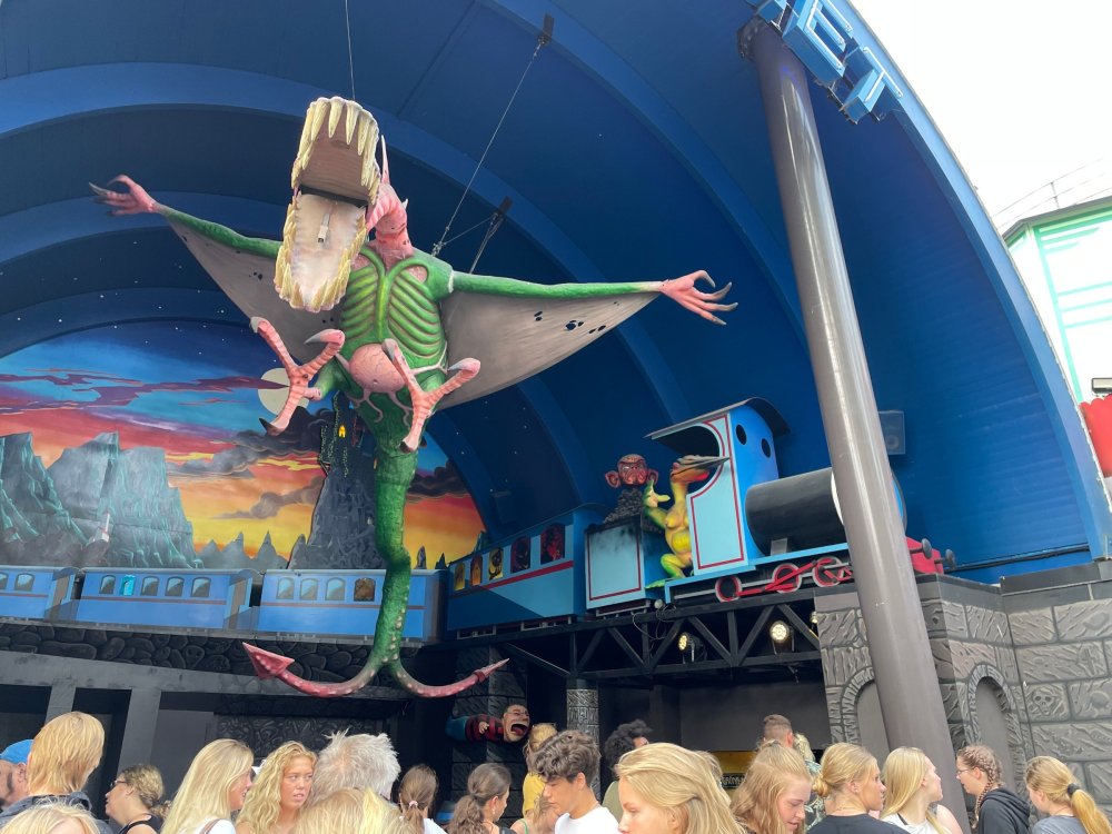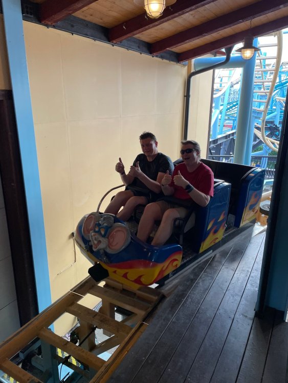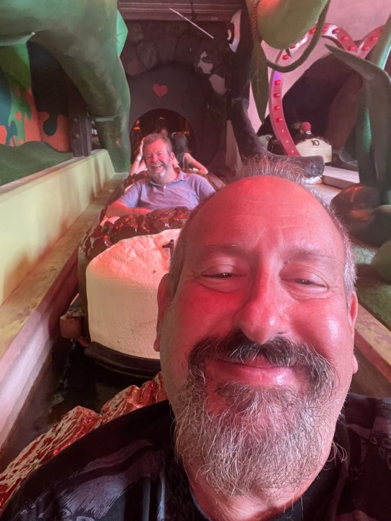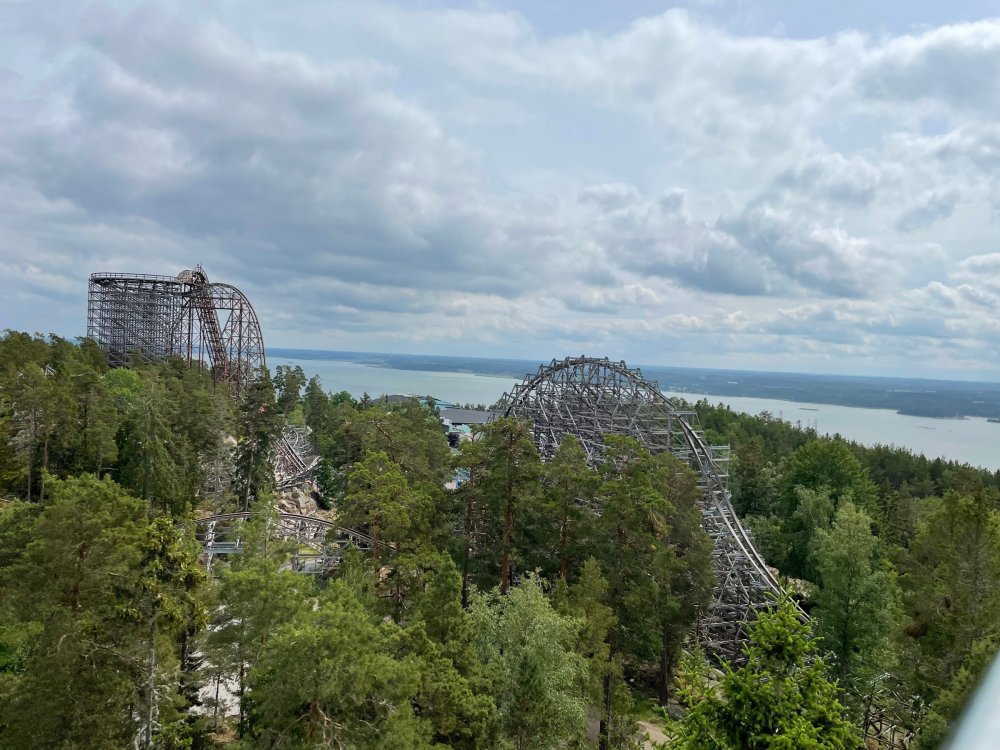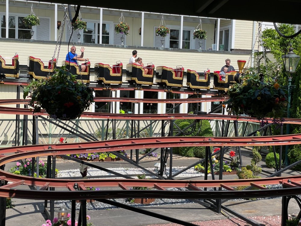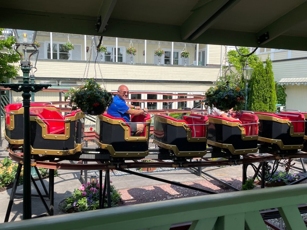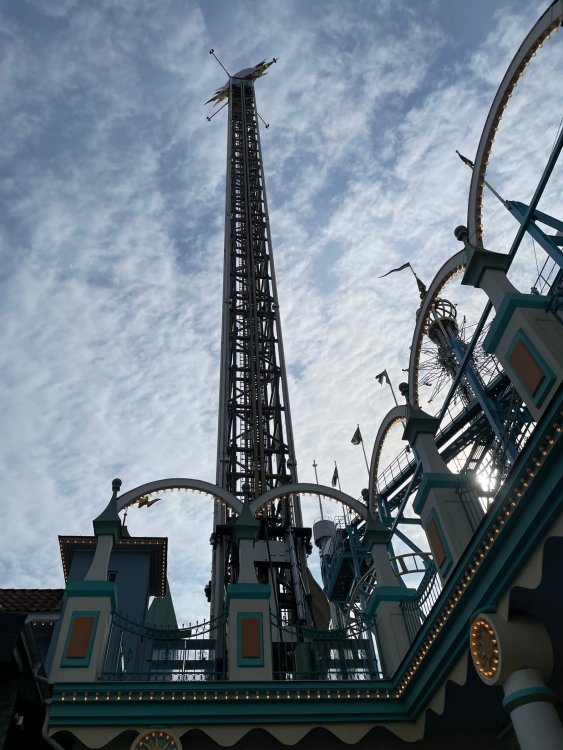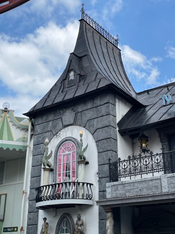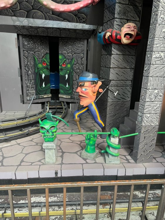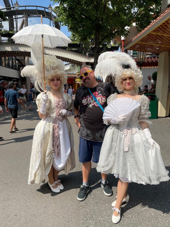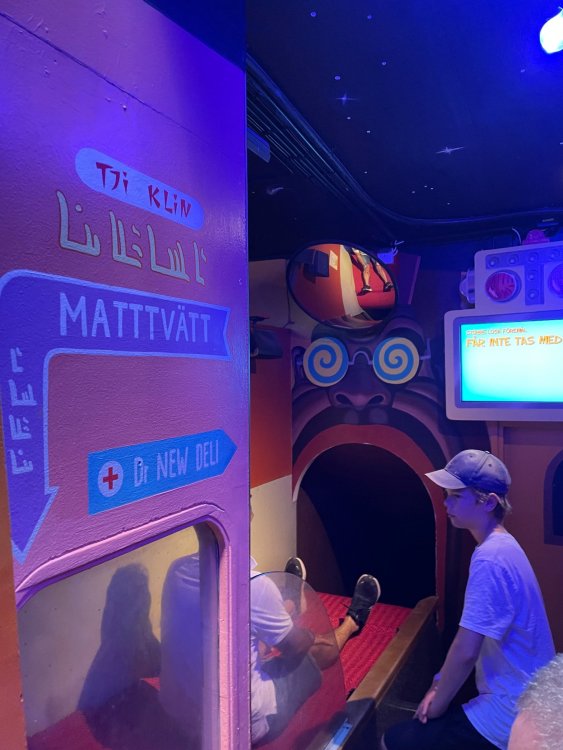 11. Day 18: Tuesday, June 20th part 3 (of 3) - back to finish off the night at the fantastic Grona Lund On the way back in, stopping to snap a pic of the park map. it LOOKS way smaller than it is, because things are just piled up on top of each other. the big green area in the bottom right, is the parking lot the park announced plans in 2023 to expand into. of course, my first stop on the way in was the Carousel. . . Big Mike had other plans tho, he was missing the kiddie credit, "Tuff-Tuff TÃ¥get" (Choo-Choo Train). So while he went to do that. . . Didier and I rode the Carousel. my happy place. his too, apparently for such a small carousel, it's just lovely, and appears hand painted. after my Carousel ride, I went over to the coaster to get proof of Big Mike riding it, in talking to the ride op - who was a total hoot! - she said it's a ride that's way more fun than it looks, as the sharp turns give a "whip" effect. She encouraged us all to ride it. sooooooo. . . (and she was right, it was way more fun that I had looked. and she let us ring the bell as we exited the station). back over to Vilda Musen for a "water free" ride, and we bumped into Hans and Matthew walking along the outside of the park, to get a different view of Twister and a crane across the lake, painted like a Giraffe. for some reason. Sweden! by going around the outside, we were gonna end up in the "haunted" section. . . and had also bumped into Andrew, sMisty, and Erik. . so we all headed that way together. that's Kvasten ahead of us, the Vekoma suspended coaster. whee. . . in the SPOOKY section now.. had to stop for a photo op, tho apparently we were boiling nothing for dinner. the flying carpet ride (not operating today) is over here for some reason. . . maybe they are tying in the Genie in the center of it with the spook/magic vibe of the area? Gotta ride Blue Train. . this thing is SO messed up. insanely silly, and with some needless nudity, and scary pop ups. . I adored it. rode this sucker at least 4 times on our trip. the name is brilliant. it's BLUE. . and it's a Train. see???? ooo. .scary! that creature has got "lady parts" !!! Scary!!!! so silly, and so much fun. every park should have a ride like this. and Grona Lund has several! the Starflyer doing it's thing from underneath Kvasten. we were in line for the very well done walk thru Haunt. I do believe that this is an upcharge attraction, but Elissa had arranged for us to all get admission (hence most of the group showing up here at a certain time). they send you thru in groups of 6-8, and said pictures were ok, as long as it didn't hold up the flow. it's got an outdoor section. . that's a group going thru the house up there on the balcony. fly, bird, fly !!!! now that bird knows what Fabio felt like, I suppose. my group's turn. . . howdy! ready to be a scared. . . nice mix of props, and live actors in here. great effect. . . choose your door carefully! he's coming to get you, Barbara. . . time for a birds eye view of the park on the starflyer. they are VERY serious about no loose objects on this ride. so only got pics from the queue, and before the ride started (with permission) it really is in the middle of everything. . surrounded by Coaster track on all sides that's Icarus doing it's thing back there. . Jetstream ,the Bobsled, AND Insane, all with cars on the tracks in one pic. that's a huge win for me, as I usually end up with no trains on the tracks hard to see in this pic, but Icarus has now tilted at the top, and the riders are hanging face down. a stage for musical performances. . . but we next headed over to the dual drop tower: Frit Fall & Tilt Hans & Matthew (and a very intense man who was wondering why I was taking his picture) chose to ride the "tilt" seated sides. while Big Mike and I (and a terrified girl), chose the stand up "Fritt Fall" side. it truly IS rather terrifying. and of course they have a camera on this side to capture it. I bought a magnet version, that came with a digital copy. glad I did it, but never again. walk around entertainment as well in this park. Not a LOT of it, but we were there on a weekday. in addition to lunch, snack, and dinner coupons, the park had gone all out and also gave us booklets of game coupons. the games were mostly hard, but there were some easier ones, and I think most everyone won some sort of prize. while they played that ping-pong game, I went into the bathroom next to it. . .and made a discovery. down a dark, bricked pathway/tunnel. . . there's this. just lovely. and when you go to wash your hands? yup. . a haunted toidy! gah! different mirrors have different creatures. . . LOL I had waited long enough, I was ready for Ikaros - the face first drop tower. again, some lovely art deco designs all around it. all the way up to the top. . . then, tilt forward. . so you will be hurtling face first towards the ground! gahhhhhhhh. . . . .it truly is a terrifying experience. and I absolutely LOVED it. we got some ERT on it at the end of the night - along with the operator making us sing ABBA and other disco songs as we ascended - and I think I rode every cycle I was able to get in on. scary, but THAT good. and you get pretty close to the ground before the seats swing back out to "normal" position even tho I know I'm a klutz, and the funhouse is a disaster waiting to happen for klutz'. . .I went ahead and did it. it's a really good funhouse. .and really ways to hurt oneself. I didn't get a pic of the entrance, but it's a "moving" ladder, that you have to climb up. . potential for injury right from the start! but it's full of whimsical, and fun obstacles. . that one really can't go around. you MUST go thru. bouncing walkways. . pitch black infinity rooms. . . truly confusing mirror mazes. . . yeah, all in one funhouse! and this is how you exit (the only option). . . you get a mat. sit on the mat, on the platform. . and the platform tilts, and shoots your ass down the slide! um.. . . . whee ? the view from t