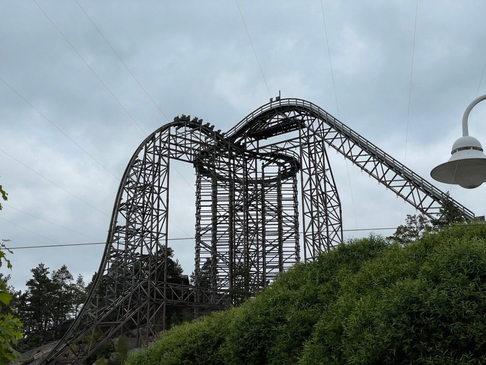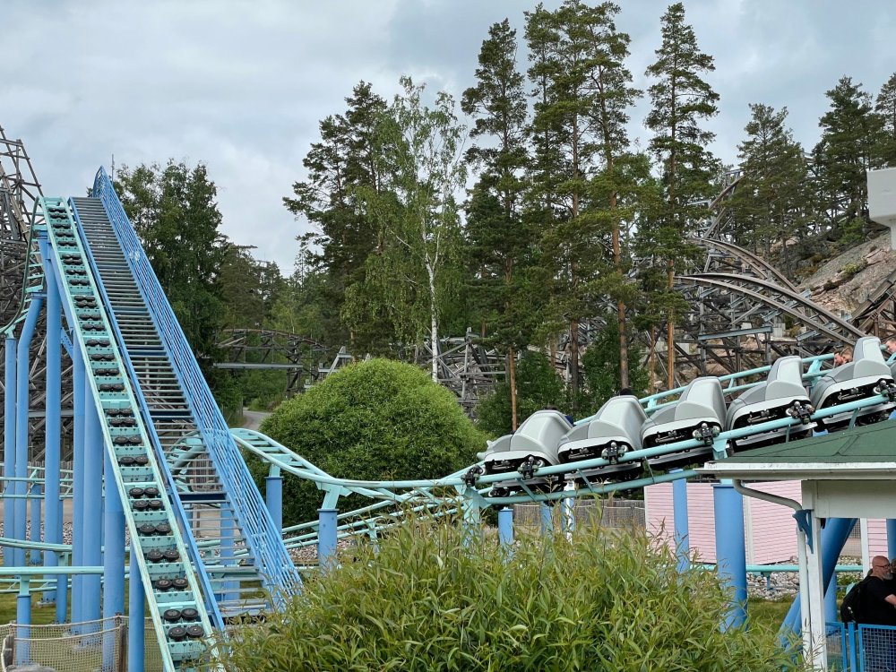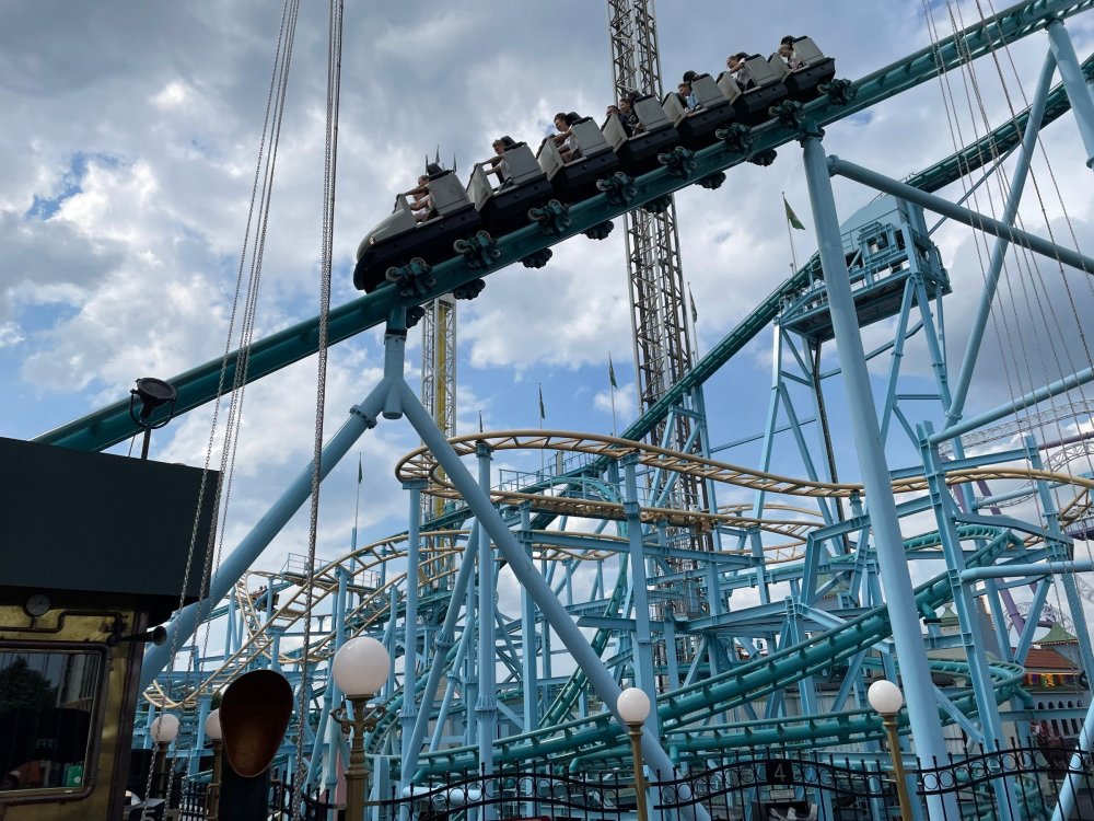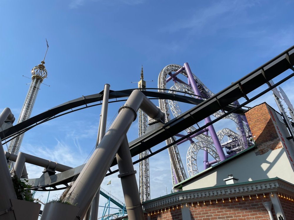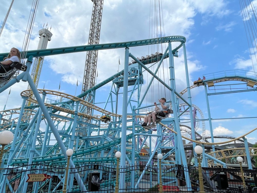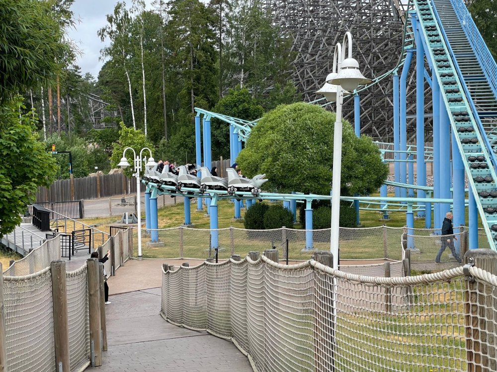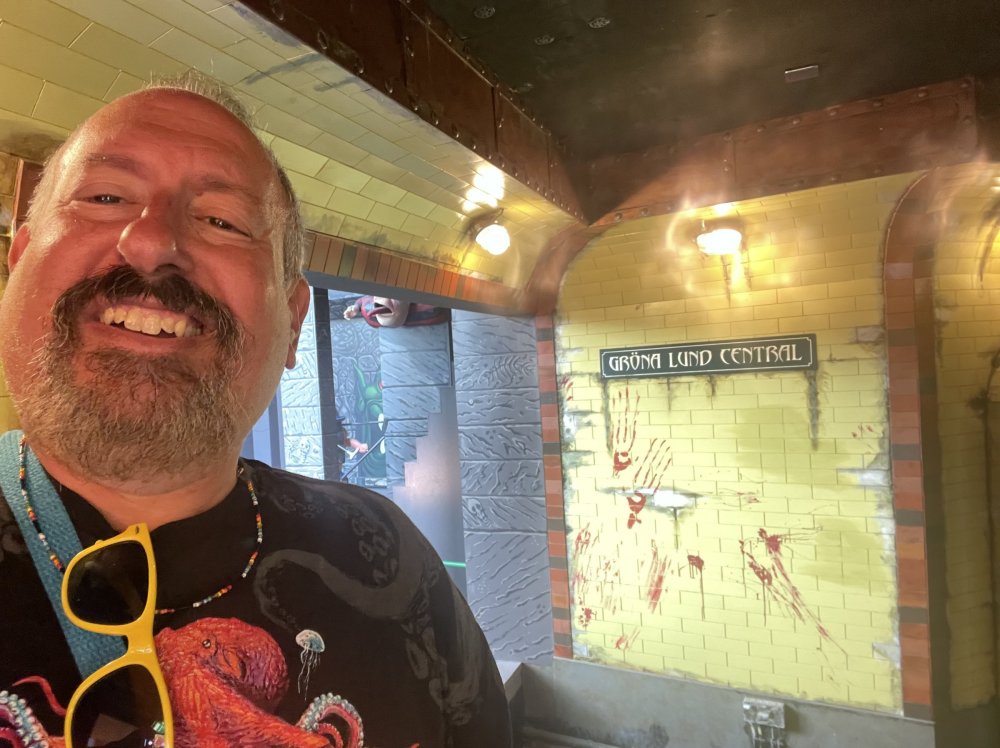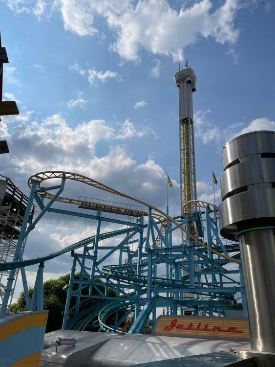 11. Day 18: Tuesday, June 20th part 3 (of 3) - back to finish off the night at the fantastic Grona Lund On the way back in, stopping to snap a pic of the park map. it LOOKS way smaller than it is, because things are just piled up on top of each other. the big green area in the bottom right, is the parking lot the park announced plans in 2023 to expand into. of course, my first stop on the way in was the Carousel. . . Big Mike had other plans tho, he was missing the kiddie credit, "Tuff-Tuff TÃ¥get" (Choo-Choo Train). So while he went to do that. . . Didier and I rode the Carousel. my happy place. his too, apparently for such a small carousel, it's just lovely, and appears hand painted. after my Carousel ride, I went over to the coaster to get proof of Big Mike riding it, in talking to the ride op - who was a total hoot! - she said it's a ride that's way more fun than it looks, as the sharp turns give a "whip" effect. She encouraged us all to ride it. sooooooo. . . (and she was right, it was way more fun that I had looked. and she let us ring the bell as we exited the station). back over to Vilda Musen for a "water free" ride, and we bumped into Hans and Matthew walking along the outside of the park, to get a different view of Twister and a crane across the lake, painted like a Giraffe. for some reason. Sweden! by going around the outside, we were gonna end up in the "haunted" section. . . and had also bumped into Andrew, sMisty, and Erik. . so we all headed that way together. that's Kvasten ahead of us, the Vekoma suspended coaster. whee. . . in the SPOOKY section now.. had to stop for a photo op, tho apparently we were boiling nothing for dinner. the flying carpet ride (not operating today) is over here for some reason. . . maybe they are tying in the Genie in the center of it with the spook/magic vibe of the area? Gotta ride Blue Train. . this thing is SO messed up. insanely silly, and with some needless nudity, and scary pop ups. . I adored it. rode this sucker at least 4 times on our trip. the name is brilliant. it's BLUE. . and it's a Train. see???? ooo. .scary! that creature has got "lady parts" !!! Scary!!!! so silly, and so much fun. every park should have a ride like this. and Grona Lund has several! the Starflyer doing it's thing from underneath Kvasten. we were in line for the very well done walk thru Haunt. I do believe that this is an upcharge attraction, but Elissa had arranged for us to all get admission (hence most of the group showing up here at a certain time). they send you thru in groups of 6-8, and said pictures were ok, as long as it didn't hold up the flow. it's got an outdoor section. . that's a group going thru the house up there on the balcony. fly, bird, fly !!!! now that bird knows what Fabio felt like, I suppose. my group's turn. . . howdy! ready to be a scared. . . nice mix of props, and live actors in here. great effect. . . choose your door carefully! he's coming to get you, Barbara. . . time for a birds eye view of the park on the starflyer. they are VERY serious about no loose objects on this ride. so only got pics from the queue, and before the ride started (with permission) it really is in the middle of everything. . surrounded by Coaster track on all sides that's Icarus doing it's thing back there. . Jetstream ,the Bobsled, AND Insane, all with cars on the tracks in one pic. that's a huge win for me, as I usually end up with no trains on the tracks hard to see in this pic, but Icarus has now tilted at the top, and the riders are hanging face down. a stage for musical performances. . . but we next headed over to the dual drop tower: Frit Fall & Tilt Hans & Matthew (and a very intense man who was wondering why I was taking his picture) chose to ride the "tilt" seated sides. while Big Mike and I (and a terrified girl), chose the stand up "Fritt Fall" side. it truly IS rather terrifying. and of course they have a camera on this side to capture it. I bought a magnet version, that came with a digital copy. glad I did it, but never again. walk around entertainment as well in this park. Not a LOT of it, but we were there on a weekday. in addition to lunch, snack, and dinner coupons, the park had gone all out and also gave us booklets of game coupons. the games were mostly hard, but there were some easier ones, and I think most everyone won some sort of prize. while they played that ping-pong game, I went into the bathroom next to it. . .and made a discovery. down a dark, bricked pathway/tunnel. . . there's this. just lovely. and when you go to wash your hands? yup. . a haunted toidy! gah! different mirrors have different creatures. . . LOL I had waited long enough, I was ready for Ikaros - the face first drop tower. again, some lovely art deco designs all around it. all the way up to the top. . . then, tilt forward. . so you will be hurtling face first towards the ground! gahhhhhhhh. . . . .it truly is a terrifying experience. and I absolutely LOVED it. we got some ERT on it at the end of the night - along with the operator making us sing ABBA and other disco songs as we ascended - and I think I rode every cycle I was able to get in on. scary, but THAT good. and you get pretty close to the ground before the seats swing back out to "normal" position even tho I know I'm a klutz, and the funhouse is a disaster waiting to happen for klutz'. . .I went ahead and did it. it's a really good funhouse. .and really ways to hurt oneself. I didn't get a pic of the entrance, but it's a "moving" ladder, that you have to climb up. . potential for injury right from the start! but it's full of whimsical, and fun obstacles. . that one really can't go around. you MUST go thru. bouncing walkways. . pitch black infinity rooms. . . truly confusing mirror mazes. . . yeah, all in one funhouse! and this is how you exit (the only option). . . you get a mat. sit on the mat, on the platform. . and the platform tilts, and shoots your ass down the slide! um.. . . . whee ? the view from t