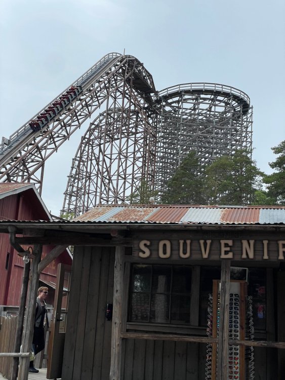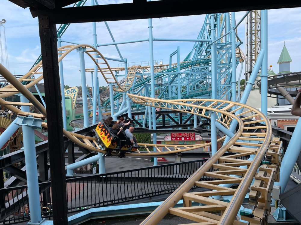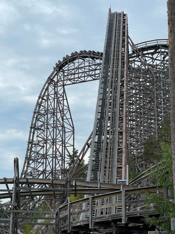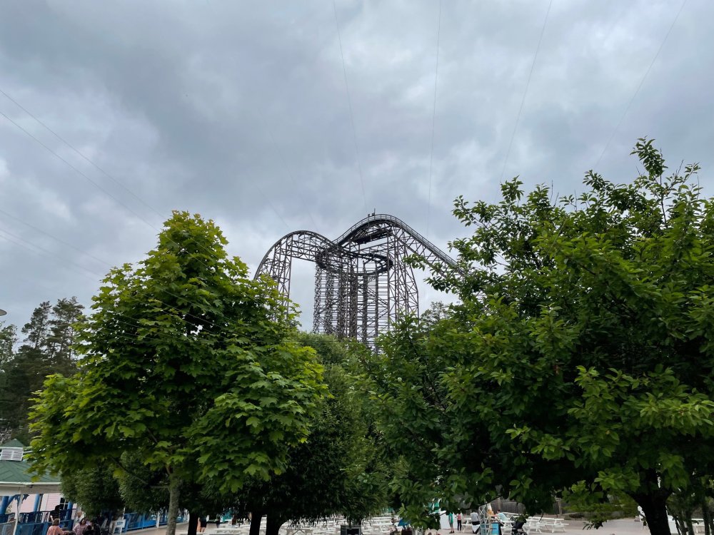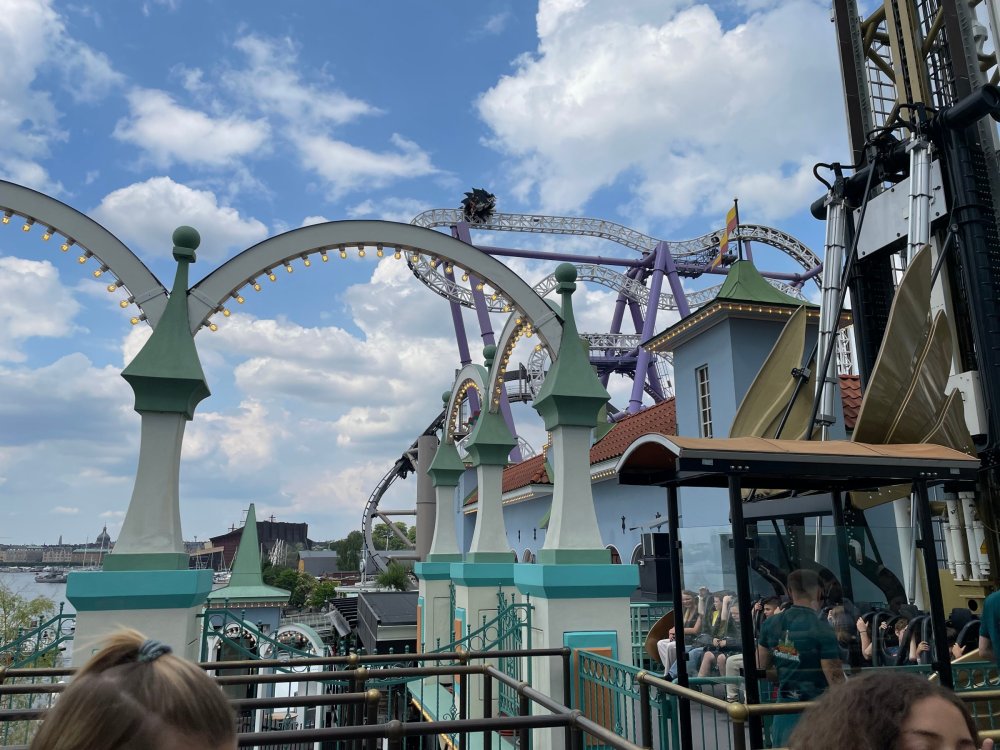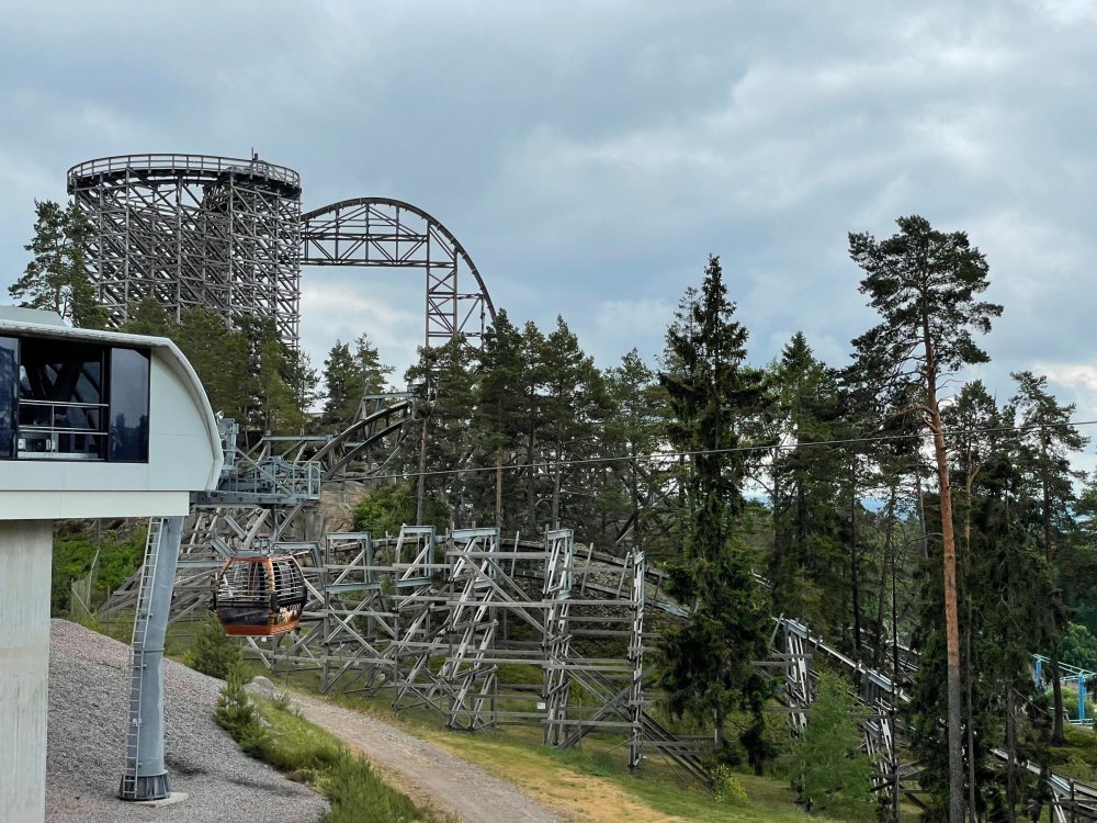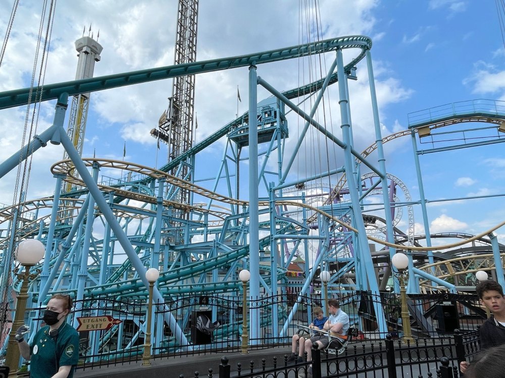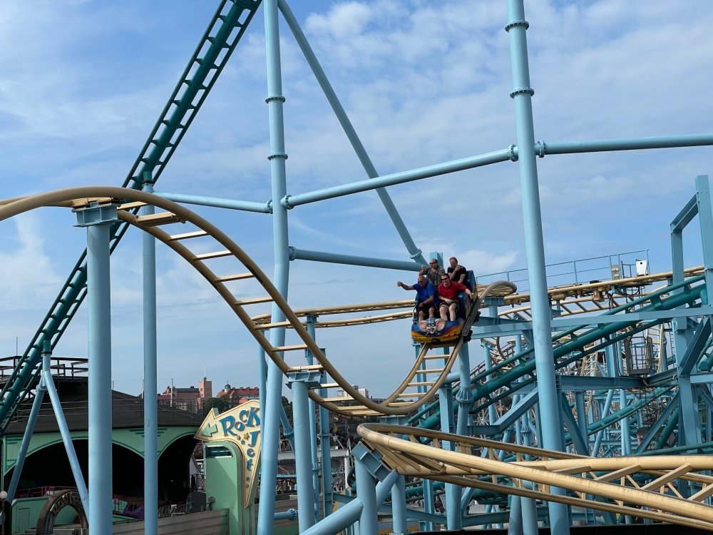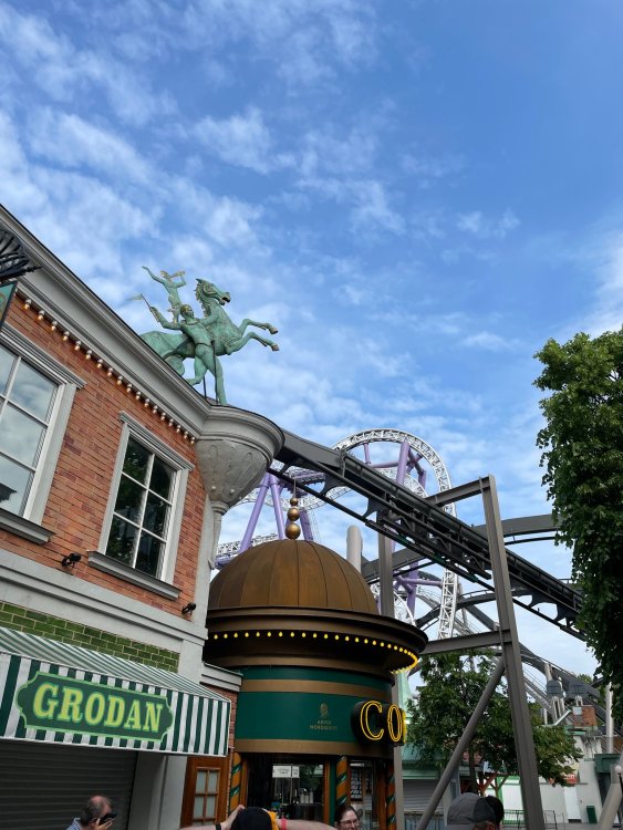 11. Day 18: Tuesday, June 20th part 3 (of 3) - back to finish off the night at the fantastic Grona Lund On the way back in, stopping to snap a pic of the park map. it LOOKS way smaller than it is, because things are just piled up on top of each other. the big green area in the bottom right, is the parking lot the park announced plans in 2023 to expand into. of course, my first stop on the way in was the Carousel. . . Big Mike had other plans tho, he was missing the kiddie credit, "Tuff-Tuff TÃ¥get" (Choo-Choo Train). So while he went to do that. . . Didier and I rode the Carousel. my happy place. his too, apparently for such a small carousel, it's just lovely, and appears hand painted. after my Carousel ride, I went over to the coaster to get proof of Big Mike riding it, in talking to the ride op - who was a total hoot! - she said it's a ride that's way more fun than it looks, as the sharp turns give a "whip" effect. She encouraged us all to ride it. sooooooo. . . (and she was right, it was way more fun that I had looked. and she let us ring the bell as we exited the station). back over to Vilda Musen for a "water free" ride, and we bumped into Hans and Matthew walking along the outside of the park, to get a different view of Twister and a crane across the lake, painted like a Giraffe. for some reason. Sweden! by going around the outside, we were gonna end up in the "haunted" section. . . and had also bumped into Andrew, sMisty, and Erik. . so we all headed that way together. that's Kvasten ahead of us, the Vekoma suspended coaster. whee. . . in the SPOOKY section now.. had to stop for a photo op, tho apparently we were boiling nothing for dinner. the flying carpet ride (not operating today) is over here for some reason. . . maybe they are tying in the Genie in the center of it with the spook/magic vibe of the area? Gotta ride Blue Train. . this thing is SO messed up. insanely silly, and with some needless nudity, and scary pop ups. . I adored it. rode this sucker at least 4 times on our trip. the name is brilliant. it's BLUE. . and it's a Train. see???? ooo. .scary! that creature has got "lady parts" !!! Scary!!!! so silly, and so much fun. every park should have a ride like this. and Grona Lund has several! the Starflyer doing it's thing from underneath Kvasten. we were in line for the very well done walk thru Haunt. I do believe that this is an upcharge attraction, but Elissa had arranged for us to all get admission (hence most of the group showing up here at a certain time). they send you thru in groups of 6-8, and said pictures were ok, as long as it didn't hold up the flow. it's got an outdoor section. . that's a group going thru the house up there on the balcony. fly, bird, fly !!!! now that bird knows what Fabio felt like, I suppose. my group's turn. . . howdy! ready to be a scared. . . nice mix of props, and live actors in here. great effect. . . choose your door carefully! he's coming to get you, Barbara. . . time for a birds eye view of the park on the starflyer. they are VERY serious about no loose objects on this ride. so only got pics from the queue, and before the ride started (with permission) it really is in the middle of everything. . surrounded by Coaster track on all sides that's Icarus doing it's thing back there. . Jetstream ,the Bobsled, AND Insane, all with cars on the tracks in one pic. that's a huge win for me, as I usually end up with no trains on the tracks hard to see in this pic, but Icarus has now tilted at the top, and the riders are hanging face down. a stage for musical performances. . . but we next headed over to the dual drop tower: Frit Fall & Tilt Hans & Matthew (and a very intense man who was wondering why I was taking his picture) chose to ride the "tilt" seated sides. while Big Mike and I (and a terrified girl), chose the stand up "Fritt Fall" side. it truly IS rather terrifying. and of course they have a camera on this side to capture it. I bought a magnet version, that came with a digital copy. glad I did it, but never again. walk around entertainment as well in this park. Not a LOT of it, but we were there on a weekday. in addition to lunch, snack, and dinner coupons, the park had gone all out and also gave us booklets of game coupons. the games were mostly hard, but there were some easier ones, and I think most everyone won some sort of prize. while they played that ping-pong game, I went into the bathroom next to it. . .and made a discovery. down a dark, bricked pathway/tunnel. . . there's this. just lovely. and when you go to wash your hands? yup. . a haunted toidy! gah! different mirrors have different creatures. . . LOL I had waited long enough, I was ready for Ikaros - the face first drop tower. again, some lovely art deco designs all around it. all the way up to the top. . . then, tilt forward. . so you will be hurtling face first towards the ground! gahhhhhhhh. . . . .it truly is a terrifying experience. and I absolutely LOVED it. we got some ERT on it at the end of the night - along with the operator making us sing ABBA and other disco songs as we ascended - and I think I rode every cycle I was able to get in on. scary, but THAT good. and you get pretty close to the ground before the seats swing back out to "normal" position even tho I know I'm a klutz, and the funhouse is a disaster waiting to happen for klutz'. . .I went ahead and did it. it's a really good funhouse. .and really ways to hurt oneself. I didn't get a pic of the entrance, but it's a "moving" ladder, that you have to climb up. . potential for injury right from the start! but it's full of whimsical, and fun obstacles. . that one really can't go around. you MUST go thru. bouncing walkways. . pitch black infinity rooms. . . truly confusing mirror mazes. . . yeah, all in one funhouse! and this is how you exit (the only option). . . you get a mat. sit on the mat, on the platform. . and the platform tilts, and shoots your ass down the slide! um.. . . . whee ? the view from t