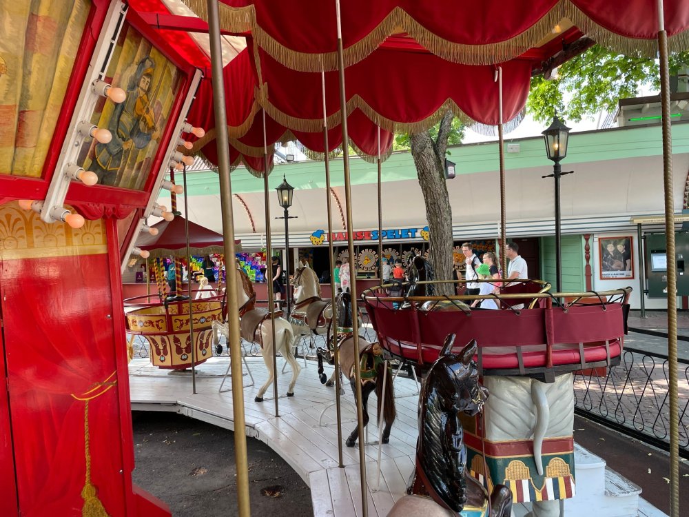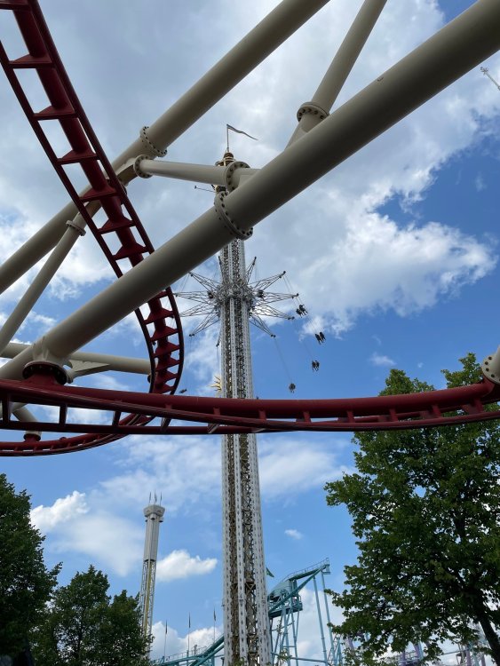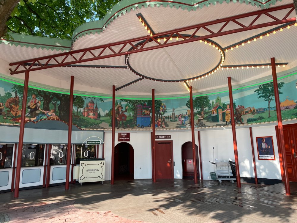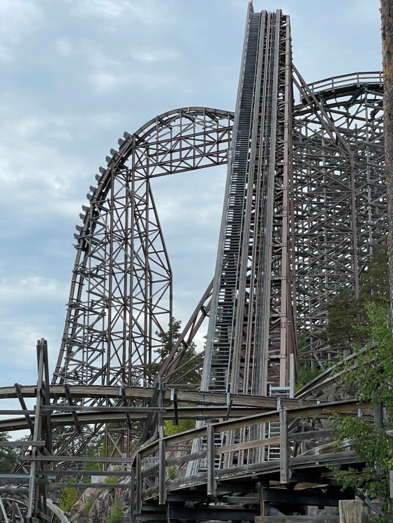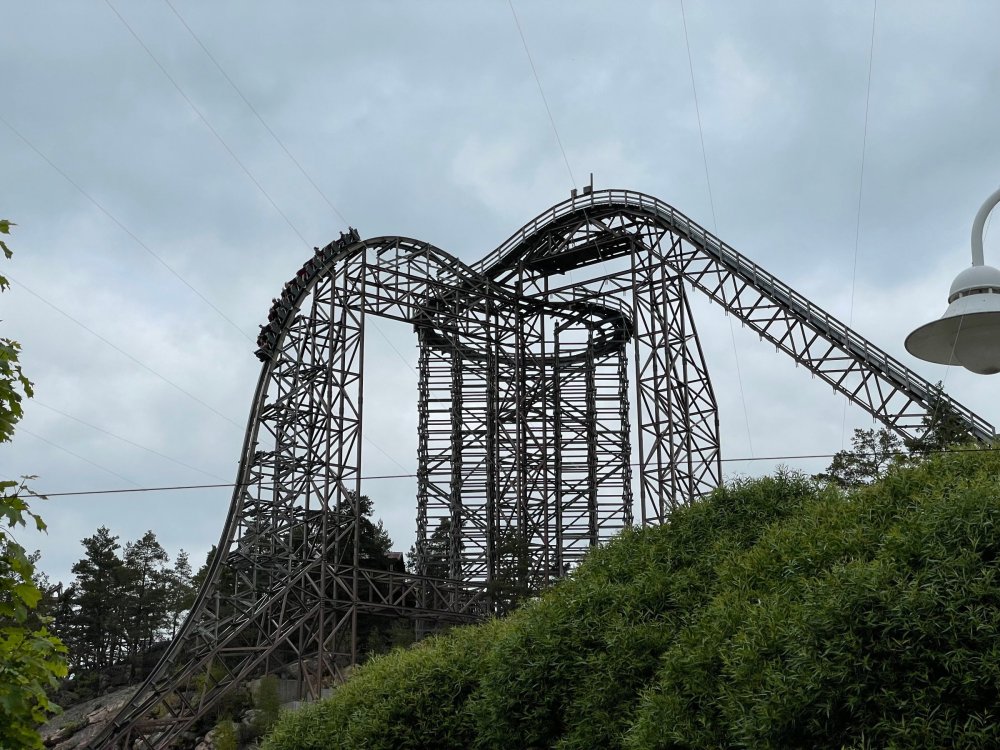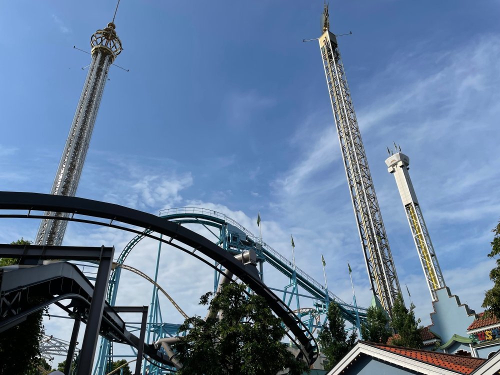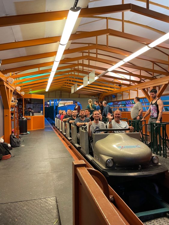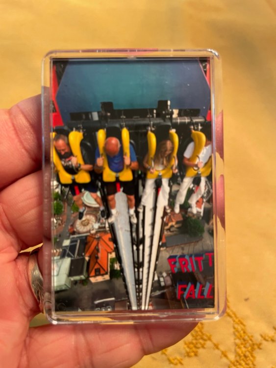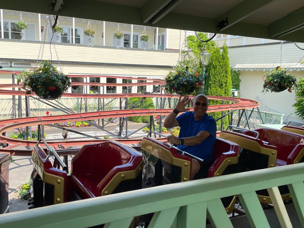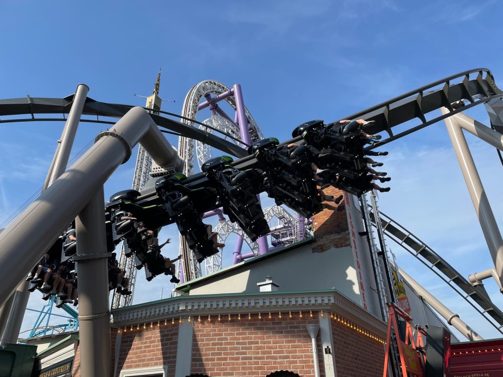 11. Day 18: Tuesday, June 20th part 3 (of 3) - back to finish off the night at the fantastic Grona Lund On the way back in, stopping to snap a pic of the park map. it LOOKS way smaller than it is, because things are just piled up on top of each other. the big green area in the bottom right, is the parking lot the park announced plans in 2023 to expand into. of course, my first stop on the way in was the Carousel. . . Big Mike had other plans tho, he was missing the kiddie credit, "Tuff-Tuff TÃ¥get" (Choo-Choo Train). So while he went to do that. . . Didier and I rode the Carousel. my happy place. his too, apparently for such a small carousel, it's just lovely, and appears hand painted. after my Carousel ride, I went over to the coaster to get proof of Big Mike riding it, in talking to the ride op - who was a total hoot! - she said it's a ride that's way more fun than it looks, as the sharp turns give a "whip" effect. She encouraged us all to ride it. sooooooo. . . (and she was right, it was way more fun that I had looked. and she let us ring the bell as we exited the station). back over to Vilda Musen for a "water free" ride, and we bumped into Hans and Matthew walking along the outside of the park, to get a different view of Twister and a crane across the lake, painted like a Giraffe. for some reason. Sweden! by going around the outside, we were gonna end up in the "haunted" section. . . and had also bumped into Andrew, sMisty, and Erik. . so we all headed that way together. that's Kvasten ahead of us, the Vekoma suspended coaster. whee. . . in the SPOOKY section now.. had to stop for a photo op, tho apparently we were boiling nothing for dinner. the flying carpet ride (not operating today) is over here for some reason. . . maybe they are tying in the Genie in the center of it with the spook/magic vibe of the area? Gotta ride Blue Train. . this thing is SO messed up. insanely silly, and with some needless nudity, and scary pop ups. . I adored it. rode this sucker at least 4 times on our trip. the name is brilliant. it's BLUE. . and it's a Train. see???? ooo. .scary! that creature has got "lady parts" !!! Scary!!!! so silly, and so much fun. every park should have a ride like this. and Grona Lund has several! the Starflyer doing it's thing from underneath Kvasten. we were in line for the very well done walk thru Haunt. I do believe that this is an upcharge attraction, but Elissa had arranged for us to all get admission (hence most of the group showing up here at a certain time). they send you thru in groups of 6-8, and said pictures were ok, as long as it didn't hold up the flow. it's got an outdoor section. . that's a group going thru the house up there on the balcony. fly, bird, fly !!!! now that bird knows what Fabio felt like, I suppose. my group's turn. . . howdy! ready to be a scared. . . nice mix of props, and live actors in here. great effect. . . choose your door carefully! he's coming to get you, Barbara. . . time for a birds eye view of the park on the starflyer. they are VERY serious about no loose objects on this ride. so only got pics from the queue, and before the ride started (with permission) it really is in the middle of everything. . surrounded by Coaster track on all sides that's Icarus doing it's thing back there. . Jetstream ,the Bobsled, AND Insane, all with cars on the tracks in one pic. that's a huge win for me, as I usually end up with no trains on the tracks hard to see in this pic, but Icarus has now tilted at the top, and the riders are hanging face down. a stage for musical performances. . . but we next headed over to the dual drop tower: Frit Fall & Tilt Hans & Matthew (and a very intense man who was wondering why I was taking his picture) chose to ride the "tilt" seated sides. while Big Mike and I (and a terrified girl), chose the stand up "Fritt Fall" side. it truly IS rather terrifying. and of course they have a camera on this side to capture it. I bought a magnet version, that came with a digital copy. glad I did it, but never again. walk around entertainment as well in this park. Not a LOT of it, but we were there on a weekday. in addition to lunch, snack, and dinner coupons, the park had gone all out and also gave us booklets of game coupons. the games were mostly hard, but there were some easier ones, and I think most everyone won some sort of prize. while they played that ping-pong game, I went into the bathroom next to it. . .and made a discovery. down a dark, bricked pathway/tunnel. . . there's this. just lovely. and when you go to wash your hands? yup. . a haunted toidy! gah! different mirrors have different creatures. . . LOL I had waited long enough, I was ready for Ikaros - the face first drop tower. again, some lovely art deco designs all around it. all the way up to the top. . . then, tilt forward. . so you will be hurtling face first towards the ground! gahhhhhhhh. . . . .it truly is a terrifying experience. and I absolutely LOVED it. we got some ERT on it at the end of the night - along with the operator making us sing ABBA and other disco songs as we ascended - and I think I rode every cycle I was able to get in on. scary, but THAT good. and you get pretty close to the ground before the seats swing back out to "normal" position even tho I know I'm a klutz, and the funhouse is a disaster waiting to happen for klutz'. . .I went ahead and did it. it's a really good funhouse. .and really ways to hurt oneself. I didn't get a pic of the entrance, but it's a "moving" ladder, that you have to climb up. . potential for injury right from the start! but it's full of whimsical, and fun obstacles. . that one really can't go around. you MUST go thru. bouncing walkways. . pitch black infinity rooms. . . truly confusing mirror mazes. . . yeah, all in one funhouse! and this is how you exit (the only option). . . you get a mat. sit on the mat, on the platform. . and the platform tilts, and shoots your ass down the slide! um.. . . . whee ? the view from t