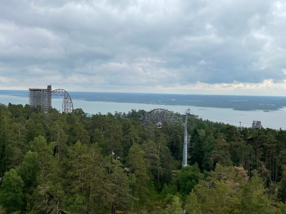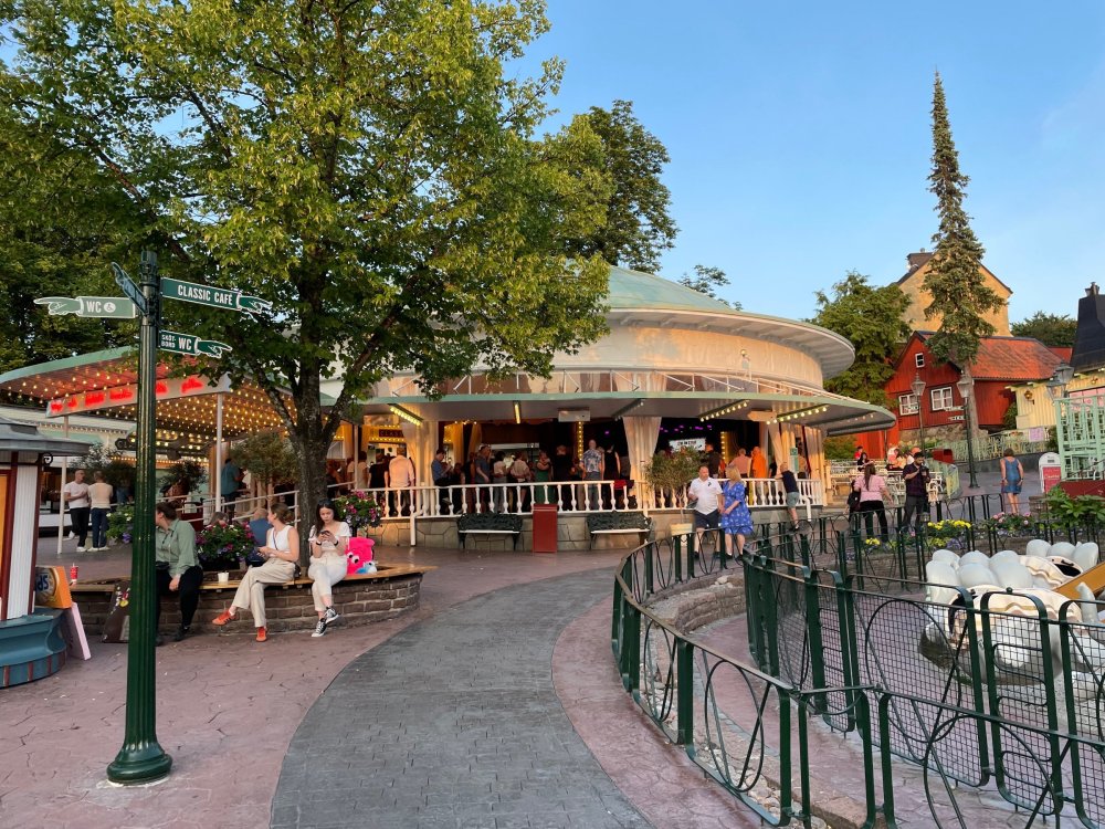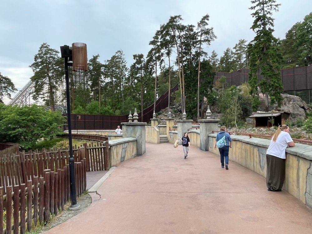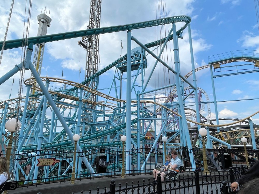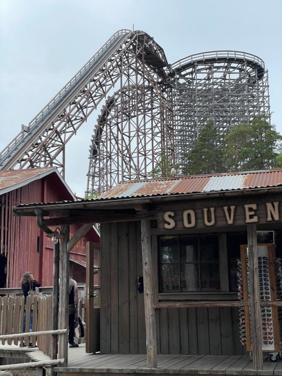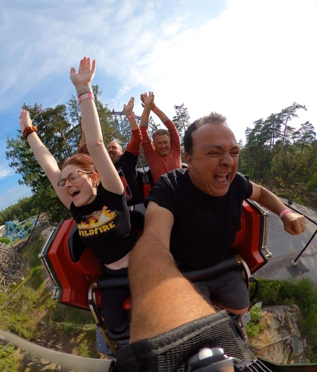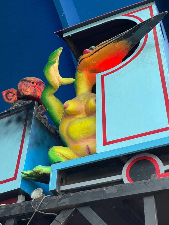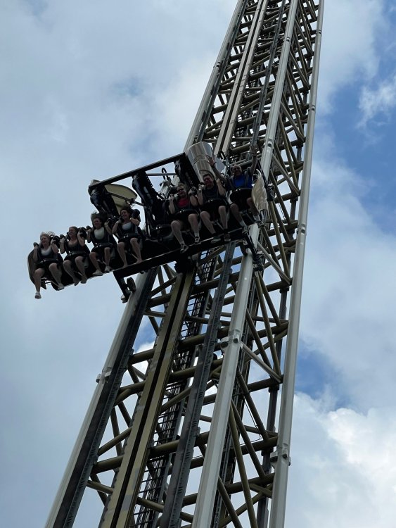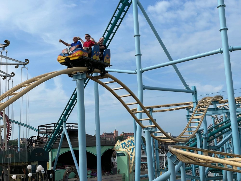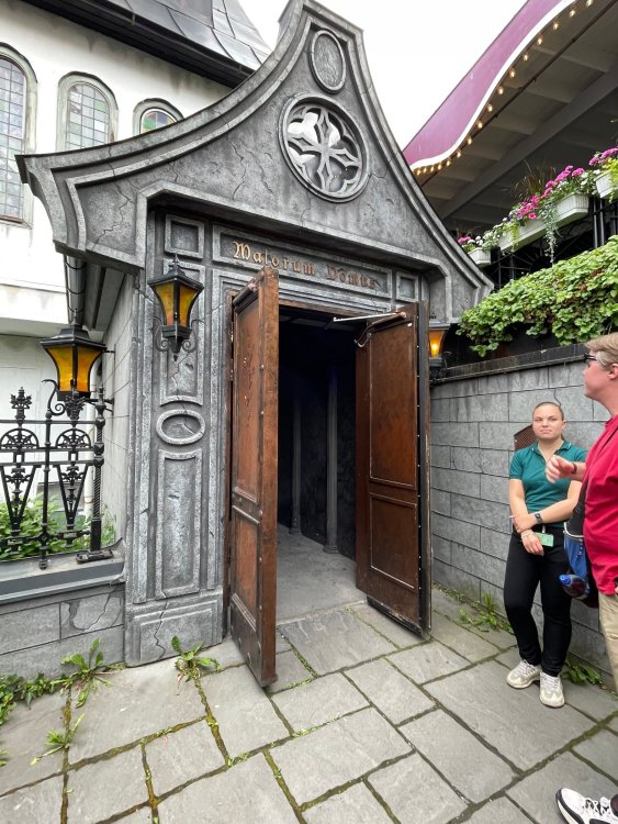 11. Day 18: Tuesday, June 20th part 3 (of 3) - back to finish off the night at the fantastic Grona Lund On the way back in, stopping to snap a pic of the park map. it LOOKS way smaller than it is, because things are just piled up on top of each other. the big green area in the bottom right, is the parking lot the park announced plans in 2023 to expand into. of course, my first stop on the way in was the Carousel. . . Big Mike had other plans tho, he was missing the kiddie credit, "Tuff-Tuff TÃ¥get" (Choo-Choo Train). So while he went to do that. . . Didier and I rode the Carousel. my happy place. his too, apparently for such a small carousel, it's just lovely, and appears hand painted. after my Carousel ride, I went over to the coaster to get proof of Big Mike riding it, in talking to the ride op - who was a total hoot! - she said it's a ride that's way more fun than it looks, as the sharp turns give a "whip" effect. She encouraged us all to ride it. sooooooo. . . (and she was right, it was way more fun that I had looked. and she let us ring the bell as we exited the station). back over to Vilda Musen for a "water free" ride, and we bumped into Hans and Matthew walking along the outside of the park, to get a different view of Twister and a crane across the lake, painted like a Giraffe. for some reason. Sweden! by going around the outside, we were gonna end up in the "haunted" section. . . and had also bumped into Andrew, sMisty, and Erik. . so we all headed that way together. that's Kvasten ahead of us, the Vekoma suspended coaster. whee. . . in the SPOOKY section now.. had to stop for a photo op, tho apparently we were boiling nothing for dinner. the flying carpet ride (not operating today) is over here for some reason. . . maybe they are tying in the Genie in the center of it with the spook/magic vibe of the area? Gotta ride Blue Train. . this thing is SO messed up. insanely silly, and with some needless nudity, and scary pop ups. . I adored it. rode this sucker at least 4 times on our trip. the name is brilliant. it's BLUE. . and it's a Train. see???? ooo. .scary! that creature has got "lady parts" !!! Scary!!!! so silly, and so much fun. every park should have a ride like this. and Grona Lund has several! the Starflyer doing it's thing from underneath Kvasten. we were in line for the very well done walk thru Haunt. I do believe that this is an upcharge attraction, but Elissa had arranged for us to all get admission (hence most of the group showing up here at a certain time). they send you thru in groups of 6-8, and said pictures were ok, as long as it didn't hold up the flow. it's got an outdoor section. . that's a group going thru the house up there on the balcony. fly, bird, fly !!!! now that bird knows what Fabio felt like, I suppose. my group's turn. . . howdy! ready to be a scared. . . nice mix of props, and live actors in here. great effect. . . choose your door carefully! he's coming to get you, Barbara. . . time for a birds eye view of the park on the starflyer. they are VERY serious about no loose objects on this ride. so only got pics from the queue, and before the ride started (with permission) it really is in the middle of everything. . surrounded by Coaster track on all sides that's Icarus doing it's thing back there. . Jetstream ,the Bobsled, AND Insane, all with cars on the tracks in one pic. that's a huge win for me, as I usually end up with no trains on the tracks hard to see in this pic, but Icarus has now tilted at the top, and the riders are hanging face down. a stage for musical performances. . . but we next headed over to the dual drop tower: Frit Fall & Tilt Hans & Matthew (and a very intense man who was wondering why I was taking his picture) chose to ride the "tilt" seated sides. while Big Mike and I (and a terrified girl), chose the stand up "Fritt Fall" side. it truly IS rather terrifying. and of course they have a camera on this side to capture it. I bought a magnet version, that came with a digital copy. glad I did it, but never again. walk around entertainment as well in this park. Not a LOT of it, but we were there on a weekday. in addition to lunch, snack, and dinner coupons, the park had gone all out and also gave us booklets of game coupons. the games were mostly hard, but there were some easier ones, and I think most everyone won some sort of prize. while they played that ping-pong game, I went into the bathroom next to it. . .and made a discovery. down a dark, bricked pathway/tunnel. . . there's this. just lovely. and when you go to wash your hands? yup. . a haunted toidy! gah! different mirrors have different creatures. . . LOL I had waited long enough, I was ready for Ikaros - the face first drop tower. again, some lovely art deco designs all around it. all the way up to the top. . . then, tilt forward. . so you will be hurtling face first towards the ground! gahhhhhhhh. . . . .it truly is a terrifying experience. and I absolutely LOVED it. we got some ERT on it at the end of the night - along with the operator making us sing ABBA and other disco songs as we ascended - and I think I rode every cycle I was able to get in on. scary, but THAT good. and you get pretty close to the ground before the seats swing back out to "normal" position even tho I know I'm a klutz, and the funhouse is a disaster waiting to happen for klutz'. . .I went ahead and did it. it's a really good funhouse. .and really ways to hurt oneself. I didn't get a pic of the entrance, but it's a "moving" ladder, that you have to climb up. . potential for injury right from the start! but it's full of whimsical, and fun obstacles. . that one really can't go around. you MUST go thru. bouncing walkways. . pitch black infinity rooms. . . truly confusing mirror mazes. . . yeah, all in one funhouse! and this is how you exit (the only option). . . you get a mat. sit on the mat, on the platform. . and the platform tilts, and shoots your ass down the slide! um.. . . . whee ? the view from t