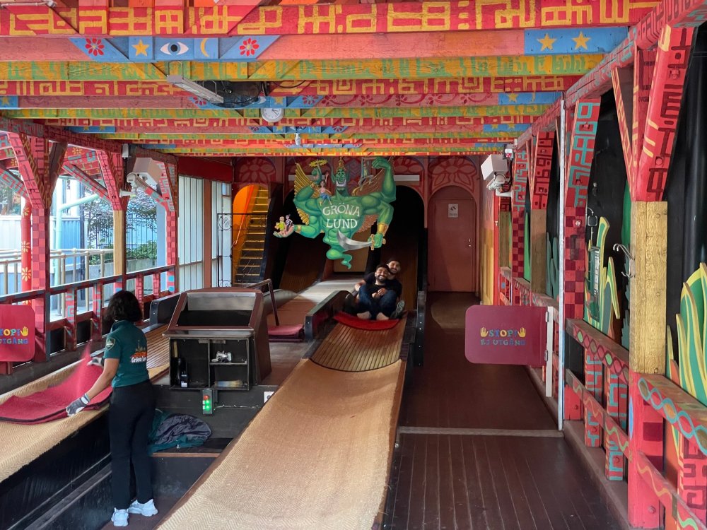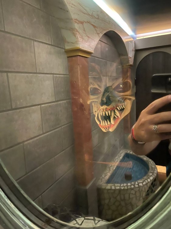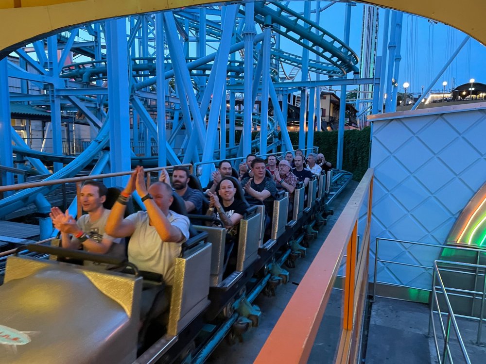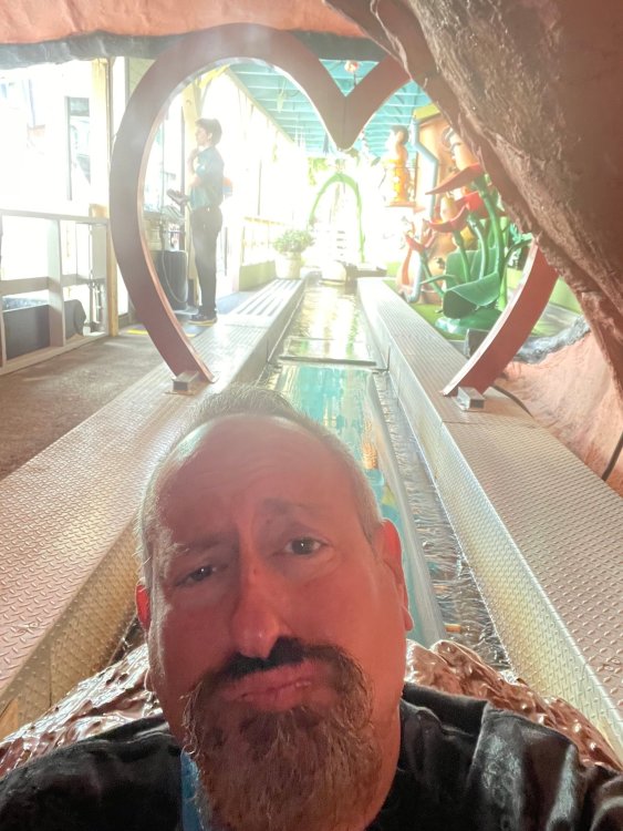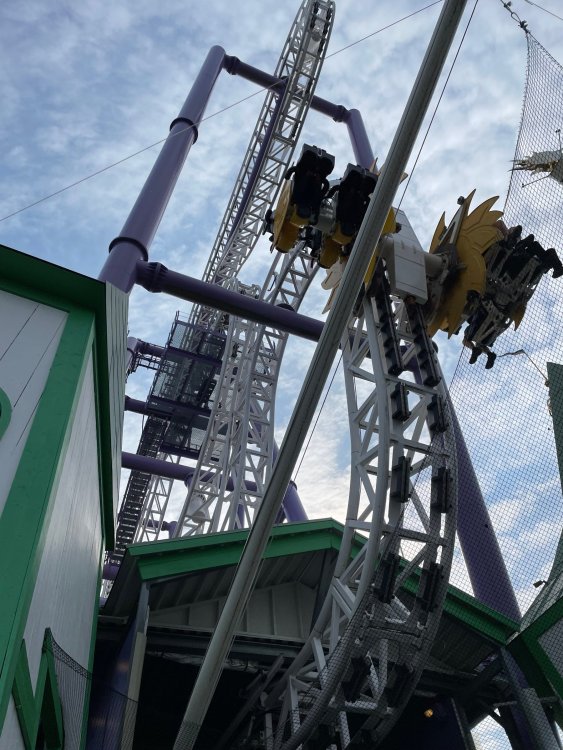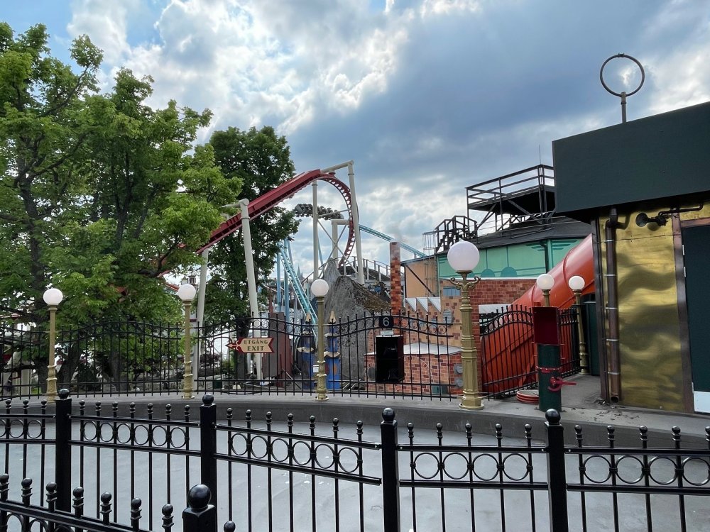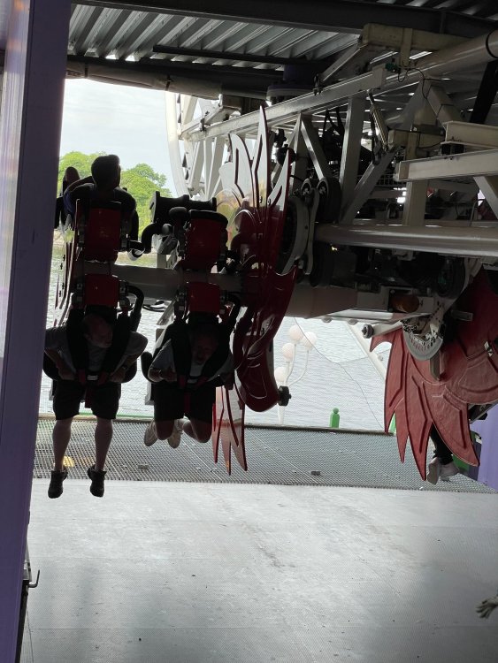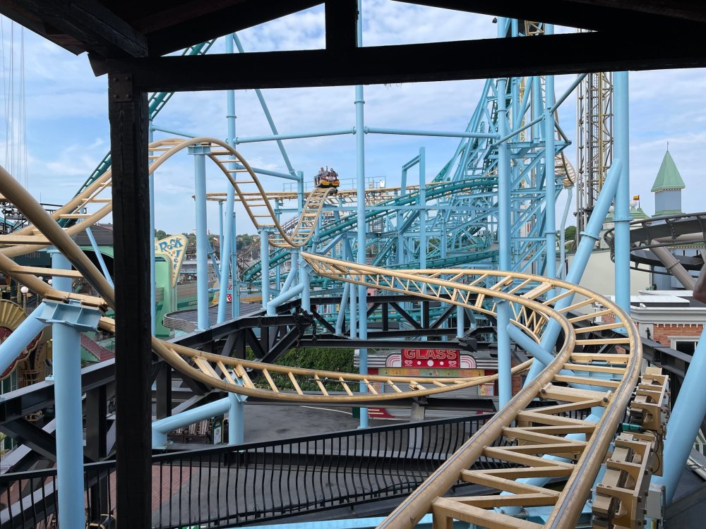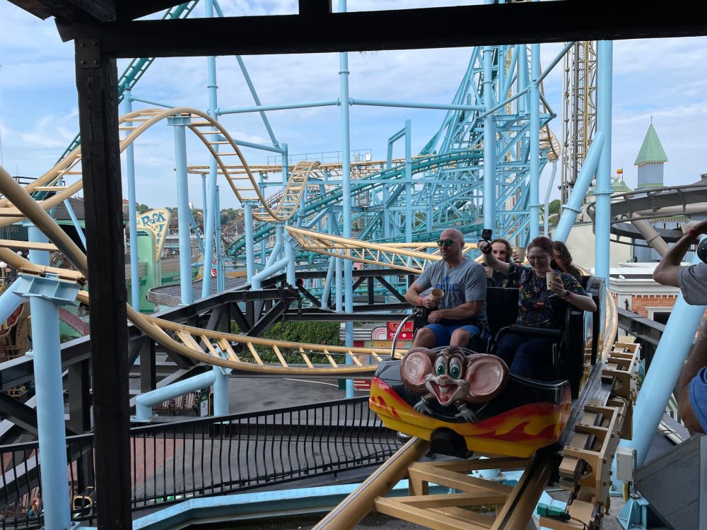 11. Day 18: Tuesday, June 20th part 3 (of 3) - back to finish off the night at the fantastic Grona Lund On the way back in, stopping to snap a pic of the park map. it LOOKS way smaller than it is, because things are just piled up on top of each other. the big green area in the bottom right, is the parking lot the park announced plans in 2023 to expand into. of course, my first stop on the way in was the Carousel. . . Big Mike had other plans tho, he was missing the kiddie credit, "Tuff-Tuff TÃ¥get" (Choo-Choo Train). So while he went to do that. . . Didier and I rode the Carousel. my happy place. his too, apparently for such a small carousel, it's just lovely, and appears hand painted. after my Carousel ride, I went over to the coaster to get proof of Big Mike riding it, in talking to the ride op - who was a total hoot! - she said it's a ride that's way more fun than it looks, as the sharp turns give a "whip" effect. She encouraged us all to ride it. sooooooo. . . (and she was right, it was way more fun that I had looked. and she let us ring the bell as we exited the station). back over to Vilda Musen for a "water free" ride, and we bumped into Hans and Matthew walking along the outside of the park, to get a different view of Twister and a crane across the lake, painted like a Giraffe. for some reason. Sweden! by going around the outside, we were gonna end up in the "haunted" section. . . and had also bumped into Andrew, sMisty, and Erik. . so we all headed that way together. that's Kvasten ahead of us, the Vekoma suspended coaster. whee. . . in the SPOOKY section now.. had to stop for a photo op, tho apparently we were boiling nothing for dinner. the flying carpet ride (not operating today) is over here for some reason. . . maybe they are tying in the Genie in the center of it with the spook/magic vibe of the area? Gotta ride Blue Train. . this thing is SO messed up. insanely silly, and with some needless nudity, and scary pop ups. . I adored it. rode this sucker at least 4 times on our trip. the name is brilliant. it's BLUE. . and it's a Train. see???? ooo. .scary! that creature has got "lady parts" !!! Scary!!!! so silly, and so much fun. every park should have a ride like this. and Grona Lund has several! the Starflyer doing it's thing from underneath Kvasten. we were in line for the very well done walk thru Haunt. I do believe that this is an upcharge attraction, but Elissa had arranged for us to all get admission (hence most of the group showing up here at a certain time). they send you thru in groups of 6-8, and said pictures were ok, as long as it didn't hold up the flow. it's got an outdoor section. . that's a group going thru the house up there on the balcony. fly, bird, fly !!!! now that bird knows what Fabio felt like, I suppose. my group's turn. . . howdy! ready to be a scared. . . nice mix of props, and live actors in here. great effect. . . choose your door carefully! he's coming to get you, Barbara. . . time for a birds eye view of the park on the starflyer. they are VERY serious about no loose objects on this ride. so only got pics from the queue, and before the ride started (with permission) it really is in the middle of everything. . surrounded by Coaster track on all sides that's Icarus doing it's thing back there. . Jetstream ,the Bobsled, AND Insane, all with cars on the tracks in one pic. that's a huge win for me, as I usually end up with no trains on the tracks hard to see in this pic, but Icarus has now tilted at the top, and the riders are hanging face down. a stage for musical performances. . . but we next headed over to the dual drop tower: Frit Fall & Tilt Hans & Matthew (and a very intense man who was wondering why I was taking his picture) chose to ride the "tilt" seated sides. while Big Mike and I (and a terrified girl), chose the stand up "Fritt Fall" side. it truly IS rather terrifying. and of course they have a camera on this side to capture it. I bought a magnet version, that came with a digital copy. glad I did it, but never again. walk around entertainment as well in this park. Not a LOT of it, but we were there on a weekday. in addition to lunch, snack, and dinner coupons, the park had gone all out and also gave us booklets of game coupons. the games were mostly hard, but there were some easier ones, and I think most everyone won some sort of prize. while they played that ping-pong game, I went into the bathroom next to it. . .and made a discovery. down a dark, bricked pathway/tunnel. . . there's this. just lovely. and when you go to wash your hands? yup. . a haunted toidy! gah! different mirrors have different creatures. . . LOL I had waited long enough, I was ready for Ikaros - the face first drop tower. again, some lovely art deco designs all around it. all the way up to the top. . . then, tilt forward. . so you will be hurtling face first towards the ground! gahhhhhhhh. . . . .it truly is a terrifying experience. and I absolutely LOVED it. we got some ERT on it at the end of the night - along with the operator making us sing ABBA and other disco songs as we ascended - and I think I rode every cycle I was able to get in on. scary, but THAT good. and you get pretty close to the ground before the seats swing back out to "normal" position even tho I know I'm a klutz, and the funhouse is a disaster waiting to happen for klutz'. . .I went ahead and did it. it's a really good funhouse. .and really ways to hurt oneself. I didn't get a pic of the entrance, but it's a "moving" ladder, that you have to climb up. . potential for injury right from the start! but it's full of whimsical, and fun obstacles. . that one really can't go around. you MUST go thru. bouncing walkways. . pitch black infinity rooms. . . truly confusing mirror mazes. . . yeah, all in one funhouse! and this is how you exit (the only option). . . you get a mat. sit on the mat, on the platform. . and the platform tilts, and shoots your ass down the slide! um.. . . . whee ? the view from t