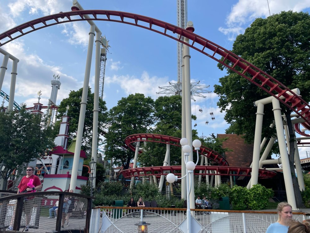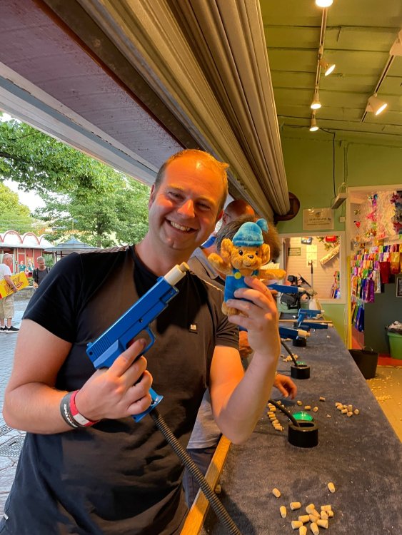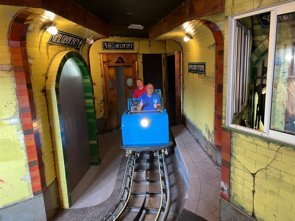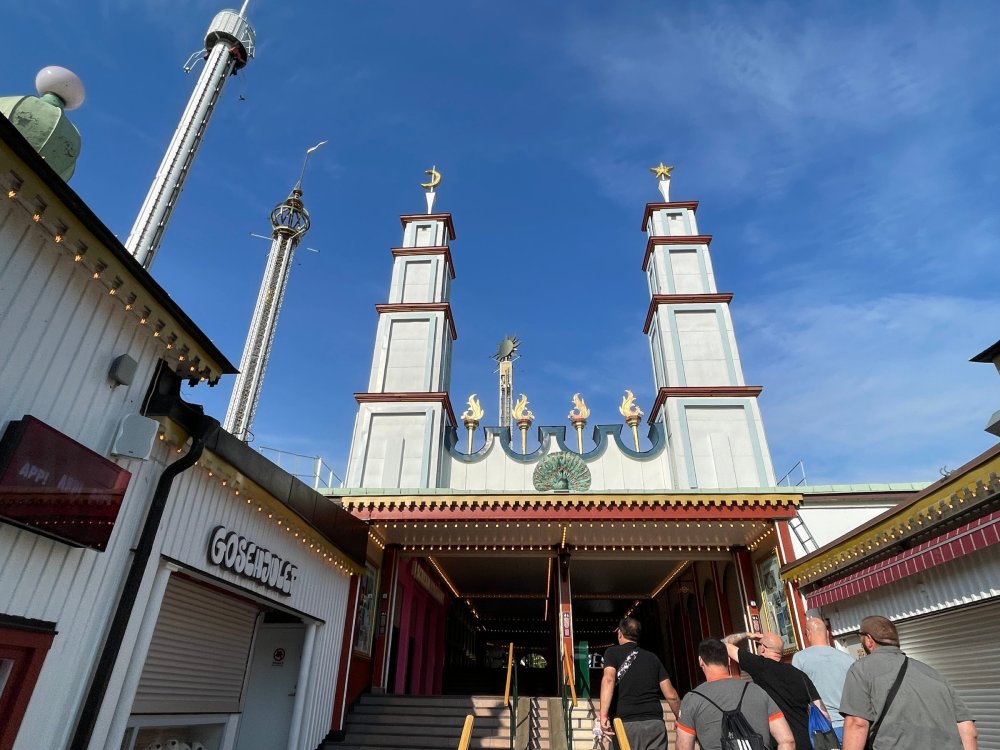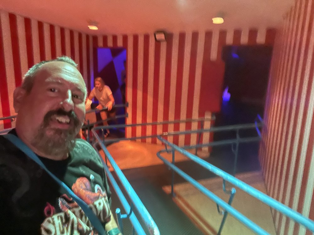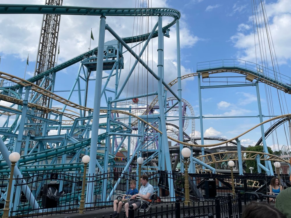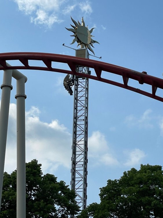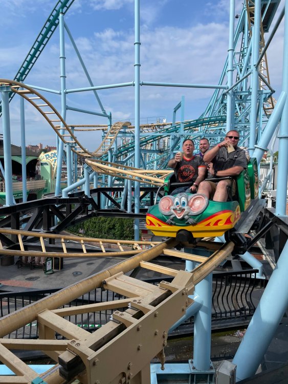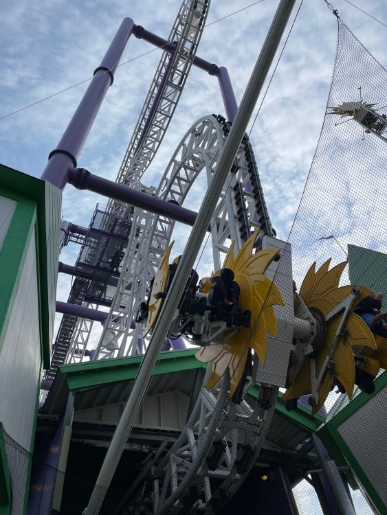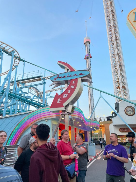 11. Day 18: Tuesday, June 20th part 3 (of 3) - back to finish off the night at the fantastic Grona Lund On the way back in, stopping to snap a pic of the park map. it LOOKS way smaller than it is, because things are just piled up on top of each other. the big green area in the bottom right, is the parking lot the park announced plans in 2023 to expand into. of course, my first stop on the way in was the Carousel. . . Big Mike had other plans tho, he was missing the kiddie credit, "Tuff-Tuff TÃ¥get" (Choo-Choo Train). So while he went to do that. . . Didier and I rode the Carousel. my happy place. his too, apparently for such a small carousel, it's just lovely, and appears hand painted. after my Carousel ride, I went over to the coaster to get proof of Big Mike riding it, in talking to the ride op - who was a total hoot! - she said it's a ride that's way more fun than it looks, as the sharp turns give a "whip" effect. She encouraged us all to ride it. sooooooo. . . (and she was right, it was way more fun that I had looked. and she let us ring the bell as we exited the station). back over to Vilda Musen for a "water free" ride, and we bumped into Hans and Matthew walking along the outside of the park, to get a different view of Twister and a crane across the lake, painted like a Giraffe. for some reason. Sweden! by going around the outside, we were gonna end up in the "haunted" section. . . and had also bumped into Andrew, sMisty, and Erik. . so we all headed that way together. that's Kvasten ahead of us, the Vekoma suspended coaster. whee. . . in the SPOOKY section now.. had to stop for a photo op, tho apparently we were boiling nothing for dinner. the flying carpet ride (not operating today) is over here for some reason. . . maybe they are tying in the Genie in the center of it with the spook/magic vibe of the area? Gotta ride Blue Train. . this thing is SO messed up. insanely silly, and with some needless nudity, and scary pop ups. . I adored it. rode this sucker at least 4 times on our trip. the name is brilliant. it's BLUE. . and it's a Train. see???? ooo. .scary! that creature has got "lady parts" !!! Scary!!!! so silly, and so much fun. every park should have a ride like this. and Grona Lund has several! the Starflyer doing it's thing from underneath Kvasten. we were in line for the very well done walk thru Haunt. I do believe that this is an upcharge attraction, but Elissa had arranged for us to all get admission (hence most of the group showing up here at a certain time). they send you thru in groups of 6-8, and said pictures were ok, as long as it didn't hold up the flow. it's got an outdoor section. . that's a group going thru the house up there on the balcony. fly, bird, fly !!!! now that bird knows what Fabio felt like, I suppose. my group's turn. . . howdy! ready to be a scared. . . nice mix of props, and live actors in here. great effect. . . choose your door carefully! he's coming to get you, Barbara. . . time for a birds eye view of the park on the starflyer. they are VERY serious about no loose objects on this ride. so only got pics from the queue, and before the ride started (with permission) it really is in the middle of everything. . surrounded by Coaster track on all sides that's Icarus doing it's thing back there. . Jetstream ,the Bobsled, AND Insane, all with cars on the tracks in one pic. that's a huge win for me, as I usually end up with no trains on the tracks hard to see in this pic, but Icarus has now tilted at the top, and the riders are hanging face down. a stage for musical performances. . . but we next headed over to the dual drop tower: Frit Fall & Tilt Hans & Matthew (and a very intense man who was wondering why I was taking his picture) chose to ride the "tilt" seated sides. while Big Mike and I (and a terrified girl), chose the stand up "Fritt Fall" side. it truly IS rather terrifying. and of course they have a camera on this side to capture it. I bought a magnet version, that came with a digital copy. glad I did it, but never again. walk around entertainment as well in this park. Not a LOT of it, but we were there on a weekday. in addition to lunch, snack, and dinner coupons, the park had gone all out and also gave us booklets of game coupons. the games were mostly hard, but there were some easier ones, and I think most everyone won some sort of prize. while they played that ping-pong game, I went into the bathroom next to it. . .and made a discovery. down a dark, bricked pathway/tunnel. . . there's this. just lovely. and when you go to wash your hands? yup. . a haunted toidy! gah! different mirrors have different creatures. . . LOL I had waited long enough, I was ready for Ikaros - the face first drop tower. again, some lovely art deco designs all around it. all the way up to the top. . . then, tilt forward. . so you will be hurtling face first towards the ground! gahhhhhhhh. . . . .it truly is a terrifying experience. and I absolutely LOVED it. we got some ERT on it at the end of the night - along with the operator making us sing ABBA and other disco songs as we ascended - and I think I rode every cycle I was able to get in on. scary, but THAT good. and you get pretty close to the ground before the seats swing back out to "normal" position even tho I know I'm a klutz, and the funhouse is a disaster waiting to happen for klutz'. . .I went ahead and did it. it's a really good funhouse. .and really ways to hurt oneself. I didn't get a pic of the entrance, but it's a "moving" ladder, that you have to climb up. . potential for injury right from the start! but it's full of whimsical, and fun obstacles. . that one really can't go around. you MUST go thru. bouncing walkways. . pitch black infinity rooms. . . truly confusing mirror mazes. . . yeah, all in one funhouse! and this is how you exit (the only option). . . you get a mat. sit on the mat, on the platform. . and the platform tilts, and shoots your ass down the slide! um.. . . . whee ? the view from t