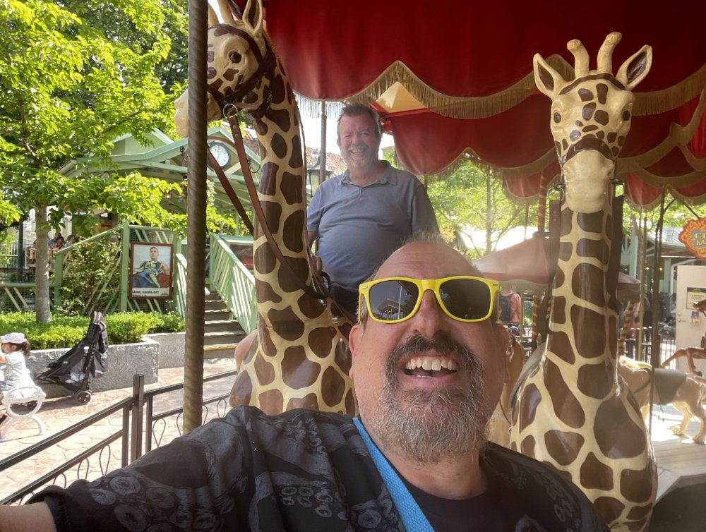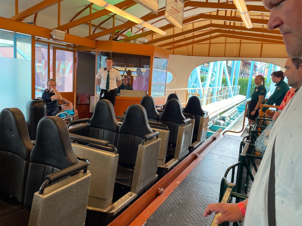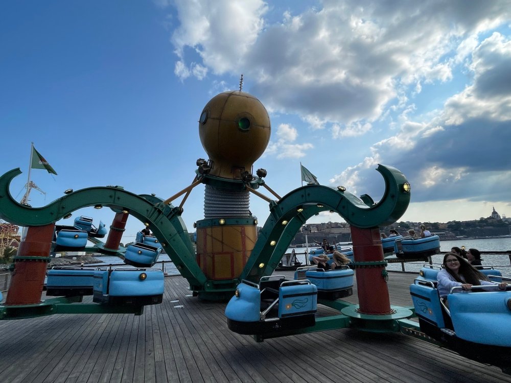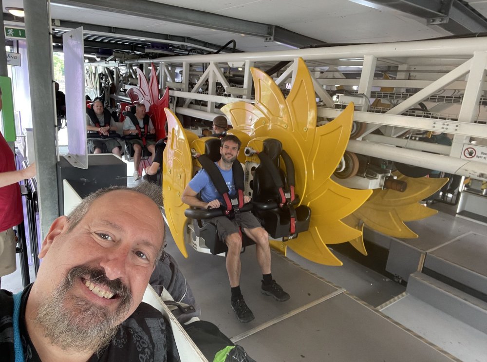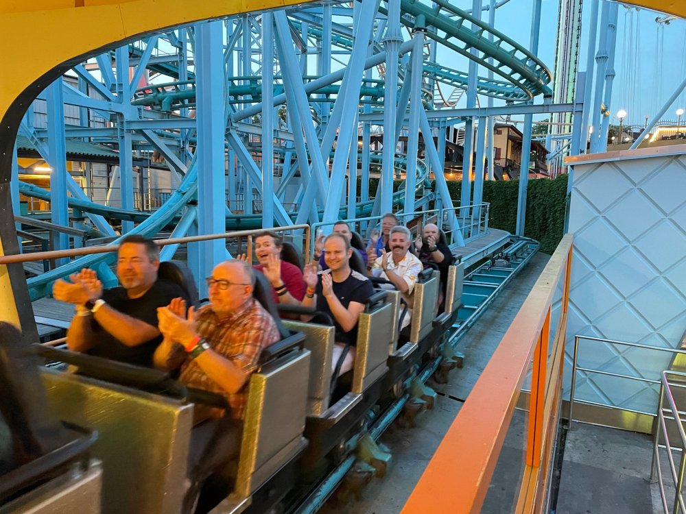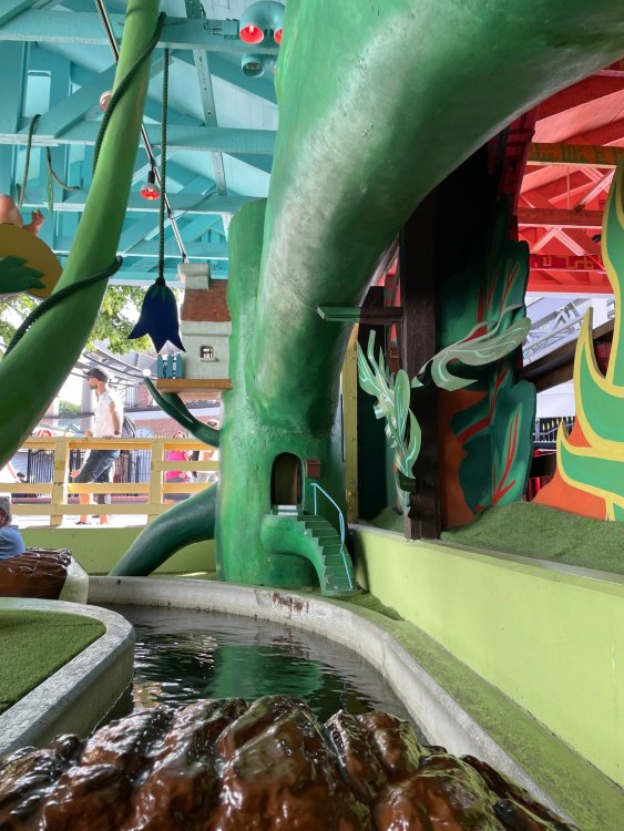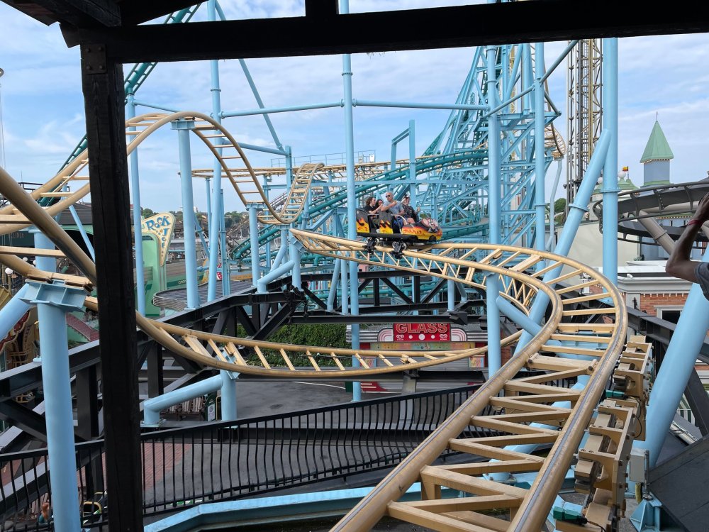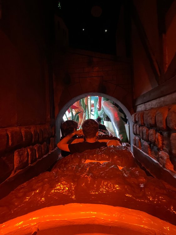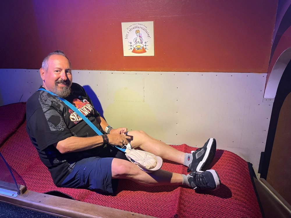 11. Day 18: Tuesday, June 20th part 3 (of 3) - back to finish off the night at the fantastic Grona Lund On the way back in, stopping to snap a pic of the park map. it LOOKS way smaller than it is, because things are just piled up on top of each other. the big green area in the bottom right, is the parking lot the park announced plans in 2023 to expand into. of course, my first stop on the way in was the Carousel. . . Big Mike had other plans tho, he was missing the kiddie credit, "Tuff-Tuff TÃ¥get" (Choo-Choo Train). So while he went to do that. . . Didier and I rode the Carousel. my happy place. his too, apparently for such a small carousel, it's just lovely, and appears hand painted. after my Carousel ride, I went over to the coaster to get proof of Big Mike riding it, in talking to the ride op - who was a total hoot! - she said it's a ride that's way more fun than it looks, as the sharp turns give a "whip" effect. She encouraged us all to ride it. sooooooo. . . (and she was right, it was way more fun that I had looked. and she let us ring the bell as we exited the station). back over to Vilda Musen for a "water free" ride, and we bumped into Hans and Matthew walking along the outside of the park, to get a different view of Twister and a crane across the lake, painted like a Giraffe. for some reason. Sweden! by going around the outside, we were gonna end up in the "haunted" section. . . and had also bumped into Andrew, sMisty, and Erik. . so we all headed that way together. that's Kvasten ahead of us, the Vekoma suspended coaster. whee. . . in the SPOOKY section now.. had to stop for a photo op, tho apparently we were boiling nothing for dinner. the flying carpet ride (not operating today) is over here for some reason. . . maybe they are tying in the Genie in the center of it with the spook/magic vibe of the area? Gotta ride Blue Train. . this thing is SO messed up. insanely silly, and with some needless nudity, and scary pop ups. . I adored it. rode this sucker at least 4 times on our trip. the name is brilliant. it's BLUE. . and it's a Train. see???? ooo. .scary! that creature has got "lady parts" !!! Scary!!!! so silly, and so much fun. every park should have a ride like this. and Grona Lund has several! the Starflyer doing it's thing from underneath Kvasten. we were in line for the very well done walk thru Haunt. I do believe that this is an upcharge attraction, but Elissa had arranged for us to all get admission (hence most of the group showing up here at a certain time). they send you thru in groups of 6-8, and said pictures were ok, as long as it didn't hold up the flow. it's got an outdoor section. . that's a group going thru the house up there on the balcony. fly, bird, fly !!!! now that bird knows what Fabio felt like, I suppose. my group's turn. . . howdy! ready to be a scared. . . nice mix of props, and live actors in here. great effect. . . choose your door carefully! he's coming to get you, Barbara. . . time for a birds eye view of the park on the starflyer. they are VERY serious about no loose objects on this ride. so only got pics from the queue, and before the ride started (with permission) it really is in the middle of everything. . surrounded by Coaster track on all sides that's Icarus doing it's thing back there. . Jetstream ,the Bobsled, AND Insane, all with cars on the tracks in one pic. that's a huge win for me, as I usually end up with no trains on the tracks hard to see in this pic, but Icarus has now tilted at the top, and the riders are hanging face down. a stage for musical performances. . . but we next headed over to the dual drop tower: Frit Fall & Tilt Hans & Matthew (and a very intense man who was wondering why I was taking his picture) chose to ride the "tilt" seated sides. while Big Mike and I (and a terrified girl), chose the stand up "Fritt Fall" side. it truly IS rather terrifying. and of course they have a camera on this side to capture it. I bought a magnet version, that came with a digital copy. glad I did it, but never again. walk around entertainment as well in this park. Not a LOT of it, but we were there on a weekday. in addition to lunch, snack, and dinner coupons, the park had gone all out and also gave us booklets of game coupons. the games were mostly hard, but there were some easier ones, and I think most everyone won some sort of prize. while they played that ping-pong game, I went into the bathroom next to it. . .and made a discovery. down a dark, bricked pathway/tunnel. . . there's this. just lovely. and when you go to wash your hands? yup. . a haunted toidy! gah! different mirrors have different creatures. . . LOL I had waited long enough, I was ready for Ikaros - the face first drop tower. again, some lovely art deco designs all around it. all the way up to the top. . . then, tilt forward. . so you will be hurtling face first towards the ground! gahhhhhhhh. . . . .it truly is a terrifying experience. and I absolutely LOVED it. we got some ERT on it at the end of the night - along with the operator making us sing ABBA and other disco songs as we ascended - and I think I rode every cycle I was able to get in on. scary, but THAT good. and you get pretty close to the ground before the seats swing back out to "normal" position even tho I know I'm a klutz, and the funhouse is a disaster waiting to happen for klutz'. . .I went ahead and did it. it's a really good funhouse. .and really ways to hurt oneself. I didn't get a pic of the entrance, but it's a "moving" ladder, that you have to climb up. . potential for injury right from the start! but it's full of whimsical, and fun obstacles. . that one really can't go around. you MUST go thru. bouncing walkways. . pitch black infinity rooms. . . truly confusing mirror mazes. . . yeah, all in one funhouse! and this is how you exit (the only option). . . you get a mat. sit on the mat, on the platform. . and the platform tilts, and shoots your ass down the slide! um.. . . . whee ? the view from t