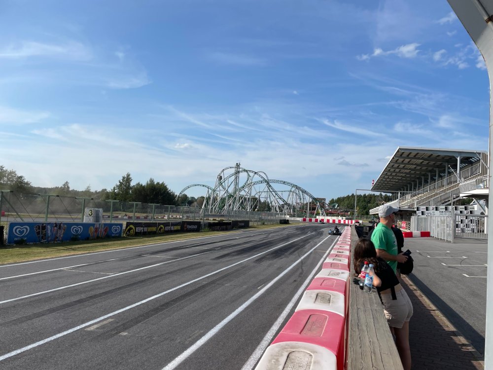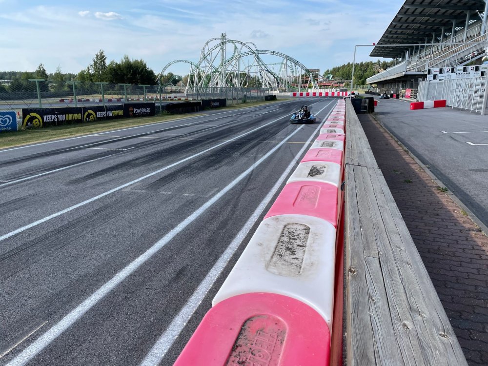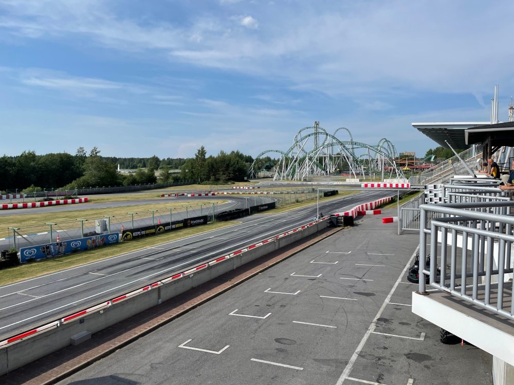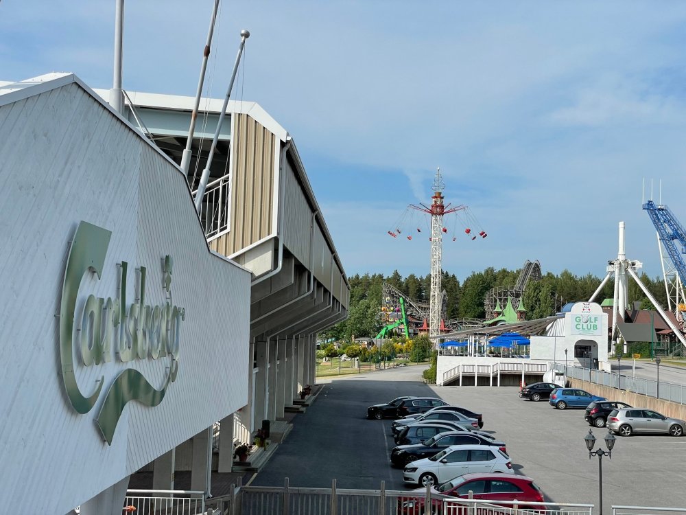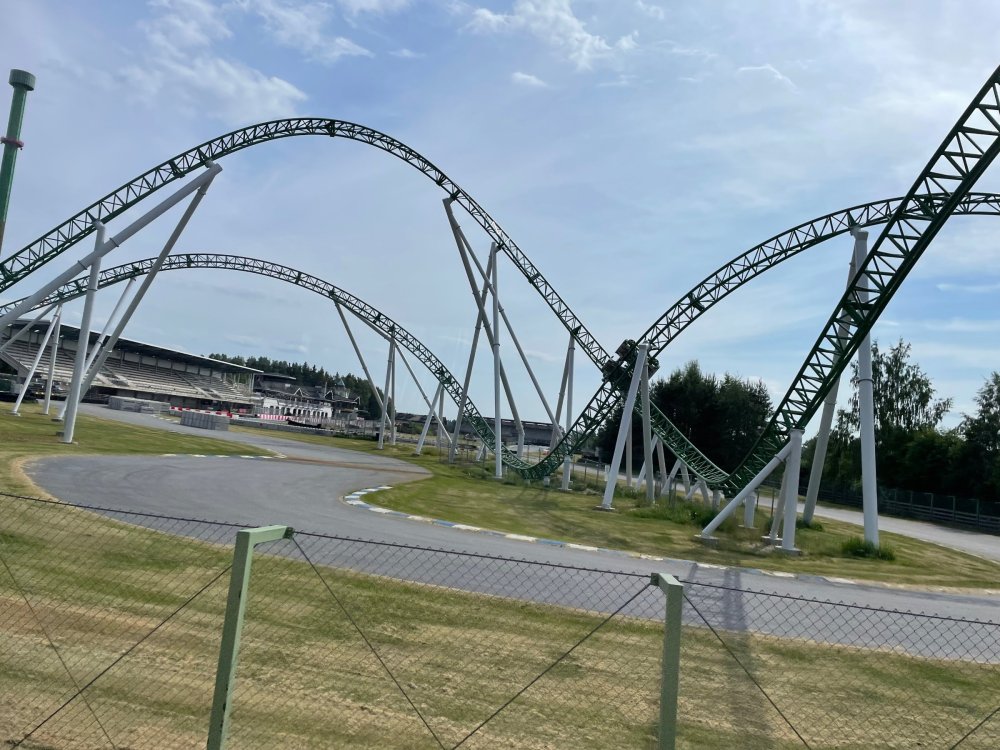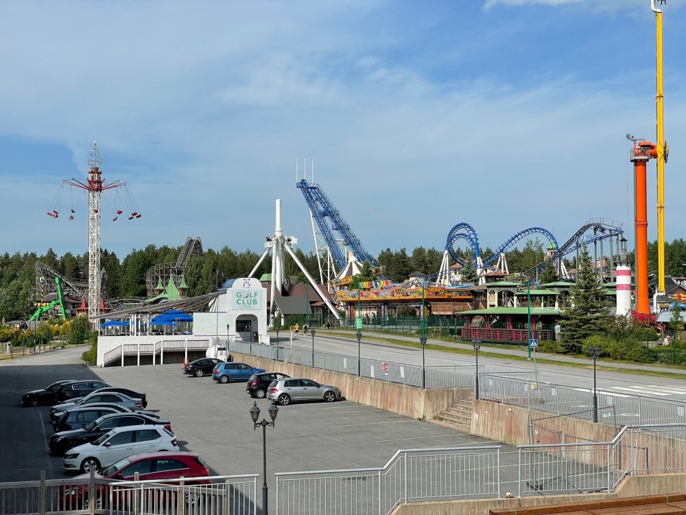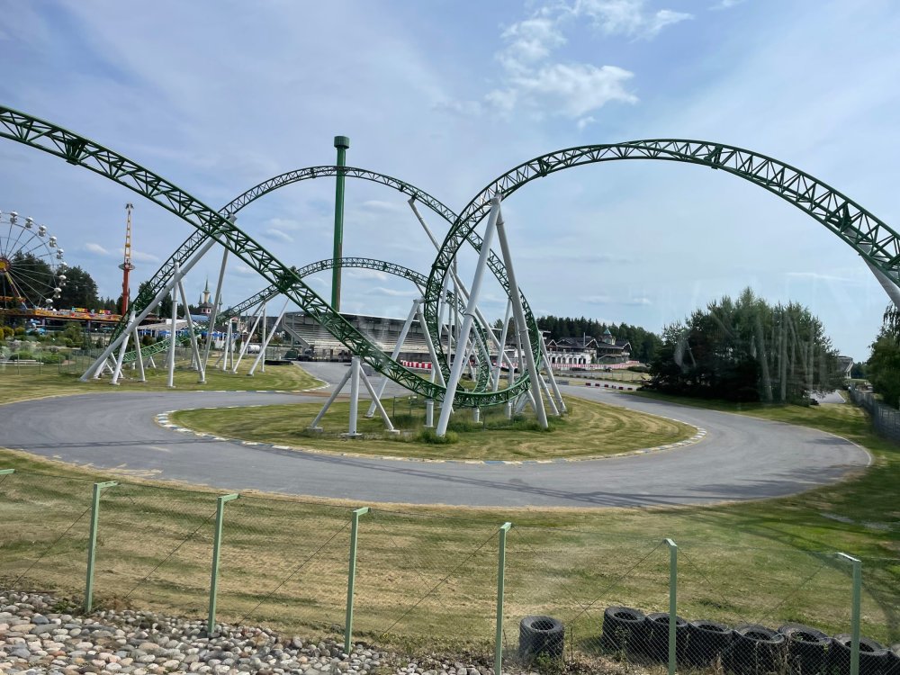 3. Day 19: Wednesday, June 21st - Travel day! From Sweden to Finland, were we were gonna spend a couple of days at the Northernmost Theme Park in the world. And have the TPR Grand Prix! it was sad saying goodbye to Stockholm, as I'd really enjoyed our time here, and what I'd seen of the City. (and I LOVED Grona Lund). but it was time to move on. before heading down to the lobby to meet everyone and head to the airport - we were flying today from Sweden to Finland - I finally DID remember to get a pic of the room at the hotel we stayed at. (this is after Hans and I pushed the beds together. .for our stay we had separated them with the little tables in between). not neat, but at least can see the room pretty good size. but with one of those annoying 1/2 showers, that this American always has trouble figuring out, and get a flood in the bathroom. eventually I'll figure out how to use the hand shower without spraying all over everything. waiting for our bus - we were saying goodbye to Didier today too, as he was leaving us at the airport - one final peek into the coffeshop/cafe connected to the hotel & ABBA museum. I recall this being a good size airport (pretty crowded too) with plenty of shops to explore while waiting for our flight to be called. I knew it was gonna be a small plane, as luggage for carry-on was really restricted. but I was surprised. I think this is the first plane I've ever been in with Propellers. Snug fit. . but we all were on the flight - spaced out here and there in seats thruout the plane. I ended up with a window seat, not my usual choice, but I didn't mind as was interested in looking out the window. ok. .that's gonna freak me out a little. not sure if this is leaving Sweden, or going into Finland. . . .but it sure is pretty. landing in Finland. Can you tell??? this was hysterically a big, one room Airport. with the bag claim and arrival on one side, and the "lobby" for departures on the other. I'm in Finland. yay! no worries about which luggage carousel our bags would be on. . .there was only one. and I think we were the only arriving flight anyways. Our new bus driver was waiting for us, and very quickly we were on our way. the country side in Finland looks a lot like many of the other Scandi Countrysides I'd seen. . and very much like mid America as well. for the most part. some houses stood out. many of them were painted Red with Yellow Door. (I did ask about that, and was told that painting your home Red was a sign of Finnish Pride, as it was reflective of the Copper Mining the area was first known for). the many fields of Finland but then, seemingly in the middle of no where, this appeared on the horizon. The Power Park complex (depending which sign you looked at in the park) all owned by the same folks - including that Road House, the complex contains a theme park, a big event center, a big 5D Cinema, a big Race Track - that can be configured for professional racing, as well as for full size go karts, mini-Golf course, and probably more! the owner collects all kinds of stuff (I didn't go into the Road House during our visit, but those that did have pics of some of the James Bond Movie vehicles from in there). like this plane. just displayed there, for some reason. not sure if it's from a film? but I'd assume it IS, and I should know that? yes, one of the configurations of the Track DOES go around one of the coasters. NEVER in America. and look at the size of those grandstands. . they must draw quite the crowd for some races. on the far right in the back, is our hotel (my room would end up at the farthest right, upper corner - overlooking the turns of the track, and what looked like no-longer-used grandstands). Kinda spooky, but all kinds of weird too. the front of the onsite Hotel. There were other guests here, but mostly it was the TPR group. kinda funky design, and the truck in front says "Power Park" so we're in the right spot. one side of the hotel - there are apparently more buldings around the corner too (near the abandoned grandstands), but they weren't in use, I was told. this hotel (called "Park Hotel" based on the name over the door on this side, has two entrances. . but the lobby is only on the other side, and the two sides connect via the Dining Room - which is only open for Breakfast and Dinner. funky, and I liked that it looked like we were gonna be staying inside a Koo Koo Clock. large Pool (but not for swimming.. tho we did see a drunk guy get naked and jump in on the 2nd night), with Stingray sculptures (for some reason), surrounded by that building that was a sauna/bar/ snacks area. it DID get rowdy at night, even with not many folks in the hotel. I remembered to take a pic of our room as soon as we got in it this time. the "info about the hotel" booklet. our room - with Hans enjoying the balcony the view down from said balcony. . . there were folks racing. we were planned to race tomorrow. the TPR Grand Prix. but the weather forecast wasn't looking great. I was looking forward to a nap before dinner, as it had been a really long day and I was exhausted. (I can't remember why I was so tired. .maybe it was an early morning check out after closing out Grona Lund with ERT and so my adrenaline made it hard to sleep? Or it could have just been the travel day - flights always stress me out a bit). . but when the park worked with Robb & Elissa to let us do our races this afternoon instead of possibly being rained out tomorrow? I got perky again and we all headed over to the Race Track area of Power Park. "Pit Lane Cafe" wasn't crowded at all. . .but the had some snacks to purchase if anyone was hungry, while we filled out all the forms and insurance things before we could race. this..did NOT make me want to eat one of the ice creams. . It's the Leif Garrett Smile and the Ascot/Pink Hanky that does it, I think. . . .LOL I was in Group 2 racing, so I stepped out front to get some pics of the park. I actually rode everything here. . including that Or