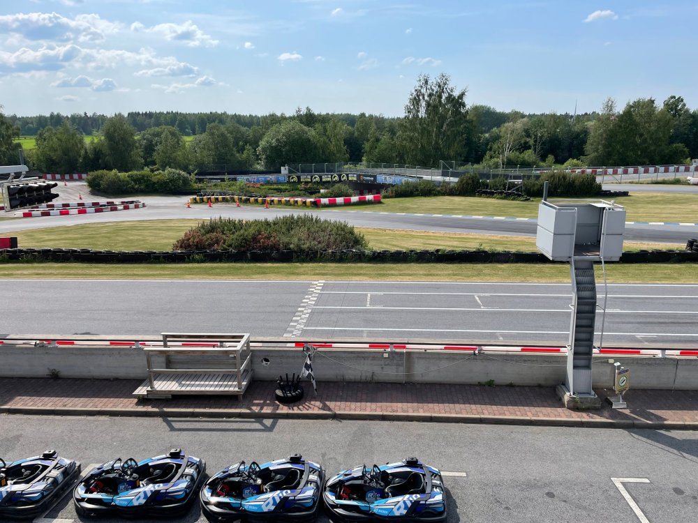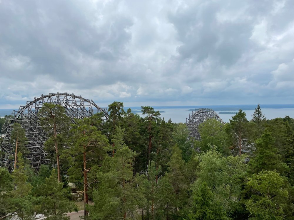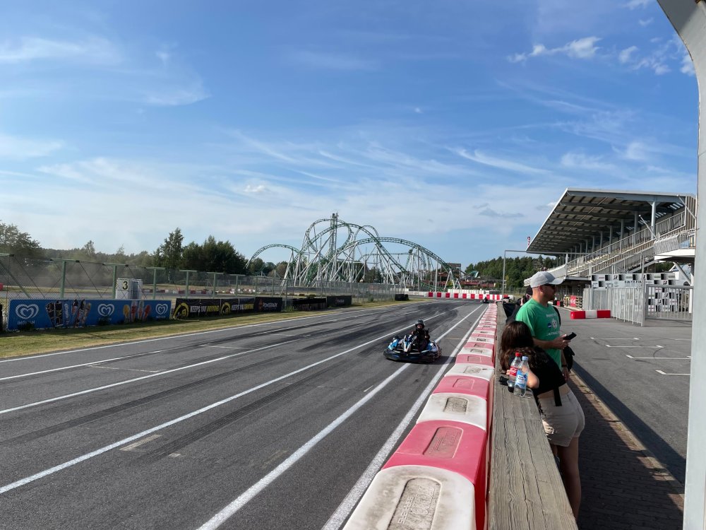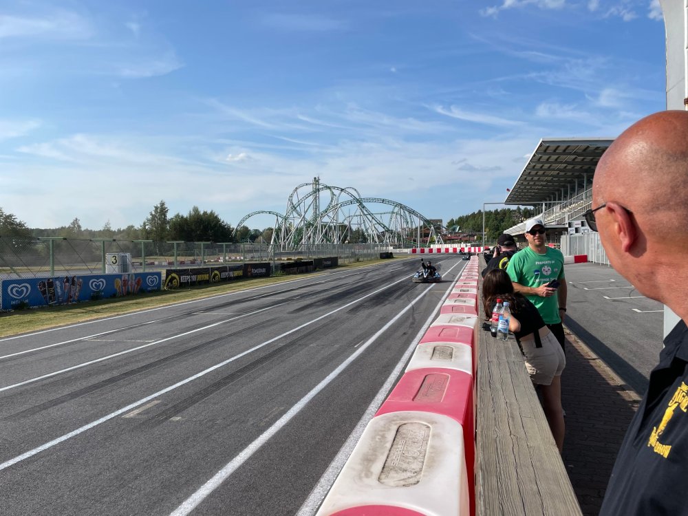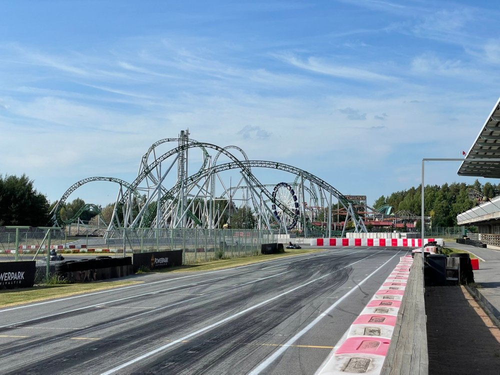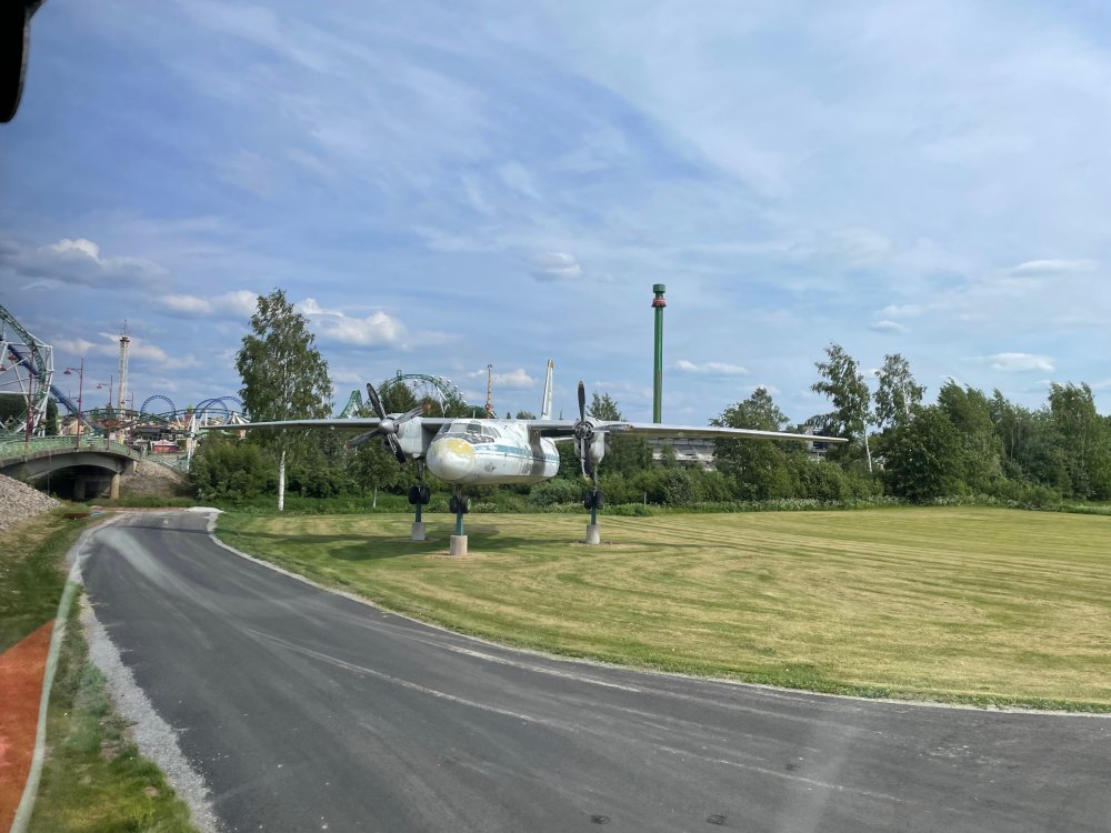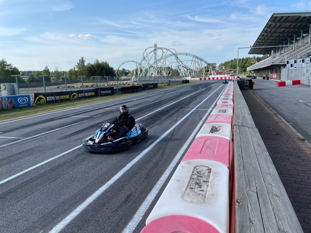 3. Day 19: Wednesday, June 21st - Travel day! From Sweden to Finland, were we were gonna spend a couple of days at the Northernmost Theme Park in the world. And have the TPR Grand Prix! it was sad saying goodbye to Stockholm, as I'd really enjoyed our time here, and what I'd seen of the City. (and I LOVED Grona Lund). but it was time to move on. before heading down to the lobby to meet everyone and head to the airport - we were flying today from Sweden to Finland - I finally DID remember to get a pic of the room at the hotel we stayed at. (this is after Hans and I pushed the beds together. .for our stay we had separated them with the little tables in between). not neat, but at least can see the room pretty good size. but with one of those annoying 1/2 showers, that this American always has trouble figuring out, and get a flood in the bathroom. eventually I'll figure out how to use the hand shower without spraying all over everything. waiting for our bus - we were saying goodbye to Didier today too, as he was leaving us at the airport - one final peek into the coffeshop/cafe connected to the hotel & ABBA museum. I recall this being a good size airport (pretty crowded too) with plenty of shops to explore while waiting for our flight to be called. I knew it was gonna be a small plane, as luggage for carry-on was really restricted. but I was surprised. I think this is the first plane I've ever been in with Propellers. Snug fit. . but we all were on the flight - spaced out here and there in seats thruout the plane. I ended up with a window seat, not my usual choice, but I didn't mind as was interested in looking out the window. ok. .that's gonna freak me out a little. not sure if this is leaving Sweden, or going into Finland. . . .but it sure is pretty. landing in Finland. Can you tell??? this was hysterically a big, one room Airport. with the bag claim and arrival on one side, and the "lobby" for departures on the other. I'm in Finland. yay! no worries about which luggage carousel our bags would be on. . .there was only one. and I think we were the only arriving flight anyways. Our new bus driver was waiting for us, and very quickly we were on our way. the country side in Finland looks a lot like many of the other Scandi Countrysides I'd seen. . and very much like mid America as well. for the most part. some houses stood out. many of them were painted Red with Yellow Door. (I did ask about that, and was told that painting your home Red was a sign of Finnish Pride, as it was reflective of the Copper Mining the area was first known for). the many fields of Finland but then, seemingly in the middle of no where, this appeared on the horizon. The Power Park complex (depending which sign you looked at in the park) all owned by the same folks - including that Road House, the complex contains a theme park, a big event center, a big 5D Cinema, a big Race Track - that can be configured for professional racing, as well as for full size go karts, mini-Golf course, and probably more! the owner collects all kinds of stuff (I didn't go into the Road House during our visit, but those that did have pics of some of the James Bond Movie vehicles from in there). like this plane. just displayed there, for some reason. not sure if it's from a film? but I'd assume it IS, and I should know that? yes, one of the configurations of the Track DOES go around one of the coasters. NEVER in America. and look at the size of those grandstands. . they must draw quite the crowd for some races. on the far right in the back, is our hotel (my room would end up at the farthest right, upper corner - overlooking the turns of the track, and what looked like no-longer-used grandstands). Kinda spooky, but all kinds of weird too. the front of the onsite Hotel. There were other guests here, but mostly it was the TPR group. kinda funky design, and the truck in front says "Power Park" so we're in the right spot. one side of the hotel - there are apparently more buldings around the corner too (near the abandoned grandstands), but they weren't in use, I was told. this hotel (called "Park Hotel" based on the name over the door on this side, has two entrances. . but the lobby is only on the other side, and the two sides connect via the Dining Room - which is only open for Breakfast and Dinner. funky, and I liked that it looked like we were gonna be staying inside a Koo Koo Clock. large Pool (but not for swimming.. tho we did see a drunk guy get naked and jump in on the 2nd night), with Stingray sculptures (for some reason), surrounded by that building that was a sauna/bar/ snacks area. it DID get rowdy at night, even with not many folks in the hotel. I remembered to take a pic of our room as soon as we got in it this time. the "info about the hotel" booklet. our room - with Hans enjoying the balcony the view down from said balcony. . . there were folks racing. we were planned to race tomorrow. the TPR Grand Prix. but the weather forecast wasn't looking great. I was looking forward to a nap before dinner, as it had been a really long day and I was exhausted. (I can't remember why I was so tired. .maybe it was an early morning check out after closing out Grona Lund with ERT and so my adrenaline made it hard to sleep? Or it could have just been the travel day - flights always stress me out a bit). . but when the park worked with Robb & Elissa to let us do our races this afternoon instead of possibly being rained out tomorrow? I got perky again and we all headed over to the Race Track area of Power Park. "Pit Lane Cafe" wasn't crowded at all. . .but the had some snacks to purchase if anyone was hungry, while we filled out all the forms and insurance things before we could race. this..did NOT make me want to eat one of the ice creams. . It's the Leif Garrett Smile and the Ascot/Pink Hanky that does it, I think. . . .LOL I was in Group 2 racing, so I stepped out front to get some pics of the park. I actually rode everything here. . including that Or