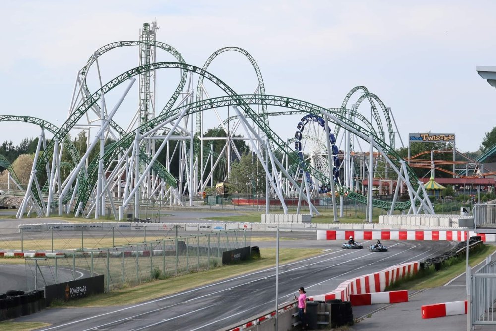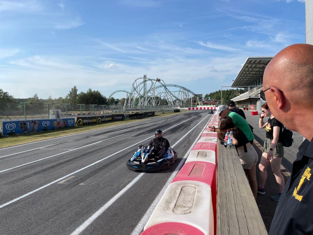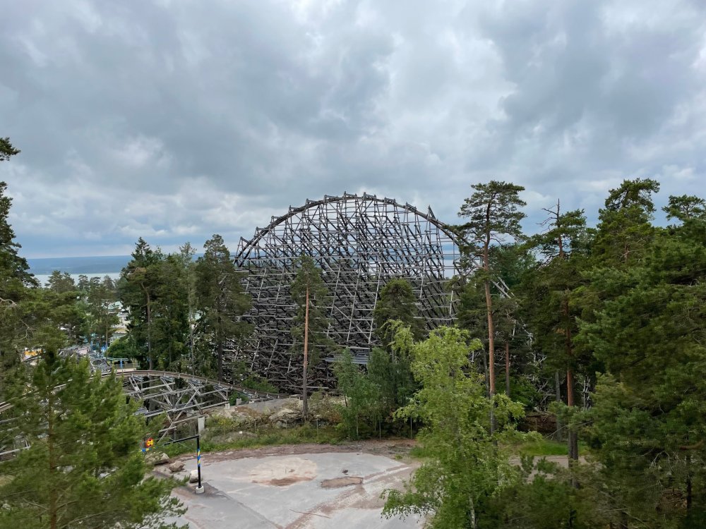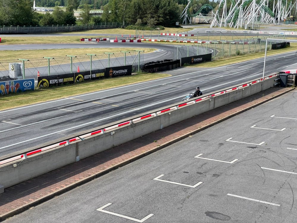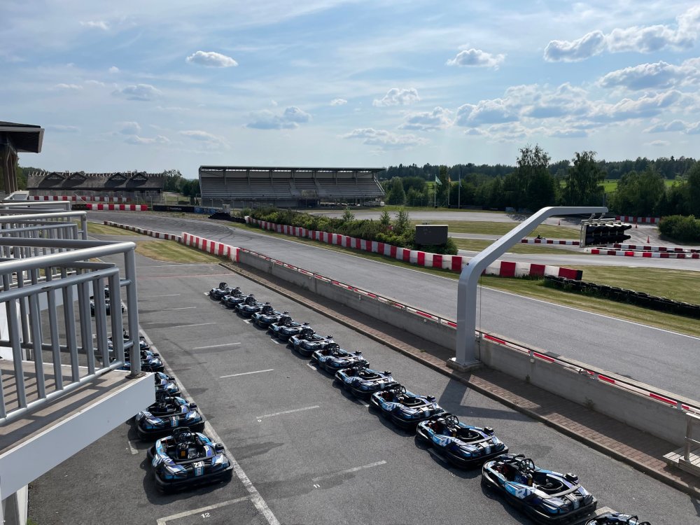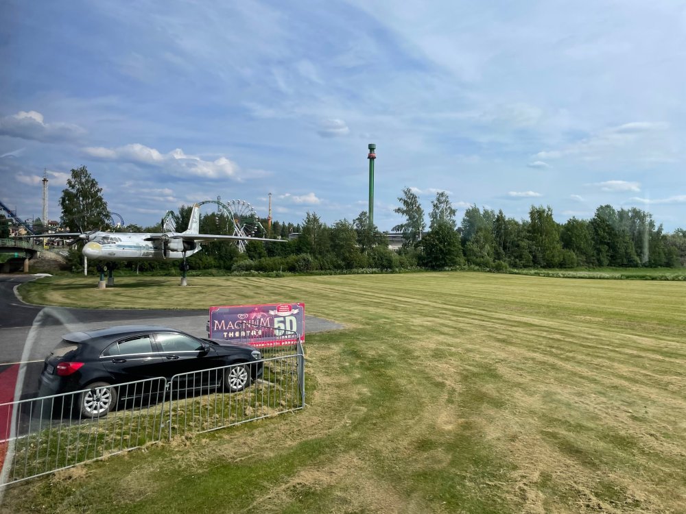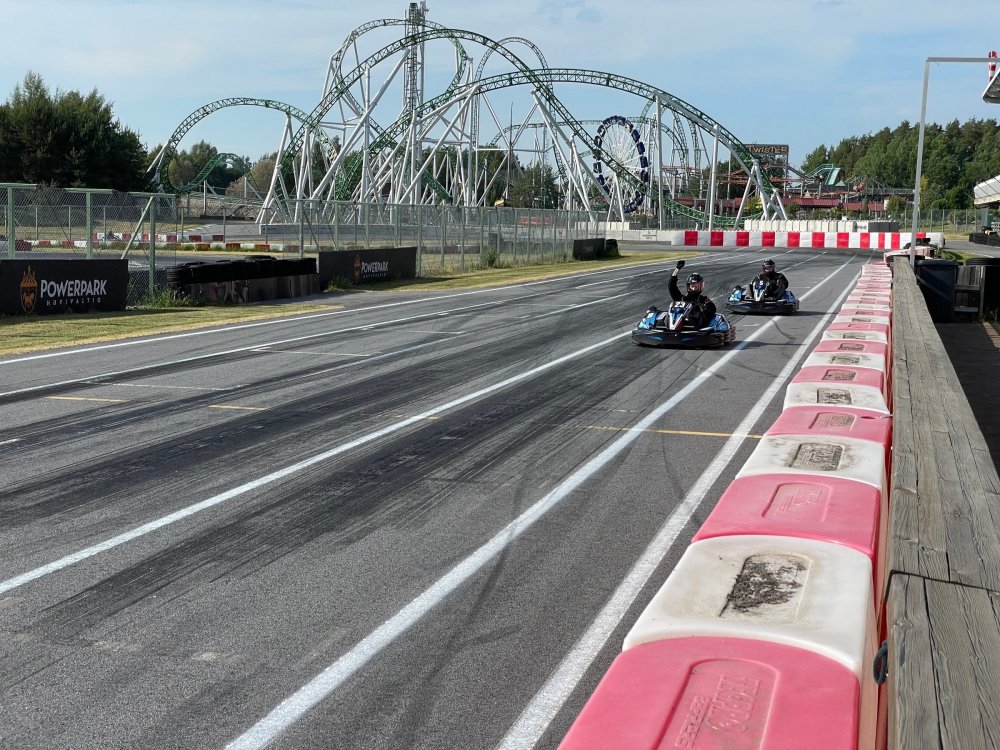 3. Day 19: Wednesday, June 21st - Travel day! From Sweden to Finland, were we were gonna spend a couple of days at the Northernmost Theme Park in the world. And have the TPR Grand Prix! it was sad saying goodbye to Stockholm, as I'd really enjoyed our time here, and what I'd seen of the City. (and I LOVED Grona Lund). but it was time to move on. before heading down to the lobby to meet everyone and head to the airport - we were flying today from Sweden to Finland - I finally DID remember to get a pic of the room at the hotel we stayed at. (this is after Hans and I pushed the beds together. .for our stay we had separated them with the little tables in between). not neat, but at least can see the room pretty good size. but with one of those annoying 1/2 showers, that this American always has trouble figuring out, and get a flood in the bathroom. eventually I'll figure out how to use the hand shower without spraying all over everything. waiting for our bus - we were saying goodbye to Didier today too, as he was leaving us at the airport - one final peek into the coffeshop/cafe connected to the hotel & ABBA museum. I recall this being a good size airport (pretty crowded too) with plenty of shops to explore while waiting for our flight to be called. I knew it was gonna be a small plane, as luggage for carry-on was really restricted. but I was surprised. I think this is the first plane I've ever been in with Propellers. Snug fit. . but we all were on the flight - spaced out here and there in seats thruout the plane. I ended up with a window seat, not my usual choice, but I didn't mind as was interested in looking out the window. ok. .that's gonna freak me out a little. not sure if this is leaving Sweden, or going into Finland. . . .but it sure is pretty. landing in Finland. Can you tell??? this was hysterically a big, one room Airport. with the bag claim and arrival on one side, and the "lobby" for departures on the other. I'm in Finland. yay! no worries about which luggage carousel our bags would be on. . .there was only one. and I think we were the only arriving flight anyways. Our new bus driver was waiting for us, and very quickly we were on our way. the country side in Finland looks a lot like many of the other Scandi Countrysides I'd seen. . and very much like mid America as well. for the most part. some houses stood out. many of them were painted Red with Yellow Door. (I did ask about that, and was told that painting your home Red was a sign of Finnish Pride, as it was reflective of the Copper Mining the area was first known for). the many fields of Finland but then, seemingly in the middle of no where, this appeared on the horizon. The Power Park complex (depending which sign you looked at in the park) all owned by the same folks - including that Road House, the complex contains a theme park, a big event center, a big 5D Cinema, a big Race Track - that can be configured for professional racing, as well as for full size go karts, mini-Golf course, and probably more! the owner collects all kinds of stuff (I didn't go into the Road House during our visit, but those that did have pics of some of the James Bond Movie vehicles from in there). like this plane. just displayed there, for some reason. not sure if it's from a film? but I'd assume it IS, and I should know that? yes, one of the configurations of the Track DOES go around one of the coasters. NEVER in America. and look at the size of those grandstands. . they must draw quite the crowd for some races. on the far right in the back, is our hotel (my room would end up at the farthest right, upper corner - overlooking the turns of the track, and what looked like no-longer-used grandstands). Kinda spooky, but all kinds of weird too. the front of the onsite Hotel. There were other guests here, but mostly it was the TPR group. kinda funky design, and the truck in front says "Power Park" so we're in the right spot. one side of the hotel - there are apparently more buldings around the corner too (near the abandoned grandstands), but they weren't in use, I was told. this hotel (called "Park Hotel" based on the name over the door on this side, has two entrances. . but the lobby is only on the other side, and the two sides connect via the Dining Room - which is only open for Breakfast and Dinner. funky, and I liked that it looked like we were gonna be staying inside a Koo Koo Clock. large Pool (but not for swimming.. tho we did see a drunk guy get naked and jump in on the 2nd night), with Stingray sculptures (for some reason), surrounded by that building that was a sauna/bar/ snacks area. it DID get rowdy at night, even with not many folks in the hotel. I remembered to take a pic of our room as soon as we got in it this time. the "info about the hotel" booklet. our room - with Hans enjoying the balcony the view down from said balcony. . . there were folks racing. we were planned to race tomorrow. the TPR Grand Prix. but the weather forecast wasn't looking great. I was looking forward to a nap before dinner, as it had been a really long day and I was exhausted. (I can't remember why I was so tired. .maybe it was an early morning check out after closing out Grona Lund with ERT and so my adrenaline made it hard to sleep? Or it could have just been the travel day - flights always stress me out a bit). . but when the park worked with Robb & Elissa to let us do our races this afternoon instead of possibly being rained out tomorrow? I got perky again and we all headed over to the Race Track area of Power Park. "Pit Lane Cafe" wasn't crowded at all. . .but the had some snacks to purchase if anyone was hungry, while we filled out all the forms and insurance things before we could race. this..did NOT make me want to eat one of the ice creams. . It's the Leif Garrett Smile and the Ascot/Pink Hanky that does it, I think. . . .LOL I was in Group 2 racing, so I stepped out front to get some pics of the park. I actually rode everything here. . including that Or