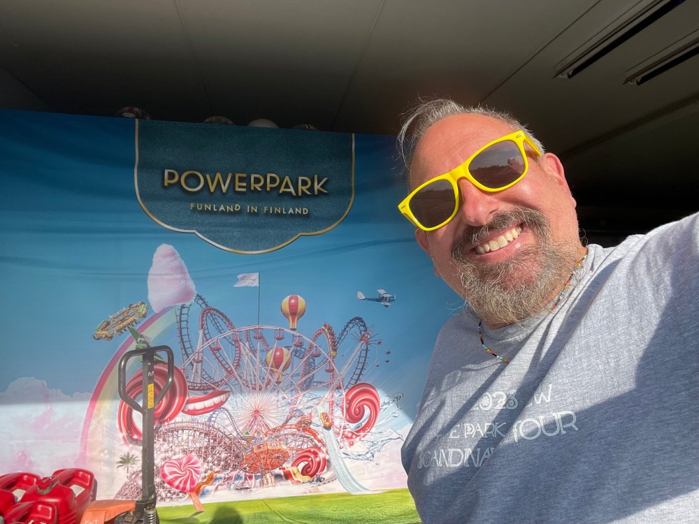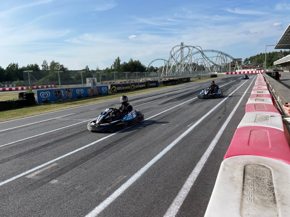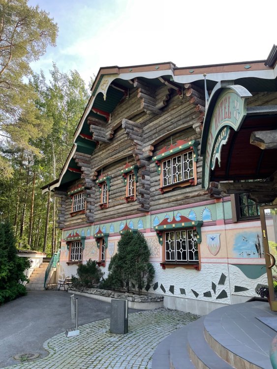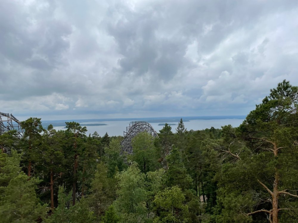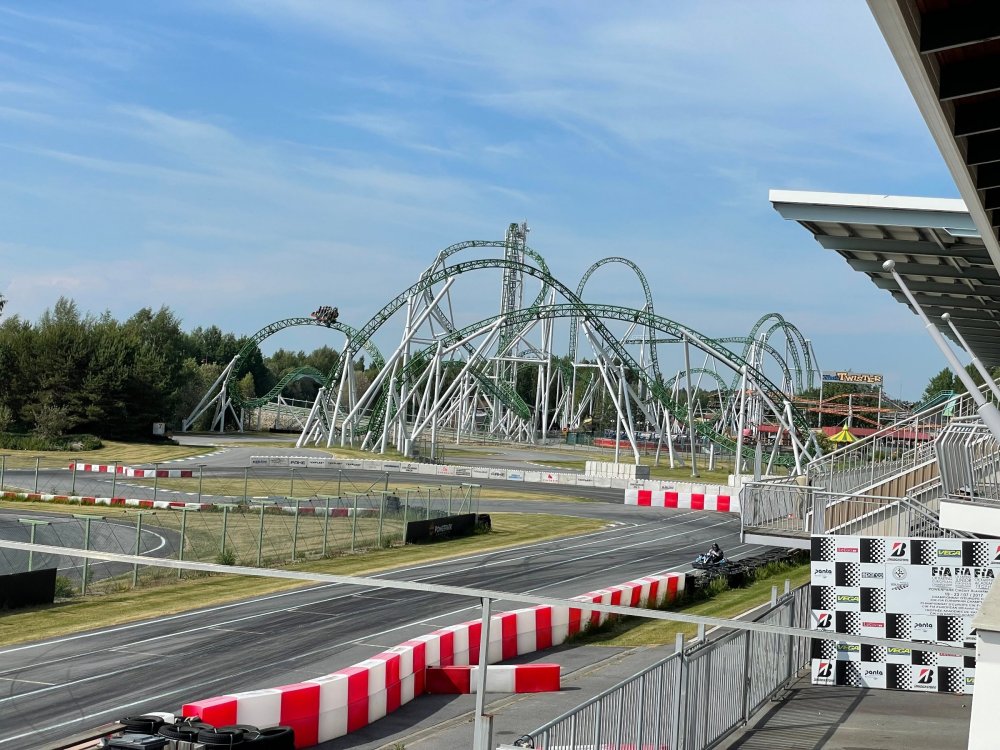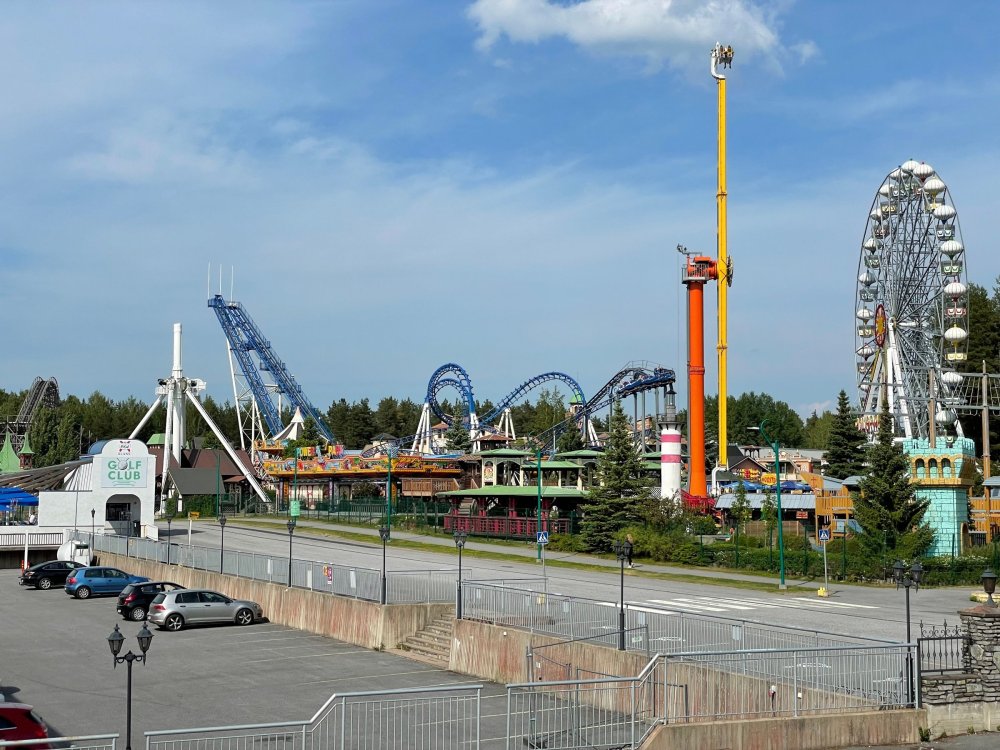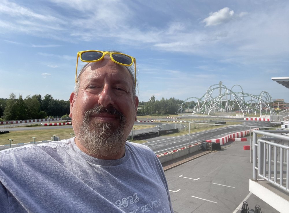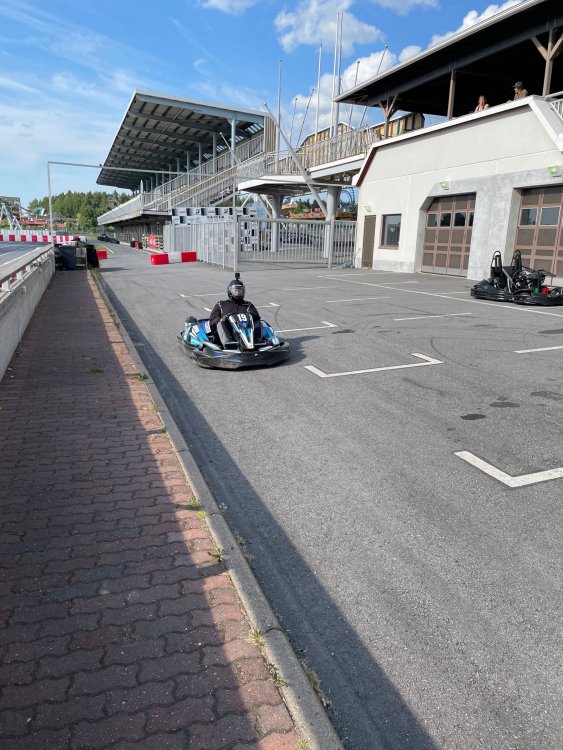 3. Day 19: Wednesday, June 21st - Travel day! From Sweden to Finland, were we were gonna spend a couple of days at the Northernmost Theme Park in the world. And have the TPR Grand Prix! it was sad saying goodbye to Stockholm, as I'd really enjoyed our time here, and what I'd seen of the City. (and I LOVED Grona Lund). but it was time to move on. before heading down to the lobby to meet everyone and head to the airport - we were flying today from Sweden to Finland - I finally DID remember to get a pic of the room at the hotel we stayed at. (this is after Hans and I pushed the beds together. .for our stay we had separated them with the little tables in between). not neat, but at least can see the room pretty good size. but with one of those annoying 1/2 showers, that this American always has trouble figuring out, and get a flood in the bathroom. eventually I'll figure out how to use the hand shower without spraying all over everything. waiting for our bus - we were saying goodbye to Didier today too, as he was leaving us at the airport - one final peek into the coffeshop/cafe connected to the hotel & ABBA museum. I recall this being a good size airport (pretty crowded too) with plenty of shops to explore while waiting for our flight to be called. I knew it was gonna be a small plane, as luggage for carry-on was really restricted. but I was surprised. I think this is the first plane I've ever been in with Propellers. Snug fit. . but we all were on the flight - spaced out here and there in seats thruout the plane. I ended up with a window seat, not my usual choice, but I didn't mind as was interested in looking out the window. ok. .that's gonna freak me out a little. not sure if this is leaving Sweden, or going into Finland. . . .but it sure is pretty. landing in Finland. Can you tell??? this was hysterically a big, one room Airport. with the bag claim and arrival on one side, and the "lobby" for departures on the other. I'm in Finland. yay! no worries about which luggage carousel our bags would be on. . .there was only one. and I think we were the only arriving flight anyways. Our new bus driver was waiting for us, and very quickly we were on our way. the country side in Finland looks a lot like many of the other Scandi Countrysides I'd seen. . and very much like mid America as well. for the most part. some houses stood out. many of them were painted Red with Yellow Door. (I did ask about that, and was told that painting your home Red was a sign of Finnish Pride, as it was reflective of the Copper Mining the area was first known for). the many fields of Finland but then, seemingly in the middle of no where, this appeared on the horizon. The Power Park complex (depending which sign you looked at in the park) all owned by the same folks - including that Road House, the complex contains a theme park, a big event center, a big 5D Cinema, a big Race Track - that can be configured for professional racing, as well as for full size go karts, mini-Golf course, and probably more! the owner collects all kinds of stuff (I didn't go into the Road House during our visit, but those that did have pics of some of the James Bond Movie vehicles from in there). like this plane. just displayed there, for some reason. not sure if it's from a film? but I'd assume it IS, and I should know that? yes, one of the configurations of the Track DOES go around one of the coasters. NEVER in America. and look at the size of those grandstands. . they must draw quite the crowd for some races. on the far right in the back, is our hotel (my room would end up at the farthest right, upper corner - overlooking the turns of the track, and what looked like no-longer-used grandstands). Kinda spooky, but all kinds of weird too. the front of the onsite Hotel. There were other guests here, but mostly it was the TPR group. kinda funky design, and the truck in front says "Power Park" so we're in the right spot. one side of the hotel - there are apparently more buldings around the corner too (near the abandoned grandstands), but they weren't in use, I was told. this hotel (called "Park Hotel" based on the name over the door on this side, has two entrances. . but the lobby is only on the other side, and the two sides connect via the Dining Room - which is only open for Breakfast and Dinner. funky, and I liked that it looked like we were gonna be staying inside a Koo Koo Clock. large Pool (but not for swimming.. tho we did see a drunk guy get naked and jump in on the 2nd night), with Stingray sculptures (for some reason), surrounded by that building that was a sauna/bar/ snacks area. it DID get rowdy at night, even with not many folks in the hotel. I remembered to take a pic of our room as soon as we got in it this time. the "info about the hotel" booklet. our room - with Hans enjoying the balcony the view down from said balcony. . . there were folks racing. we were planned to race tomorrow. the TPR Grand Prix. but the weather forecast wasn't looking great. I was looking forward to a nap before dinner, as it had been a really long day and I was exhausted. (I can't remember why I was so tired. .maybe it was an early morning check out after closing out Grona Lund with ERT and so my adrenaline made it hard to sleep? Or it could have just been the travel day - flights always stress me out a bit). . but when the park worked with Robb & Elissa to let us do our races this afternoon instead of possibly being rained out tomorrow? I got perky again and we all headed over to the Race Track area of Power Park. "Pit Lane Cafe" wasn't crowded at all. . .but the had some snacks to purchase if anyone was hungry, while we filled out all the forms and insurance things before we could race. this..did NOT make me want to eat one of the ice creams. . It's the Leif Garrett Smile and the Ascot/Pink Hanky that does it, I think. . . .LOL I was in Group 2 racing, so I stepped out front to get some pics of the park. I actually rode everything here. . including that Or