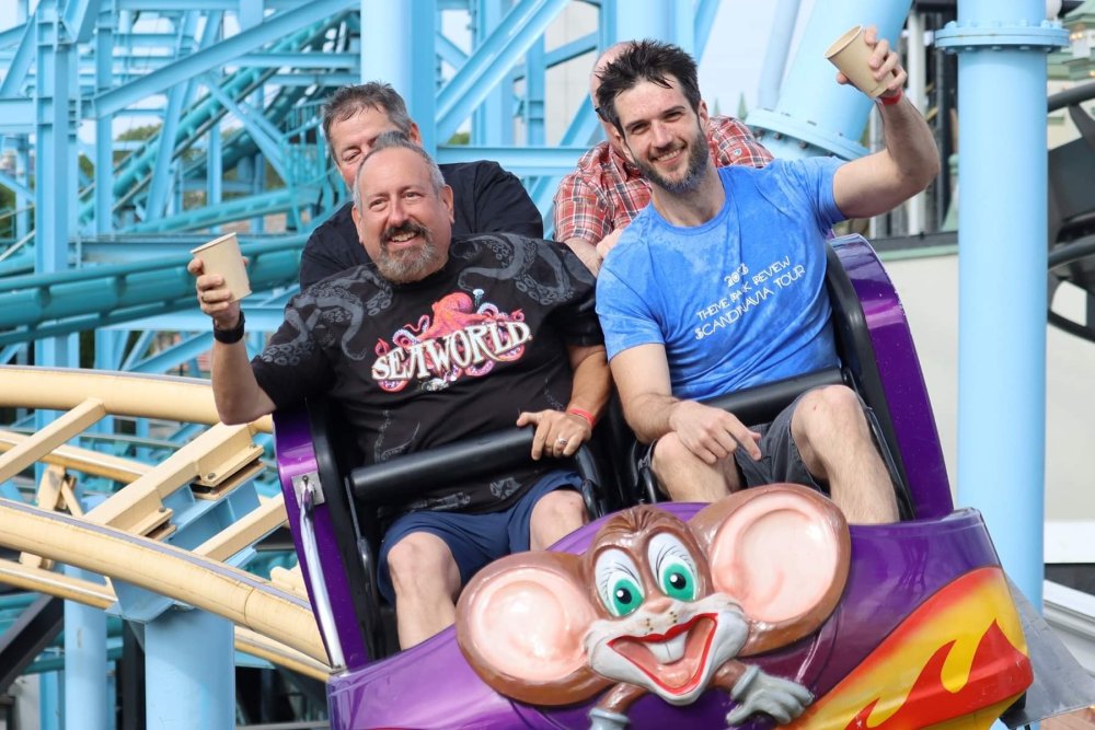13. Day 18: Tuesday, June 20th part 1 (of 3) - the magic place that is Grona Lund woke up a bit giddy today, as today was the full day we'd be spending at Grona Lund! (after seeing it every day from our hotel across the street, and getting just a taste on the night we arrived in Stockholm, with that surprise ERT on Monster). we were met before park open at the front gates by one of the park owners (a SUPER nice guy), and handed off to a couple of guides who would be with us this morning for a while, walking us to certain things to get some rides in before park open. we went in via, what I assume, was the original main gate to the park. Over in the section with the smaller family/kiddie rides, and lots of games. the original ticket booths for the park, I believe. . . just inside the main gate. classic carousel. . small, but with some lovely carved animals. seeing this pic, I realize, I never came back to ride this. . LOL. . I totally forgot it was i the park, as there are SO many other things to ride. a mini drop tower. . if we count this one? Grona Lund has a staggering FIVE drop tower rides. a flying elephant ride. . this area really is lovely. but we were headed up the stairs (a clever "bridge" that goes over a street) into the much bigger section of the park. . with all the thrill rides! and "Mexican" food.. which sadly, I didn't try. I was SO full from the snacking, and the wonderful dinner we were served, I just never got back to it. but I do love the added touch of the painted grate, so the place looks open even when it's sealed up tight. our first stop was going to be some morning rides on Monster! (we hadn't ridden it in the daytime yet, so a wonderful first stop). thru the Jetpass line, of course, even tho the park wouldn't open for a couple of hours yet. whee! I mentioned the other day, what's so amazing about Grona Lund is how the rides are all built seemingly on top of each other. there are four different coasters in this pic. . main track is Monster, the white track is Insane, the blue track is Jetline, and the yellow track at the bottom of the pic is Vilda Munsen after a few rides, I stepped out to take pics while others continued to ride. Rarrrghh. . I'm a monster Insane. . the tunnel of love ride at the park. . that ended up being SO bizarre (one of several strange and bizzare rides at the park), that I rode it multiple times today. the exit to the "it really WILL try to kill you" / "NEVER in America" funhouse. looks harmless! in this pic you can see two of the drop towers on the right, and the Starflyer on the left. and Jetline's 1st drop. Funhouse on the left, tunnel of love on the right. and Insane lurking on the upper right. play with Grona Lund's famous Woody? oh My! the Monster station is underground. . and I absolutely adore how they themed it to a subway stop. even doing some great tilework on the part of the ride the General Public can see, as the train comes back into the underground station. Morning ERT on Monster done, our guides walked us over to Insane. . . lovely scenery around this coaster. it looks like an S&S freespin on steroids (oh, it's much, much worse). I rode it twice, only. the first time I really disliked it. so rode again to make sure. . and yup, I did not like that much flipping that's not sustained. I mean, I LOVED Arashi at Nagashima Spaland (an S&S Freespin), but that's pretty consistent spinning. Insane does a lot of spinning, with a bunch of rocking back and forth in between the spins. and the forces due to the design simply weren't comfortable for me. glad I rode it, but yeah, not for me! random theming viewable from the Insane station. very pretty park! all smiles - prior to my 1st ride. stepping out to get my "land legs" back after my 1st ride.. snapped a few pics of others riding. it really IS pretty photographic are they having fun or screaming in agony? as noted, the setting for the park is just lovely. . . turning my back to the ride, and enjoying the view some rides at the park are built out onto piers - that seem to move with the water. . made for some fun ride experiences. I believe this is thanks to Elissa - edit. . it's actually from Chuck! Thanks CFC I don't appear to be in pain, and hell, it kinda looks like I'm having fun. this is my 2nd ride, and I think perhaps Jon and I are laughing because we sat together on one side, and Ryan is by himself on the other. . so we were pretty off balance the entire ride like this. HA!!! wonderful design for the old ticket booth (I guess the park used to be individually ticketed, as several rides had boarded up ticket booths by them). I believe this is Icarus - the face first (no really) drop tower. but here's where we were headed. . . Vilda Musen. (and the Starflyer starting to test behind it). we were gonna have some fun on this Gerstlauer Bobsled. . . TPR was gonna do the "water challenge" a look into a section of the park that would open a bit after the main park opened. that coaster is Kvasten (Broom). . a Vekoma suspended coaster that's themed to Witches flying brooms. That whole section was "scary" with Blue Train, and the Haunted House located there as well. before heading into the queue for the Vild Musen, I snapped a pic of the other drop tower that was across from us. this is "Frit Fall" - a STAND UP drop tower on one side, and "Tilt" a tilting drop tower (think Acrophobia at SFOG for the angle of the tilt) on the other 3 sides. again. . great theming everywhere! and no. . this Queue Line stantion is NOT why I loved Grona Lund so much. . . . but it didn't hurt. . . LOL lots of cool art in the station for the Bobsled tho you really have to be quite slim for this queue (luckily we were there before park open, so bypassed the squeeze). but I love how you can see the cars going up the lift hill via the windows in the station. sure! let's hold open glasses of water while riding this to see how much water is still in the cups after each ride. looks smooth! looks like most of them did w