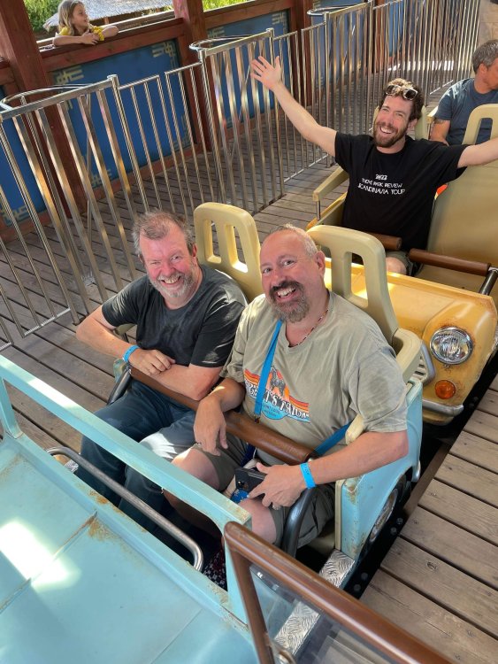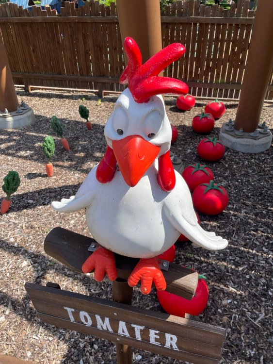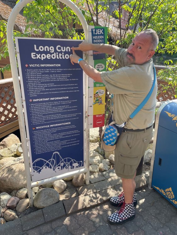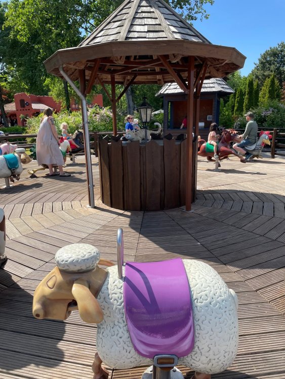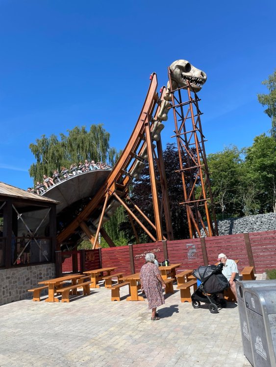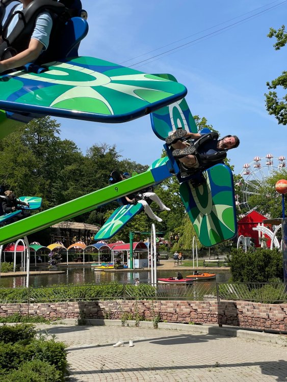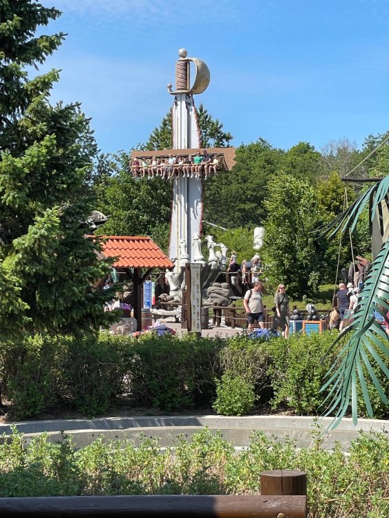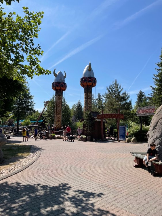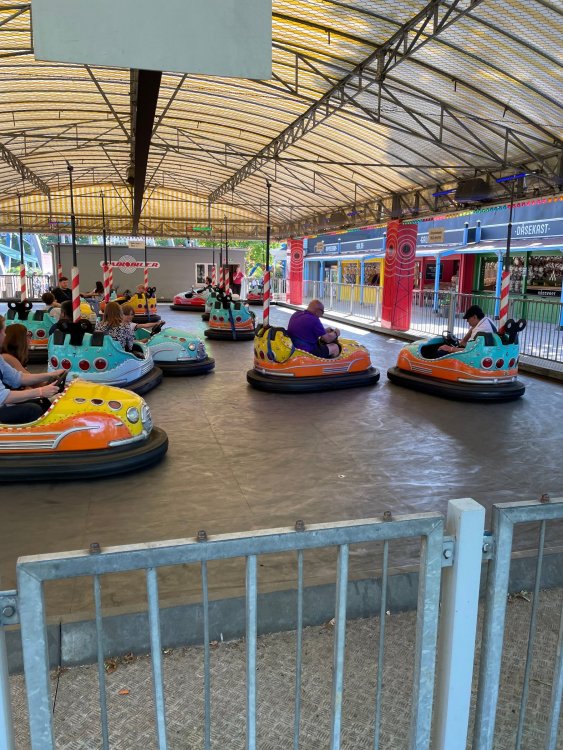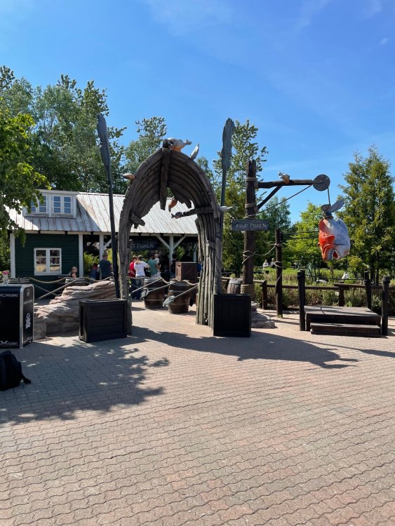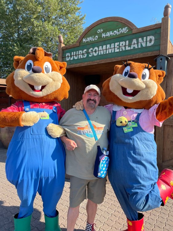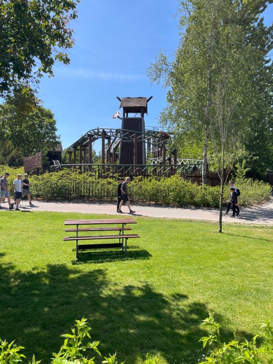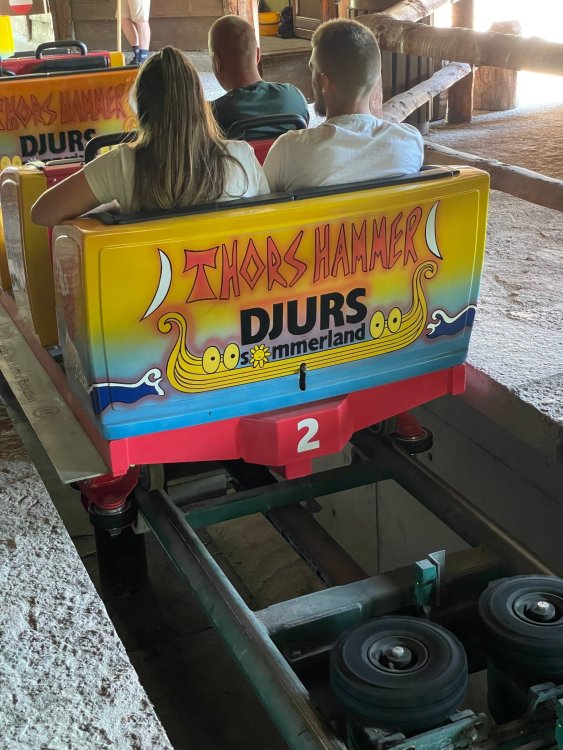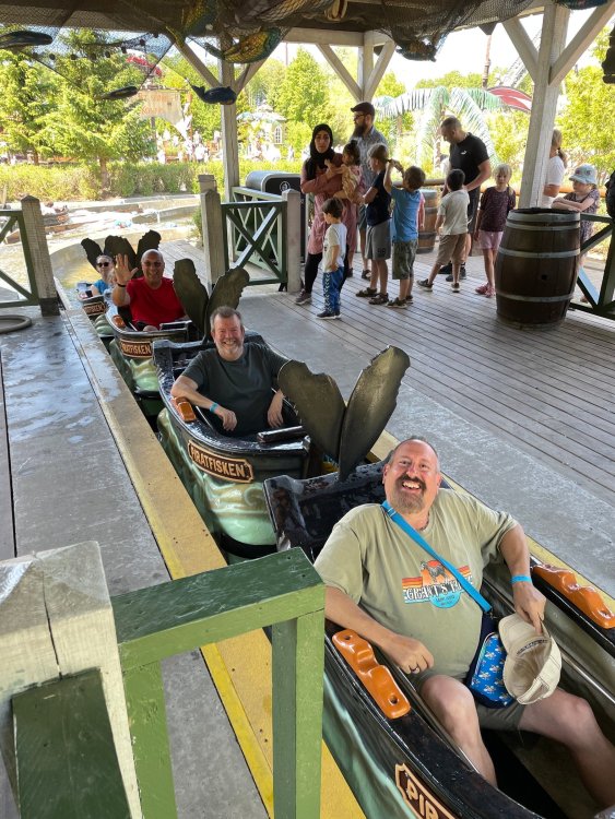 Day 8: Sat, June 10th part 2 (of 2): Djurs Sommerland we headed over to "Vikingeland" section of the park, for the next coaster on our hitlist: Thor's Hammer - a Gerstlauer Bobsled coaster some nice ride theming here, but this was one of the sections where the operators were wearing kahkis (I was hoping for heavy fur vests. . LOL) Don't forget. . Thor died on the cross for you. . . or something. .what do I know? I'm Jewish | as mentioned. . great theming thruout the park. . . even if the trains scream "traveling carnival" (and you can catch the bottom half of an operator's Viking Khakis in this pic) a really fun bobsled tho. . with some of it over the water - and thru a house! in the lake there on the left, one can go around the island in either a canoe or a paddle boat. it was hilarious, because they apparently just put the people in them and let them go - regardless if they know how to paddle (or steer). there was a canoe with four little kids in it, stuck on this turn here for a good 15 minutes as we watched them panic and try to paddle with their hands to move (someone finally came along in a boat and helped them) a self operating "pulley" ride that are "poles with helmets on them". . that's ALL they are. get your minds out of the gutter! here's the station where you can get either a canoe or paddleboat. Didier and I sat on a bench and watched as brave folks decided they wanted to paddle the lake. no shade, but I think David paddled for all. . . it wasn't quite time for lunch yet, so we passed back thru DinosaurLand (where lunch was to be) hence another pic of the Disc-O (the park also has a decent sized waterpark area called "VandLand". . but I'm not sure if any of the folks on the trip went to the waterpark here) and back into Westernland. .the theming on the outside of the Bumper Cars building I didn't actually look at them to see if the cars themselves were themed to Buffalo or not.. .but thought it was rather cool that the kiddie version is in the same building as the adult version. not a Bumper Cars rider. . but a Pony Espressen? Yes please! whee! the park also has a wave swinger called "Wild West Carousel". . . I don't typically ride these, but this one ran forwards, and then backwards, which looked like a unique ride experience (and it was). oh, it also shoots water up at you to try and get you wet. heading back for lunch, some I was with wanted to ride the Disc-O. these always make me a bit nauseous, and I certainly didn't want that right before lunch. .so I passed. tho managed to get pics of them on it. Can you tell which pic is before they noticed me with the phone up, and which is after? Lunch was a PACKED Pizza buffet. I recall it had some really weird stuff on it - such as corn pizza ?? but it certainly wasn't the worst pizza I had, and I recall enjoying it. the table I saw with. at first I thought I had misfiled this, as I don't recall them having one of these (at all). . but I see the dino in the background, so it must still be at Djurs Sommerland, and I just don't remember. this style of ride seems to have gotten popular tho, as I saw it at many parks in Scandinavia on this trip. Universal Denmark? after eating way too much pizza (as you can probably tell from the belly in this pic), needed something calming. So I suggested we ride the train. it's not a full size train like you'd see in USA.. but similar to a lot of the trains in the parks I'd been to in Europe. a lovely route, and gave a great view of the park. Thor's Hammer Juvelen Piraten playground full of ways to injure oneself. . . more playgrounds and trampolines. all really full too! Jonathan and David were eager to try out the King of the Mountain and made it up easily. I watched. oh. .there was plenty to look at. . . . while they attempted to make a hospital visit in a foreign country. . . yeah. . getting up was easy. do you want me to call the fire department to get down now? all played out, we headed into the "kiddie" area, which did have some adult rides. we were ready to ride: Vilde Hønsejagt (the wild chicken hunt) - another Zierer family coaster with lots of chicken theming. . and a fox at the front of the train trying to eat said chicken (I think?) hey. . TPR folks here too! Howdy! Pic courtesy of Didier I believe this was absolutely adorable. . a frog hopper, but themed to pigs in slop. I didn't ride it, but I really wanted to just to say I did I DID ride the classic carousel type ride tho (of course). . with Big Mike and Jonathan and I can't recall if we rode the tractors or not, but I think we did ride a couple of things over here in this section. a wet/dry slide. . . for some reason called Speedy Gonzales. . .hmmmmm. . there was a band playing music, that some folks were hanging out listening to. and we headed over to the one big section of the park we hadn't been in yet: Piratland this was a kiddie flume ride, Piratefisken, but it looked like there were adults riding with their kids, so got in line to ask. gaaa. . . lots of photo ops where you can get bitten here and a great view of Skatteøen (Treasure Island), the park's Mack Water Coaster from the kiddie flume queue the "boats" (or more realistically, barrels) are tiny, but after bonding with the operator over ABBA (I caught him singing along to "gimme gimme gimme" and joined in with him), he said OF COURSE you can ride, and let us each take a barrel. Said operator. . in a section that is participating in "full immersive costume" he he even let me hold his sword (get your mind out of the gutter!!) for a pic and them offered to take a pic of those of us who were riding before sending us on our way. . . whee!!! (pic courtesy of Andy, I think?) no. . I'm not embarrassed at all. . this was a fun flume! and got me a bit wet too. they also have this really weird "Sword ride over here called Sablen (the Saber) that's kind of a drop ride, but it also sways back and forth kinda like a topple tower. regardless, we got on it and it kinda broke, and we 