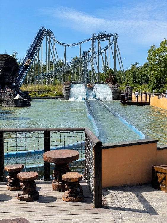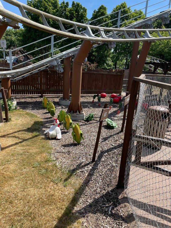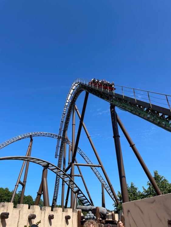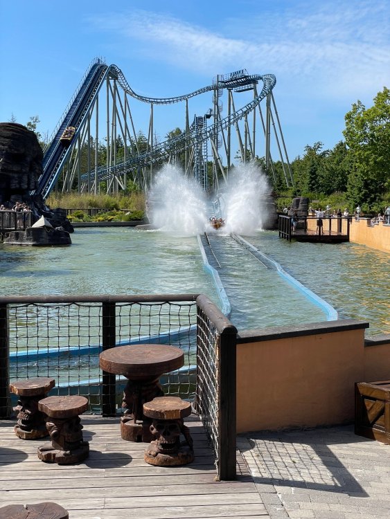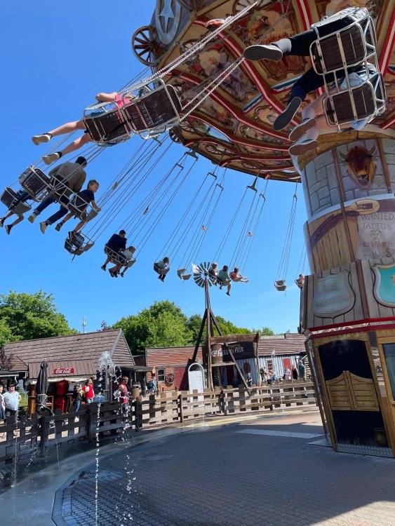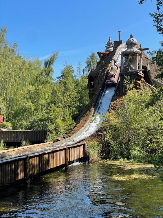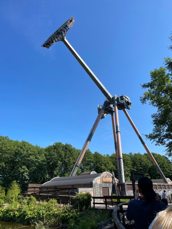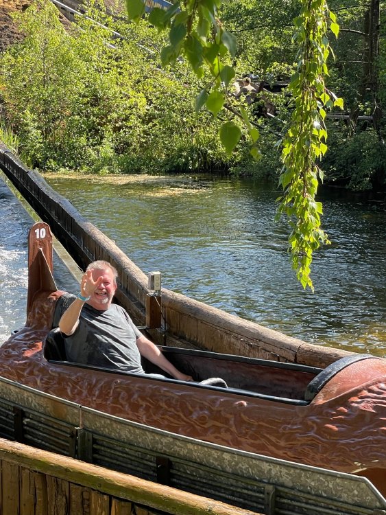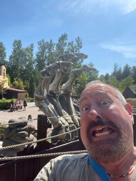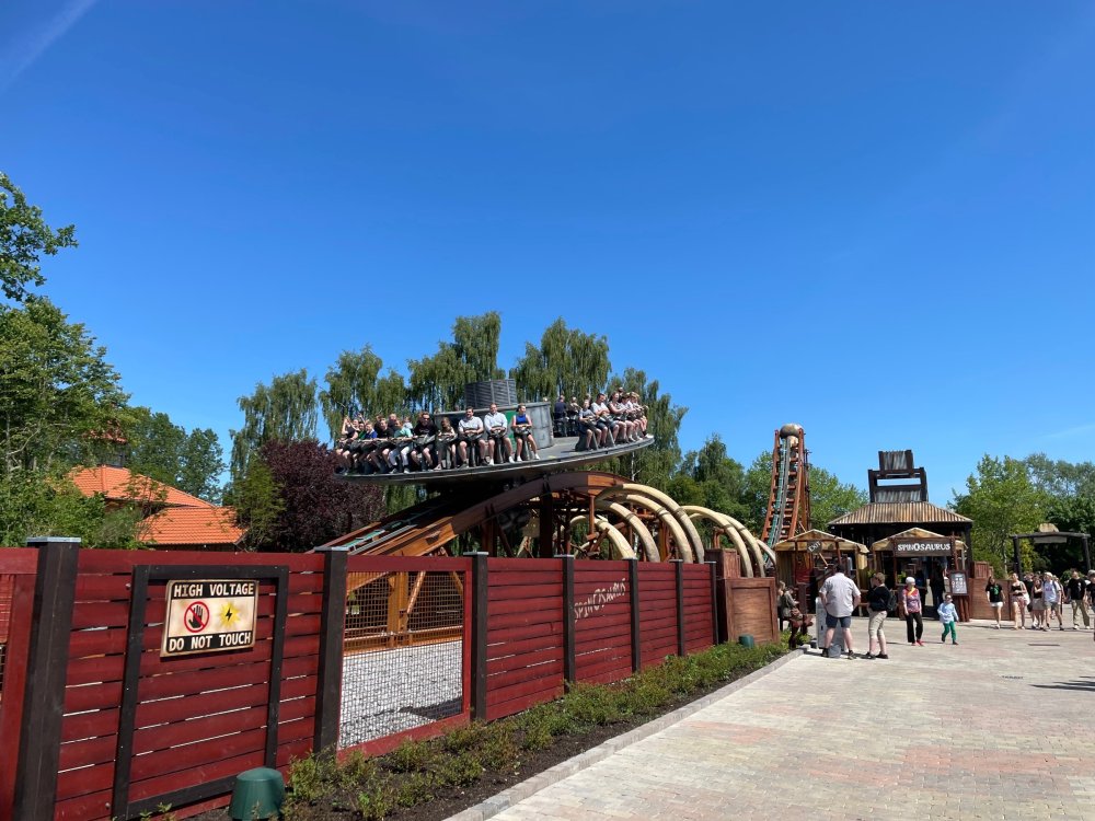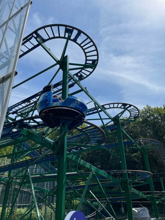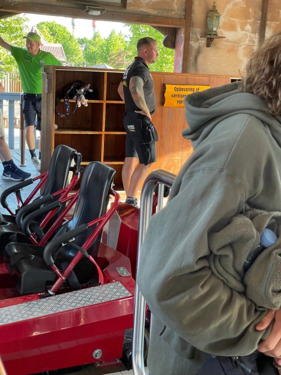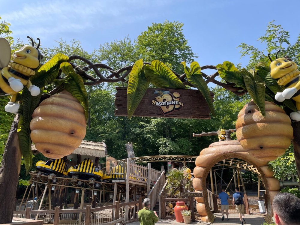 Day 8: Sat, June 10th part 2 (of 2): Djurs Sommerland we headed over to "Vikingeland" section of the park, for the next coaster on our hitlist: Thor's Hammer - a Gerstlauer Bobsled coaster some nice ride theming here, but this was one of the sections where the operators were wearing kahkis (I was hoping for heavy fur vests. . LOL) Don't forget. . Thor died on the cross for you. . . or something. .what do I know? I'm Jewish | as mentioned. . great theming thruout the park. . . even if the trains scream "traveling carnival" (and you can catch the bottom half of an operator's Viking Khakis in this pic) a really fun bobsled tho. . with some of it over the water - and thru a house! in the lake there on the left, one can go around the island in either a canoe or a paddle boat. it was hilarious, because they apparently just put the people in them and let them go - regardless if they know how to paddle (or steer). there was a canoe with four little kids in it, stuck on this turn here for a good 15 minutes as we watched them panic and try to paddle with their hands to move (someone finally came along in a boat and helped them) a self operating "pulley" ride that are "poles with helmets on them". . that's ALL they are. get your minds out of the gutter! here's the station where you can get either a canoe or paddleboat. Didier and I sat on a bench and watched as brave folks decided they wanted to paddle the lake. no shade, but I think David paddled for all. . . it wasn't quite time for lunch yet, so we passed back thru DinosaurLand (where lunch was to be) hence another pic of the Disc-O (the park also has a decent sized waterpark area called "VandLand". . but I'm not sure if any of the folks on the trip went to the waterpark here) and back into Westernland. .the theming on the outside of the Bumper Cars building I didn't actually look at them to see if the cars themselves were themed to Buffalo or not.. .but thought it was rather cool that the kiddie version is in the same building as the adult version. not a Bumper Cars rider. . but a Pony Espressen? Yes please! whee! the park also has a wave swinger called "Wild West Carousel". . . I don't typically ride these, but this one ran forwards, and then backwards, which looked like a unique ride experience (and it was). oh, it also shoots water up at you to try and get you wet. heading back for lunch, some I was with wanted to ride the Disc-O. these always make me a bit nauseous, and I certainly didn't want that right before lunch. .so I passed. tho managed to get pics of them on it. Can you tell which pic is before they noticed me with the phone up, and which is after? Lunch was a PACKED Pizza buffet. I recall it had some really weird stuff on it - such as corn pizza ?? but it certainly wasn't the worst pizza I had, and I recall enjoying it. the table I saw with. at first I thought I had misfiled this, as I don't recall them having one of these (at all). . but I see the dino in the background, so it must still be at Djurs Sommerland, and I just don't remember. this style of ride seems to have gotten popular tho, as I saw it at many parks in Scandinavia on this trip. Universal Denmark? after eating way too much pizza (as you can probably tell from the belly in this pic), needed something calming. So I suggested we ride the train. it's not a full size train like you'd see in USA.. but similar to a lot of the trains in the parks I'd been to in Europe. a lovely route, and gave a great view of the park. Thor's Hammer Juvelen Piraten playground full of ways to injure oneself. . . more playgrounds and trampolines. all really full too! Jonathan and David were eager to try out the King of the Mountain and made it up easily. I watched. oh. .there was plenty to look at. . . . while they attempted to make a hospital visit in a foreign country. . . yeah. . getting up was easy. do you want me to call the fire department to get down now? all played out, we headed into the "kiddie" area, which did have some adult rides. we were ready to ride: Vilde Hønsejagt (the wild chicken hunt) - another Zierer family coaster with lots of chicken theming. . and a fox at the front of the train trying to eat said chicken (I think?) hey. . TPR folks here too! Howdy! Pic courtesy of Didier I believe this was absolutely adorable. . a frog hopper, but themed to pigs in slop. I didn't ride it, but I really wanted to just to say I did I DID ride the classic carousel type ride tho (of course). . with Big Mike and Jonathan and I can't recall if we rode the tractors or not, but I think we did ride a couple of things over here in this section. a wet/dry slide. . . for some reason called Speedy Gonzales. . .hmmmmm. . there was a band playing music, that some folks were hanging out listening to. and we headed over to the one big section of the park we hadn't been in yet: Piratland this was a kiddie flume ride, Piratefisken, but it looked like there were adults riding with their kids, so got in line to ask. gaaa. . . lots of photo ops where you can get bitten here and a great view of Skatteøen (Treasure Island), the park's Mack Water Coaster from the kiddie flume queue the "boats" (or more realistically, barrels) are tiny, but after bonding with the operator over ABBA (I caught him singing along to "gimme gimme gimme" and joined in with him), he said OF COURSE you can ride, and let us each take a barrel. Said operator. . in a section that is participating in "full immersive costume" he he even let me hold his sword (get your mind out of the gutter!!) for a pic and them offered to take a pic of those of us who were riding before sending us on our way. . . whee!!! (pic courtesy of Andy, I think?) no. . I'm not embarrassed at all. . this was a fun flume! and got me a bit wet too. they also have this really weird "Sword ride over here called Sablen (the Saber) that's kind of a drop ride, but it also sways back and forth kinda like a topple tower. regardless, we got on it and it kinda broke, and we 