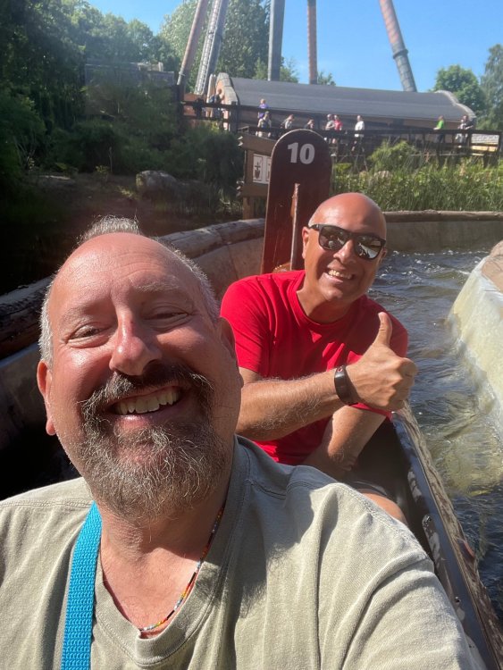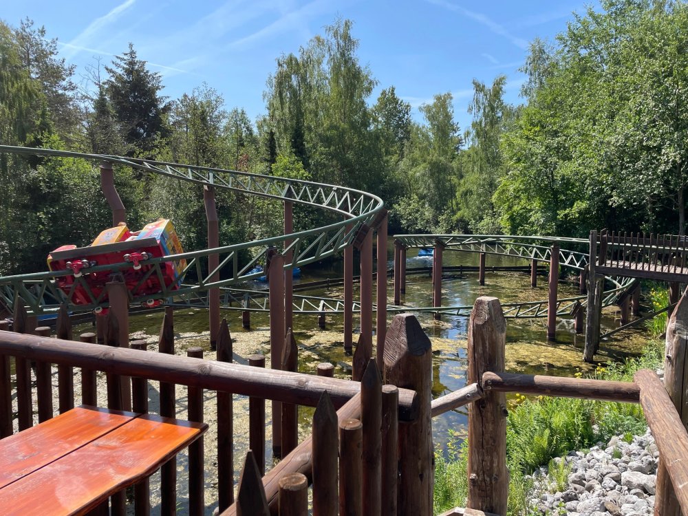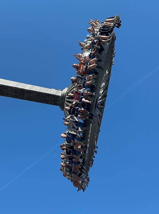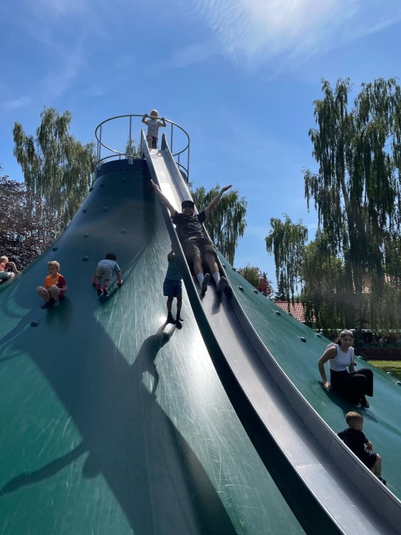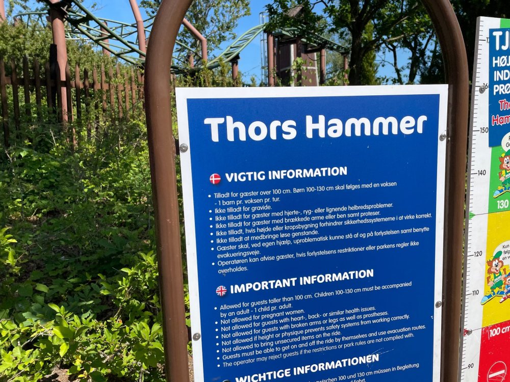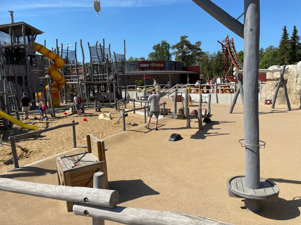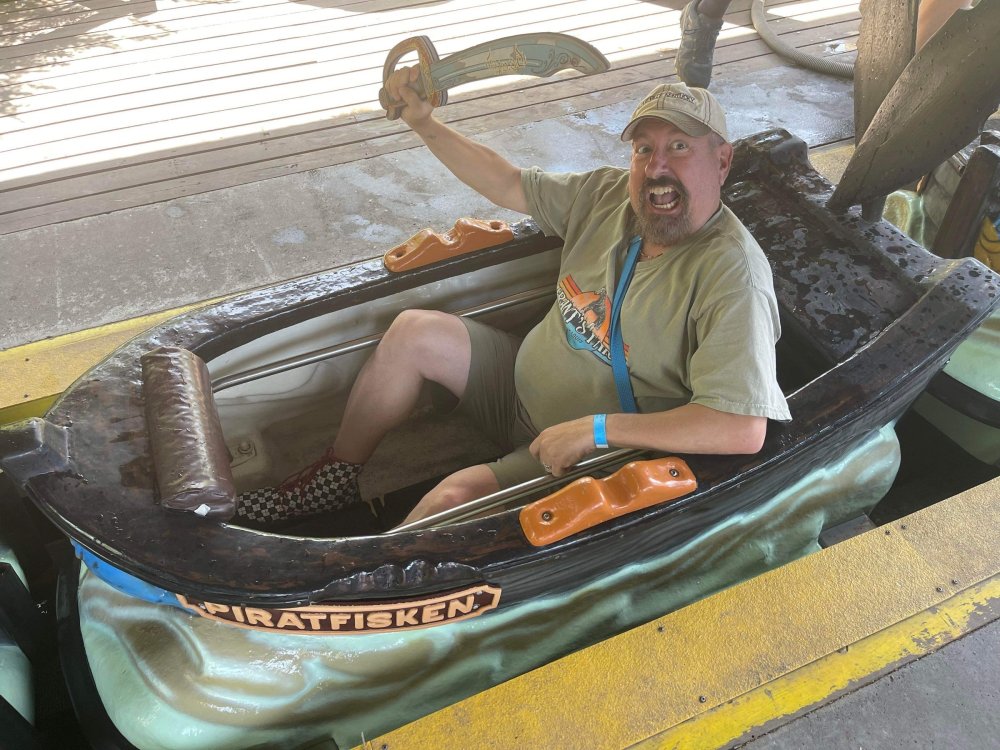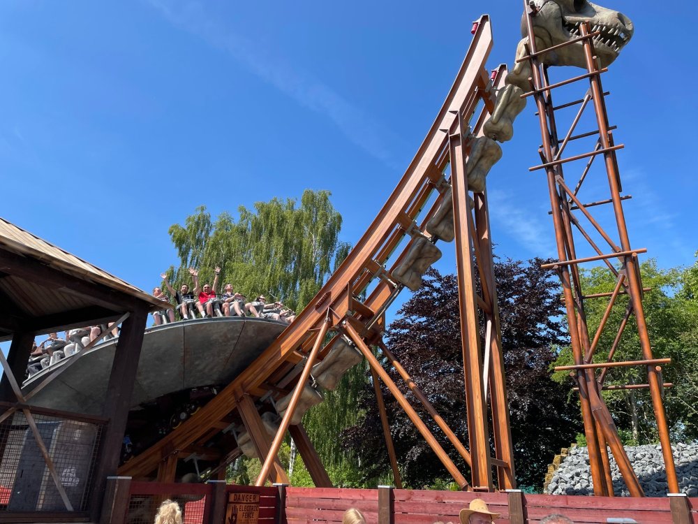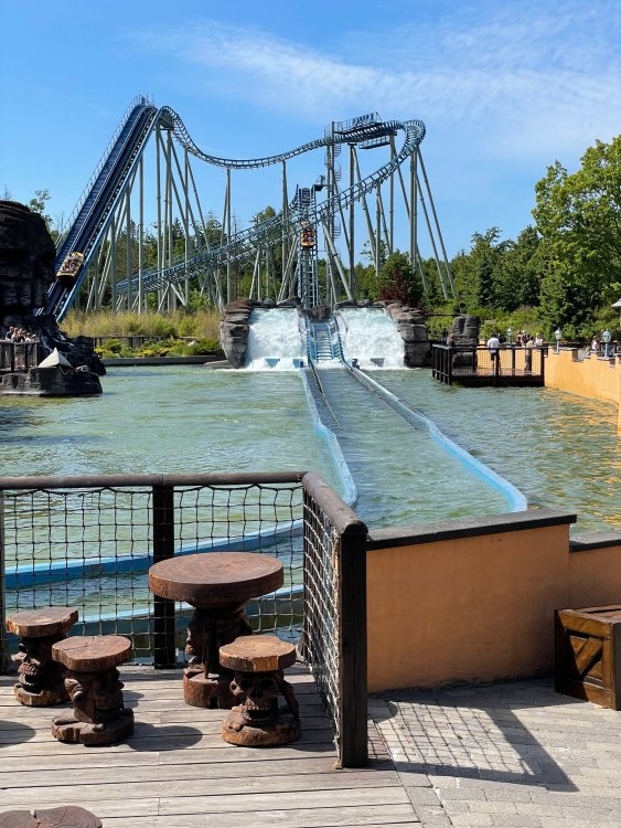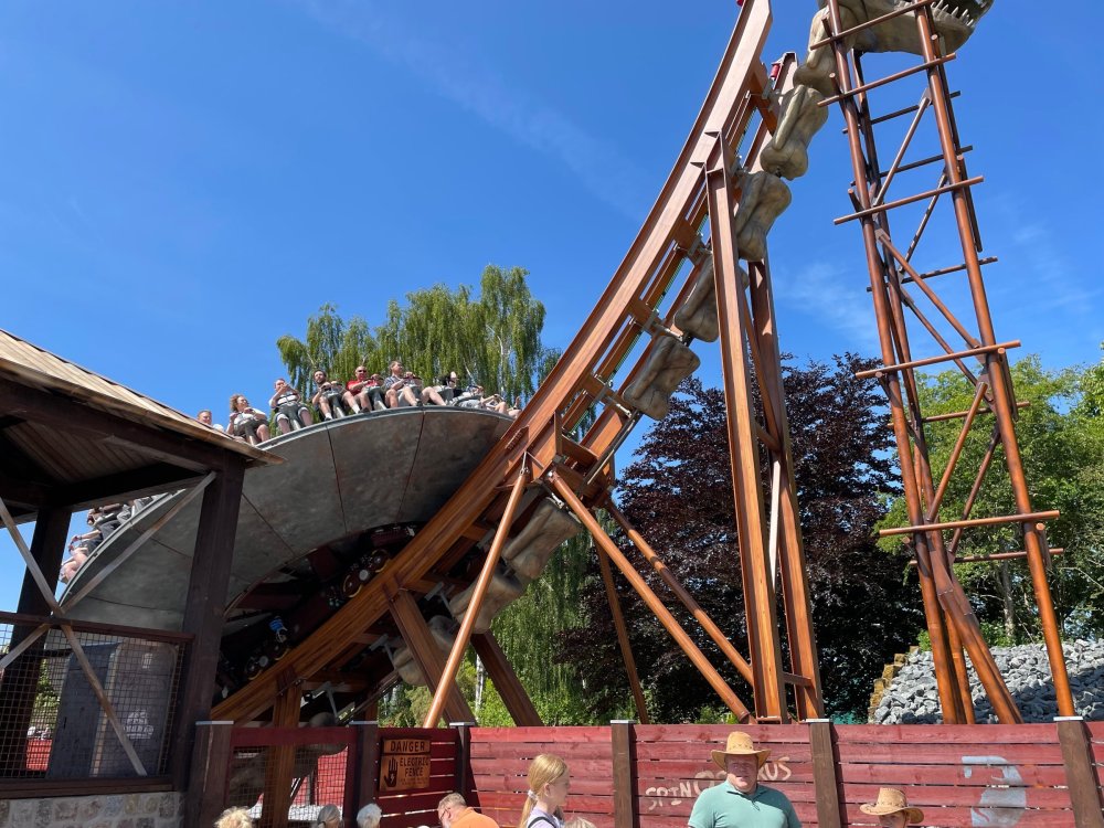 Day 8: Sat, June 10th part 2 (of 2): Djurs Sommerland we headed over to "Vikingeland" section of the park, for the next coaster on our hitlist: Thor's Hammer - a Gerstlauer Bobsled coaster some nice ride theming here, but this was one of the sections where the operators were wearing kahkis (I was hoping for heavy fur vests. . LOL) Don't forget. . Thor died on the cross for you. . . or something. .what do I know? I'm Jewish | as mentioned. . great theming thruout the park. . . even if the trains scream "traveling carnival" (and you can catch the bottom half of an operator's Viking Khakis in this pic) a really fun bobsled tho. . with some of it over the water - and thru a house! in the lake there on the left, one can go around the island in either a canoe or a paddle boat. it was hilarious, because they apparently just put the people in them and let them go - regardless if they know how to paddle (or steer). there was a canoe with four little kids in it, stuck on this turn here for a good 15 minutes as we watched them panic and try to paddle with their hands to move (someone finally came along in a boat and helped them) a self operating "pulley" ride that are "poles with helmets on them". . that's ALL they are. get your minds out of the gutter! here's the station where you can get either a canoe or paddleboat. Didier and I sat on a bench and watched as brave folks decided they wanted to paddle the lake. no shade, but I think David paddled for all. . . it wasn't quite time for lunch yet, so we passed back thru DinosaurLand (where lunch was to be) hence another pic of the Disc-O (the park also has a decent sized waterpark area called "VandLand". . but I'm not sure if any of the folks on the trip went to the waterpark here) and back into Westernland. .the theming on the outside of the Bumper Cars building I didn't actually look at them to see if the cars themselves were themed to Buffalo or not.. .but thought it was rather cool that the kiddie version is in the same building as the adult version. not a Bumper Cars rider. . but a Pony Espressen? Yes please! whee! the park also has a wave swinger called "Wild West Carousel". . . I don't typically ride these, but this one ran forwards, and then backwards, which looked like a unique ride experience (and it was). oh, it also shoots water up at you to try and get you wet. heading back for lunch, some I was with wanted to ride the Disc-O. these always make me a bit nauseous, and I certainly didn't want that right before lunch. .so I passed. tho managed to get pics of them on it. Can you tell which pic is before they noticed me with the phone up, and which is after? Lunch was a PACKED Pizza buffet. I recall it had some really weird stuff on it - such as corn pizza ?? but it certainly wasn't the worst pizza I had, and I recall enjoying it. the table I saw with. at first I thought I had misfiled this, as I don't recall them having one of these (at all). . but I see the dino in the background, so it must still be at Djurs Sommerland, and I just don't remember. this style of ride seems to have gotten popular tho, as I saw it at many parks in Scandinavia on this trip. Universal Denmark? after eating way too much pizza (as you can probably tell from the belly in this pic), needed something calming. So I suggested we ride the train. it's not a full size train like you'd see in USA.. but similar to a lot of the trains in the parks I'd been to in Europe. a lovely route, and gave a great view of the park. Thor's Hammer Juvelen Piraten playground full of ways to injure oneself. . . more playgrounds and trampolines. all really full too! Jonathan and David were eager to try out the King of the Mountain and made it up easily. I watched. oh. .there was plenty to look at. . . . while they attempted to make a hospital visit in a foreign country. . . yeah. . getting up was easy. do you want me to call the fire department to get down now? all played out, we headed into the "kiddie" area, which did have some adult rides. we were ready to ride: Vilde Hønsejagt (the wild chicken hunt) - another Zierer family coaster with lots of chicken theming. . and a fox at the front of the train trying to eat said chicken (I think?) hey. . TPR folks here too! Howdy! Pic courtesy of Didier I believe this was absolutely adorable. . a frog hopper, but themed to pigs in slop. I didn't ride it, but I really wanted to just to say I did I DID ride the classic carousel type ride tho (of course). . with Big Mike and Jonathan and I can't recall if we rode the tractors or not, but I think we did ride a couple of things over here in this section. a wet/dry slide. . . for some reason called Speedy Gonzales. . .hmmmmm. . there was a band playing music, that some folks were hanging out listening to. and we headed over to the one big section of the park we hadn't been in yet: Piratland this was a kiddie flume ride, Piratefisken, but it looked like there were adults riding with their kids, so got in line to ask. gaaa. . . lots of photo ops where you can get bitten here and a great view of Skatteøen (Treasure Island), the park's Mack Water Coaster from the kiddie flume queue the "boats" (or more realistically, barrels) are tiny, but after bonding with the operator over ABBA (I caught him singing along to "gimme gimme gimme" and joined in with him), he said OF COURSE you can ride, and let us each take a barrel. Said operator. . in a section that is participating in "full immersive costume" he he even let me hold his sword (get your mind out of the gutter!!) for a pic and them offered to take a pic of those of us who were riding before sending us on our way. . . whee!!! (pic courtesy of Andy, I think?) no. . I'm not embarrassed at all. . this was a fun flume! and got me a bit wet too. they also have this really weird "Sword ride over here called Sablen (the Saber) that's kind of a drop ride, but it also sways back and forth kinda like a topple tower. regardless, we got on it and it kinda broke, and we 