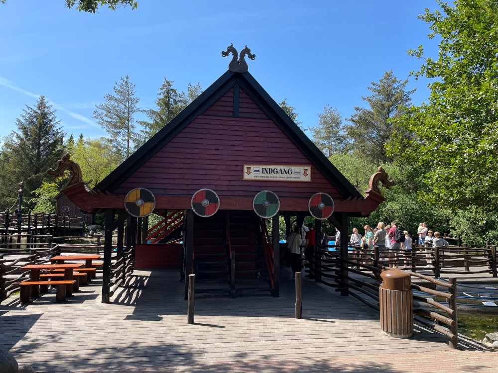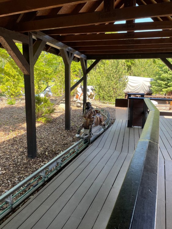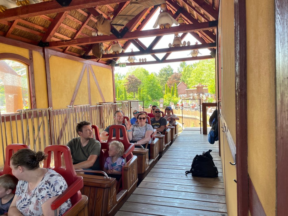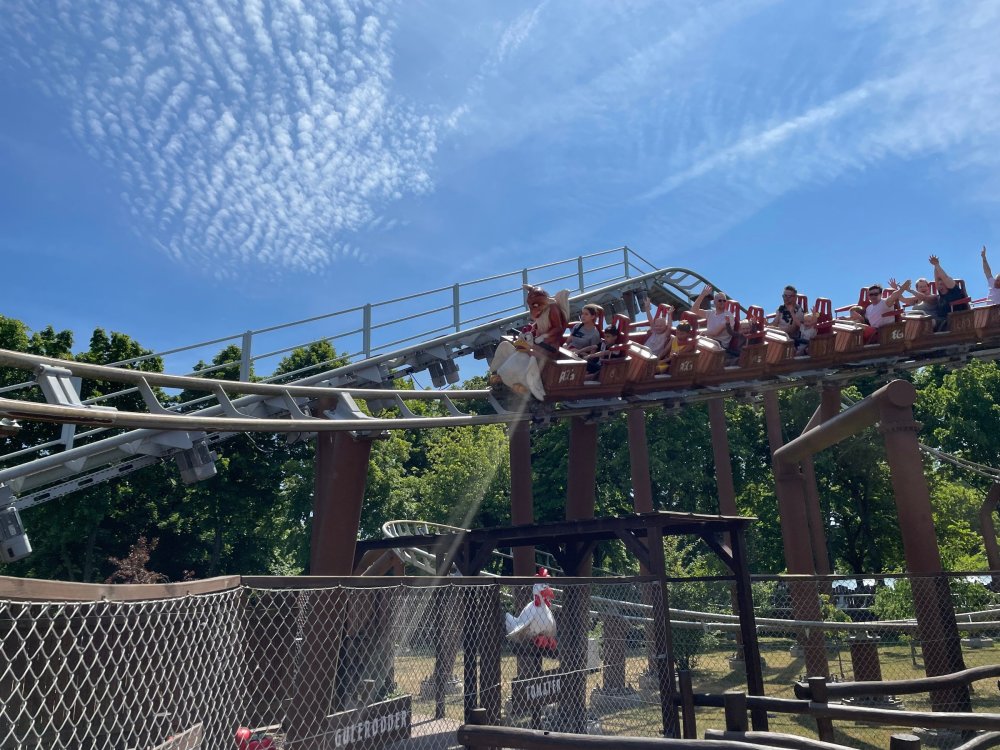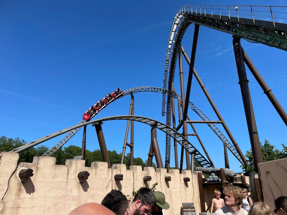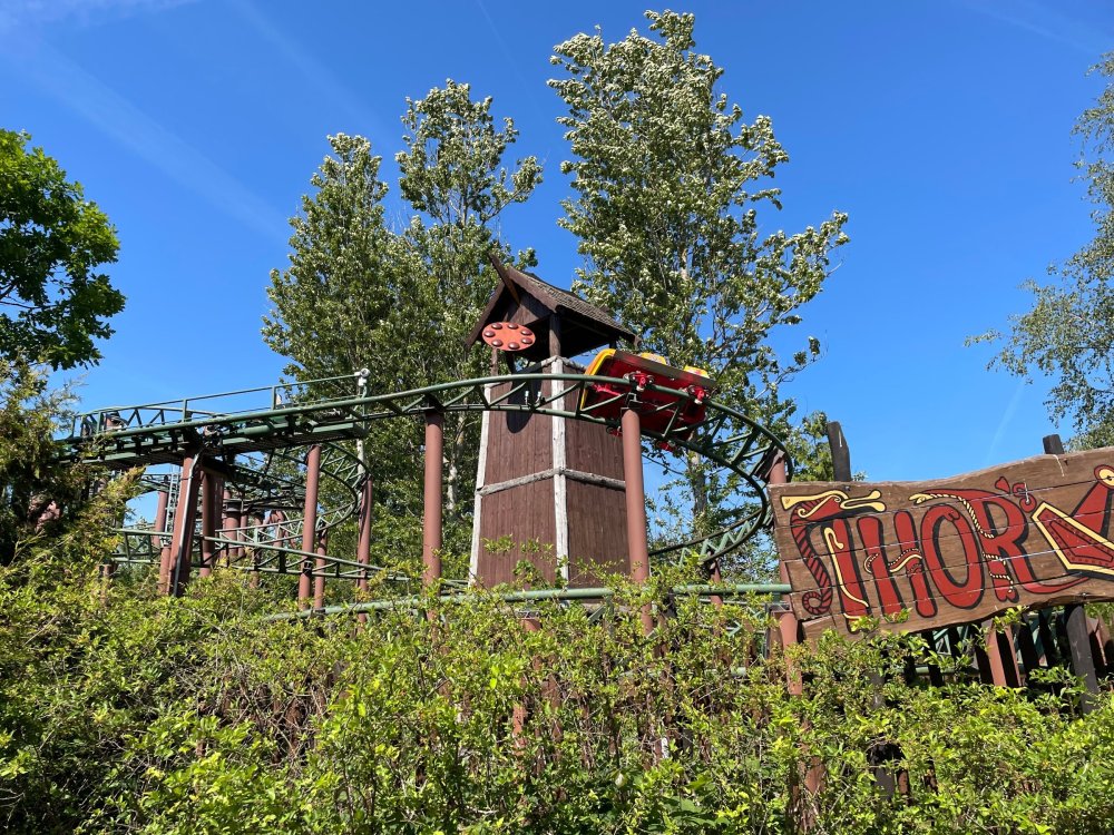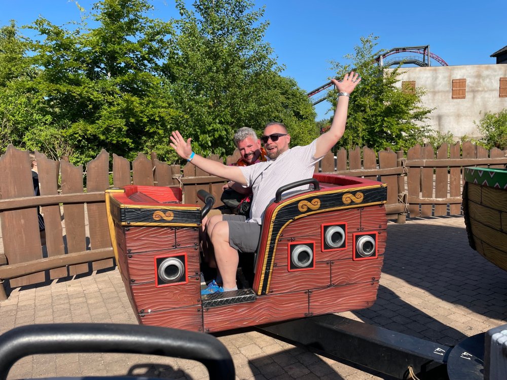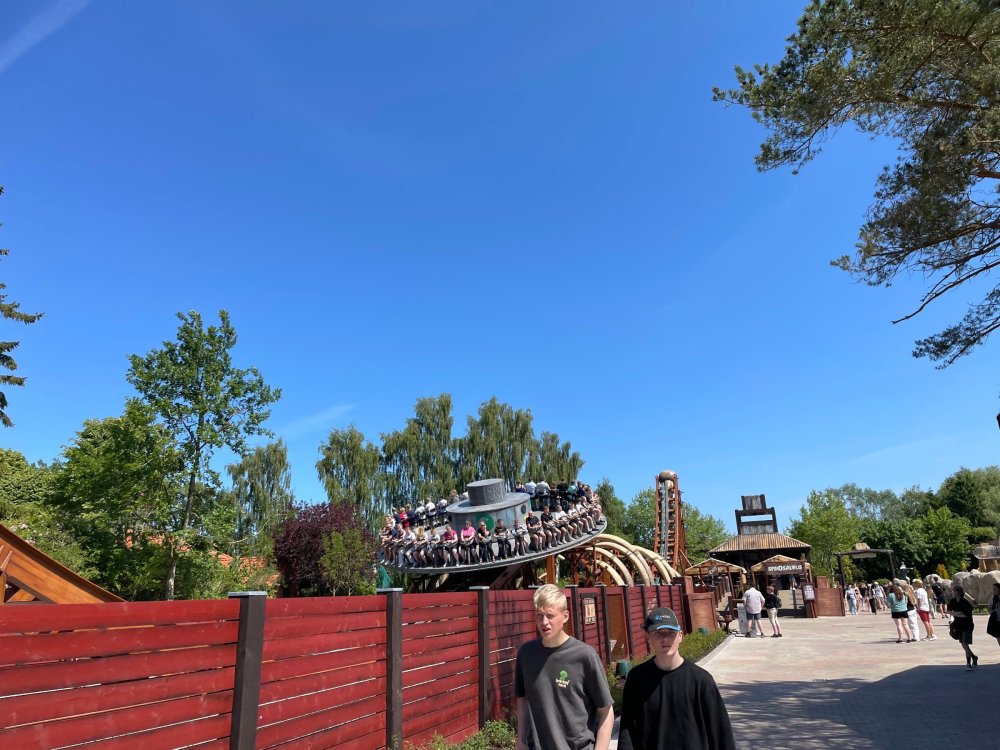 Day 8: Sat, June 10th part 2 (of 2): Djurs Sommerland we headed over to "Vikingeland" section of the park, for the next coaster on our hitlist: Thor's Hammer - a Gerstlauer Bobsled coaster some nice ride theming here, but this was one of the sections where the operators were wearing kahkis (I was hoping for heavy fur vests. . LOL) Don't forget. . Thor died on the cross for you. . . or something. .what do I know? I'm Jewish | as mentioned. . great theming thruout the park. . . even if the trains scream "traveling carnival" (and you can catch the bottom half of an operator's Viking Khakis in this pic) a really fun bobsled tho. . with some of it over the water - and thru a house! in the lake there on the left, one can go around the island in either a canoe or a paddle boat. it was hilarious, because they apparently just put the people in them and let them go - regardless if they know how to paddle (or steer). there was a canoe with four little kids in it, stuck on this turn here for a good 15 minutes as we watched them panic and try to paddle with their hands to move (someone finally came along in a boat and helped them) a self operating "pulley" ride that are "poles with helmets on them". . that's ALL they are. get your minds out of the gutter! here's the station where you can get either a canoe or paddleboat. Didier and I sat on a bench and watched as brave folks decided they wanted to paddle the lake. no shade, but I think David paddled for all. . . it wasn't quite time for lunch yet, so we passed back thru DinosaurLand (where lunch was to be) hence another pic of the Disc-O (the park also has a decent sized waterpark area called "VandLand". . but I'm not sure if any of the folks on the trip went to the waterpark here) and back into Westernland. .the theming on the outside of the Bumper Cars building I didn't actually look at them to see if the cars themselves were themed to Buffalo or not.. .but thought it was rather cool that the kiddie version is in the same building as the adult version. not a Bumper Cars rider. . but a Pony Espressen? Yes please! whee! the park also has a wave swinger called "Wild West Carousel". . . I don't typically ride these, but this one ran forwards, and then backwards, which looked like a unique ride experience (and it was). oh, it also shoots water up at you to try and get you wet. heading back for lunch, some I was with wanted to ride the Disc-O. these always make me a bit nauseous, and I certainly didn't want that right before lunch. .so I passed. tho managed to get pics of them on it. Can you tell which pic is before they noticed me with the phone up, and which is after? Lunch was a PACKED Pizza buffet. I recall it had some really weird stuff on it - such as corn pizza ?? but it certainly wasn't the worst pizza I had, and I recall enjoying it. the table I saw with. at first I thought I had misfiled this, as I don't recall them having one of these (at all). . but I see the dino in the background, so it must still be at Djurs Sommerland, and I just don't remember. this style of ride seems to have gotten popular tho, as I saw it at many parks in Scandinavia on this trip. Universal Denmark? after eating way too much pizza (as you can probably tell from the belly in this pic), needed something calming. So I suggested we ride the train. it's not a full size train like you'd see in USA.. but similar to a lot of the trains in the parks I'd been to in Europe. a lovely route, and gave a great view of the park. Thor's Hammer Juvelen Piraten playground full of ways to injure oneself. . . more playgrounds and trampolines. all really full too! Jonathan and David were eager to try out the King of the Mountain and made it up easily. I watched. oh. .there was plenty to look at. . . . while they attempted to make a hospital visit in a foreign country. . . yeah. . getting up was easy. do you want me to call the fire department to get down now? all played out, we headed into the "kiddie" area, which did have some adult rides. we were ready to ride: Vilde Hønsejagt (the wild chicken hunt) - another Zierer family coaster with lots of chicken theming. . and a fox at the front of the train trying to eat said chicken (I think?) hey. . TPR folks here too! Howdy! Pic courtesy of Didier I believe this was absolutely adorable. . a frog hopper, but themed to pigs in slop. I didn't ride it, but I really wanted to just to say I did I DID ride the classic carousel type ride tho (of course). . with Big Mike and Jonathan and I can't recall if we rode the tractors or not, but I think we did ride a couple of things over here in this section. a wet/dry slide. . . for some reason called Speedy Gonzales. . .hmmmmm. . there was a band playing music, that some folks were hanging out listening to. and we headed over to the one big section of the park we hadn't been in yet: Piratland this was a kiddie flume ride, Piratefisken, but it looked like there were adults riding with their kids, so got in line to ask. gaaa. . . lots of photo ops where you can get bitten here and a great view of Skatteøen (Treasure Island), the park's Mack Water Coaster from the kiddie flume queue the "boats" (or more realistically, barrels) are tiny, but after bonding with the operator over ABBA (I caught him singing along to "gimme gimme gimme" and joined in with him), he said OF COURSE you can ride, and let us each take a barrel. Said operator. . in a section that is participating in "full immersive costume" he he even let me hold his sword (get your mind out of the gutter!!) for a pic and them offered to take a pic of those of us who were riding before sending us on our way. . . whee!!! (pic courtesy of Andy, I think?) no. . I'm not embarrassed at all. . this was a fun flume! and got me a bit wet too. they also have this really weird "Sword ride over here called Sablen (the Saber) that's kind of a drop ride, but it also sways back and forth kinda like a topple tower. regardless, we got on it and it kinda broke, and we 