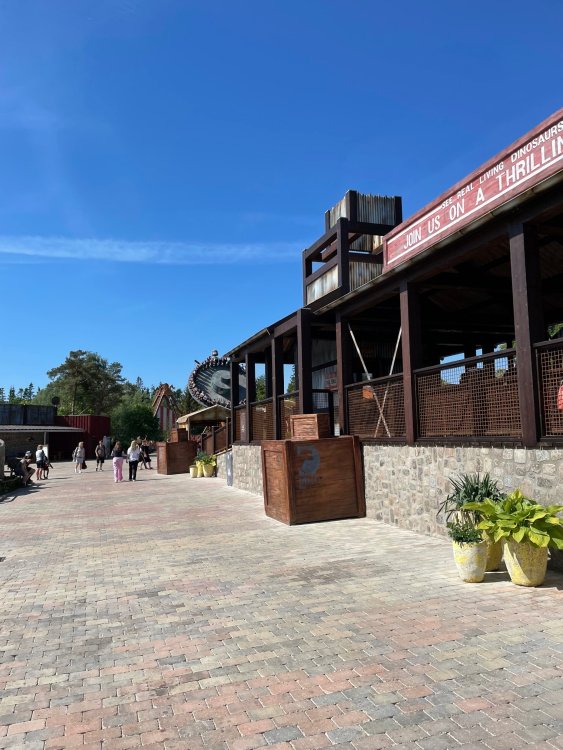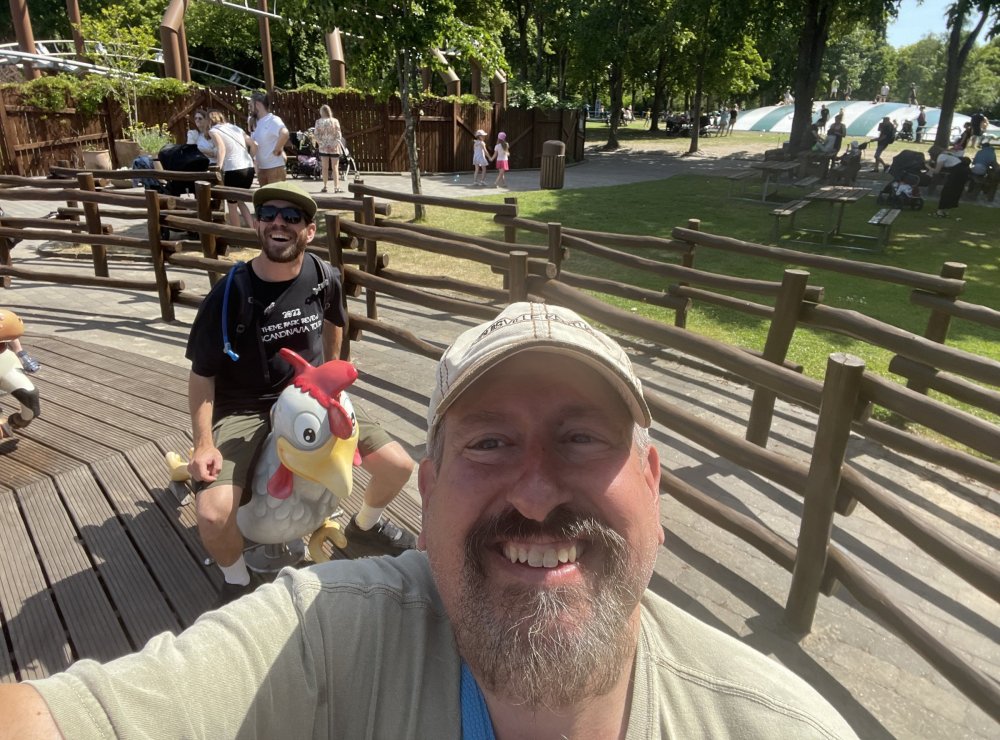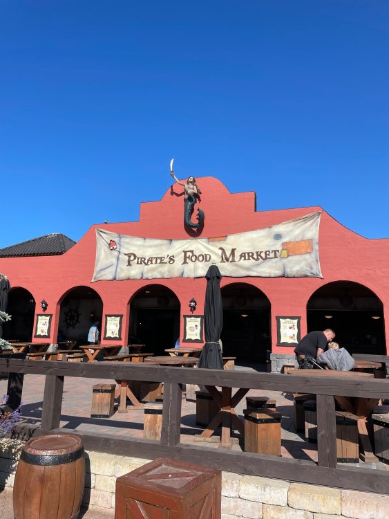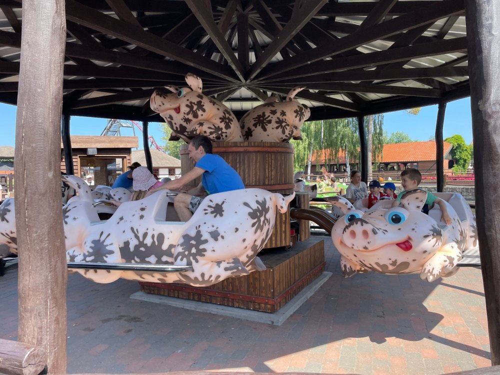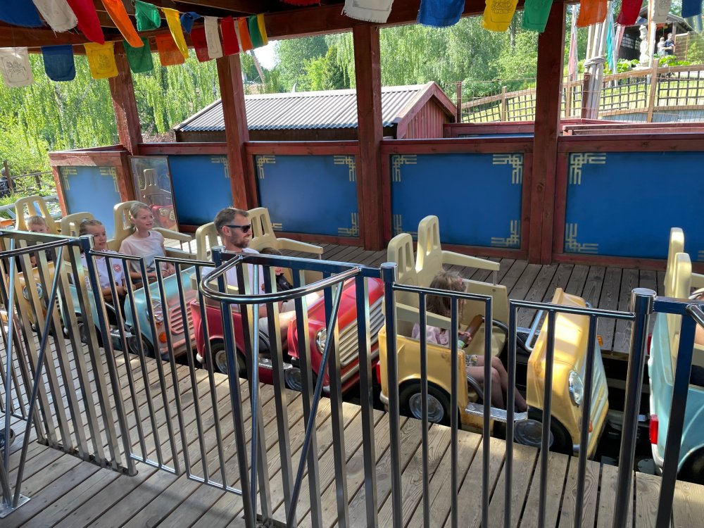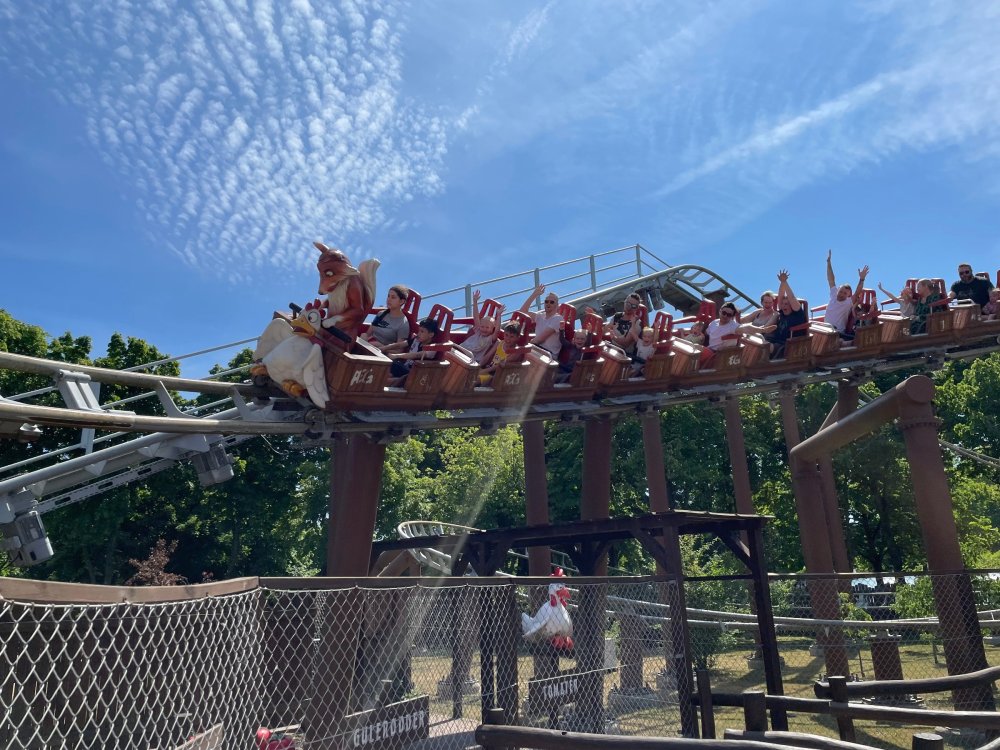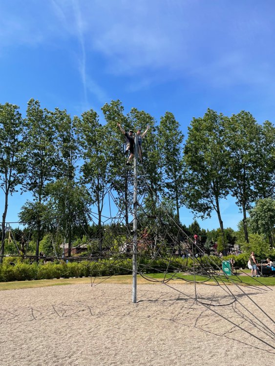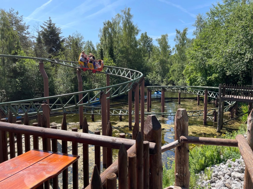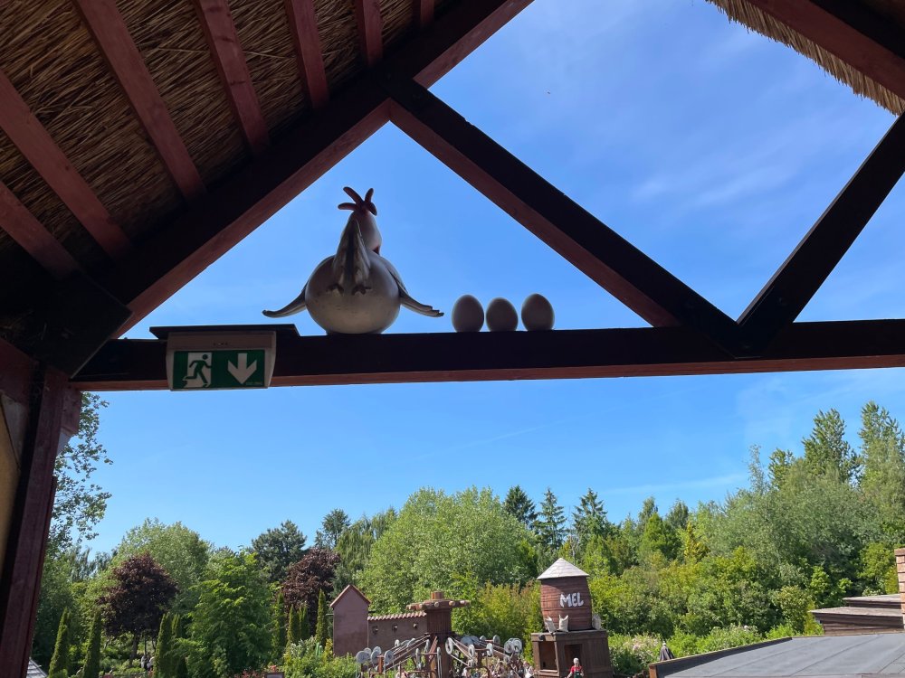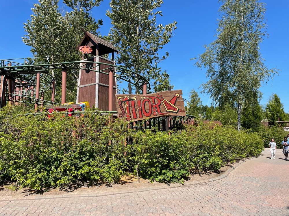 Day 8: Sat, June 10th part 2 (of 2): Djurs Sommerland we headed over to "Vikingeland" section of the park, for the next coaster on our hitlist: Thor's Hammer - a Gerstlauer Bobsled coaster some nice ride theming here, but this was one of the sections where the operators were wearing kahkis (I was hoping for heavy fur vests. . LOL) Don't forget. . Thor died on the cross for you. . . or something. .what do I know? I'm Jewish | as mentioned. . great theming thruout the park. . . even if the trains scream "traveling carnival" (and you can catch the bottom half of an operator's Viking Khakis in this pic) a really fun bobsled tho. . with some of it over the water - and thru a house! in the lake there on the left, one can go around the island in either a canoe or a paddle boat. it was hilarious, because they apparently just put the people in them and let them go - regardless if they know how to paddle (or steer). there was a canoe with four little kids in it, stuck on this turn here for a good 15 minutes as we watched them panic and try to paddle with their hands to move (someone finally came along in a boat and helped them) a self operating "pulley" ride that are "poles with helmets on them". . that's ALL they are. get your minds out of the gutter! here's the station where you can get either a canoe or paddleboat. Didier and I sat on a bench and watched as brave folks decided they wanted to paddle the lake. no shade, but I think David paddled for all. . . it wasn't quite time for lunch yet, so we passed back thru DinosaurLand (where lunch was to be) hence another pic of the Disc-O (the park also has a decent sized waterpark area called "VandLand". . but I'm not sure if any of the folks on the trip went to the waterpark here) and back into Westernland. .the theming on the outside of the Bumper Cars building I didn't actually look at them to see if the cars themselves were themed to Buffalo or not.. .but thought it was rather cool that the kiddie version is in the same building as the adult version. not a Bumper Cars rider. . but a Pony Espressen? Yes please! whee! the park also has a wave swinger called "Wild West Carousel". . . I don't typically ride these, but this one ran forwards, and then backwards, which looked like a unique ride experience (and it was). oh, it also shoots water up at you to try and get you wet. heading back for lunch, some I was with wanted to ride the Disc-O. these always make me a bit nauseous, and I certainly didn't want that right before lunch. .so I passed. tho managed to get pics of them on it. Can you tell which pic is before they noticed me with the phone up, and which is after? Lunch was a PACKED Pizza buffet. I recall it had some really weird stuff on it - such as corn pizza ?? but it certainly wasn't the worst pizza I had, and I recall enjoying it. the table I saw with. at first I thought I had misfiled this, as I don't recall them having one of these (at all). . but I see the dino in the background, so it must still be at Djurs Sommerland, and I just don't remember. this style of ride seems to have gotten popular tho, as I saw it at many parks in Scandinavia on this trip. Universal Denmark? after eating way too much pizza (as you can probably tell from the belly in this pic), needed something calming. So I suggested we ride the train. it's not a full size train like you'd see in USA.. but similar to a lot of the trains in the parks I'd been to in Europe. a lovely route, and gave a great view of the park. Thor's Hammer Juvelen Piraten playground full of ways to injure oneself. . . more playgrounds and trampolines. all really full too! Jonathan and David were eager to try out the King of the Mountain and made it up easily. I watched. oh. .there was plenty to look at. . . . while they attempted to make a hospital visit in a foreign country. . . yeah. . getting up was easy. do you want me to call the fire department to get down now? all played out, we headed into the "kiddie" area, which did have some adult rides. we were ready to ride: Vilde Hønsejagt (the wild chicken hunt) - another Zierer family coaster with lots of chicken theming. . and a fox at the front of the train trying to eat said chicken (I think?) hey. . TPR folks here too! Howdy! Pic courtesy of Didier I believe this was absolutely adorable. . a frog hopper, but themed to pigs in slop. I didn't ride it, but I really wanted to just to say I did I DID ride the classic carousel type ride tho (of course). . with Big Mike and Jonathan and I can't recall if we rode the tractors or not, but I think we did ride a couple of things over here in this section. a wet/dry slide. . . for some reason called Speedy Gonzales. . .hmmmmm. . there was a band playing music, that some folks were hanging out listening to. and we headed over to the one big section of the park we hadn't been in yet: Piratland this was a kiddie flume ride, Piratefisken, but it looked like there were adults riding with their kids, so got in line to ask. gaaa. . . lots of photo ops where you can get bitten here and a great view of Skatteøen (Treasure Island), the park's Mack Water Coaster from the kiddie flume queue the "boats" (or more realistically, barrels) are tiny, but after bonding with the operator over ABBA (I caught him singing along to "gimme gimme gimme" and joined in with him), he said OF COURSE you can ride, and let us each take a barrel. Said operator. . in a section that is participating in "full immersive costume" he he even let me hold his sword (get your mind out of the gutter!!) for a pic and them offered to take a pic of those of us who were riding before sending us on our way. . . whee!!! (pic courtesy of Andy, I think?) no. . I'm not embarrassed at all. . this was a fun flume! and got me a bit wet too. they also have this really weird "Sword ride over here called Sablen (the Saber) that's kind of a drop ride, but it also sways back and forth kinda like a topple tower. regardless, we got on it and it kinda broke, and we 