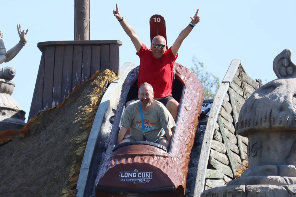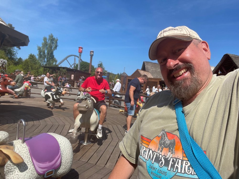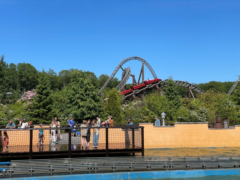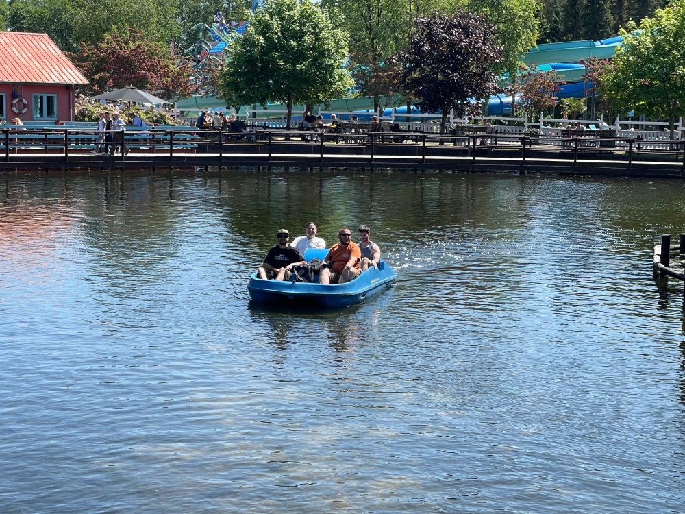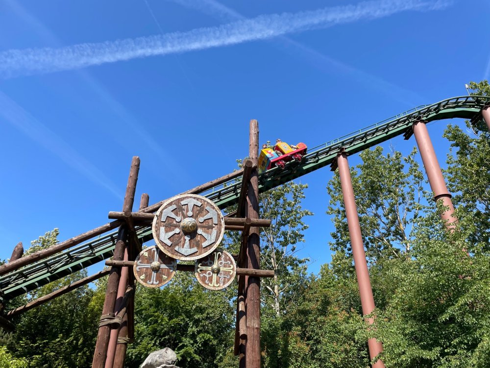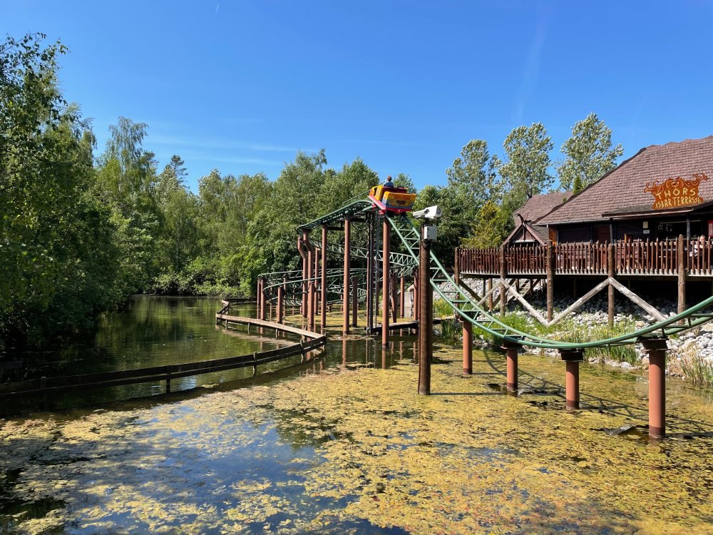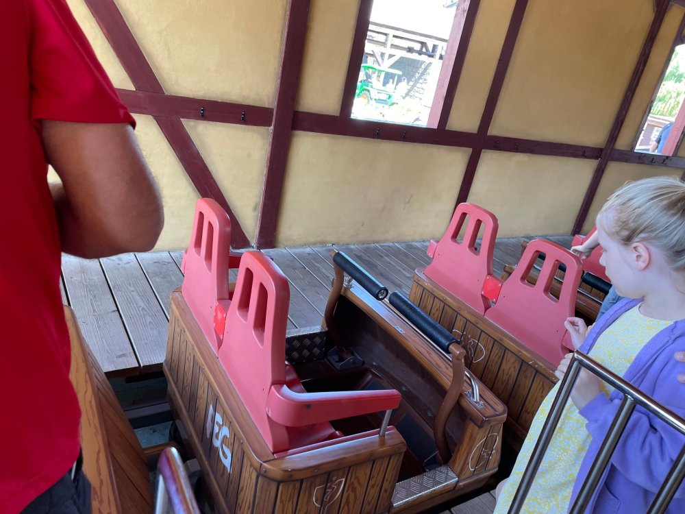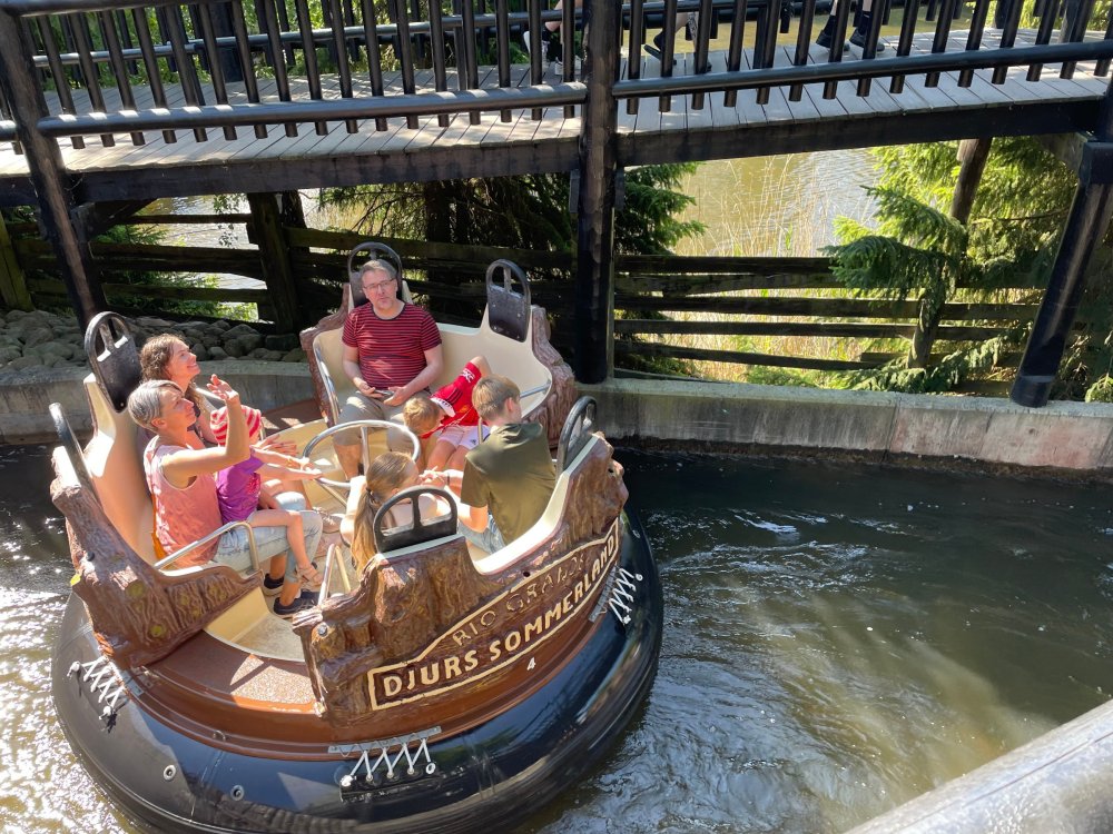 Day 8: Sat, June 10th part 2 (of 2): Djurs Sommerland we headed over to "Vikingeland" section of the park, for the next coaster on our hitlist: Thor's Hammer - a Gerstlauer Bobsled coaster some nice ride theming here, but this was one of the sections where the operators were wearing kahkis (I was hoping for heavy fur vests. . LOL) Don't forget. . Thor died on the cross for you. . . or something. .what do I know? I'm Jewish | as mentioned. . great theming thruout the park. . . even if the trains scream "traveling carnival" (and you can catch the bottom half of an operator's Viking Khakis in this pic) a really fun bobsled tho. . with some of it over the water - and thru a house! in the lake there on the left, one can go around the island in either a canoe or a paddle boat. it was hilarious, because they apparently just put the people in them and let them go - regardless if they know how to paddle (or steer). there was a canoe with four little kids in it, stuck on this turn here for a good 15 minutes as we watched them panic and try to paddle with their hands to move (someone finally came along in a boat and helped them) a self operating "pulley" ride that are "poles with helmets on them". . that's ALL they are. get your minds out of the gutter! here's the station where you can get either a canoe or paddleboat. Didier and I sat on a bench and watched as brave folks decided they wanted to paddle the lake. no shade, but I think David paddled for all. . . it wasn't quite time for lunch yet, so we passed back thru DinosaurLand (where lunch was to be) hence another pic of the Disc-O (the park also has a decent sized waterpark area called "VandLand". . but I'm not sure if any of the folks on the trip went to the waterpark here) and back into Westernland. .the theming on the outside of the Bumper Cars building I didn't actually look at them to see if the cars themselves were themed to Buffalo or not.. .but thought it was rather cool that the kiddie version is in the same building as the adult version. not a Bumper Cars rider. . but a Pony Espressen? Yes please! whee! the park also has a wave swinger called "Wild West Carousel". . . I don't typically ride these, but this one ran forwards, and then backwards, which looked like a unique ride experience (and it was). oh, it also shoots water up at you to try and get you wet. heading back for lunch, some I was with wanted to ride the Disc-O. these always make me a bit nauseous, and I certainly didn't want that right before lunch. .so I passed. tho managed to get pics of them on it. Can you tell which pic is before they noticed me with the phone up, and which is after? Lunch was a PACKED Pizza buffet. I recall it had some really weird stuff on it - such as corn pizza ?? but it certainly wasn't the worst pizza I had, and I recall enjoying it. the table I saw with. at first I thought I had misfiled this, as I don't recall them having one of these (at all). . but I see the dino in the background, so it must still be at Djurs Sommerland, and I just don't remember. this style of ride seems to have gotten popular tho, as I saw it at many parks in Scandinavia on this trip. Universal Denmark? after eating way too much pizza (as you can probably tell from the belly in this pic), needed something calming. So I suggested we ride the train. it's not a full size train like you'd see in USA.. but similar to a lot of the trains in the parks I'd been to in Europe. a lovely route, and gave a great view of the park. Thor's Hammer Juvelen Piraten playground full of ways to injure oneself. . . more playgrounds and trampolines. all really full too! Jonathan and David were eager to try out the King of the Mountain and made it up easily. I watched. oh. .there was plenty to look at. . . . while they attempted to make a hospital visit in a foreign country. . . yeah. . getting up was easy. do you want me to call the fire department to get down now? all played out, we headed into the "kiddie" area, which did have some adult rides. we were ready to ride: Vilde Hønsejagt (the wild chicken hunt) - another Zierer family coaster with lots of chicken theming. . and a fox at the front of the train trying to eat said chicken (I think?) hey. . TPR folks here too! Howdy! Pic courtesy of Didier I believe this was absolutely adorable. . a frog hopper, but themed to pigs in slop. I didn't ride it, but I really wanted to just to say I did I DID ride the classic carousel type ride tho (of course). . with Big Mike and Jonathan and I can't recall if we rode the tractors or not, but I think we did ride a couple of things over here in this section. a wet/dry slide. . . for some reason called Speedy Gonzales. . .hmmmmm. . there was a band playing music, that some folks were hanging out listening to. and we headed over to the one big section of the park we hadn't been in yet: Piratland this was a kiddie flume ride, Piratefisken, but it looked like there were adults riding with their kids, so got in line to ask. gaaa. . . lots of photo ops where you can get bitten here and a great view of Skatteøen (Treasure Island), the park's Mack Water Coaster from the kiddie flume queue the "boats" (or more realistically, barrels) are tiny, but after bonding with the operator over ABBA (I caught him singing along to "gimme gimme gimme" and joined in with him), he said OF COURSE you can ride, and let us each take a barrel. Said operator. . in a section that is participating in "full immersive costume" he he even let me hold his sword (get your mind out of the gutter!!) for a pic and them offered to take a pic of those of us who were riding before sending us on our way. . . whee!!! (pic courtesy of Andy, I think?) no. . I'm not embarrassed at all. . this was a fun flume! and got me a bit wet too. they also have this really weird "Sword ride over here called Sablen (the Saber) that's kind of a drop ride, but it also sways back and forth kinda like a topple tower. regardless, we got on it and it kinda broke, and we 