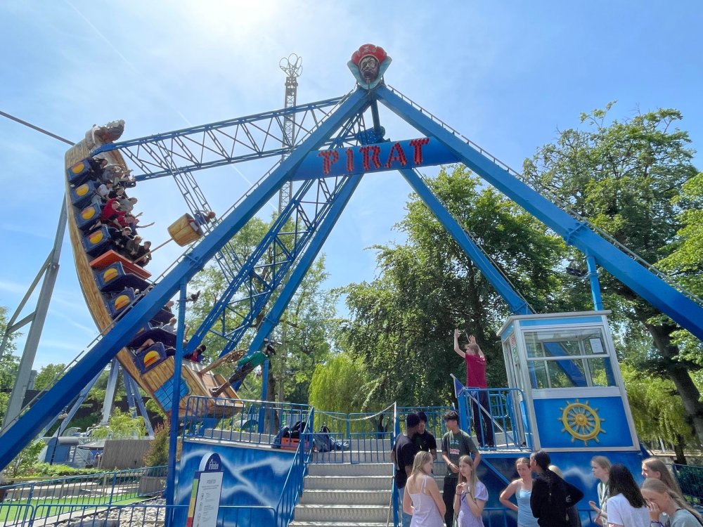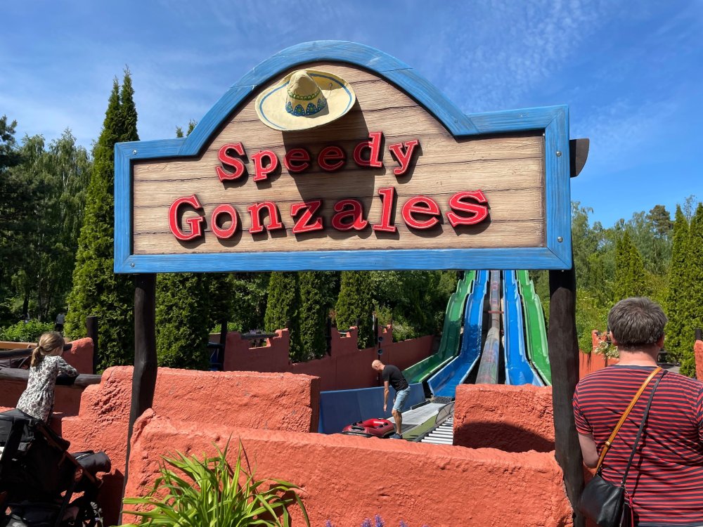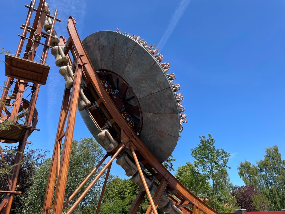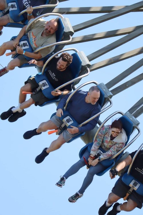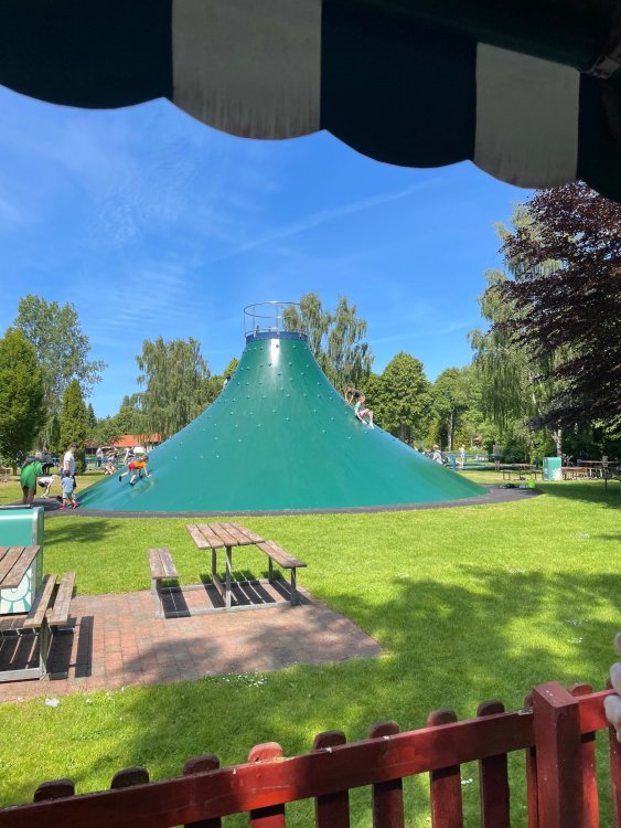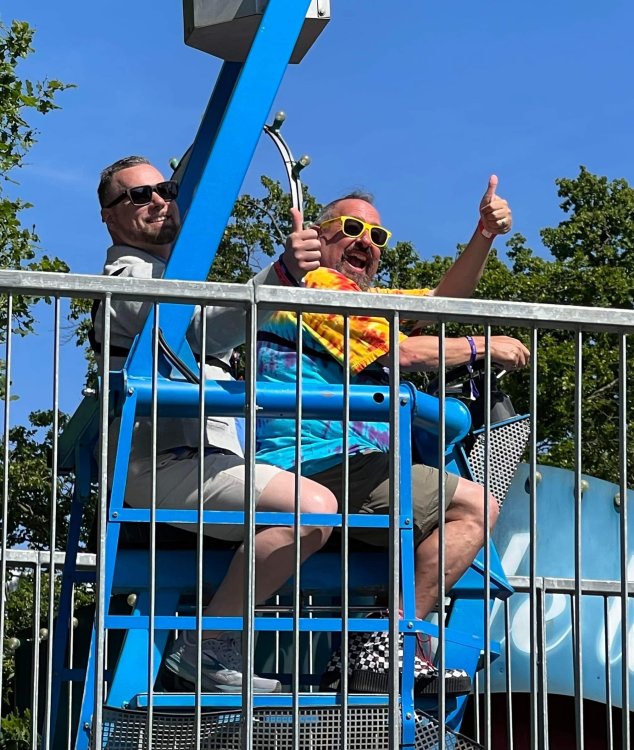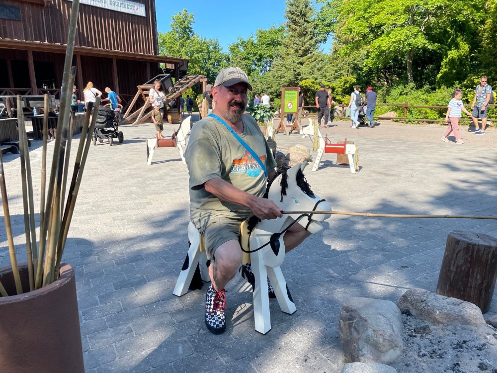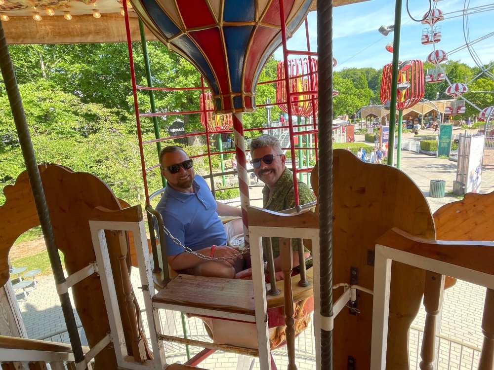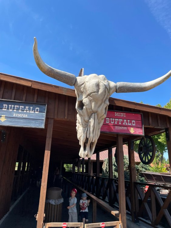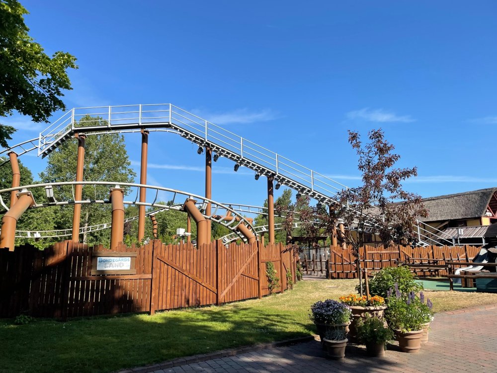 Day 8: Sat, June 10th part 2 (of 2): Djurs Sommerland we headed over to "Vikingeland" section of the park, for the next coaster on our hitlist: Thor's Hammer - a Gerstlauer Bobsled coaster some nice ride theming here, but this was one of the sections where the operators were wearing kahkis (I was hoping for heavy fur vests. . LOL) Don't forget. . Thor died on the cross for you. . . or something. .what do I know? I'm Jewish | as mentioned. . great theming thruout the park. . . even if the trains scream "traveling carnival" (and you can catch the bottom half of an operator's Viking Khakis in this pic) a really fun bobsled tho. . with some of it over the water - and thru a house! in the lake there on the left, one can go around the island in either a canoe or a paddle boat. it was hilarious, because they apparently just put the people in them and let them go - regardless if they know how to paddle (or steer). there was a canoe with four little kids in it, stuck on this turn here for a good 15 minutes as we watched them panic and try to paddle with their hands to move (someone finally came along in a boat and helped them) a self operating "pulley" ride that are "poles with helmets on them". . that's ALL they are. get your minds out of the gutter! here's the station where you can get either a canoe or paddleboat. Didier and I sat on a bench and watched as brave folks decided they wanted to paddle the lake. no shade, but I think David paddled for all. . . it wasn't quite time for lunch yet, so we passed back thru DinosaurLand (where lunch was to be) hence another pic of the Disc-O (the park also has a decent sized waterpark area called "VandLand". . but I'm not sure if any of the folks on the trip went to the waterpark here) and back into Westernland. .the theming on the outside of the Bumper Cars building I didn't actually look at them to see if the cars themselves were themed to Buffalo or not.. .but thought it was rather cool that the kiddie version is in the same building as the adult version. not a Bumper Cars rider. . but a Pony Espressen? Yes please! whee! the park also has a wave swinger called "Wild West Carousel". . . I don't typically ride these, but this one ran forwards, and then backwards, which looked like a unique ride experience (and it was). oh, it also shoots water up at you to try and get you wet. heading back for lunch, some I was with wanted to ride the Disc-O. these always make me a bit nauseous, and I certainly didn't want that right before lunch. .so I passed. tho managed to get pics of them on it. Can you tell which pic is before they noticed me with the phone up, and which is after? Lunch was a PACKED Pizza buffet. I recall it had some really weird stuff on it - such as corn pizza ?? but it certainly wasn't the worst pizza I had, and I recall enjoying it. the table I saw with. at first I thought I had misfiled this, as I don't recall them having one of these (at all). . but I see the dino in the background, so it must still be at Djurs Sommerland, and I just don't remember. this style of ride seems to have gotten popular tho, as I saw it at many parks in Scandinavia on this trip. Universal Denmark? after eating way too much pizza (as you can probably tell from the belly in this pic), needed something calming. So I suggested we ride the train. it's not a full size train like you'd see in USA.. but similar to a lot of the trains in the parks I'd been to in Europe. a lovely route, and gave a great view of the park. Thor's Hammer Juvelen Piraten playground full of ways to injure oneself. . . more playgrounds and trampolines. all really full too! Jonathan and David were eager to try out the King of the Mountain and made it up easily. I watched. oh. .there was plenty to look at. . . . while they attempted to make a hospital visit in a foreign country. . . yeah. . getting up was easy. do you want me to call the fire department to get down now? all played out, we headed into the "kiddie" area, which did have some adult rides. we were ready to ride: Vilde Hønsejagt (the wild chicken hunt) - another Zierer family coaster with lots of chicken theming. . and a fox at the front of the train trying to eat said chicken (I think?) hey. . TPR folks here too! Howdy! Pic courtesy of Didier I believe this was absolutely adorable. . a frog hopper, but themed to pigs in slop. I didn't ride it, but I really wanted to just to say I did I DID ride the classic carousel type ride tho (of course). . with Big Mike and Jonathan and I can't recall if we rode the tractors or not, but I think we did ride a couple of things over here in this section. a wet/dry slide. . . for some reason called Speedy Gonzales. . .hmmmmm. . there was a band playing music, that some folks were hanging out listening to. and we headed over to the one big section of the park we hadn't been in yet: Piratland this was a kiddie flume ride, Piratefisken, but it looked like there were adults riding with their kids, so got in line to ask. gaaa. . . lots of photo ops where you can get bitten here and a great view of Skatteøen (Treasure Island), the park's Mack Water Coaster from the kiddie flume queue the "boats" (or more realistically, barrels) are tiny, but after bonding with the operator over ABBA (I caught him singing along to "gimme gimme gimme" and joined in with him), he said OF COURSE you can ride, and let us each take a barrel. Said operator. . in a section that is participating in "full immersive costume" he he even let me hold his sword (get your mind out of the gutter!!) for a pic and them offered to take a pic of those of us who were riding before sending us on our way. . . whee!!! (pic courtesy of Andy, I think?) no. . I'm not embarrassed at all. . this was a fun flume! and got me a bit wet too. they also have this really weird "Sword ride over here called Sablen (the Saber) that's kind of a drop ride, but it also sways back and forth kinda like a topple tower. regardless, we got on it and it kinda broke, and we 