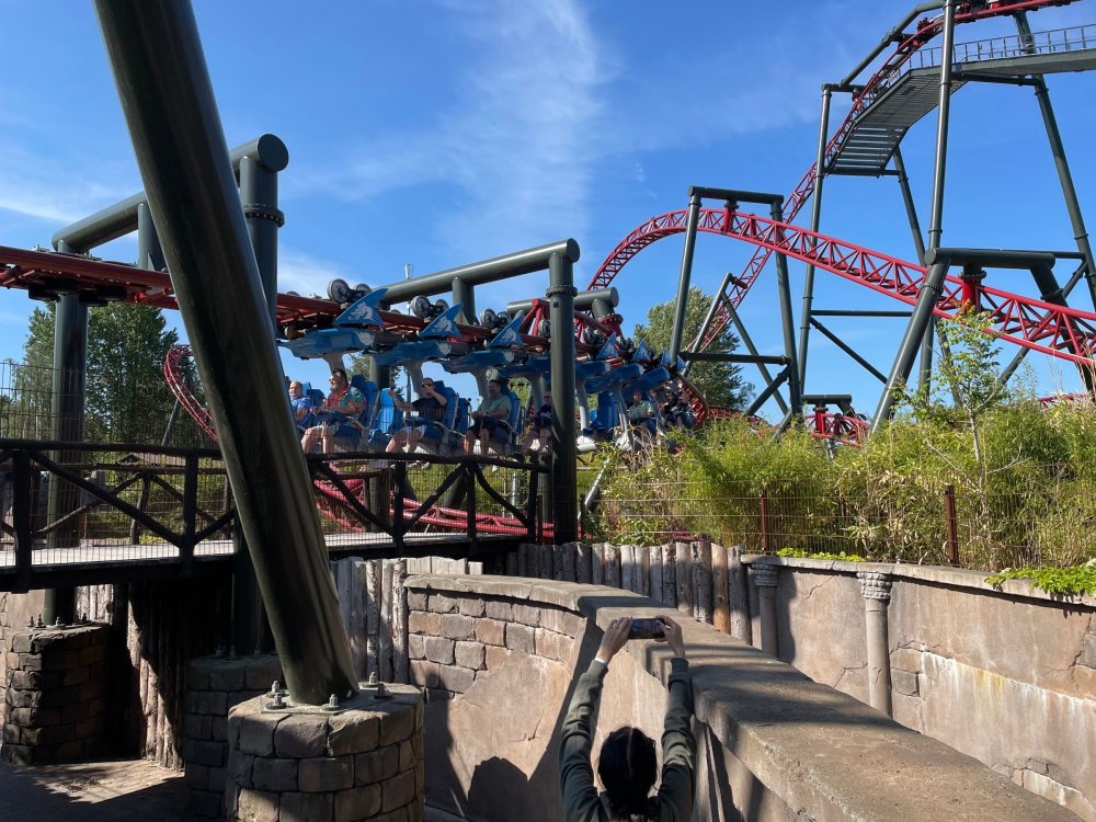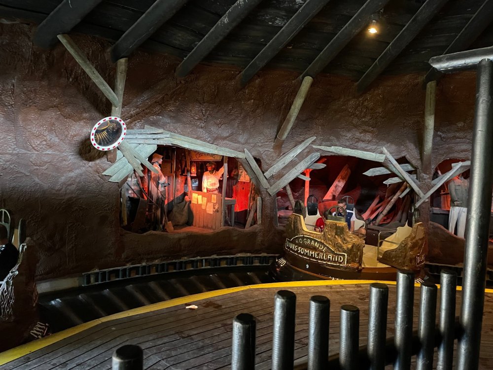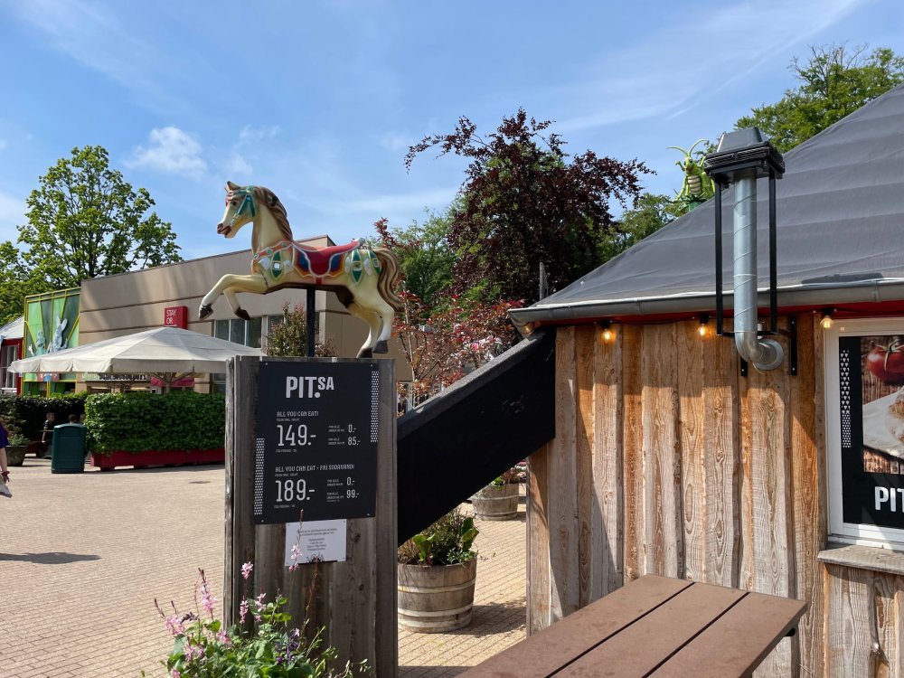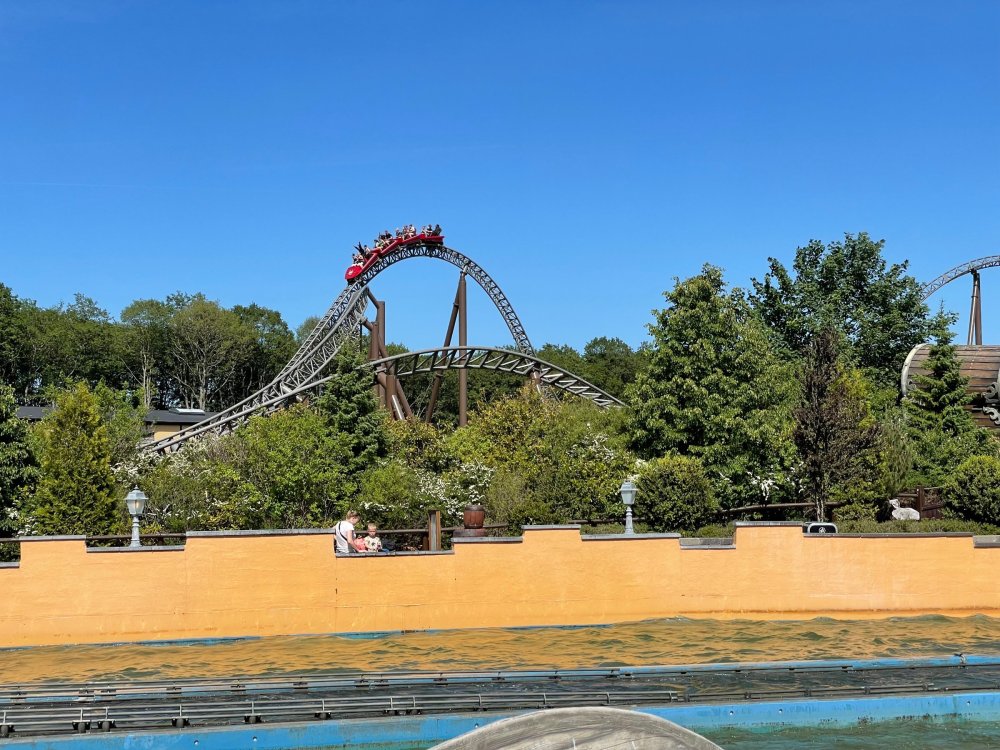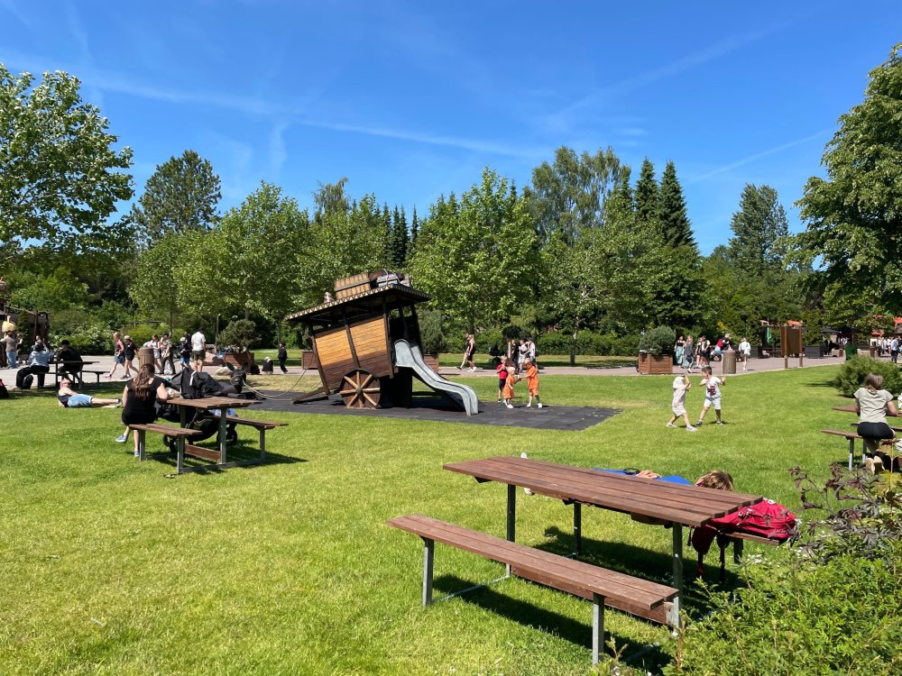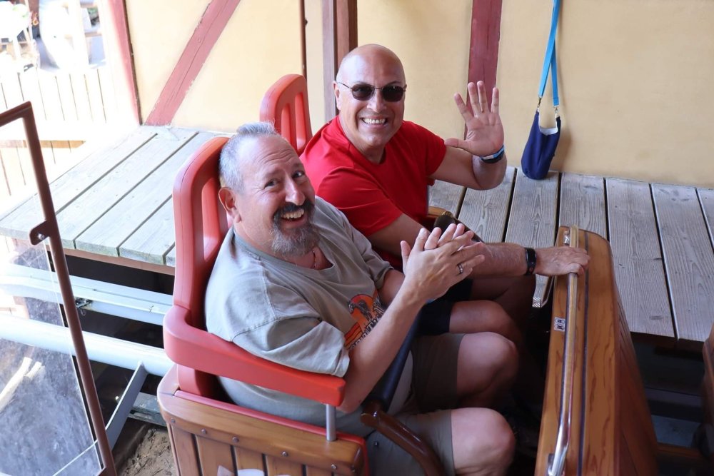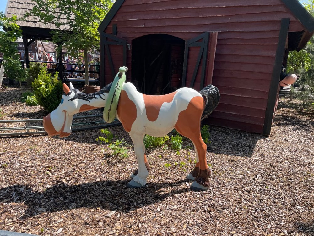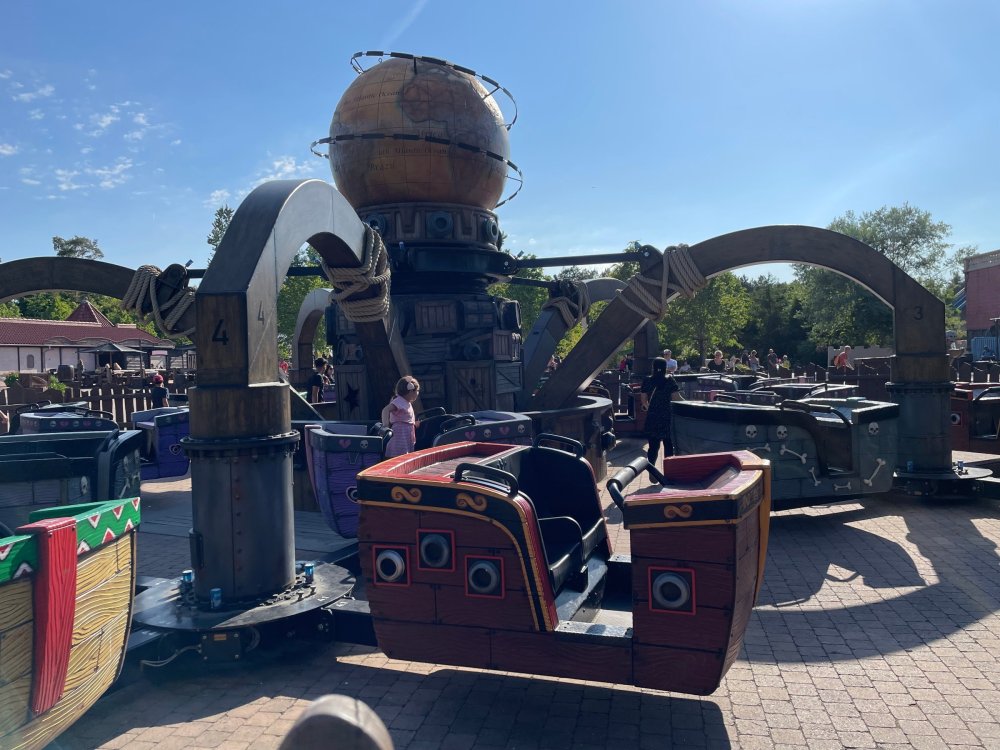 Day 8: Sat, June 10th part 2 (of 2): Djurs Sommerland we headed over to "Vikingeland" section of the park, for the next coaster on our hitlist: Thor's Hammer - a Gerstlauer Bobsled coaster some nice ride theming here, but this was one of the sections where the operators were wearing kahkis (I was hoping for heavy fur vests. . LOL) Don't forget. . Thor died on the cross for you. . . or something. .what do I know? I'm Jewish | as mentioned. . great theming thruout the park. . . even if the trains scream "traveling carnival" (and you can catch the bottom half of an operator's Viking Khakis in this pic) a really fun bobsled tho. . with some of it over the water - and thru a house! in the lake there on the left, one can go around the island in either a canoe or a paddle boat. it was hilarious, because they apparently just put the people in them and let them go - regardless if they know how to paddle (or steer). there was a canoe with four little kids in it, stuck on this turn here for a good 15 minutes as we watched them panic and try to paddle with their hands to move (someone finally came along in a boat and helped them) a self operating "pulley" ride that are "poles with helmets on them". . that's ALL they are. get your minds out of the gutter! here's the station where you can get either a canoe or paddleboat. Didier and I sat on a bench and watched as brave folks decided they wanted to paddle the lake. no shade, but I think David paddled for all. . . it wasn't quite time for lunch yet, so we passed back thru DinosaurLand (where lunch was to be) hence another pic of the Disc-O (the park also has a decent sized waterpark area called "VandLand". . but I'm not sure if any of the folks on the trip went to the waterpark here) and back into Westernland. .the theming on the outside of the Bumper Cars building I didn't actually look at them to see if the cars themselves were themed to Buffalo or not.. .but thought it was rather cool that the kiddie version is in the same building as the adult version. not a Bumper Cars rider. . but a Pony Espressen? Yes please! whee! the park also has a wave swinger called "Wild West Carousel". . . I don't typically ride these, but this one ran forwards, and then backwards, which looked like a unique ride experience (and it was). oh, it also shoots water up at you to try and get you wet. heading back for lunch, some I was with wanted to ride the Disc-O. these always make me a bit nauseous, and I certainly didn't want that right before lunch. .so I passed. tho managed to get pics of them on it. Can you tell which pic is before they noticed me with the phone up, and which is after? Lunch was a PACKED Pizza buffet. I recall it had some really weird stuff on it - such as corn pizza ?? but it certainly wasn't the worst pizza I had, and I recall enjoying it. the table I saw with. at first I thought I had misfiled this, as I don't recall them having one of these (at all). . but I see the dino in the background, so it must still be at Djurs Sommerland, and I just don't remember. this style of ride seems to have gotten popular tho, as I saw it at many parks in Scandinavia on this trip. Universal Denmark? after eating way too much pizza (as you can probably tell from the belly in this pic), needed something calming. So I suggested we ride the train. it's not a full size train like you'd see in USA.. but similar to a lot of the trains in the parks I'd been to in Europe. a lovely route, and gave a great view of the park. Thor's Hammer Juvelen Piraten playground full of ways to injure oneself. . . more playgrounds and trampolines. all really full too! Jonathan and David were eager to try out the King of the Mountain and made it up easily. I watched. oh. .there was plenty to look at. . . . while they attempted to make a hospital visit in a foreign country. . . yeah. . getting up was easy. do you want me to call the fire department to get down now? all played out, we headed into the "kiddie" area, which did have some adult rides. we were ready to ride: Vilde Hønsejagt (the wild chicken hunt) - another Zierer family coaster with lots of chicken theming. . and a fox at the front of the train trying to eat said chicken (I think?) hey. . TPR folks here too! Howdy! Pic courtesy of Didier I believe this was absolutely adorable. . a frog hopper, but themed to pigs in slop. I didn't ride it, but I really wanted to just to say I did I DID ride the classic carousel type ride tho (of course). . with Big Mike and Jonathan and I can't recall if we rode the tractors or not, but I think we did ride a couple of things over here in this section. a wet/dry slide. . . for some reason called Speedy Gonzales. . .hmmmmm. . there was a band playing music, that some folks were hanging out listening to. and we headed over to the one big section of the park we hadn't been in yet: Piratland this was a kiddie flume ride, Piratefisken, but it looked like there were adults riding with their kids, so got in line to ask. gaaa. . . lots of photo ops where you can get bitten here and a great view of Skatteøen (Treasure Island), the park's Mack Water Coaster from the kiddie flume queue the "boats" (or more realistically, barrels) are tiny, but after bonding with the operator over ABBA (I caught him singing along to "gimme gimme gimme" and joined in with him), he said OF COURSE you can ride, and let us each take a barrel. Said operator. . in a section that is participating in "full immersive costume" he he even let me hold his sword (get your mind out of the gutter!!) for a pic and them offered to take a pic of those of us who were riding before sending us on our way. . . whee!!! (pic courtesy of Andy, I think?) no. . I'm not embarrassed at all. . this was a fun flume! and got me a bit wet too. they also have this really weird "Sword ride over here called Sablen (the Saber) that's kind of a drop ride, but it also sways back and forth kinda like a topple tower. regardless, we got on it and it kinda broke, and we 