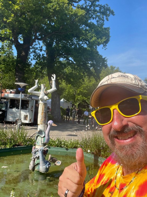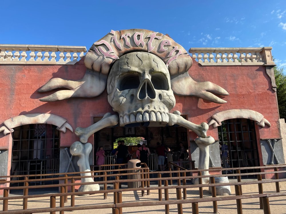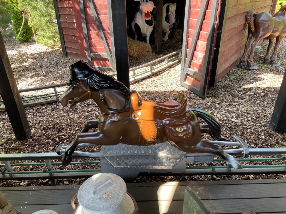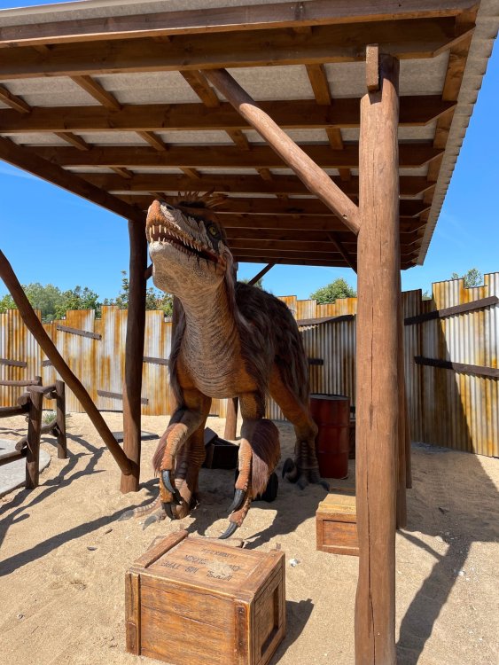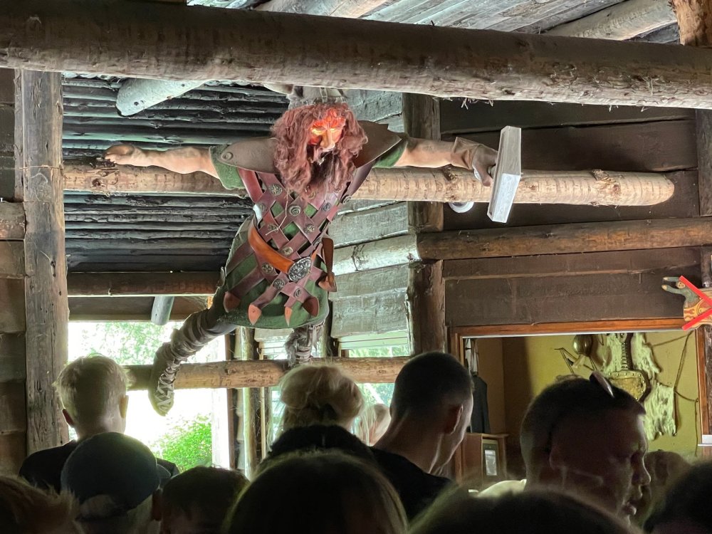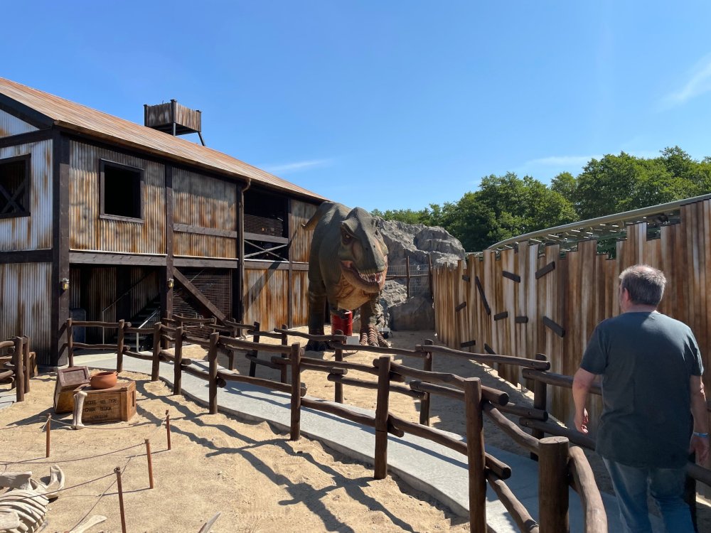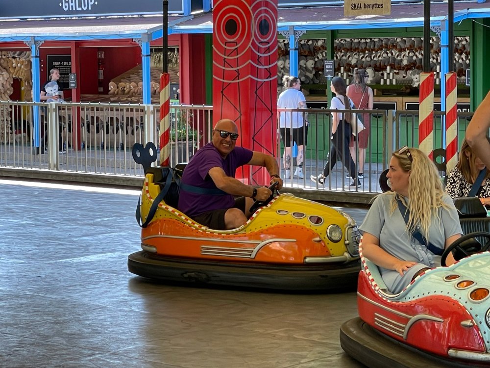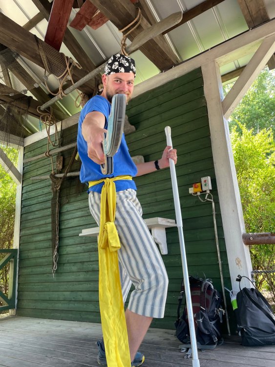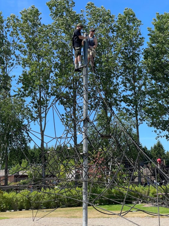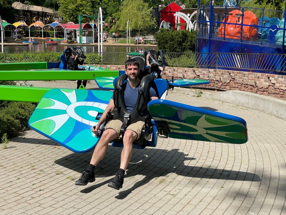 Day 8: Sat, June 10th part 2 (of 2): Djurs Sommerland we headed over to "Vikingeland" section of the park, for the next coaster on our hitlist: Thor's Hammer - a Gerstlauer Bobsled coaster some nice ride theming here, but this was one of the sections where the operators were wearing kahkis (I was hoping for heavy fur vests. . LOL) Don't forget. . Thor died on the cross for you. . . or something. .what do I know? I'm Jewish | as mentioned. . great theming thruout the park. . . even if the trains scream "traveling carnival" (and you can catch the bottom half of an operator's Viking Khakis in this pic) a really fun bobsled tho. . with some of it over the water - and thru a house! in the lake there on the left, one can go around the island in either a canoe or a paddle boat. it was hilarious, because they apparently just put the people in them and let them go - regardless if they know how to paddle (or steer). there was a canoe with four little kids in it, stuck on this turn here for a good 15 minutes as we watched them panic and try to paddle with their hands to move (someone finally came along in a boat and helped them) a self operating "pulley" ride that are "poles with helmets on them". . that's ALL they are. get your minds out of the gutter! here's the station where you can get either a canoe or paddleboat. Didier and I sat on a bench and watched as brave folks decided they wanted to paddle the lake. no shade, but I think David paddled for all. . . it wasn't quite time for lunch yet, so we passed back thru DinosaurLand (where lunch was to be) hence another pic of the Disc-O (the park also has a decent sized waterpark area called "VandLand". . but I'm not sure if any of the folks on the trip went to the waterpark here) and back into Westernland. .the theming on the outside of the Bumper Cars building I didn't actually look at them to see if the cars themselves were themed to Buffalo or not.. .but thought it was rather cool that the kiddie version is in the same building as the adult version. not a Bumper Cars rider. . but a Pony Espressen? Yes please! whee! the park also has a wave swinger called "Wild West Carousel". . . I don't typically ride these, but this one ran forwards, and then backwards, which looked like a unique ride experience (and it was). oh, it also shoots water up at you to try and get you wet. heading back for lunch, some I was with wanted to ride the Disc-O. these always make me a bit nauseous, and I certainly didn't want that right before lunch. .so I passed. tho managed to get pics of them on it. Can you tell which pic is before they noticed me with the phone up, and which is after? Lunch was a PACKED Pizza buffet. I recall it had some really weird stuff on it - such as corn pizza ?? but it certainly wasn't the worst pizza I had, and I recall enjoying it. the table I saw with. at first I thought I had misfiled this, as I don't recall them having one of these (at all). . but I see the dino in the background, so it must still be at Djurs Sommerland, and I just don't remember. this style of ride seems to have gotten popular tho, as I saw it at many parks in Scandinavia on this trip. Universal Denmark? after eating way too much pizza (as you can probably tell from the belly in this pic), needed something calming. So I suggested we ride the train. it's not a full size train like you'd see in USA.. but similar to a lot of the trains in the parks I'd been to in Europe. a lovely route, and gave a great view of the park. Thor's Hammer Juvelen Piraten playground full of ways to injure oneself. . . more playgrounds and trampolines. all really full too! Jonathan and David were eager to try out the King of the Mountain and made it up easily. I watched. oh. .there was plenty to look at. . . . while they attempted to make a hospital visit in a foreign country. . . yeah. . getting up was easy. do you want me to call the fire department to get down now? all played out, we headed into the "kiddie" area, which did have some adult rides. we were ready to ride: Vilde Hønsejagt (the wild chicken hunt) - another Zierer family coaster with lots of chicken theming. . and a fox at the front of the train trying to eat said chicken (I think?) hey. . TPR folks here too! Howdy! Pic courtesy of Didier I believe this was absolutely adorable. . a frog hopper, but themed to pigs in slop. I didn't ride it, but I really wanted to just to say I did I DID ride the classic carousel type ride tho (of course). . with Big Mike and Jonathan and I can't recall if we rode the tractors or not, but I think we did ride a couple of things over here in this section. a wet/dry slide. . . for some reason called Speedy Gonzales. . .hmmmmm. . there was a band playing music, that some folks were hanging out listening to. and we headed over to the one big section of the park we hadn't been in yet: Piratland this was a kiddie flume ride, Piratefisken, but it looked like there were adults riding with their kids, so got in line to ask. gaaa. . . lots of photo ops where you can get bitten here and a great view of Skatteøen (Treasure Island), the park's Mack Water Coaster from the kiddie flume queue the "boats" (or more realistically, barrels) are tiny, but after bonding with the operator over ABBA (I caught him singing along to "gimme gimme gimme" and joined in with him), he said OF COURSE you can ride, and let us each take a barrel. Said operator. . in a section that is participating in "full immersive costume" he he even let me hold his sword (get your mind out of the gutter!!) for a pic and them offered to take a pic of those of us who were riding before sending us on our way. . . whee!!! (pic courtesy of Andy, I think?) no. . I'm not embarrassed at all. . this was a fun flume! and got me a bit wet too. they also have this really weird "Sword ride over here called Sablen (the Saber) that's kind of a drop ride, but it also sways back and forth kinda like a topple tower. regardless, we got on it and it kinda broke, and we 