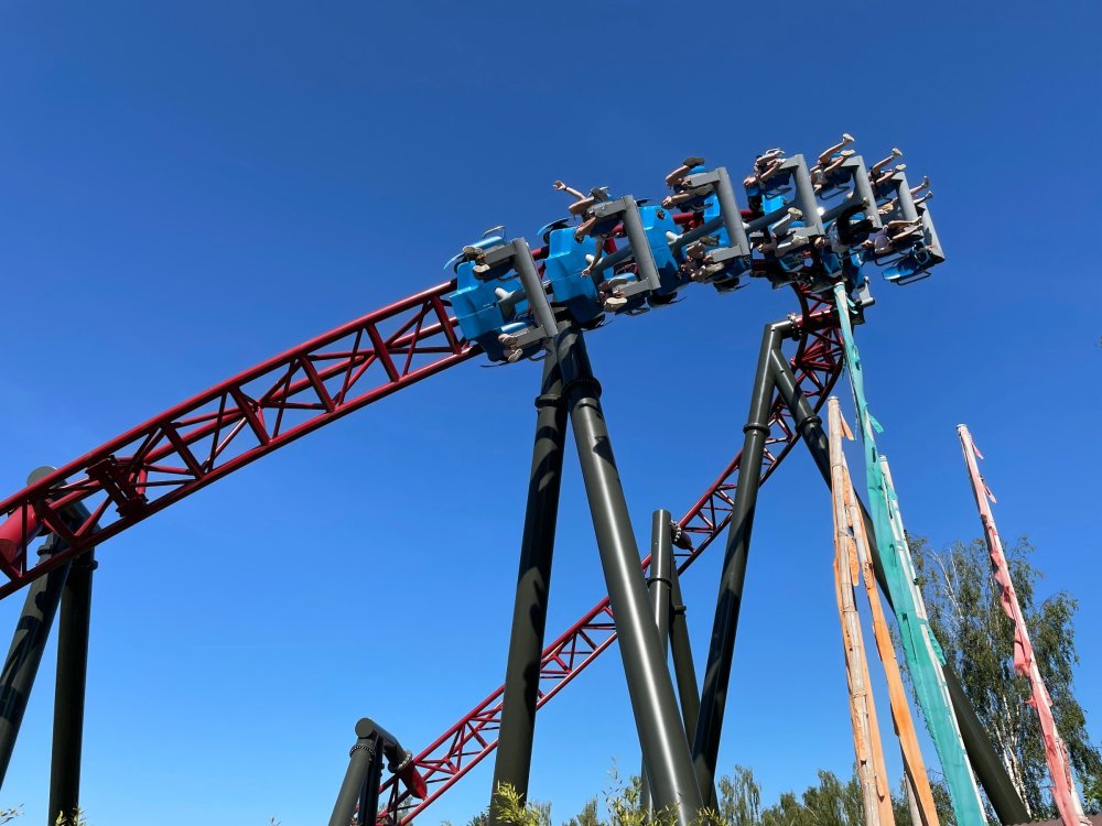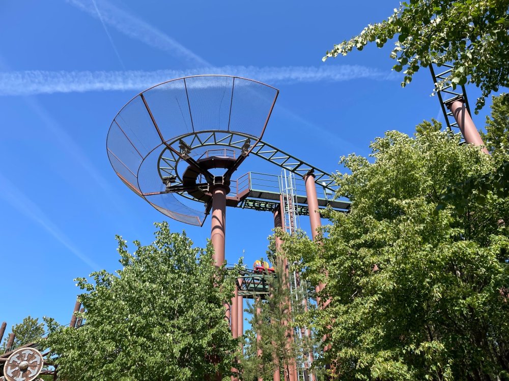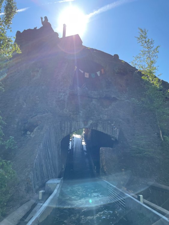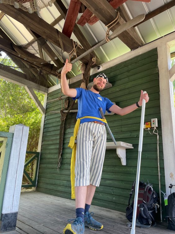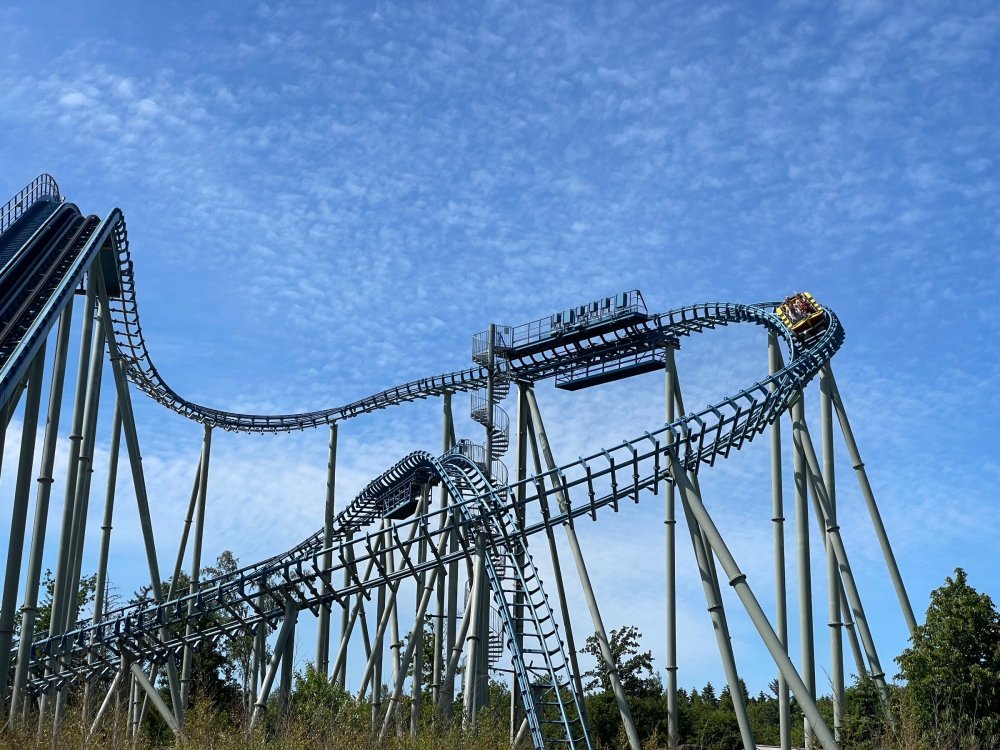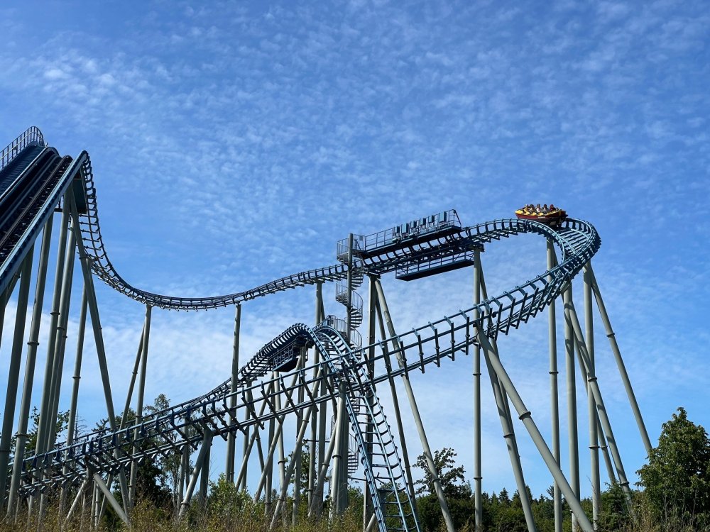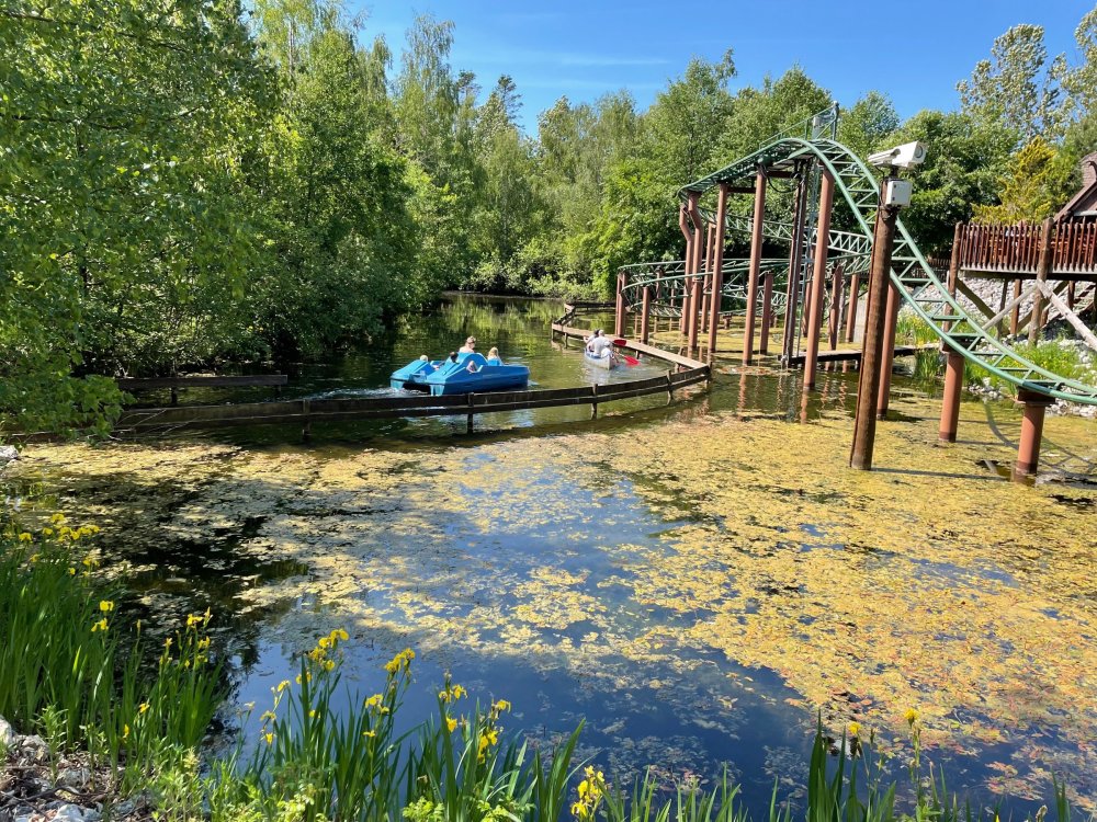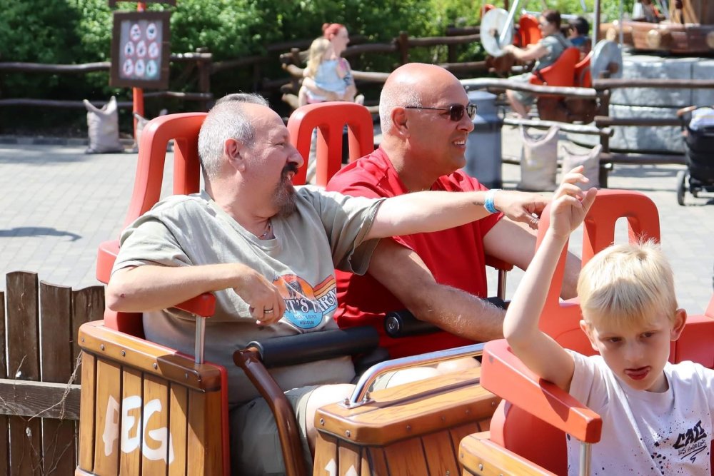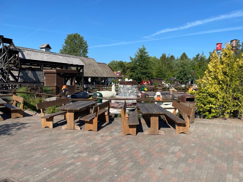 Day 8: Sat, June 10th part 2 (of 2): Djurs Sommerland we headed over to "Vikingeland" section of the park, for the next coaster on our hitlist: Thor's Hammer - a Gerstlauer Bobsled coaster some nice ride theming here, but this was one of the sections where the operators were wearing kahkis (I was hoping for heavy fur vests. . LOL) Don't forget. . Thor died on the cross for you. . . or something. .what do I know? I'm Jewish | as mentioned. . great theming thruout the park. . . even if the trains scream "traveling carnival" (and you can catch the bottom half of an operator's Viking Khakis in this pic) a really fun bobsled tho. . with some of it over the water - and thru a house! in the lake there on the left, one can go around the island in either a canoe or a paddle boat. it was hilarious, because they apparently just put the people in them and let them go - regardless if they know how to paddle (or steer). there was a canoe with four little kids in it, stuck on this turn here for a good 15 minutes as we watched them panic and try to paddle with their hands to move (someone finally came along in a boat and helped them) a self operating "pulley" ride that are "poles with helmets on them". . that's ALL they are. get your minds out of the gutter! here's the station where you can get either a canoe or paddleboat. Didier and I sat on a bench and watched as brave folks decided they wanted to paddle the lake. no shade, but I think David paddled for all. . . it wasn't quite time for lunch yet, so we passed back thru DinosaurLand (where lunch was to be) hence another pic of the Disc-O (the park also has a decent sized waterpark area called "VandLand". . but I'm not sure if any of the folks on the trip went to the waterpark here) and back into Westernland. .the theming on the outside of the Bumper Cars building I didn't actually look at them to see if the cars themselves were themed to Buffalo or not.. .but thought it was rather cool that the kiddie version is in the same building as the adult version. not a Bumper Cars rider. . but a Pony Espressen? Yes please! whee! the park also has a wave swinger called "Wild West Carousel". . . I don't typically ride these, but this one ran forwards, and then backwards, which looked like a unique ride experience (and it was). oh, it also shoots water up at you to try and get you wet. heading back for lunch, some I was with wanted to ride the Disc-O. these always make me a bit nauseous, and I certainly didn't want that right before lunch. .so I passed. tho managed to get pics of them on it. Can you tell which pic is before they noticed me with the phone up, and which is after? Lunch was a PACKED Pizza buffet. I recall it had some really weird stuff on it - such as corn pizza ?? but it certainly wasn't the worst pizza I had, and I recall enjoying it. the table I saw with. at first I thought I had misfiled this, as I don't recall them having one of these (at all). . but I see the dino in the background, so it must still be at Djurs Sommerland, and I just don't remember. this style of ride seems to have gotten popular tho, as I saw it at many parks in Scandinavia on this trip. Universal Denmark? after eating way too much pizza (as you can probably tell from the belly in this pic), needed something calming. So I suggested we ride the train. it's not a full size train like you'd see in USA.. but similar to a lot of the trains in the parks I'd been to in Europe. a lovely route, and gave a great view of the park. Thor's Hammer Juvelen Piraten playground full of ways to injure oneself. . . more playgrounds and trampolines. all really full too! Jonathan and David were eager to try out the King of the Mountain and made it up easily. I watched. oh. .there was plenty to look at. . . . while they attempted to make a hospital visit in a foreign country. . . yeah. . getting up was easy. do you want me to call the fire department to get down now? all played out, we headed into the "kiddie" area, which did have some adult rides. we were ready to ride: Vilde Hønsejagt (the wild chicken hunt) - another Zierer family coaster with lots of chicken theming. . and a fox at the front of the train trying to eat said chicken (I think?) hey. . TPR folks here too! Howdy! Pic courtesy of Didier I believe this was absolutely adorable. . a frog hopper, but themed to pigs in slop. I didn't ride it, but I really wanted to just to say I did I DID ride the classic carousel type ride tho (of course). . with Big Mike and Jonathan and I can't recall if we rode the tractors or not, but I think we did ride a couple of things over here in this section. a wet/dry slide. . . for some reason called Speedy Gonzales. . .hmmmmm. . there was a band playing music, that some folks were hanging out listening to. and we headed over to the one big section of the park we hadn't been in yet: Piratland this was a kiddie flume ride, Piratefisken, but it looked like there were adults riding with their kids, so got in line to ask. gaaa. . . lots of photo ops where you can get bitten here and a great view of Skatteøen (Treasure Island), the park's Mack Water Coaster from the kiddie flume queue the "boats" (or more realistically, barrels) are tiny, but after bonding with the operator over ABBA (I caught him singing along to "gimme gimme gimme" and joined in with him), he said OF COURSE you can ride, and let us each take a barrel. Said operator. . in a section that is participating in "full immersive costume" he he even let me hold his sword (get your mind out of the gutter!!) for a pic and them offered to take a pic of those of us who were riding before sending us on our way. . . whee!!! (pic courtesy of Andy, I think?) no. . I'm not embarrassed at all. . this was a fun flume! and got me a bit wet too. they also have this really weird "Sword ride over here called Sablen (the Saber) that's kind of a drop ride, but it also sways back and forth kinda like a topple tower. regardless, we got on it and it kinda broke, and we 