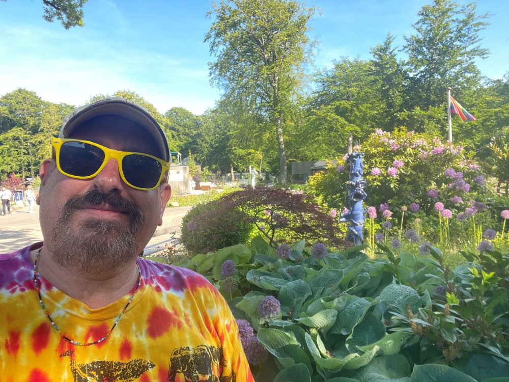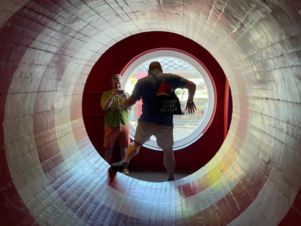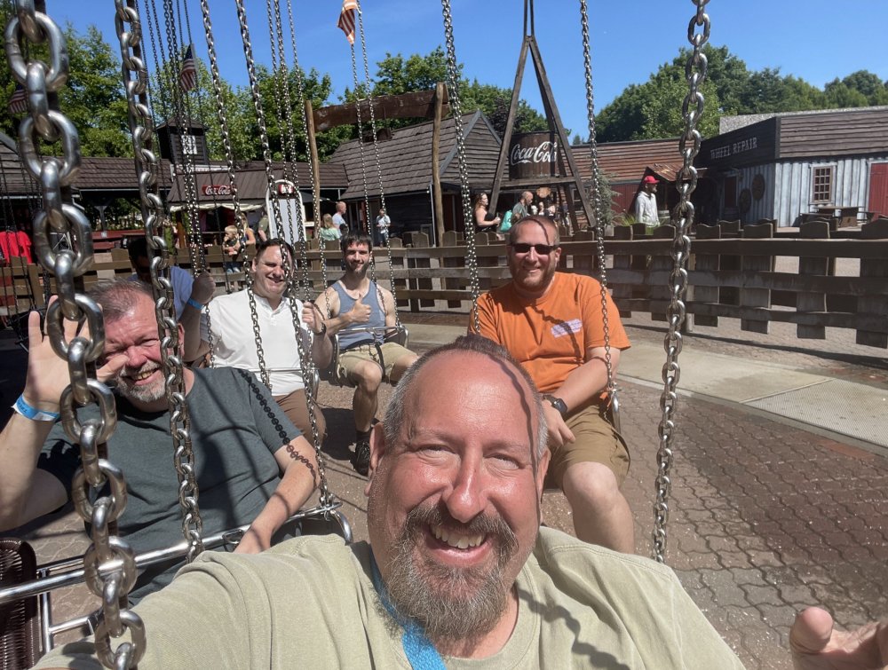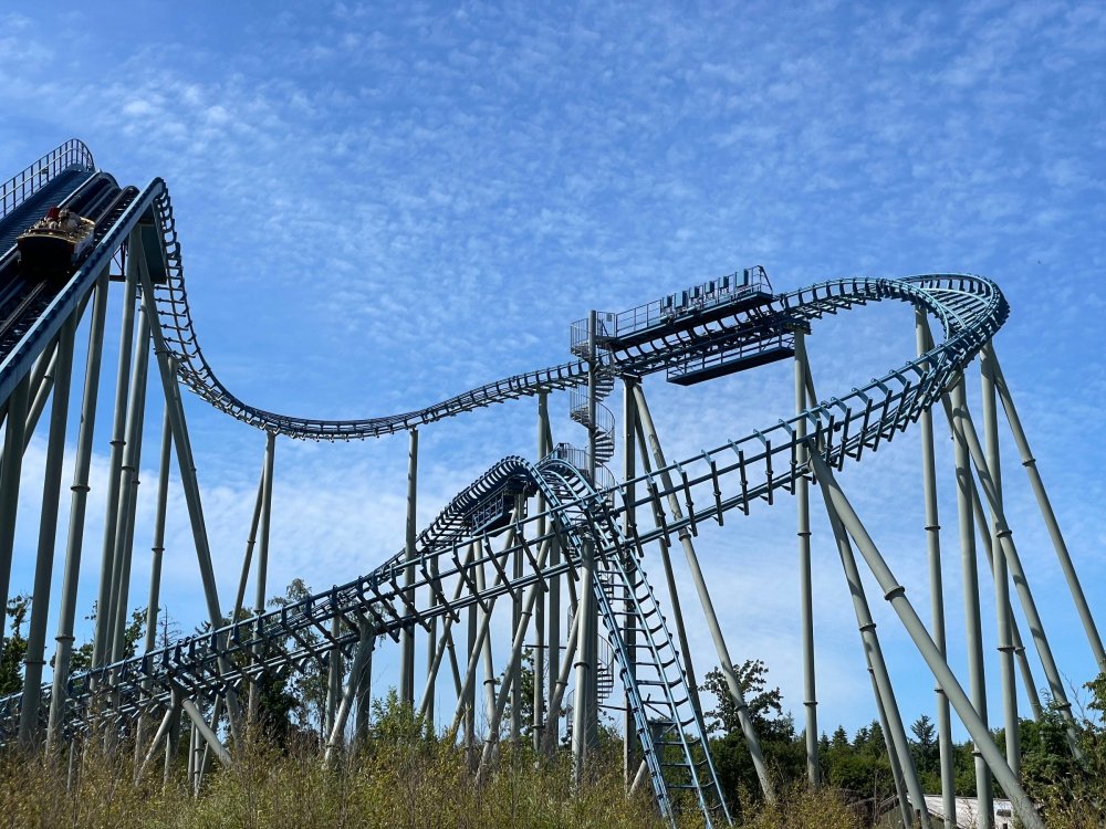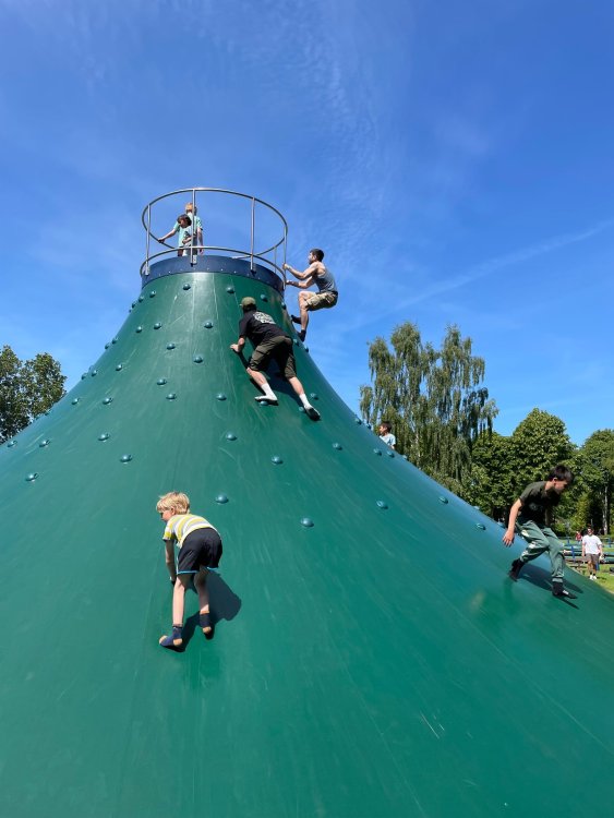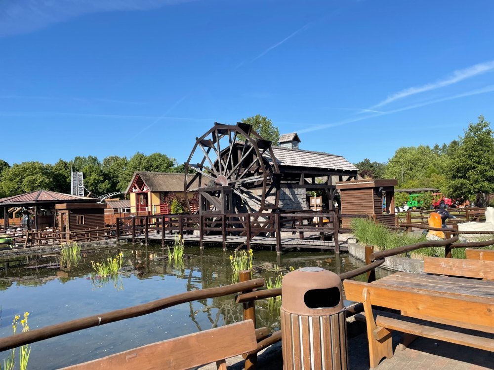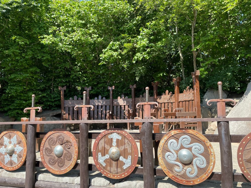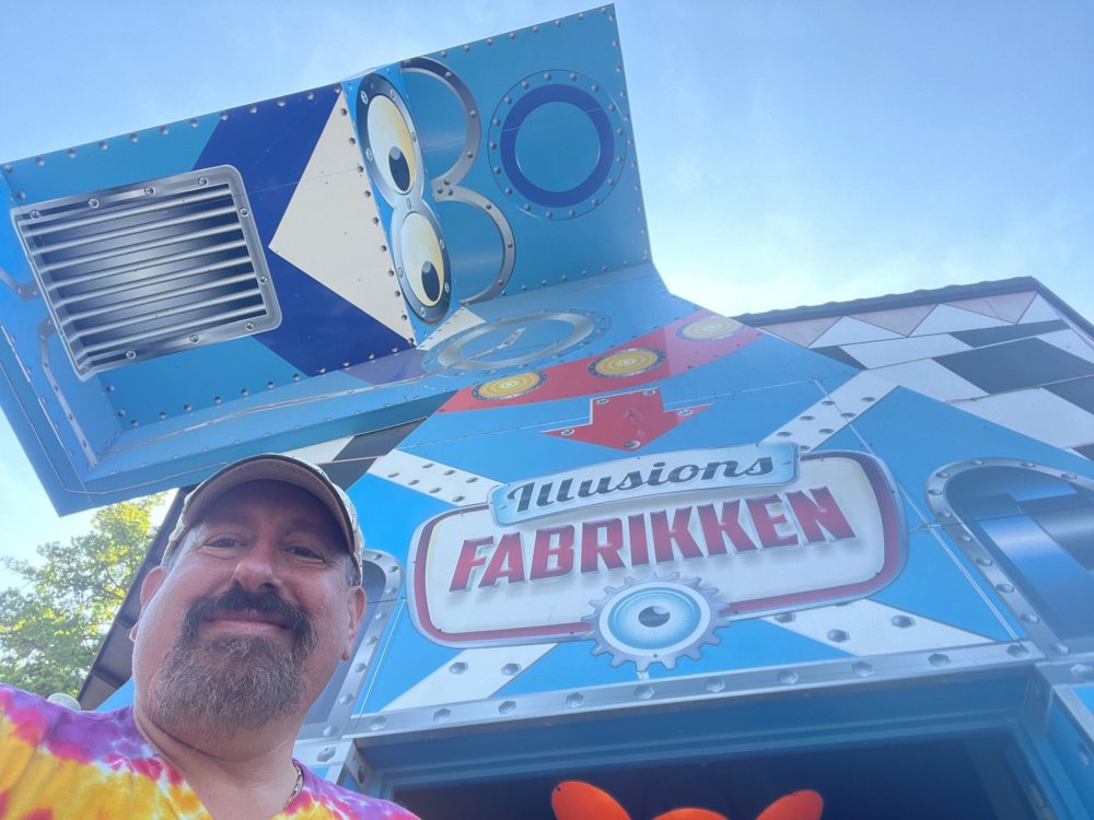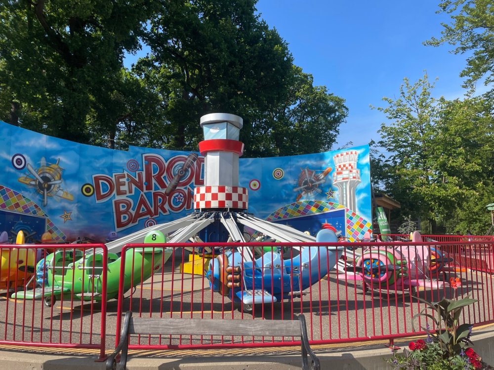 Day 8: Sat, June 10th part 2 (of 2): Djurs Sommerland we headed over to "Vikingeland" section of the park, for the next coaster on our hitlist: Thor's Hammer - a Gerstlauer Bobsled coaster some nice ride theming here, but this was one of the sections where the operators were wearing kahkis (I was hoping for heavy fur vests. . LOL) Don't forget. . Thor died on the cross for you. . . or something. .what do I know? I'm Jewish | as mentioned. . great theming thruout the park. . . even if the trains scream "traveling carnival" (and you can catch the bottom half of an operator's Viking Khakis in this pic) a really fun bobsled tho. . with some of it over the water - and thru a house! in the lake there on the left, one can go around the island in either a canoe or a paddle boat. it was hilarious, because they apparently just put the people in them and let them go - regardless if they know how to paddle (or steer). there was a canoe with four little kids in it, stuck on this turn here for a good 15 minutes as we watched them panic and try to paddle with their hands to move (someone finally came along in a boat and helped them) a self operating "pulley" ride that are "poles with helmets on them". . that's ALL they are. get your minds out of the gutter! here's the station where you can get either a canoe or paddleboat. Didier and I sat on a bench and watched as brave folks decided they wanted to paddle the lake. no shade, but I think David paddled for all. . . it wasn't quite time for lunch yet, so we passed back thru DinosaurLand (where lunch was to be) hence another pic of the Disc-O (the park also has a decent sized waterpark area called "VandLand". . but I'm not sure if any of the folks on the trip went to the waterpark here) and back into Westernland. .the theming on the outside of the Bumper Cars building I didn't actually look at them to see if the cars themselves were themed to Buffalo or not.. .but thought it was rather cool that the kiddie version is in the same building as the adult version. not a Bumper Cars rider. . but a Pony Espressen? Yes please! whee! the park also has a wave swinger called "Wild West Carousel". . . I don't typically ride these, but this one ran forwards, and then backwards, which looked like a unique ride experience (and it was). oh, it also shoots water up at you to try and get you wet. heading back for lunch, some I was with wanted to ride the Disc-O. these always make me a bit nauseous, and I certainly didn't want that right before lunch. .so I passed. tho managed to get pics of them on it. Can you tell which pic is before they noticed me with the phone up, and which is after? Lunch was a PACKED Pizza buffet. I recall it had some really weird stuff on it - such as corn pizza ?? but it certainly wasn't the worst pizza I had, and I recall enjoying it. the table I saw with. at first I thought I had misfiled this, as I don't recall them having one of these (at all). . but I see the dino in the background, so it must still be at Djurs Sommerland, and I just don't remember. this style of ride seems to have gotten popular tho, as I saw it at many parks in Scandinavia on this trip. Universal Denmark? after eating way too much pizza (as you can probably tell from the belly in this pic), needed something calming. So I suggested we ride the train. it's not a full size train like you'd see in USA.. but similar to a lot of the trains in the parks I'd been to in Europe. a lovely route, and gave a great view of the park. Thor's Hammer Juvelen Piraten playground full of ways to injure oneself. . . more playgrounds and trampolines. all really full too! Jonathan and David were eager to try out the King of the Mountain and made it up easily. I watched. oh. .there was plenty to look at. . . . while they attempted to make a hospital visit in a foreign country. . . yeah. . getting up was easy. do you want me to call the fire department to get down now? all played out, we headed into the "kiddie" area, which did have some adult rides. we were ready to ride: Vilde Hønsejagt (the wild chicken hunt) - another Zierer family coaster with lots of chicken theming. . and a fox at the front of the train trying to eat said chicken (I think?) hey. . TPR folks here too! Howdy! Pic courtesy of Didier I believe this was absolutely adorable. . a frog hopper, but themed to pigs in slop. I didn't ride it, but I really wanted to just to say I did I DID ride the classic carousel type ride tho (of course). . with Big Mike and Jonathan and I can't recall if we rode the tractors or not, but I think we did ride a couple of things over here in this section. a wet/dry slide. . . for some reason called Speedy Gonzales. . .hmmmmm. . there was a band playing music, that some folks were hanging out listening to. and we headed over to the one big section of the park we hadn't been in yet: Piratland this was a kiddie flume ride, Piratefisken, but it looked like there were adults riding with their kids, so got in line to ask. gaaa. . . lots of photo ops where you can get bitten here and a great view of Skatteøen (Treasure Island), the park's Mack Water Coaster from the kiddie flume queue the "boats" (or more realistically, barrels) are tiny, but after bonding with the operator over ABBA (I caught him singing along to "gimme gimme gimme" and joined in with him), he said OF COURSE you can ride, and let us each take a barrel. Said operator. . in a section that is participating in "full immersive costume" he he even let me hold his sword (get your mind out of the gutter!!) for a pic and them offered to take a pic of those of us who were riding before sending us on our way. . . whee!!! (pic courtesy of Andy, I think?) no. . I'm not embarrassed at all. . this was a fun flume! and got me a bit wet too. they also have this really weird "Sword ride over here called Sablen (the Saber) that's kind of a drop ride, but it also sways back and forth kinda like a topple tower. regardless, we got on it and it kinda broke, and we 