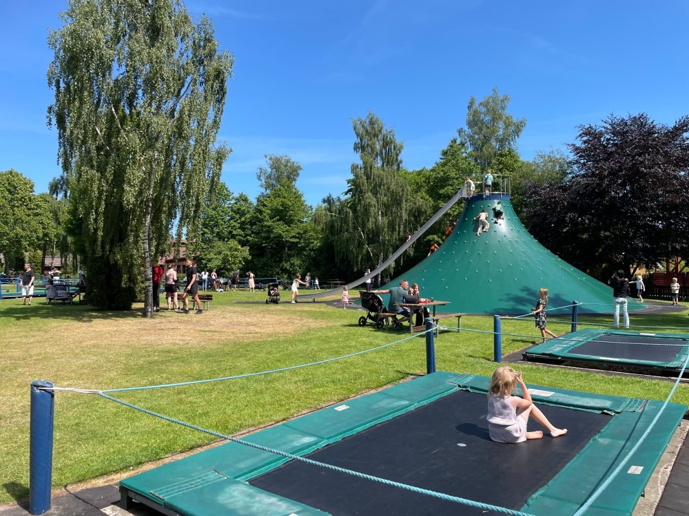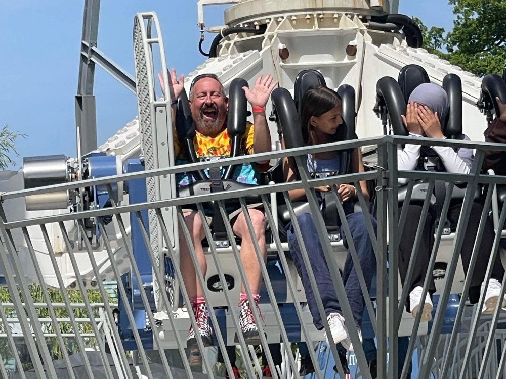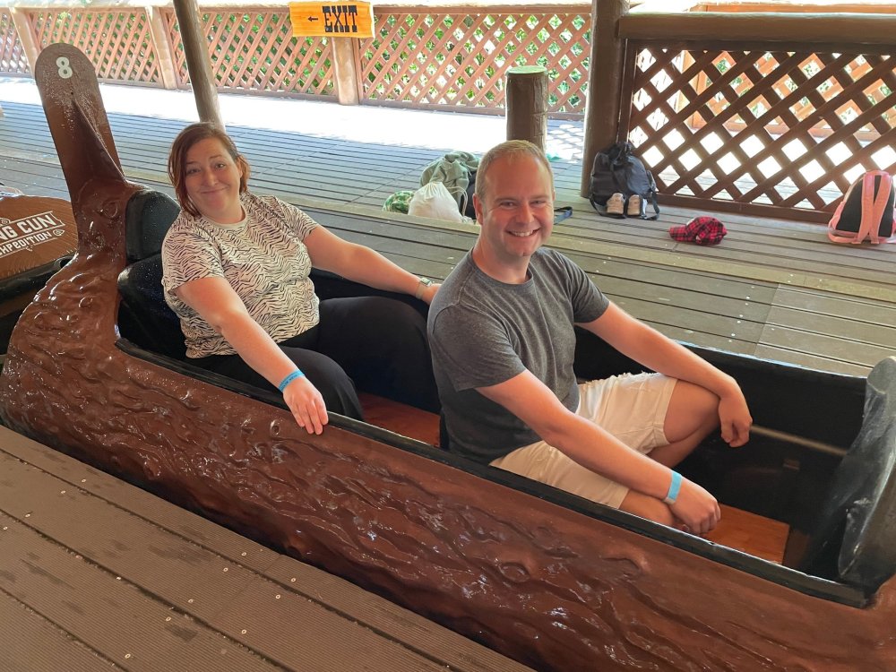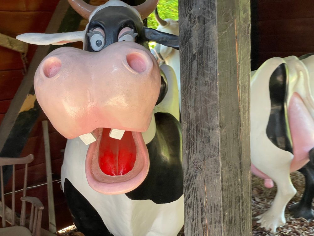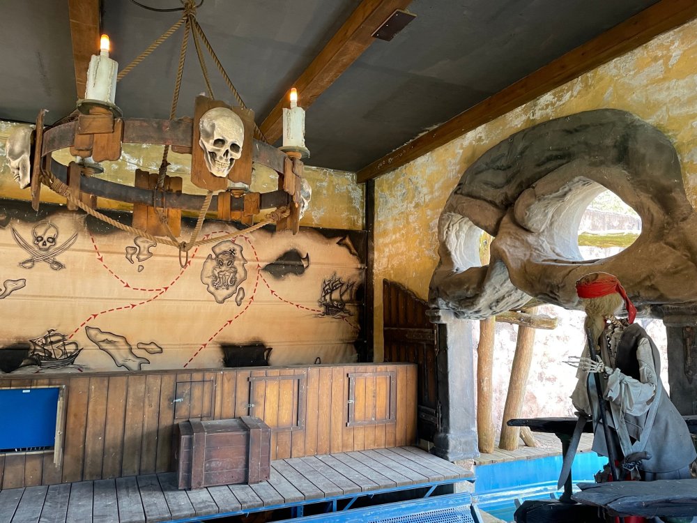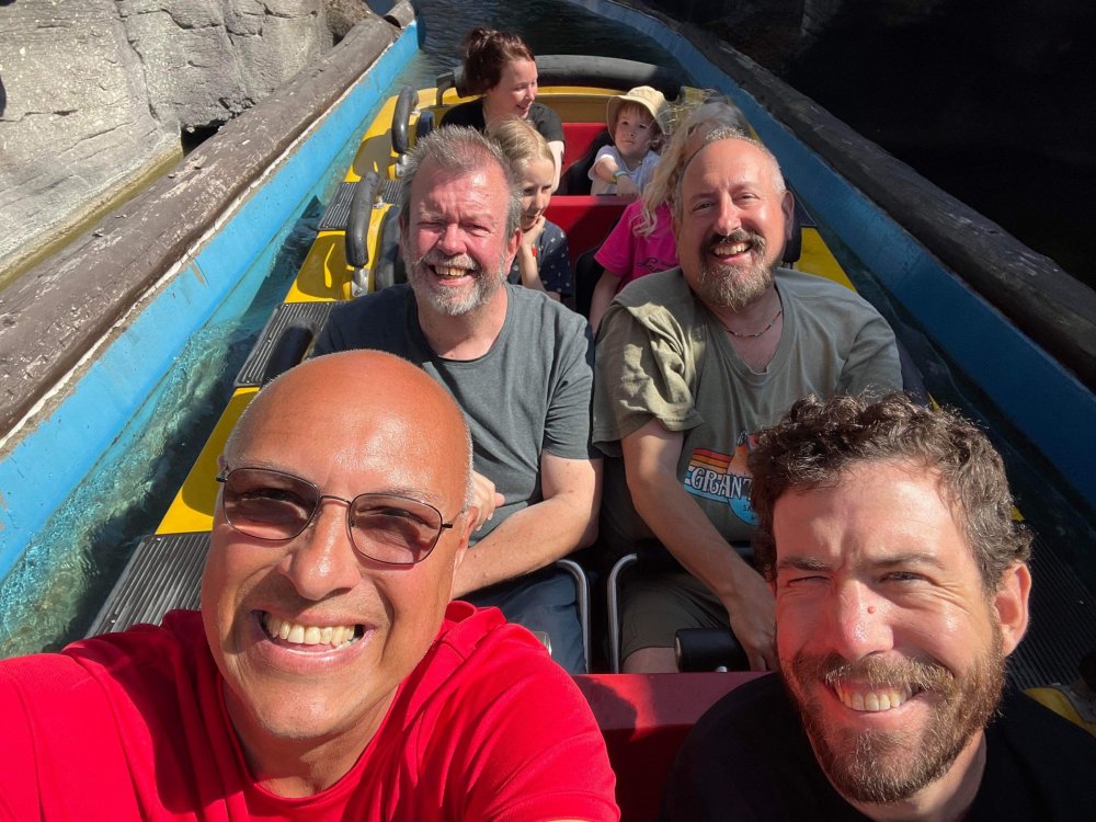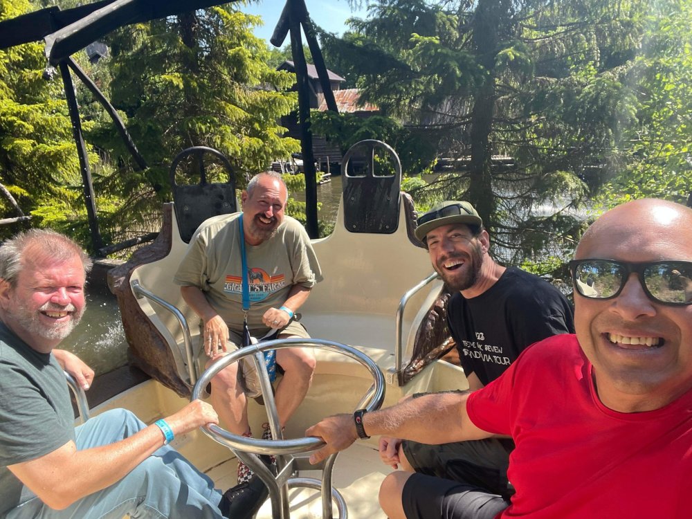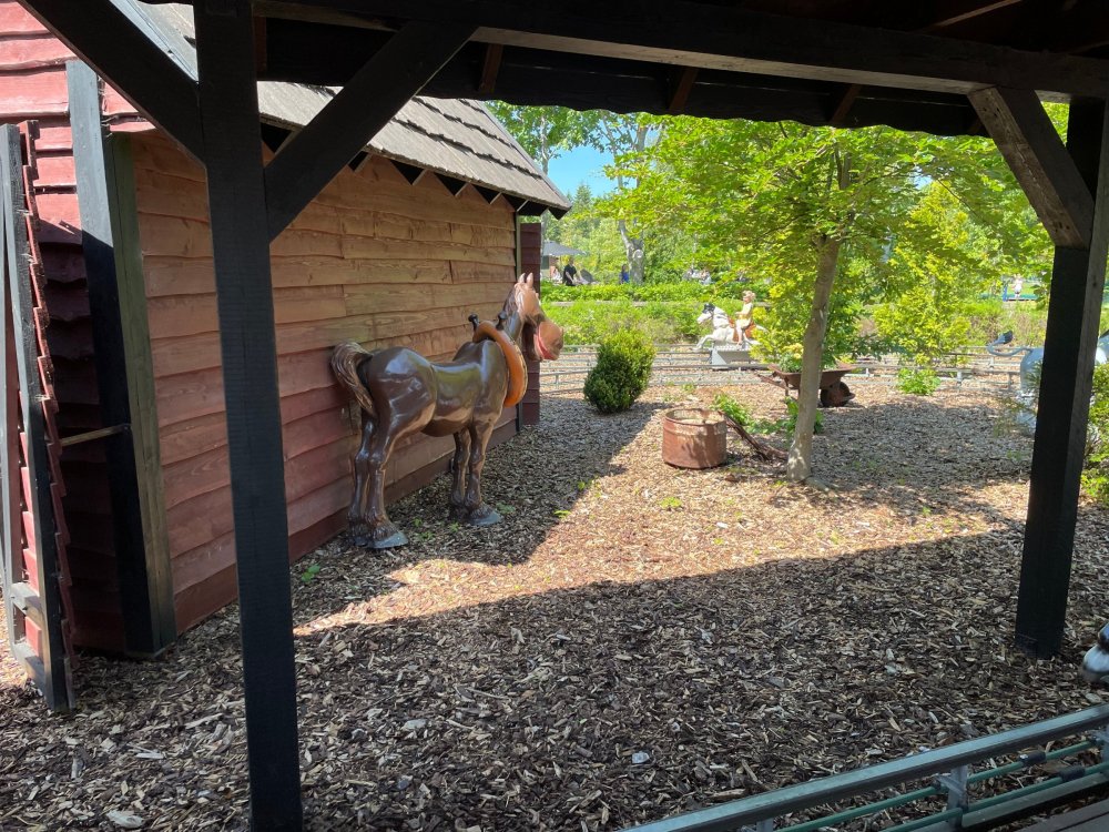 Day 8: Sat, June 10th part 2 (of 2): Djurs Sommerland we headed over to "Vikingeland" section of the park, for the next coaster on our hitlist: Thor's Hammer - a Gerstlauer Bobsled coaster some nice ride theming here, but this was one of the sections where the operators were wearing kahkis (I was hoping for heavy fur vests. . LOL) Don't forget. . Thor died on the cross for you. . . or something. .what do I know? I'm Jewish | as mentioned. . great theming thruout the park. . . even if the trains scream "traveling carnival" (and you can catch the bottom half of an operator's Viking Khakis in this pic) a really fun bobsled tho. . with some of it over the water - and thru a house! in the lake there on the left, one can go around the island in either a canoe or a paddle boat. it was hilarious, because they apparently just put the people in them and let them go - regardless if they know how to paddle (or steer). there was a canoe with four little kids in it, stuck on this turn here for a good 15 minutes as we watched them panic and try to paddle with their hands to move (someone finally came along in a boat and helped them) a self operating "pulley" ride that are "poles with helmets on them". . that's ALL they are. get your minds out of the gutter! here's the station where you can get either a canoe or paddleboat. Didier and I sat on a bench and watched as brave folks decided they wanted to paddle the lake. no shade, but I think David paddled for all. . . it wasn't quite time for lunch yet, so we passed back thru DinosaurLand (where lunch was to be) hence another pic of the Disc-O (the park also has a decent sized waterpark area called "VandLand". . but I'm not sure if any of the folks on the trip went to the waterpark here) and back into Westernland. .the theming on the outside of the Bumper Cars building I didn't actually look at them to see if the cars themselves were themed to Buffalo or not.. .but thought it was rather cool that the kiddie version is in the same building as the adult version. not a Bumper Cars rider. . but a Pony Espressen? Yes please! whee! the park also has a wave swinger called "Wild West Carousel". . . I don't typically ride these, but this one ran forwards, and then backwards, which looked like a unique ride experience (and it was). oh, it also shoots water up at you to try and get you wet. heading back for lunch, some I was with wanted to ride the Disc-O. these always make me a bit nauseous, and I certainly didn't want that right before lunch. .so I passed. tho managed to get pics of them on it. Can you tell which pic is before they noticed me with the phone up, and which is after? Lunch was a PACKED Pizza buffet. I recall it had some really weird stuff on it - such as corn pizza ?? but it certainly wasn't the worst pizza I had, and I recall enjoying it. the table I saw with. at first I thought I had misfiled this, as I don't recall them having one of these (at all). . but I see the dino in the background, so it must still be at Djurs Sommerland, and I just don't remember. this style of ride seems to have gotten popular tho, as I saw it at many parks in Scandinavia on this trip. Universal Denmark? after eating way too much pizza (as you can probably tell from the belly in this pic), needed something calming. So I suggested we ride the train. it's not a full size train like you'd see in USA.. but similar to a lot of the trains in the parks I'd been to in Europe. a lovely route, and gave a great view of the park. Thor's Hammer Juvelen Piraten playground full of ways to injure oneself. . . more playgrounds and trampolines. all really full too! Jonathan and David were eager to try out the King of the Mountain and made it up easily. I watched. oh. .there was plenty to look at. . . . while they attempted to make a hospital visit in a foreign country. . . yeah. . getting up was easy. do you want me to call the fire department to get down now? all played out, we headed into the "kiddie" area, which did have some adult rides. we were ready to ride: Vilde Hønsejagt (the wild chicken hunt) - another Zierer family coaster with lots of chicken theming. . and a fox at the front of the train trying to eat said chicken (I think?) hey. . TPR folks here too! Howdy! Pic courtesy of Didier I believe this was absolutely adorable. . a frog hopper, but themed to pigs in slop. I didn't ride it, but I really wanted to just to say I did I DID ride the classic carousel type ride tho (of course). . with Big Mike and Jonathan and I can't recall if we rode the tractors or not, but I think we did ride a couple of things over here in this section. a wet/dry slide. . . for some reason called Speedy Gonzales. . .hmmmmm. . there was a band playing music, that some folks were hanging out listening to. and we headed over to the one big section of the park we hadn't been in yet: Piratland this was a kiddie flume ride, Piratefisken, but it looked like there were adults riding with their kids, so got in line to ask. gaaa. . . lots of photo ops where you can get bitten here and a great view of Skatteøen (Treasure Island), the park's Mack Water Coaster from the kiddie flume queue the "boats" (or more realistically, barrels) are tiny, but after bonding with the operator over ABBA (I caught him singing along to "gimme gimme gimme" and joined in with him), he said OF COURSE you can ride, and let us each take a barrel. Said operator. . in a section that is participating in "full immersive costume" he he even let me hold his sword (get your mind out of the gutter!!) for a pic and them offered to take a pic of those of us who were riding before sending us on our way. . . whee!!! (pic courtesy of Andy, I think?) no. . I'm not embarrassed at all. . this was a fun flume! and got me a bit wet too. they also have this really weird "Sword ride over here called Sablen (the Saber) that's kind of a drop ride, but it also sways back and forth kinda like a topple tower. regardless, we got on it and it kinda broke, and we 