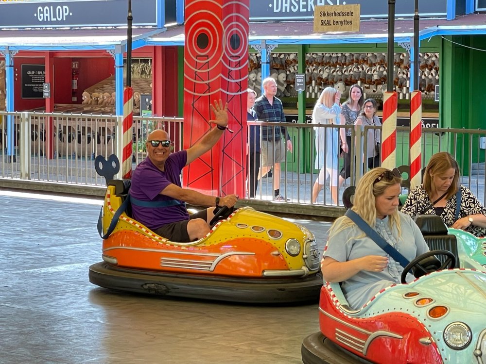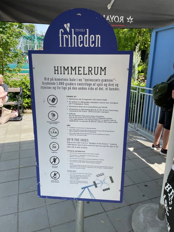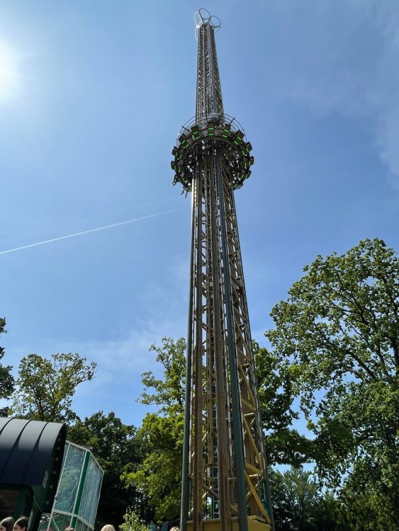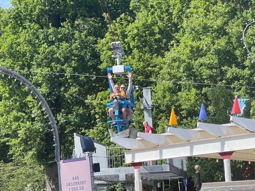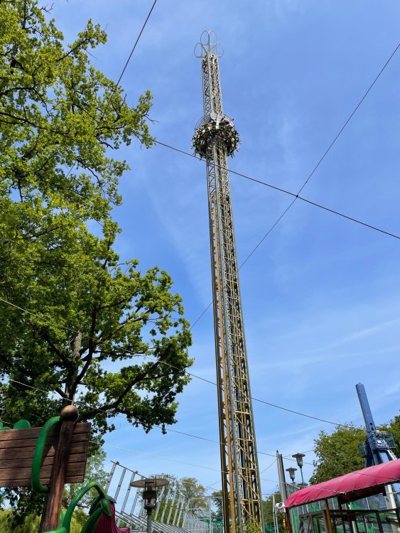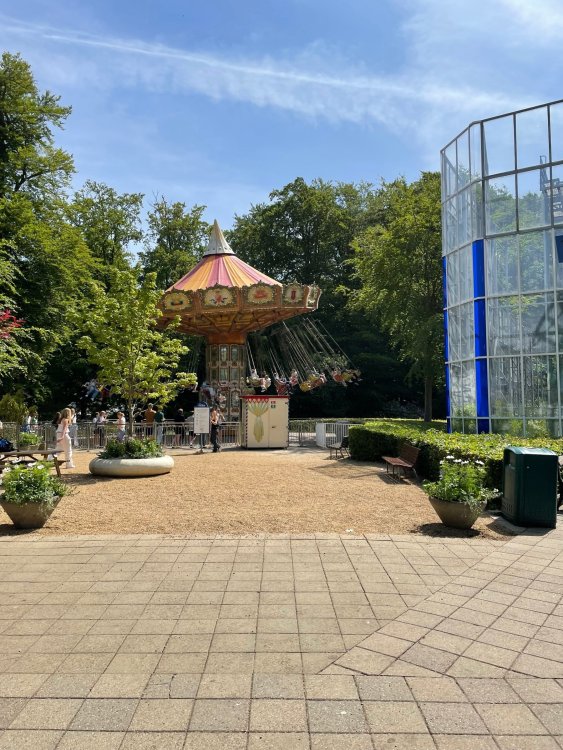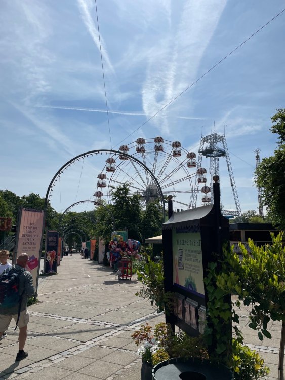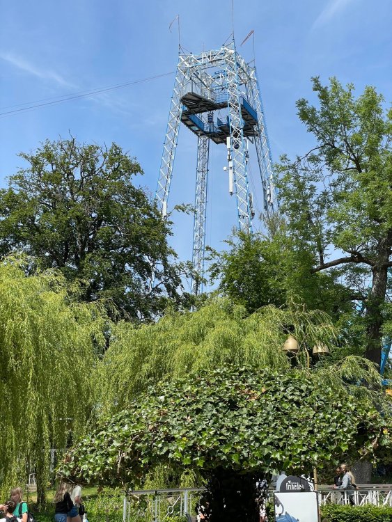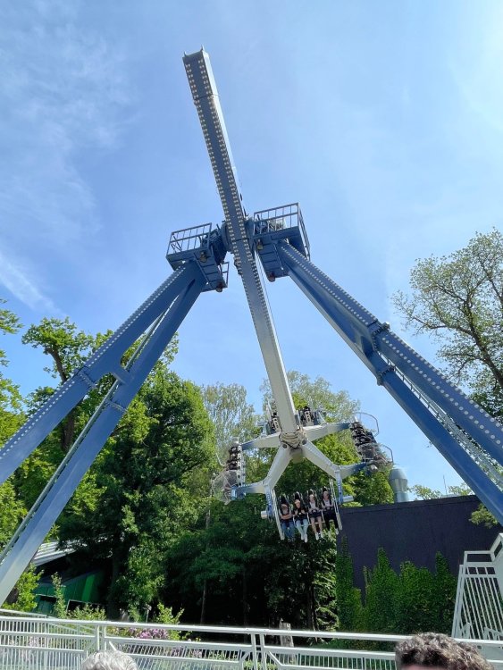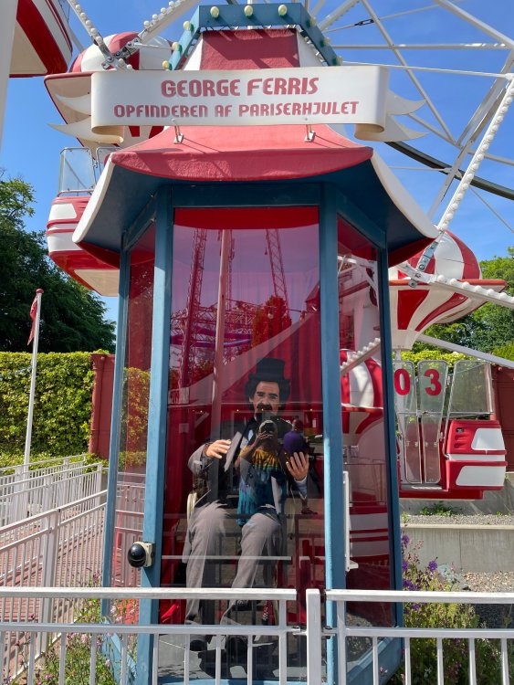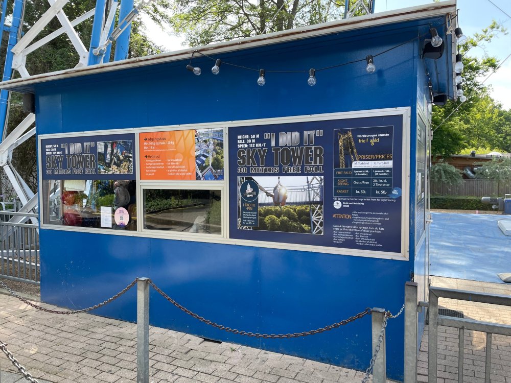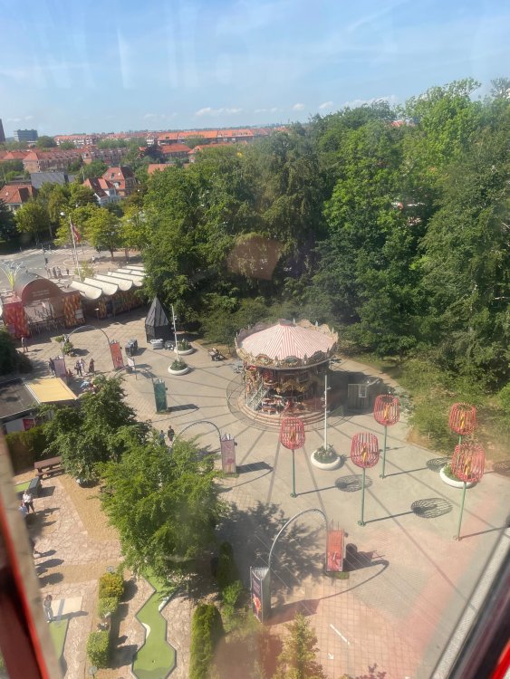 Day 7, June 9th part 1: Tivoli Friheden. getting up early, I took advantage of the nearby Starbucks machine in the gas station and walked over to get coffee, snapping a pic of the front of our hotel. (it looks like an office building outside too. . . . I liked it, very no frills, but comfortable) ok.. NOW I'm ready for the day. I was psyching myself up. why? you'll see. very quiet in the morning in Arhus . . with a lovely church closeby - tho the one time I tried to go take some pics of it, as Big Mike and I got closer to it, we discovered that there was a Casket being unloaded and seemed tacky to take pics during a funeral. (I think I might have some closer shots of it on another day tho). walking back to the Hotel, to get ready for the bus this morning. . we were headed to a smaller park today, Tivoli Friheden, in Arhus Denmark. the "big" reason we were coming here? that tower in the background of the prior pic, and this one below. the last operating SCAD tower in the world. SCAD = Suspended Catch Air Device Tower. and I'm terrified of Heights. yeah. hence the need for coffee this morning. for a smaller park, they do have a lot of rides, tho other than the SCAD tower, nothing really "extreme". . more family thrill stuff. very cute logo tho. Us, along with some school kids (I think?) got entry early and we headed directly for the tower. passing a very nice two tier carousel and a decent ferris wheel. for some reason the Pizza place (called PIT.sa - yeah. .I dunno, but it works, LOL) had Carousel Horses on it's sign. Wasn't super crowded when we went there to eat lunch later. A surprise, as the park was full of school kids. but it made for a nice quiet meal later. Standing at the base of the tower, I started to have some doubts. not everyone was going to ride it.. so there was no shame in backing out. But I had PROMISED myself that I was going to do things I'd be scared to do. My spouse dying suddenly showed me life is short, and there are no guarantees. . so I was determined to ride it - if I could. you see, they have a weight limit - minimum AND a maximum. and they put you on a scale to make sure you fall in that range. I had an out if I was too heavy. . but I actually was a good amount below the top weight. . so I was gonna force myself. tho probably shouldn't have watched the first couple of folks go. . . . when it was my turn, we got suited up - complete with a hard "shell" attached to our backs. here's Steve and I. . . yeah. . look how "confident" I am. (think these pics are courtesy of AJ ?) then they put you into a tiny elevator, and bring you all the way up to the top. here's Jon watching us up there.. he stayed on the ground. smart man. thanks to Elissa (this video) and Robb (the next video). . . my turn is documented from the bottom of the tower, and the top. yes. . I'm quiet. I honestly, was too terrified to scream. I think some folks lost money, if they bet I was gonna be loud. VNSD3606.MOV GEGI8065.MOV but I did it.. my legs were shaky, but I managed to "gracefully" get out of the net at the bottom. and was shocked that I did it. and then immediately broke down crying the moment I had all the gear off. . . . yeah. but I DID it! once i got myself all composed again? I rewarded myself with Ice Cream while watching everyone else who wanted to go, take a turn (the elevator only carries 5-6 people at a time, so it was small groups). and then we were given lunch vouchers, and let loose to do what we wished in the park. as not a huge park, with no really extreme coasters, it was an excellent opportunity to spend just half a day here, and then take in some local sights/museums. . as there are lovely canals and architecture here in the city. this is one of the 3 coasters in the park: Tyfonen - a spinning wild mouse. (or is it called Spiseriet ? I didn't see the Tyfonen naming on the outside of this ride) (the park used to have a Suspended looping coaster - extreme - but after some injuries / deaths, the park removed it last year. . tho the ride pad is still there, now with some "jumping" playground stuff there. and they did just announce a decent sized new coaster will be coming in 2024. . I'd assume in that spot) Here's Jonathan, myself and Ian after we finished spinning. . pic, I think, courtesy of Jon? you are EVIL. . I did you once. . never again. . . . well. . not in the same way, I guess. . . Somehow I didn't get a pic of the outside of this ride, but it just cracked me up. at one point it clearly was a haunted house ride thru. then they apparently decided to make it like Resident Evil with Zombies among the haunted house. . oh, and make it a shooting ride. in 3D - which didn't work that well (think un-maintained Six Flags Level). I mean, if you're going to SHOOT, might as well be fully immersive and make the riders cops. well. . we can slap "Police" on the side of the ride vehicle.. that makes it fully immersive, right? it was so hysterically awful. . with the vast majority of the 4 3D screens being blurry messes, even with the glasses on - that made everything else so dark, so the remaining practical effects that were NOT part of the shooting became really hard to see. and for some reason the "scorboard" at the load station, not at the exit. very pointless. . but funny to ride (once) for the "what the F did I just ride?" quality. I mean. . look at the front of that vehicle. It's a POLICE CAR, I tell ya!!! this is another of the rides I forced myself to get on. . I was terrified of it, and this is really the only other "thrill ride" in the park. heck..it's in the park logo, showing it going almost upside-down with free spinning seats. But I took a deep breath and got on it. and it ran a SUPER gentle program. these pics are really as high as it went, and the seats did not free spin (I asked the op about it when he was uncuffing us, and he said the seats hadn't flipped in a while, they stopped doing that). I have to wonder if it ran a more gentle program because of all the kids