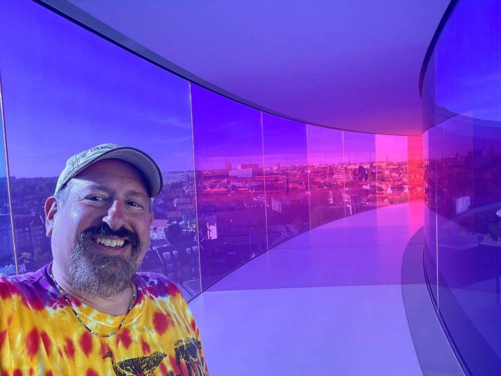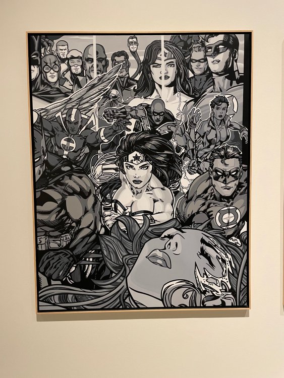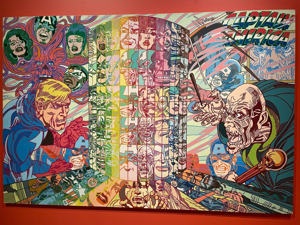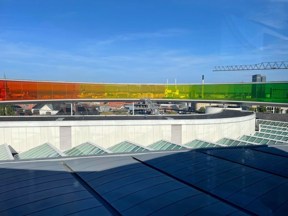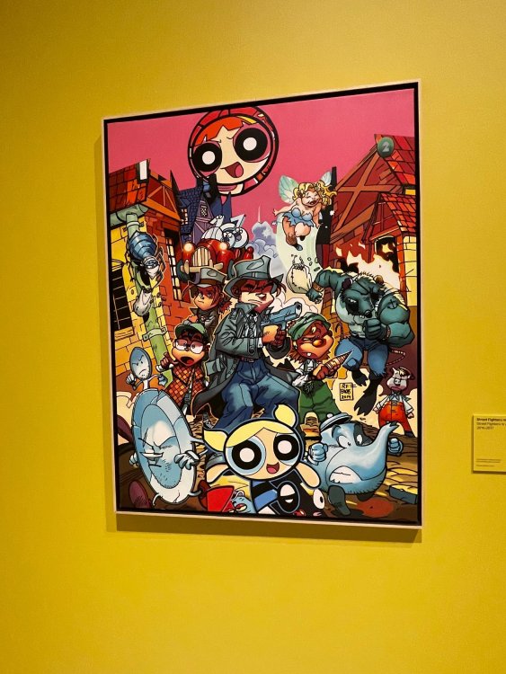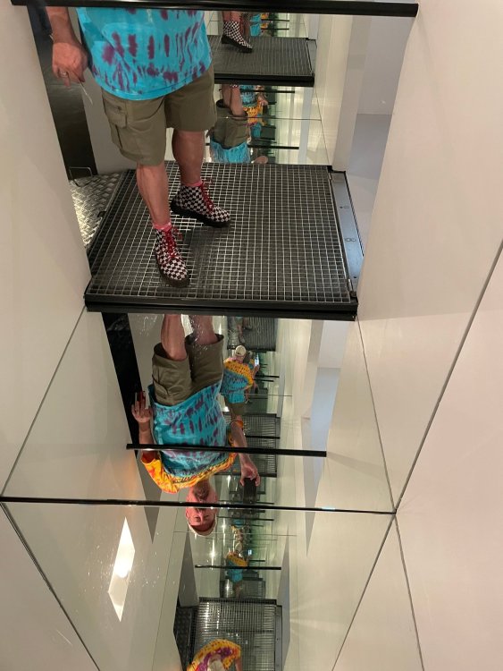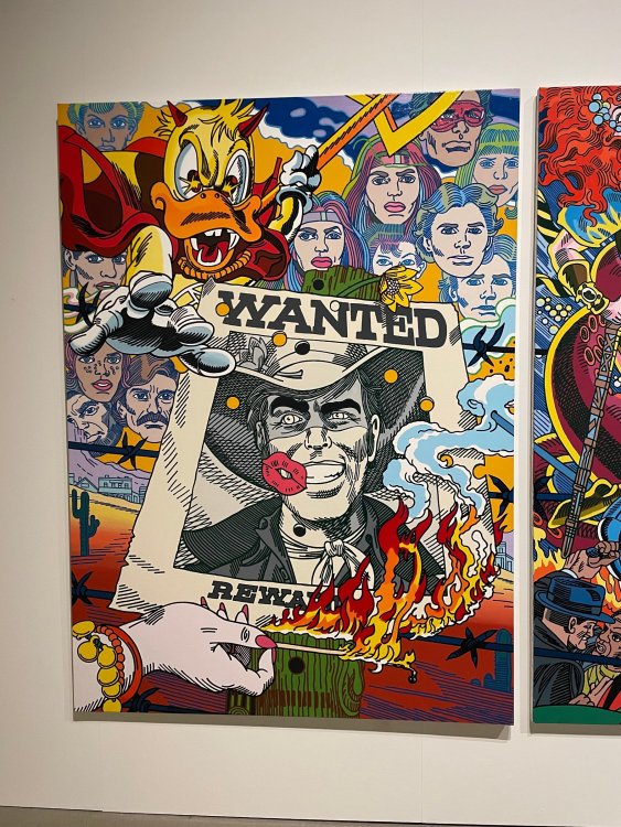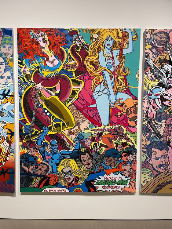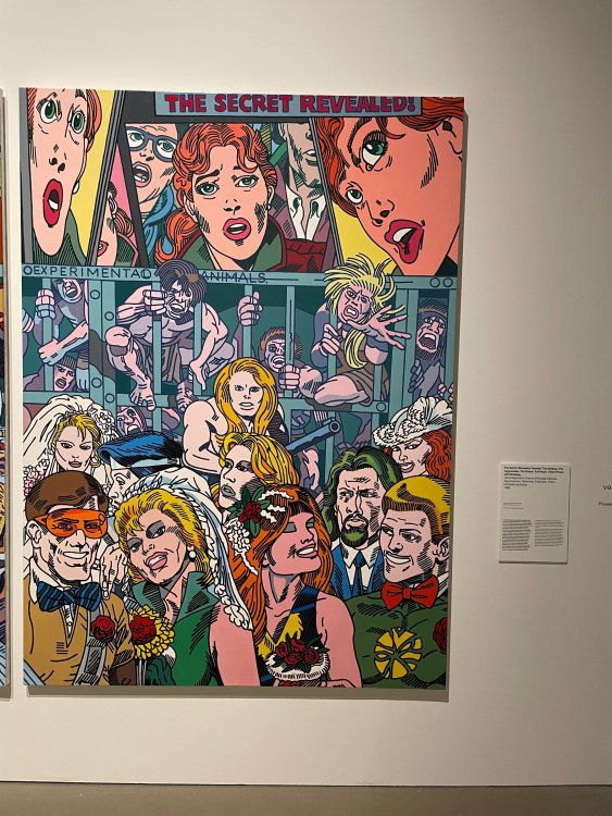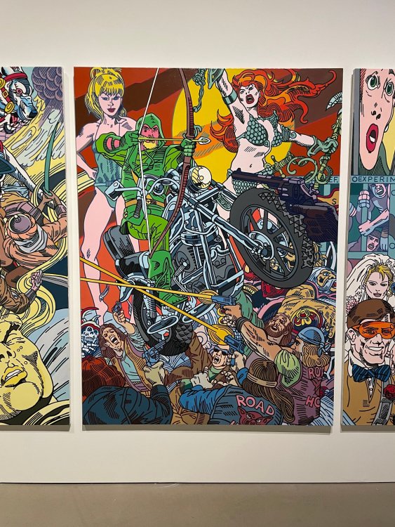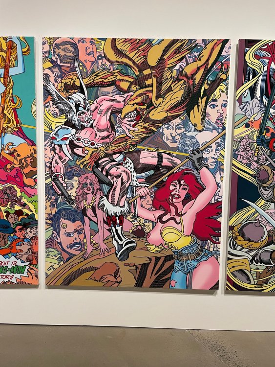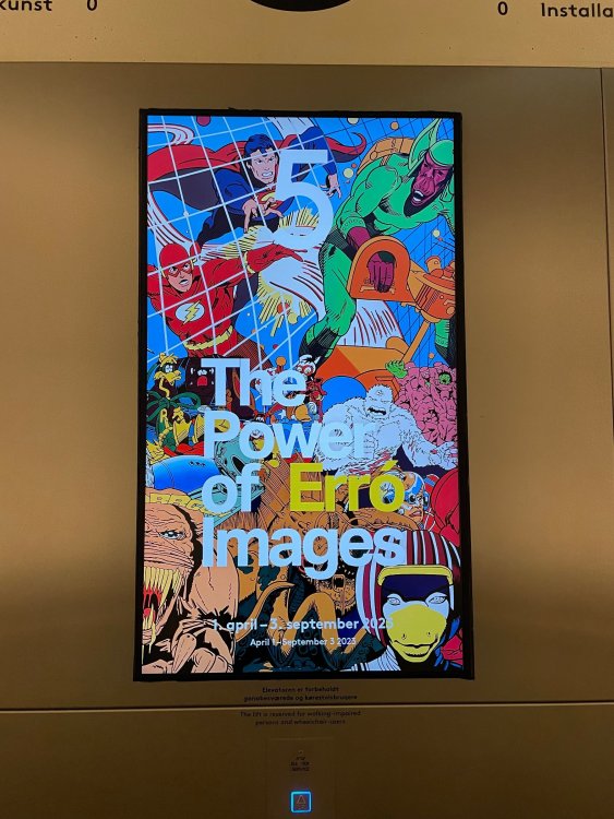 Day 7, June 9th part 2 (of 3): afternoon/evening: How about some Culture? the group I had ended up closing out Tivoli Friedhen with wasn't he only group that also wanted to check out some of the stuff in Aarhus - in particular the ARoS Aarhus Art Museum (which was open until 9pm). but i think we might be the only group that looked at a map, said "nope, that's too far to walk" and Uber-ed it not exactly sure what this building was across the street from the museum, but I thought the architecture was interesting, and so snapped a couple of pics. here is the main entrance to ARoS. . . with a glimpse of the permanent installation on the roof, that made this a "must stop" when I was in town: "Your Rainbow Panorama" by Danish-Icelandic artist Olafur Eliasson. once up the long steps into the main entrance to the museum, one is greeted by this stunning circular staircase - very reminiscent of the Guggenheim in Manhattan. I didn't check, but would venture a guess that this museum is by the same designer. In addition to the "rainbow bridge" installation, what sold the museum for me, was this special exhibit that took the entire 5th floor. basically Propaganda Images as seen thru the lens of Pop Art. as a huge fan of Pop Art, I was very excited for this (and as a comics fan, seeing characters I know in the art is a huge burst of excitement). but first we were headed to the roof (at the recommendation of the security guard by the elevator, who VERY RIGHTLY pointed out that the "Your Rainbow Panorama" gets very humid as it absorbs the sun, so do that one first and then enjoy the rest of the cooler museum. up on the top floor, this installation is very, very cool. it's a 150 metre long circular walkway that gives fantastic views of the city, thru panels that are shaded in the colors of the rainbow. looking out thru the one clear panel, at the walkway around the roof. this is construction for a new wing of the museum. . I believe they said it's going to be a planetarium. this pic is courtesy of Andy - who had walked to the museum with his group and was out on the roof itself taking pictures of the city and the port. He saw me in the exhibit and waved and took a pic it really was rather hot in the artwork, so I stepped down to the roof, proper, to get some pics of the city. and some birds, just hanging out. it really is a lovely city. . with lots and lots of really neat architecture. I really love how with the correct angle of the sun, the rainbow from the installation shows up on the surrounding buildings. floor 10 done, we went to Floor 8, for the "Human Nature" works from the museum collection: very very interesting. . a tree made from leaves pressed between panes of glass then hung as a mobile. that this neon is in a museum made me giggle. . .I think most everyone snapped a pic of this. we then headed down to floor 6, titled "Far From Home II" more works from the museum collection - including the piece that the museum is most well known for: Boy - by Australian artist Ron Mueck this is a huge, and VERY realistic sculpture, and has an entire space (mirrored) in the gallery to itself. down on this floor was more my type of "pop art" stuff, and I started taking more pictures - tho not as many as I'd take of the actual Propoganda as Pop Art on level 5 regardless, I didn't understand this one at all. . but I found it beautiful and disturbing at the same time. and I just adored this 5 pic sculpture progression of "Melt" they even had one piece of Proper "Pop Art" on display up here, using Jack Kirby Panels from Captain America. not quite as successful as what Lichetenstein was doing with the comic panels. . but I do like it. . . then going down to the main Exhibit I was interested in, the very first thing greeted by is a huge canvas titled "Fucky-Strike Bureau of propoganda". .and I already knew I was gonna love this exhibit, and spend more time here than Doug, Hawk, or Big Mike cared to (I was correct. . eventually Doug and Hawk split off to get food and Big Mike hung in there with me to finish the museum and do a few other things). this multimedia piece against stark walls, in a dead end - was very much like watching a classic Nine Inch Nails video. fantastic. . as a temporary exhibition they didn't really have any magnets avail with these (only some prints). lucky me, as I saved a ton of $$. (no wall space for prints unless I simply MUST have them. . and was able to pass on these, as much a I loved some of them) hey. . I recognize that Chipmunk with Santa! seriously. . all of these are just amazing. (and full of easter eggs for a comic book/ comic strip nerd like myself) this was one of my favorite pieces, mixing war with the Kama Sutra. . . I have the original pic, but for sharing here, I've edited. HUGE multi panel mural. . featuring many comic book character likenesses blended in I'll say again. . luckily I dont' have much wall space (and wasn't gonna spend a bunch of $$ on prints to schlep around for the rest of the trip). . so I just enjoyed here and took lots of pics heavy R. Crumb influence/borrowing in these. . . even the Powerpuff Girls showed up! to be concluded. . .