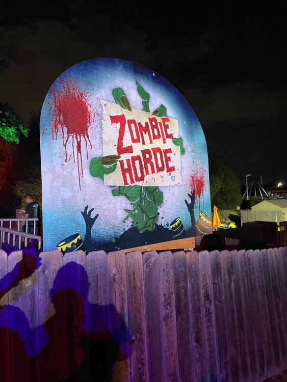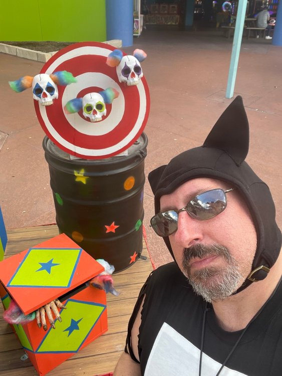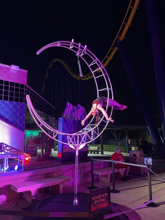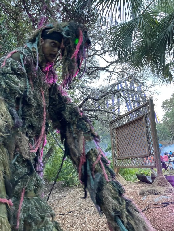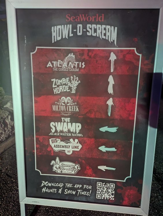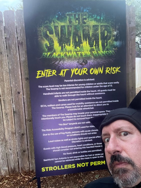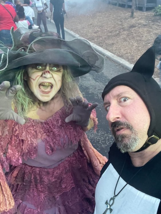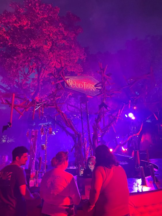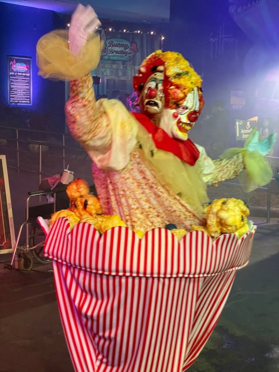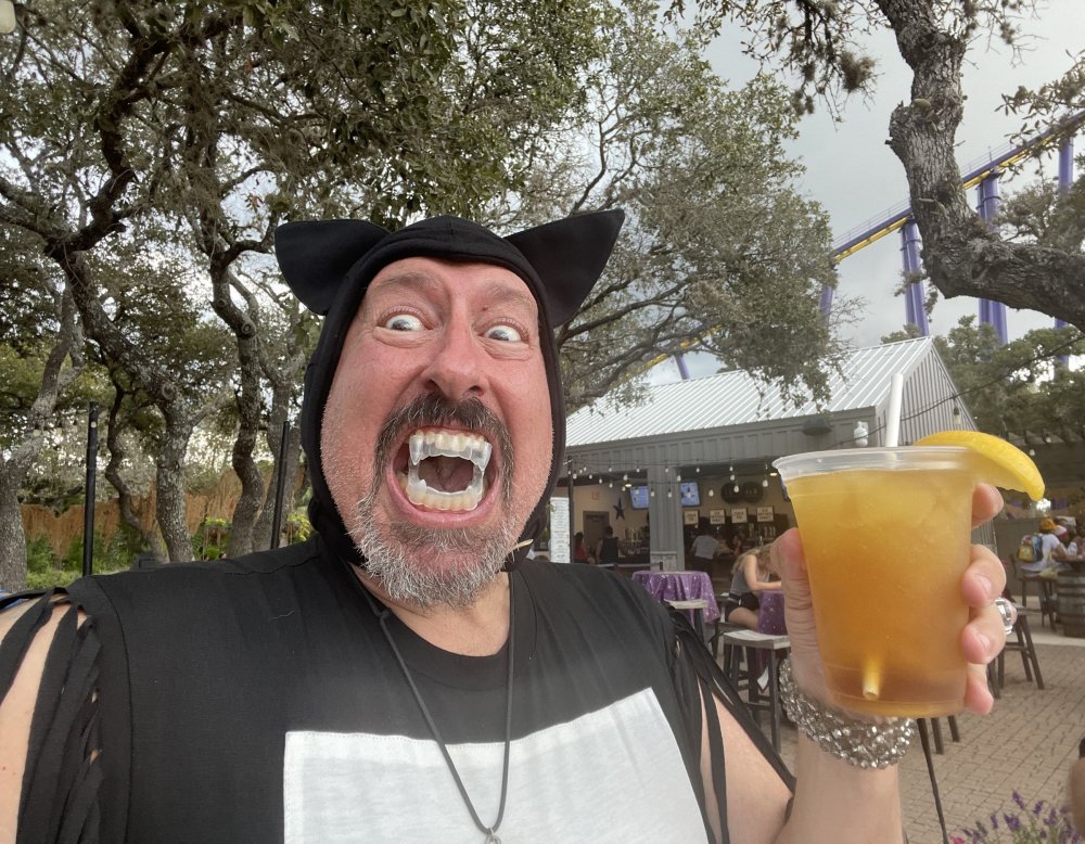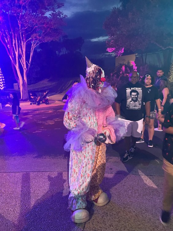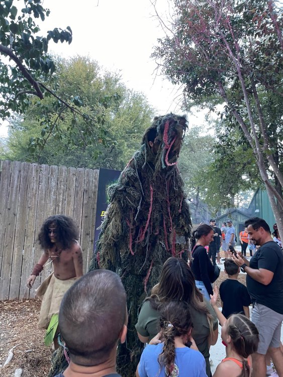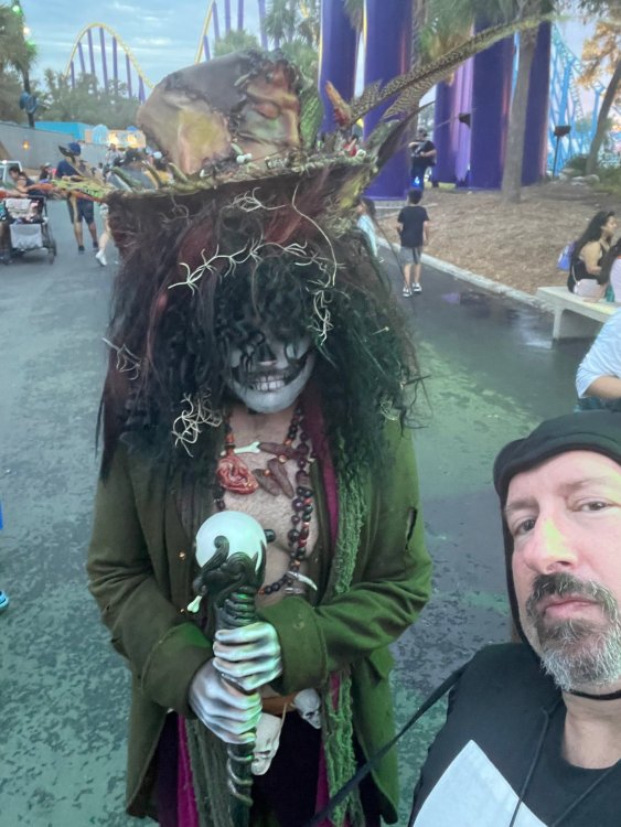 Made a trip to SeaWorld San Antonio yesterday to experience this year's "Howl-O-Scream" event. pretty crowded (wonder if that had to do with SW parks winning best Halloween event in a recent poll?). Regardless, superbly well run. With lines moving thru the 6 (free) houses fairly well, TONS of walkway actors/spooks in the fright zones, bar service pretty well staffed, and lots of entertainment. I also noticed (not tons, but enough to note their presence, which I appreciated greatly, some police officers sprinkled thruout the event, keeping watchful eyes on things. I had a wonderful time, and highly recommend. y'all wanna see some pictures and read some commentary? sure you do! I wore my "bat hat" all day. . kept my bald spot from sunburn. . . .LOL. .tho I got a lot of "I like your costume" comments, and kept saying, this is just from my closet! Even tho the house lines move pretty well? it's SO worth the $$ to pick up some version of the Fright Pass to use the "skip the line" option. With six houses, it's really the only way to get to do everything in one night (I mean, including shows, scare-zones, etc). we got the version that was one trip thru each house, but there are multiple options avail - that also include show seating, ride skip as well as houses, and one with multiple visits to houses. since SeaWorld insists on using these dang paper tickets tho? do what I did - take a pic of it. That way they can just scan it on your phone each time, and you'll probably have your phone out for pictures anyways (yes, phone and video filming IS allowed.. just not flash photography). even before the bars opened (at 5, tho some opened a bit earlier), or the houses opened (at 7), there were street performers out. lol. .and this is why I take so many selfies instead of asking folks to take pics of me. . sorry about that finger. . SWSA does have the Offrenda set up. . .it's just in a different location, around the corner from where it used to be, on the stage area. i think it looks SO much better over here. . and love the tables full of fruit and sugar skulls on the sides. a bar that opened a little early? (Bloodthirsty in the vampire scare zone area)? 1st drinks of the afternoon in hand. . and drinks from Bloodthirsty come with gummy worms and glow in the dark fangs! walking the "Howl o Scream" area, to check out the decorations, even tho the creatures don't really come out until 6:30. At SWSA, the Howl O Scream area is basically all around the lagoon. From Beluga Stadium to the Sesame Street kids area. stopping to take a peek over the construction walls at Catapult Falls. they'd added a ton of signage and some slight theming. The ride does look ready to go. . it must simply be delayed due to some minor issue, or delay getting the inspections done. But I can't wait to ride this. some of the flume vehicles are in the station. . so they HAVE been testing it, even if the flume itself is drained at the moment. we stopped in at the Voodoo Lounge bar for another drink. . this is the Texas Tea frozen drink. as we were sitting directly across from "the Swamp" house, we just decided to join the forming line while we were drinking (and would come back and use the skip the line to go thru again later). so we were in a great position when the denizens of the Swamp scare-zone started coming out: the Swamp |this was the new house two years ago, and tho I enjoyed it, it was pretty lame (I thought), last year as it hadn't aged well. But I had heard rumors that all the houses had made some changes, so was eager to check out. my take on it this year? 1000% improvement over last year. I love that SWSA basically has a "total dark" house now. I know some complained it was too dark, but so what. . I LOVED it. when I say it's dark in there? I mean PITCH BLACK, CANNOT SEE WHERE YOU ARE GOING. They have someone with a light standing over a large prop on the floor as folks kept tripping on it. and the few sections that are a little lighter? yup, fog. . . so it's basically a blackout house. my phone/camera takes excellent night photos, that's the only reason you can make out some of these images. some of the Swamp scare actors on the walkways (we compared ears) we decided to walk back to the front of the Howl-o-Scream area and start at the Atlantis house (over by Journey to Atlantis). . so here's some pics along the way as we headed over there and it started to get darker. this is the "Sindustry" area, in front of Penguin encounters. it was a bit more "family friendly" this year, but still has the DJ, the acrobat, and the Trampoline troupe. and of course, the DO have a bar there for the adults. my favorite area of the park is over near the brand new haunt this year. . .Bunny Bradley's Ice Cream Parlor. . with so many street scarers out. . all as evil clowns. tho I loved this ringmaster outfit too. full 360 creepy as hell costume we'll hit this when we come back this way. . . but here's the queue line (already pretty long, and it was only ~8pm) SWSA was firing on all cylinders yesterday. . .every ride (but Sea Rescue troika) was open, and lines were almost non existent. Note if you're going: the water rides DO close when the houses open (Atlantis uses part of Journey's queue). . so if you want to ride Rio Loco, or Journey to Atlantis? come early enough to get them in before the Howl-O-Scream event starts. but even during the event, all the coasters kept running. We got two walk on rides on Texas Stingray (day & night), and a walk on ride on Journey earlier in the day. we absolutely COULD have done ton more rides, but we were here for the houses. as usual, the only thing with even close to a line was WaveBreaker, which kept a steady 30+ minute or so line the entire day/night. Paid photo op with a werewolf if you wanted to wait in line for that. . . Bloodthirsty was busy when we walked back by. . Atlantis - unfortunately, the weakest house, and a big reason is that it's just so bright in there. The props, and effects are great, a