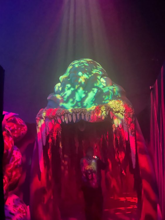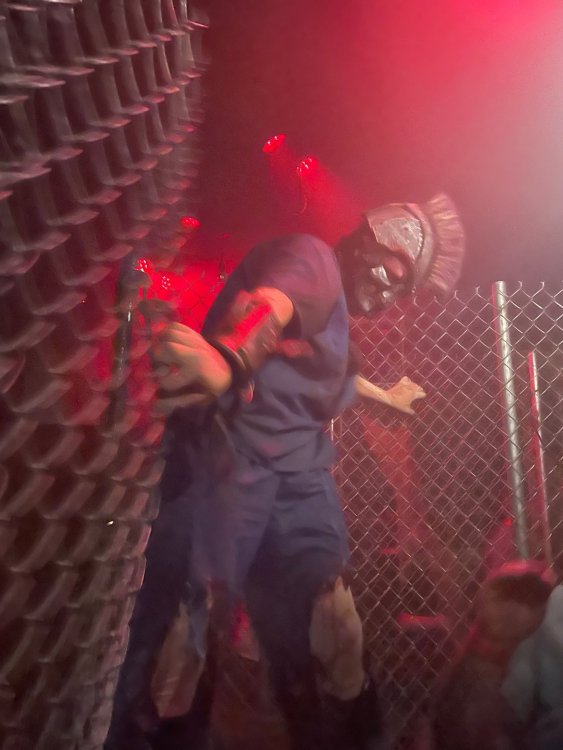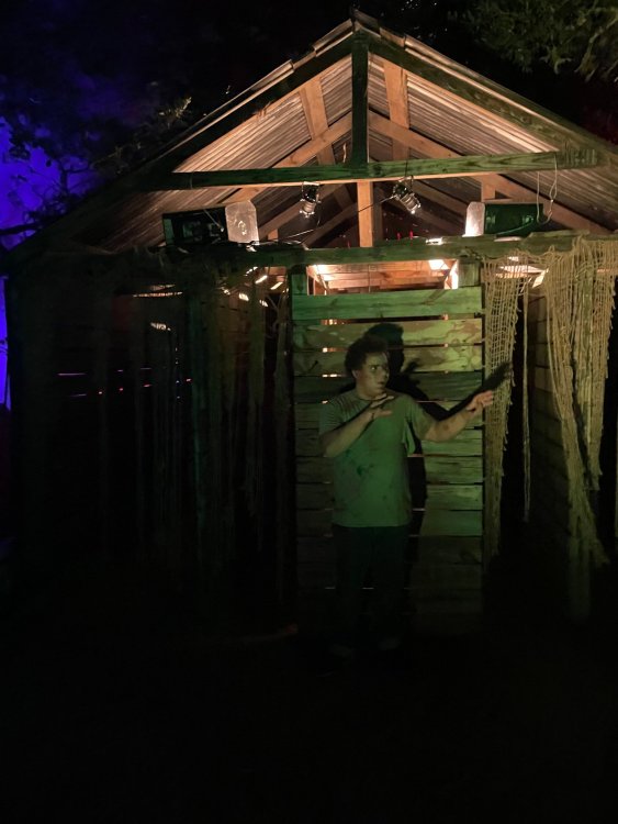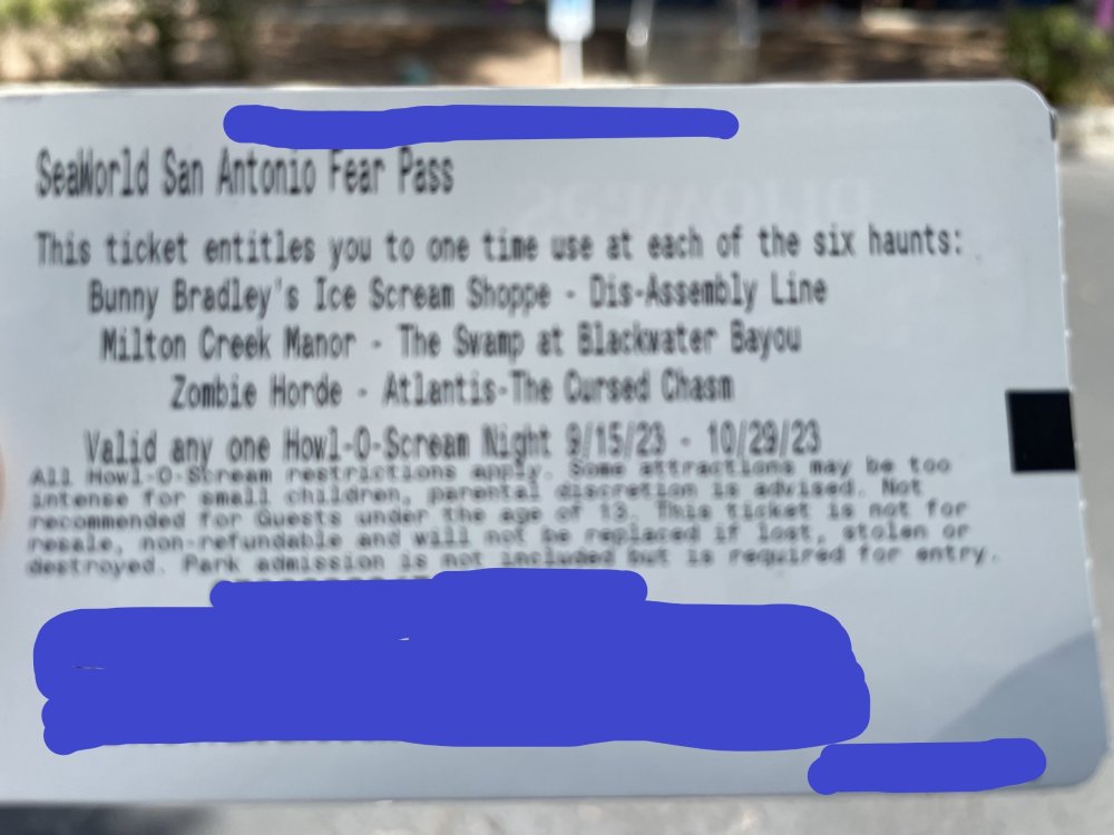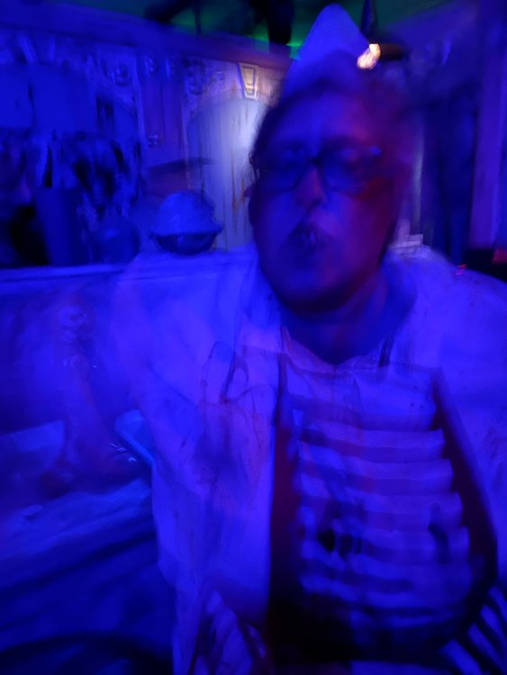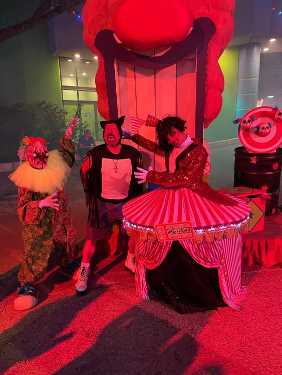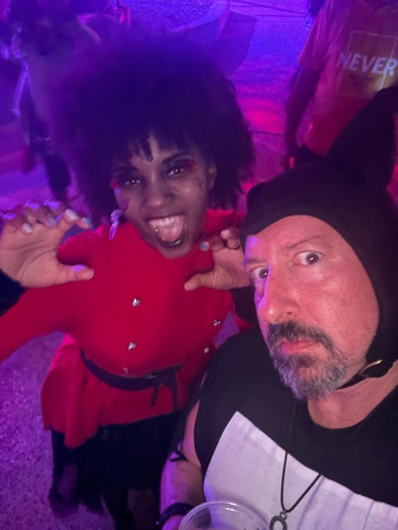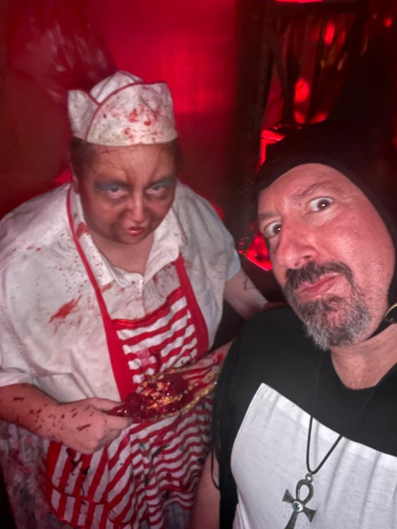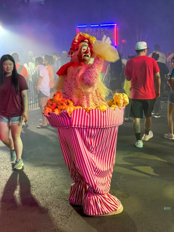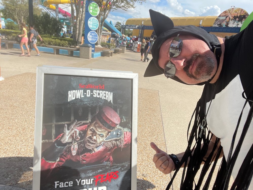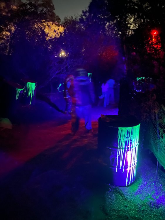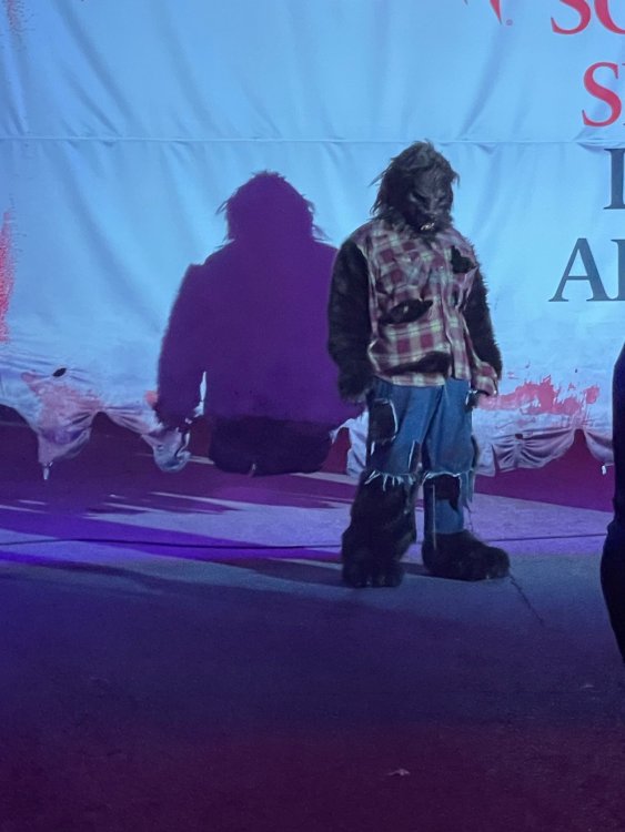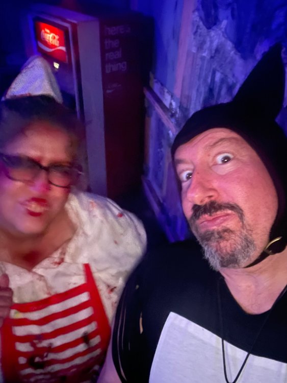 Made a trip to SeaWorld San Antonio yesterday to experience this year's "Howl-O-Scream" event. pretty crowded (wonder if that had to do with SW parks winning best Halloween event in a recent poll?). Regardless, superbly well run. With lines moving thru the 6 (free) houses fairly well, TONS of walkway actors/spooks in the fright zones, bar service pretty well staffed, and lots of entertainment. I also noticed (not tons, but enough to note their presence, which I appreciated greatly, some police officers sprinkled thruout the event, keeping watchful eyes on things. I had a wonderful time, and highly recommend. y'all wanna see some pictures and read some commentary? sure you do! I wore my "bat hat" all day. . kept my bald spot from sunburn. . . .LOL. .tho I got a lot of "I like your costume" comments, and kept saying, this is just from my closet! Even tho the house lines move pretty well? it's SO worth the $$ to pick up some version of the Fright Pass to use the "skip the line" option. With six houses, it's really the only way to get to do everything in one night (I mean, including shows, scare-zones, etc). we got the version that was one trip thru each house, but there are multiple options avail - that also include show seating, ride skip as well as houses, and one with multiple visits to houses. since SeaWorld insists on using these dang paper tickets tho? do what I did - take a pic of it. That way they can just scan it on your phone each time, and you'll probably have your phone out for pictures anyways (yes, phone and video filming IS allowed.. just not flash photography). even before the bars opened (at 5, tho some opened a bit earlier), or the houses opened (at 7), there were street performers out. lol. .and this is why I take so many selfies instead of asking folks to take pics of me. . sorry about that finger. . SWSA does have the Offrenda set up. . .it's just in a different location, around the corner from where it used to be, on the stage area. i think it looks SO much better over here. . and love the tables full of fruit and sugar skulls on the sides. a bar that opened a little early? (Bloodthirsty in the vampire scare zone area)? 1st drinks of the afternoon in hand. . and drinks from Bloodthirsty come with gummy worms and glow in the dark fangs! walking the "Howl o Scream" area, to check out the decorations, even tho the creatures don't really come out until 6:30. At SWSA, the Howl O Scream area is basically all around the lagoon. From Beluga Stadium to the Sesame Street kids area. stopping to take a peek over the construction walls at Catapult Falls. they'd added a ton of signage and some slight theming. The ride does look ready to go. . it must simply be delayed due to some minor issue, or delay getting the inspections done. But I can't wait to ride this. some of the flume vehicles are in the station. . so they HAVE been testing it, even if the flume itself is drained at the moment. we stopped in at the Voodoo Lounge bar for another drink. . this is the Texas Tea frozen drink. as we were sitting directly across from "the Swamp" house, we just decided to join the forming line while we were drinking (and would come back and use the skip the line to go thru again later). so we were in a great position when the denizens of the Swamp scare-zone started coming out: the Swamp |this was the new house two years ago, and tho I enjoyed it, it was pretty lame (I thought), last year as it hadn't aged well. But I had heard rumors that all the houses had made some changes, so was eager to check out. my take on it this year? 1000% improvement over last year. I love that SWSA basically has a "total dark" house now. I know some complained it was too dark, but so what. . I LOVED it. when I say it's dark in there? I mean PITCH BLACK, CANNOT SEE WHERE YOU ARE GOING. They have someone with a light standing over a large prop on the floor as folks kept tripping on it. and the few sections that are a little lighter? yup, fog. . . so it's basically a blackout house. my phone/camera takes excellent night photos, that's the only reason you can make out some of these images. some of the Swamp scare actors on the walkways (we compared ears) we decided to walk back to the front of the Howl-o-Scream area and start at the Atlantis house (over by Journey to Atlantis). . so here's some pics along the way as we headed over there and it started to get darker. this is the "Sindustry" area, in front of Penguin encounters. it was a bit more "family friendly" this year, but still has the DJ, the acrobat, and the Trampoline troupe. and of course, the DO have a bar there for the adults. my favorite area of the park is over near the brand new haunt this year. . .Bunny Bradley's Ice Cream Parlor. . with so many street scarers out. . all as evil clowns. tho I loved this ringmaster outfit too. full 360 creepy as hell costume we'll hit this when we come back this way. . . but here's the queue line (already pretty long, and it was only ~8pm) SWSA was firing on all cylinders yesterday. . .every ride (but Sea Rescue troika) was open, and lines were almost non existent. Note if you're going: the water rides DO close when the houses open (Atlantis uses part of Journey's queue). . so if you want to ride Rio Loco, or Journey to Atlantis? come early enough to get them in before the Howl-O-Scream event starts. but even during the event, all the coasters kept running. We got two walk on rides on Texas Stingray (day & night), and a walk on ride on Journey earlier in the day. we absolutely COULD have done ton more rides, but we were here for the houses. as usual, the only thing with even close to a line was WaveBreaker, which kept a steady 30+ minute or so line the entire day/night. Paid photo op with a werewolf if you wanted to wait in line for that. . . Bloodthirsty was busy when we walked back by. . Atlantis - unfortunately, the weakest house, and a big reason is that it's just so bright in there. The props, and effects are great, a