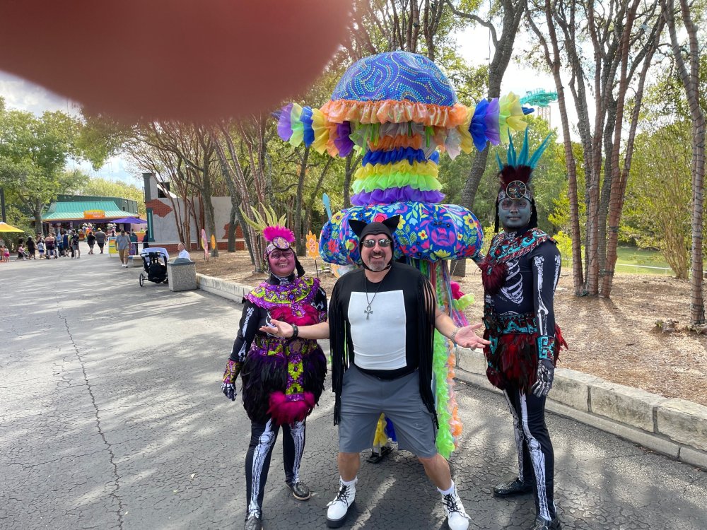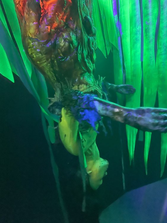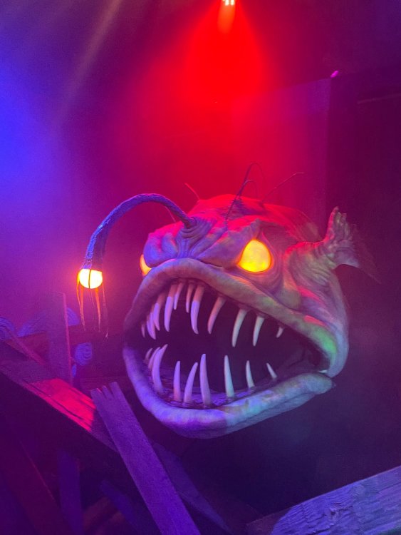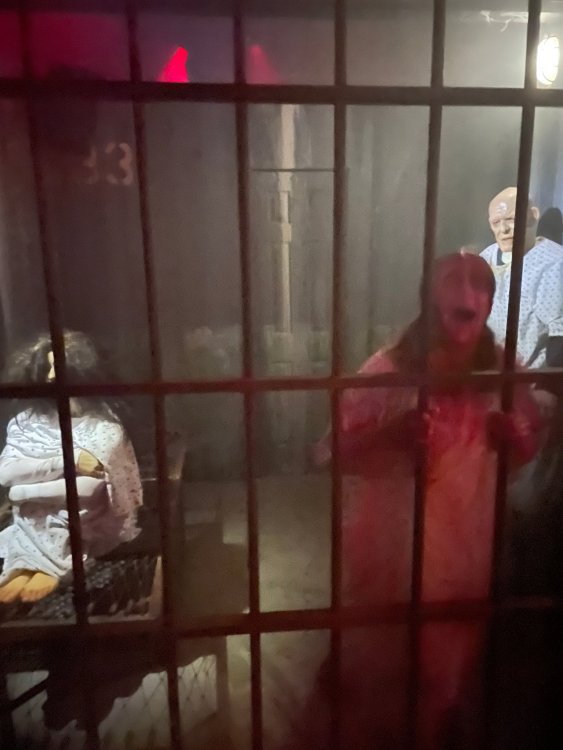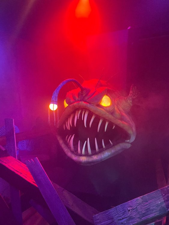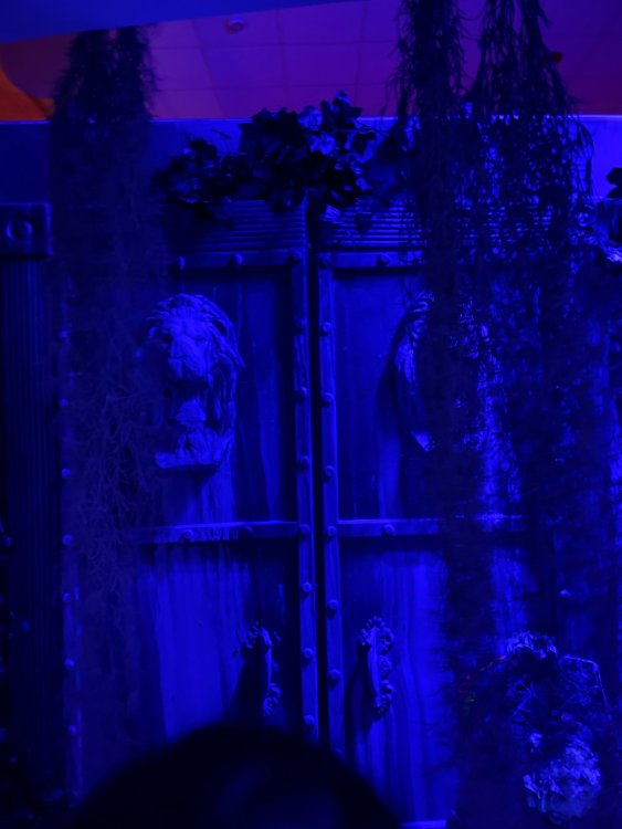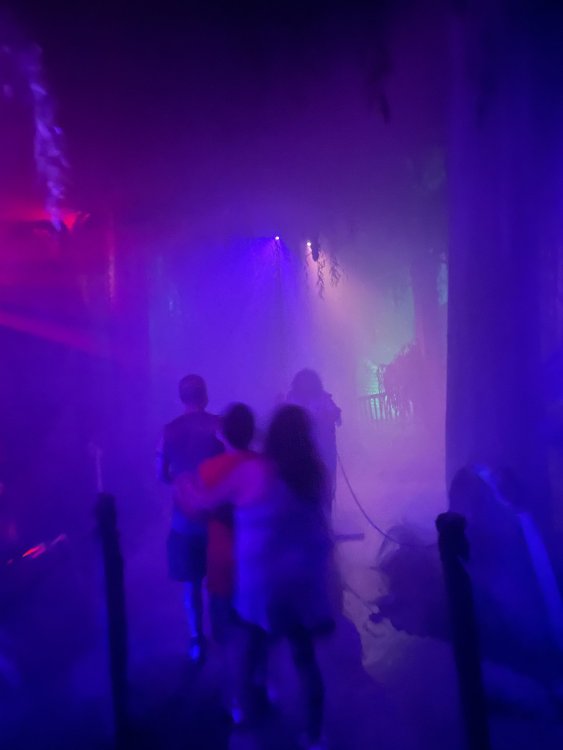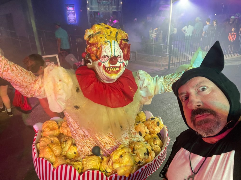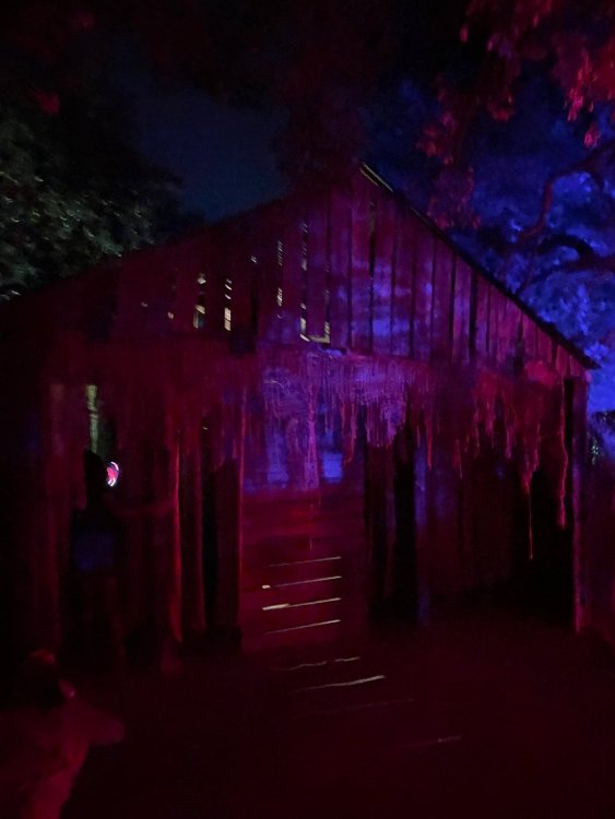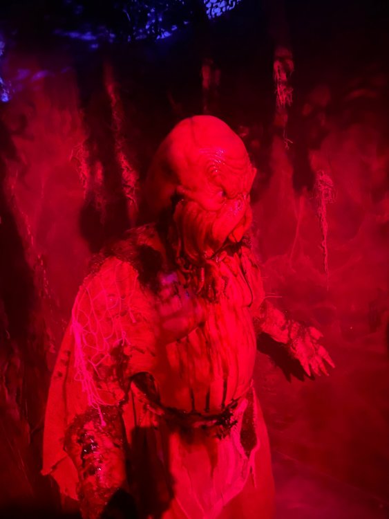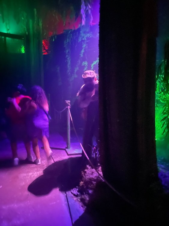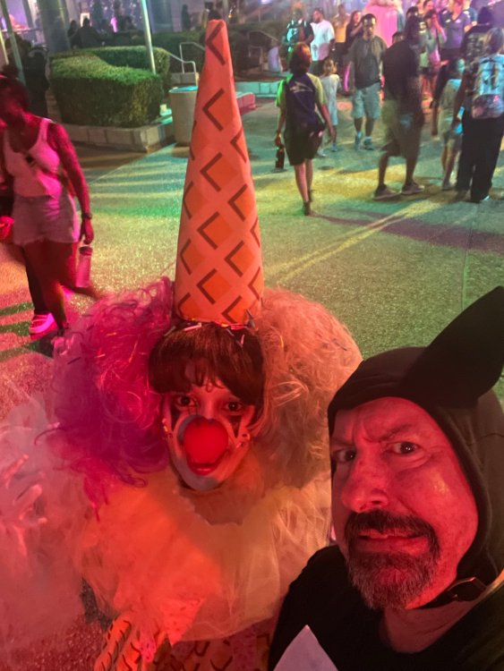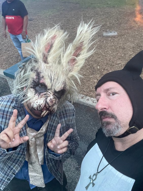 Made a trip to SeaWorld San Antonio yesterday to experience this year's "Howl-O-Scream" event. pretty crowded (wonder if that had to do with SW parks winning best Halloween event in a recent poll?). Regardless, superbly well run. With lines moving thru the 6 (free) houses fairly well, TONS of walkway actors/spooks in the fright zones, bar service pretty well staffed, and lots of entertainment. I also noticed (not tons, but enough to note their presence, which I appreciated greatly, some police officers sprinkled thruout the event, keeping watchful eyes on things. I had a wonderful time, and highly recommend. y'all wanna see some pictures and read some commentary? sure you do! I wore my "bat hat" all day. . kept my bald spot from sunburn. . . .LOL. .tho I got a lot of "I like your costume" comments, and kept saying, this is just from my closet! Even tho the house lines move pretty well? it's SO worth the $$ to pick up some version of the Fright Pass to use the "skip the line" option. With six houses, it's really the only way to get to do everything in one night (I mean, including shows, scare-zones, etc). we got the version that was one trip thru each house, but there are multiple options avail - that also include show seating, ride skip as well as houses, and one with multiple visits to houses. since SeaWorld insists on using these dang paper tickets tho? do what I did - take a pic of it. That way they can just scan it on your phone each time, and you'll probably have your phone out for pictures anyways (yes, phone and video filming IS allowed.. just not flash photography). even before the bars opened (at 5, tho some opened a bit earlier), or the houses opened (at 7), there were street performers out. lol. .and this is why I take so many selfies instead of asking folks to take pics of me. . sorry about that finger. . SWSA does have the Offrenda set up. . .it's just in a different location, around the corner from where it used to be, on the stage area. i think it looks SO much better over here. . and love the tables full of fruit and sugar skulls on the sides. a bar that opened a little early? (Bloodthirsty in the vampire scare zone area)? 1st drinks of the afternoon in hand. . and drinks from Bloodthirsty come with gummy worms and glow in the dark fangs! walking the "Howl o Scream" area, to check out the decorations, even tho the creatures don't really come out until 6:30. At SWSA, the Howl O Scream area is basically all around the lagoon. From Beluga Stadium to the Sesame Street kids area. stopping to take a peek over the construction walls at Catapult Falls. they'd added a ton of signage and some slight theming. The ride does look ready to go. . it must simply be delayed due to some minor issue, or delay getting the inspections done. But I can't wait to ride this. some of the flume vehicles are in the station. . so they HAVE been testing it, even if the flume itself is drained at the moment. we stopped in at the Voodoo Lounge bar for another drink. . this is the Texas Tea frozen drink. as we were sitting directly across from "the Swamp" house, we just decided to join the forming line while we were drinking (and would come back and use the skip the line to go thru again later). so we were in a great position when the denizens of the Swamp scare-zone started coming out: the Swamp |this was the new house two years ago, and tho I enjoyed it, it was pretty lame (I thought), last year as it hadn't aged well. But I had heard rumors that all the houses had made some changes, so was eager to check out. my take on it this year? 1000% improvement over last year. I love that SWSA basically has a "total dark" house now. I know some complained it was too dark, but so what. . I LOVED it. when I say it's dark in there? I mean PITCH BLACK, CANNOT SEE WHERE YOU ARE GOING. They have someone with a light standing over a large prop on the floor as folks kept tripping on it. and the few sections that are a little lighter? yup, fog. . . so it's basically a blackout house. my phone/camera takes excellent night photos, that's the only reason you can make out some of these images. some of the Swamp scare actors on the walkways (we compared ears) we decided to walk back to the front of the Howl-o-Scream area and start at the Atlantis house (over by Journey to Atlantis). . so here's some pics along the way as we headed over there and it started to get darker. this is the "Sindustry" area, in front of Penguin encounters. it was a bit more "family friendly" this year, but still has the DJ, the acrobat, and the Trampoline troupe. and of course, the DO have a bar there for the adults. my favorite area of the park is over near the brand new haunt this year. . .Bunny Bradley's Ice Cream Parlor. . with so many street scarers out. . all as evil clowns. tho I loved this ringmaster outfit too. full 360 creepy as hell costume we'll hit this when we come back this way. . . but here's the queue line (already pretty long, and it was only ~8pm) SWSA was firing on all cylinders yesterday. . .every ride (but Sea Rescue troika) was open, and lines were almost non existent. Note if you're going: the water rides DO close when the houses open (Atlantis uses part of Journey's queue). . so if you want to ride Rio Loco, or Journey to Atlantis? come early enough to get them in before the Howl-O-Scream event starts. but even during the event, all the coasters kept running. We got two walk on rides on Texas Stingray (day & night), and a walk on ride on Journey earlier in the day. we absolutely COULD have done ton more rides, but we were here for the houses. as usual, the only thing with even close to a line was WaveBreaker, which kept a steady 30+ minute or so line the entire day/night. Paid photo op with a werewolf if you wanted to wait in line for that. . . Bloodthirsty was busy when we walked back by. . Atlantis - unfortunately, the weakest house, and a big reason is that it's just so bright in there. The props, and effects are great, a