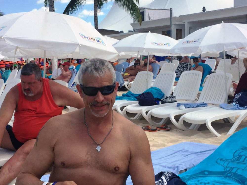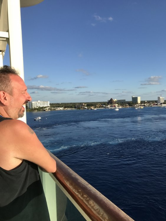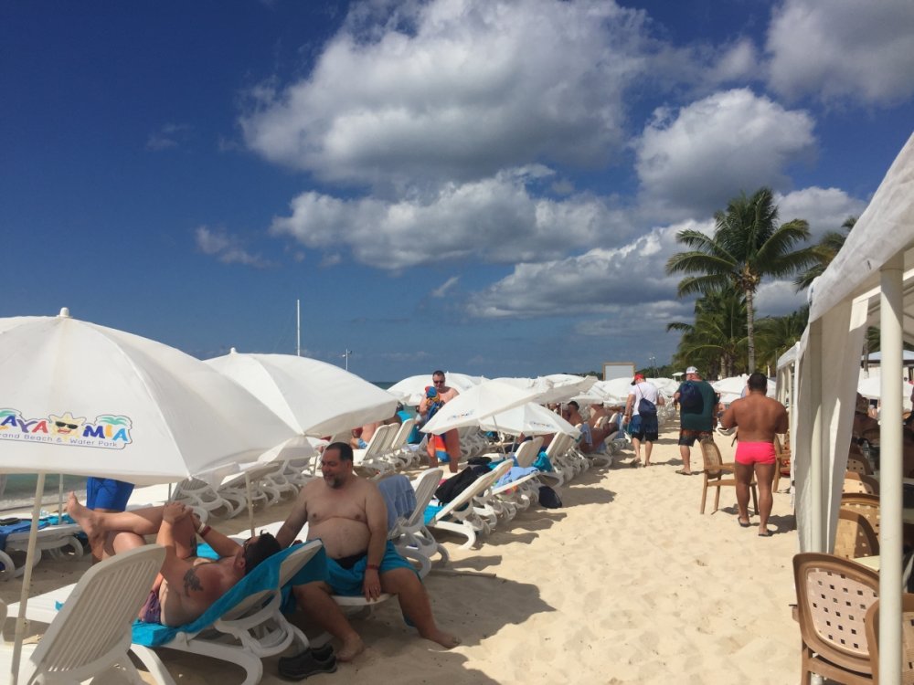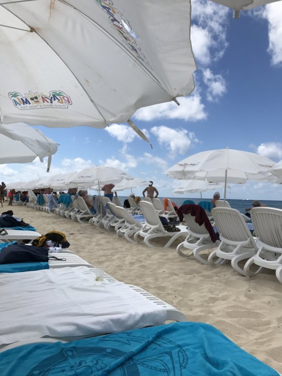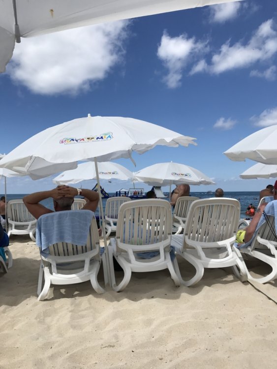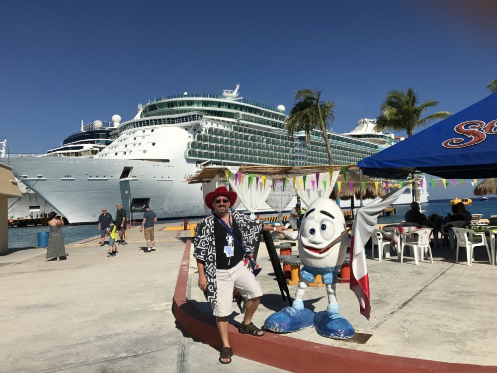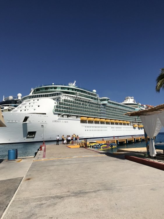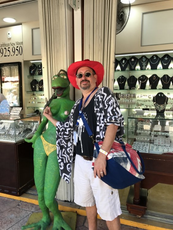 Day 6 (Cozumel) For the last port, we actually had a meet up at a sensible 9:30 (on the dock even), so there was no reason to get up early. But as usual, when on vacation, I was up pretty early, and was out on the balcony as we started to pull into the port – alongside 3 other ships that were already docked. and when I say “along side”, I mean really/really along side – we were so close to the Celebrity ship, we could see into the rooms easily, although there was no reason to look into the rooms, since almost all of the passengers seemed to be sitting out on their balconies staring at us as we pulled into the dock (in robes, that WE didn’t get, as we only had balcony cabin, not a suite..sheesh, RCCL, really?). Luckily, we had pants on, because yeah, they all seemed to be trying to get a peek at what was going on over on our ship. . . There was also some time-change screwery going on, that even tho we gained an hour when we pulled into Cozumel, the ship asked everyone to stay on ship time, which was an hour behind. . so that seemed to have messed up a lot of people in terms of waking up. For sure, there were way more people down in the MDR for breakfast this day than any other time we went. Nick was kind of awake, and was feeling pretty good, considering how much walking we had done yesterday at the ruins. . but him turning in early-ish had helped a lot and he woke up feeling OK. So I got him to go down to MDR, and we bumped into Adric in the hall who joined us for breakfast - where once again my eggs benedict were overcooked. Then we headed to get our Vanilla Mocha Lattes, and back up to the room to change for the Cozumel excursion (a “beach party”). . . . We were still well over an hour before it was time to meet up, but decided that we’d go ashore and do some shopping for a while before we had to meet up. Even at the early hour, there were already people drinking at the Senor Frog’s on the dock (I think that’s what it’s called), but we bypassed that, other than posing w/ some pics of the Liberty behind us, and decided to do a bit of shopping for Magnets and such. Now remember at the very start of this trip report, we dropped the dog, Roxxi, off for Medical boarding? (she’s diabetic and needs insulin shots twice a day (21 units each), as well as *completely* blind, and needs 3 different eyedrops each day (to keep the swelling/glaucoma in check). She’s going deaf in her right ear. . . She also has a number of tumors (we call her “lumpy” sometimes) which we’ve never had biopsied, as we don’t plan to treat them as long as her quality of life is good – which it really is still, she loves her walks (tho I walk her on a short leash so she doesn’t trip on curbs or sidewalk uneven-ness) she plays with her squeaky toys (tho when she flings them she can’t find them and runs back to her box to get more. . so we end up with squeaky-apocolypse on the living room floor if she’s been playful that day), and she still eats and poops with regularity.. she’s adjusted to the blindness/deafness and has a good quality of life still. So when we dropped her off, we gave them Nick’s number, since his phone is international, and mine is not (so mine was basically just a camera for the trip – which is why it was frustrating for Nick that he couldn’t find me sometimes when he turned in early). Anyways.. apparently Nick had (for some reason) turned his phone OFF while we were at sea, and so when we got ashore at Cozumel, he turned it on and had 5 missed calls, and a voicemail from an Austin number. He mentioned to me the calls, and asked “what is the vet’s number?”. .and I recognized it as soon as he read off the number. So I stepped out of the store we were in, and listened to the voicemail, and immediately called the Vet back, speaking to Roxxi’s “regular” vet, since the one who had called multiple times (Dr. Hopper) was a doctor at this clinic whom we hadn’t used in years, switching to Dr. Schubert since she’s always in on the Wed or Friday when we drop Roxxi off for Glucose Curves, check ups, etc. . . . Dr. Schubert told me that Roxxi hadn’t been eating (she’s usually a bit finicky when we board her) and when she did she was throwing up. . and that concerned them, since they couldn’t give her the insulin if she didn’t eat. I told Dr. Schubert that why didn’t they just let her re-eat what she threw up (ew. .but she’s a dog, she licks her butt), and that way the food ends up in her regardless. . .and she told me that’s what they did. But they were worried that she also seemed to be having trouble peeing. . and that they had tried to call us, but couldn’t get hold of us (since Monday, and this was Friday), so they had run cultures, and started her on antibiotics. Dr. Schubert said she was doing much, much better, and that we shouldn’t worry and enjoy the rest of the cruise. We hung up the phone, and I said to Nick, THAT is going to be expensive, even tho we had checked the box on the paperwork to “do not treat unless you contact us first” but there was nothing we could do about it now, and at least she was doing better. So we continued shopping and taking a few more pictures. I got a Day of the Dead magnet for a friend, and a magnet of a monkey masturbating for us (because, why not? It’s Cozumel!. . LOL), and then also bought a T-shirt, and Nick ended up buying a Texans (football team) shoulder bag, that he wasn’t intending to buy, but the cart-guy kept dropping the price, and he got it for something like $20, marked down from $38. . in the port shopping area too! I was shocked they lowered the price like that right on the docks, basically. After shopping a bit more it was time to meet under one of the big Palapas for our excursion. We didn’t know much about it, other than it was a “beach party” with a “semi private” beach for our group. It turned out it was at a pretty well known Tourist spot called “Playa Mia